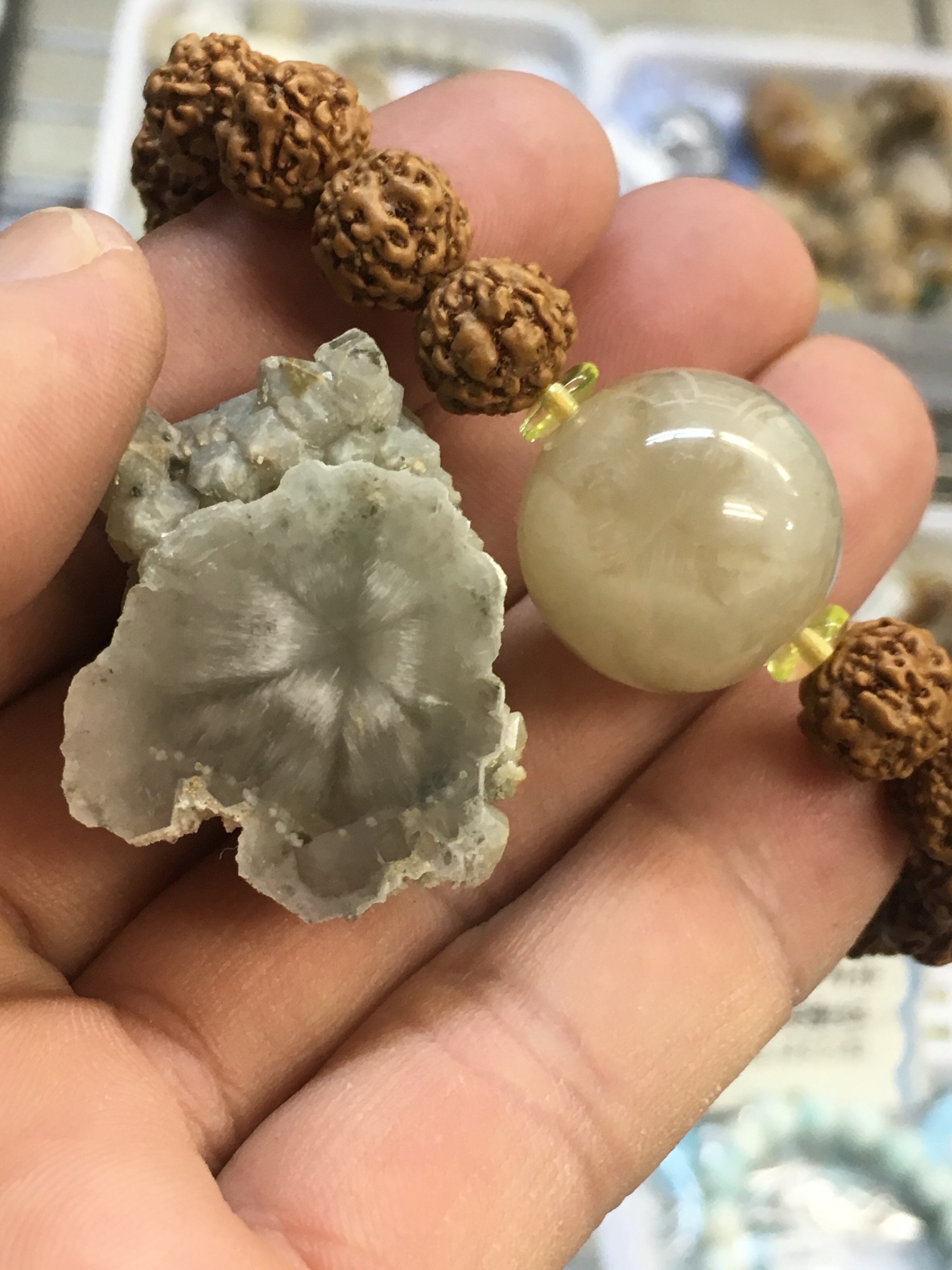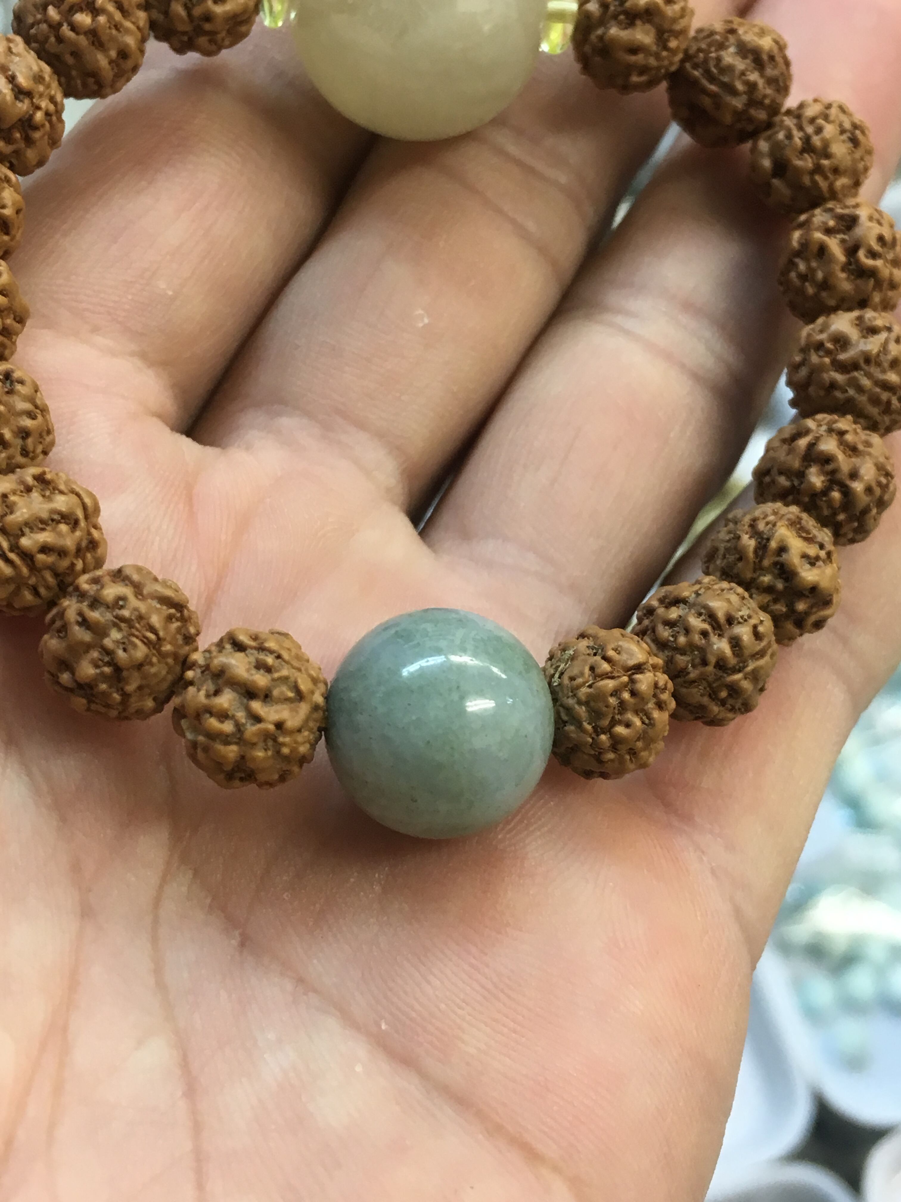 菩提樹10mmビーズと、糸魚川翡翠の14mmビーズでブレスレットに組み上げております。