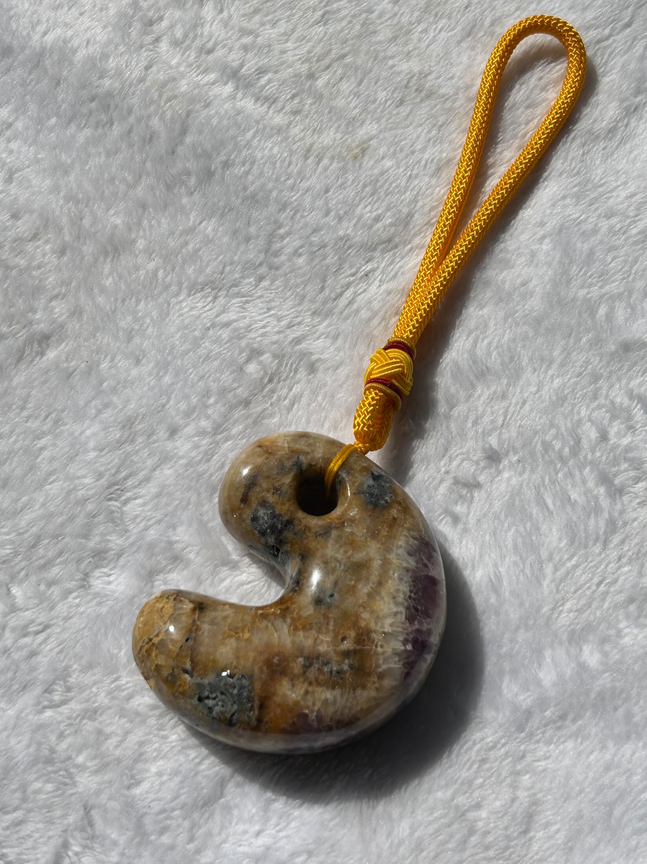 黄色い持ち手が着いておりますが、勾玉が重いので、ストラップのようにカバンに付けるのは推奨できません。鑑賞時に手に乗せる際の補助としてご利用くたさい。