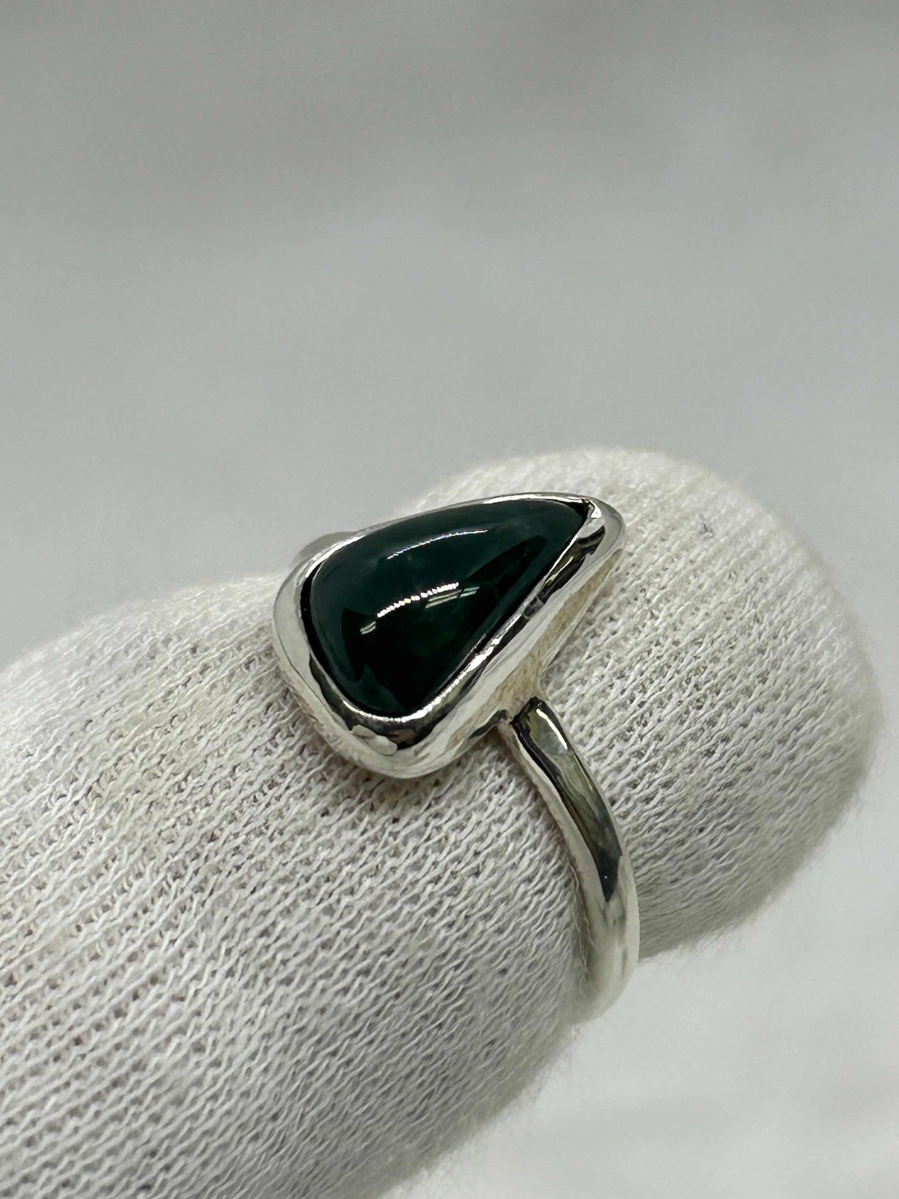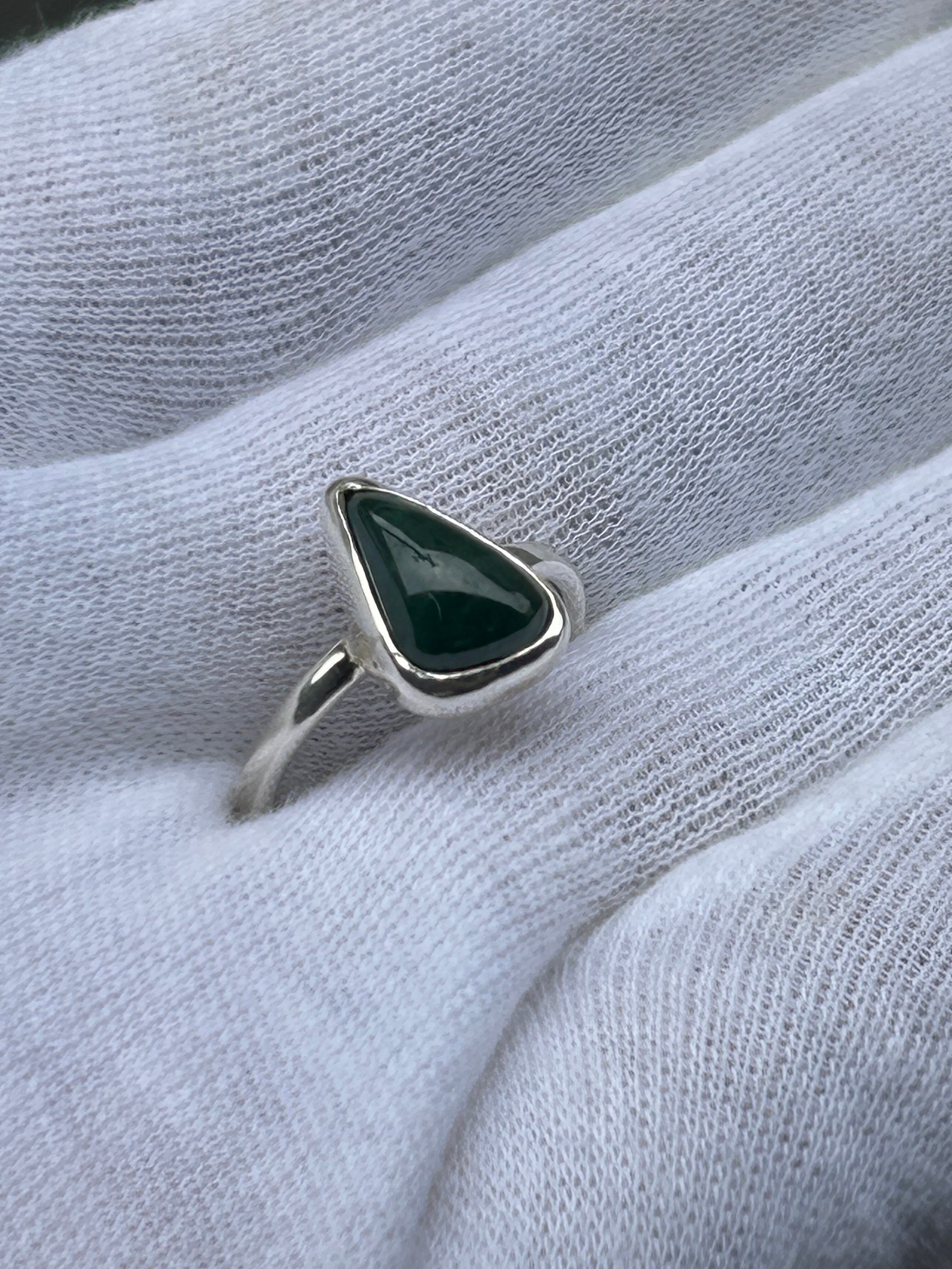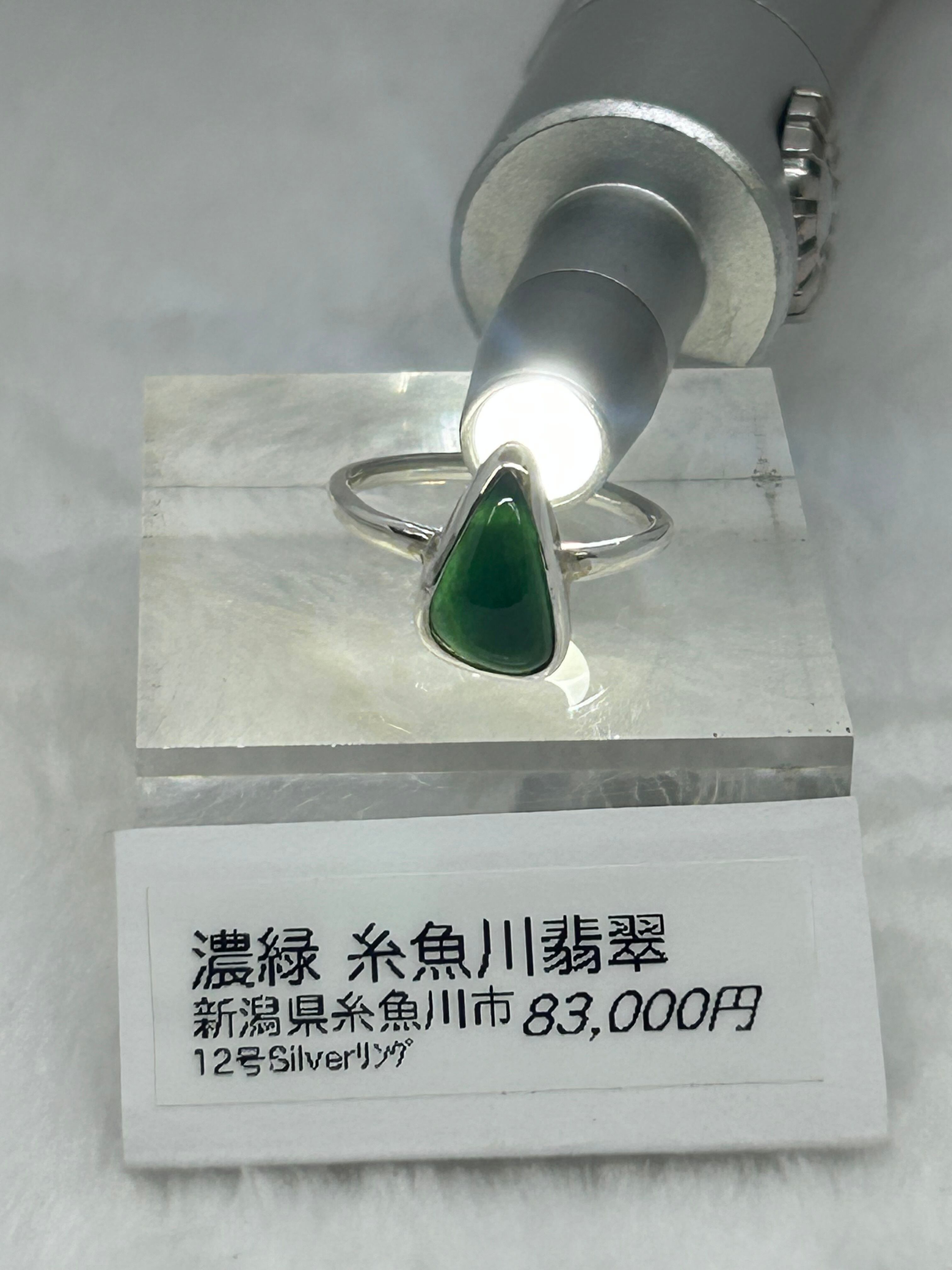 大変濃い緑色を含む糸魚川翡翠の原石から、もっとも緑色が濃く、石目もほぼ無い部分をルースにして、Silver925の覆輪留めリング12号を作成しました。