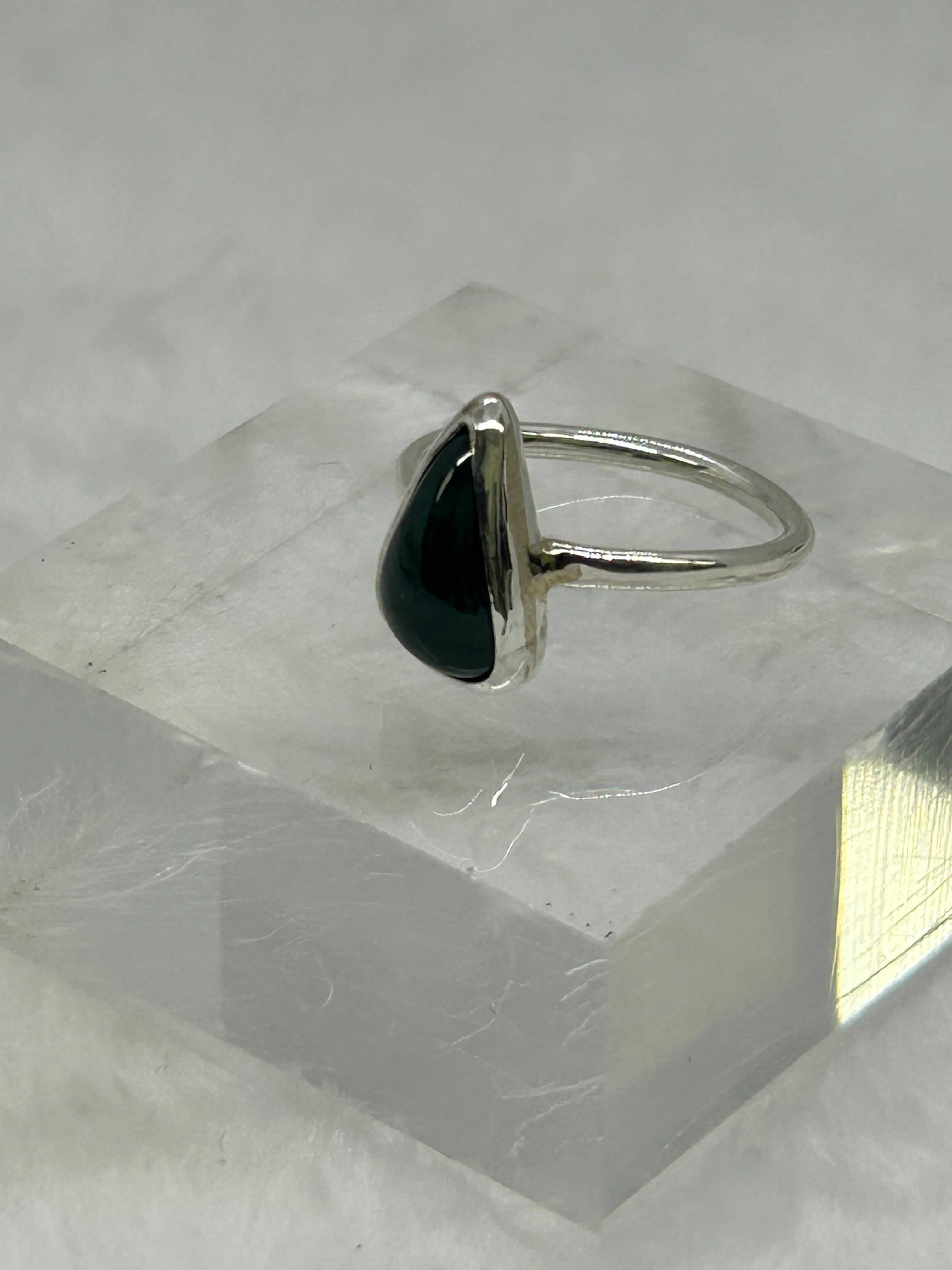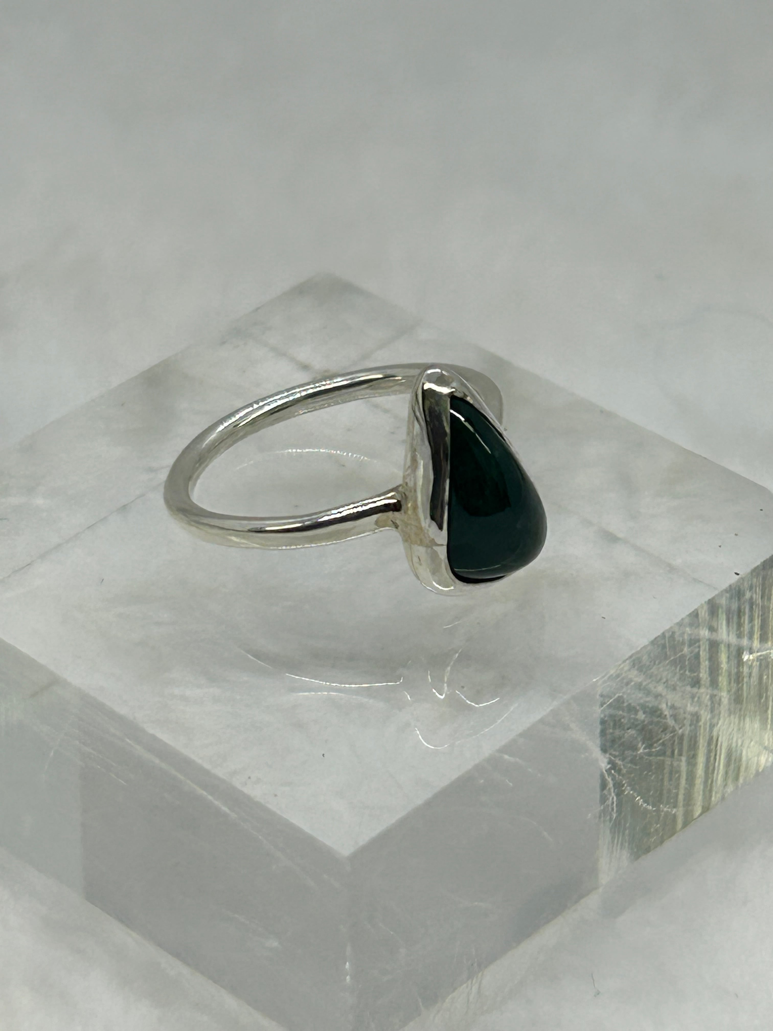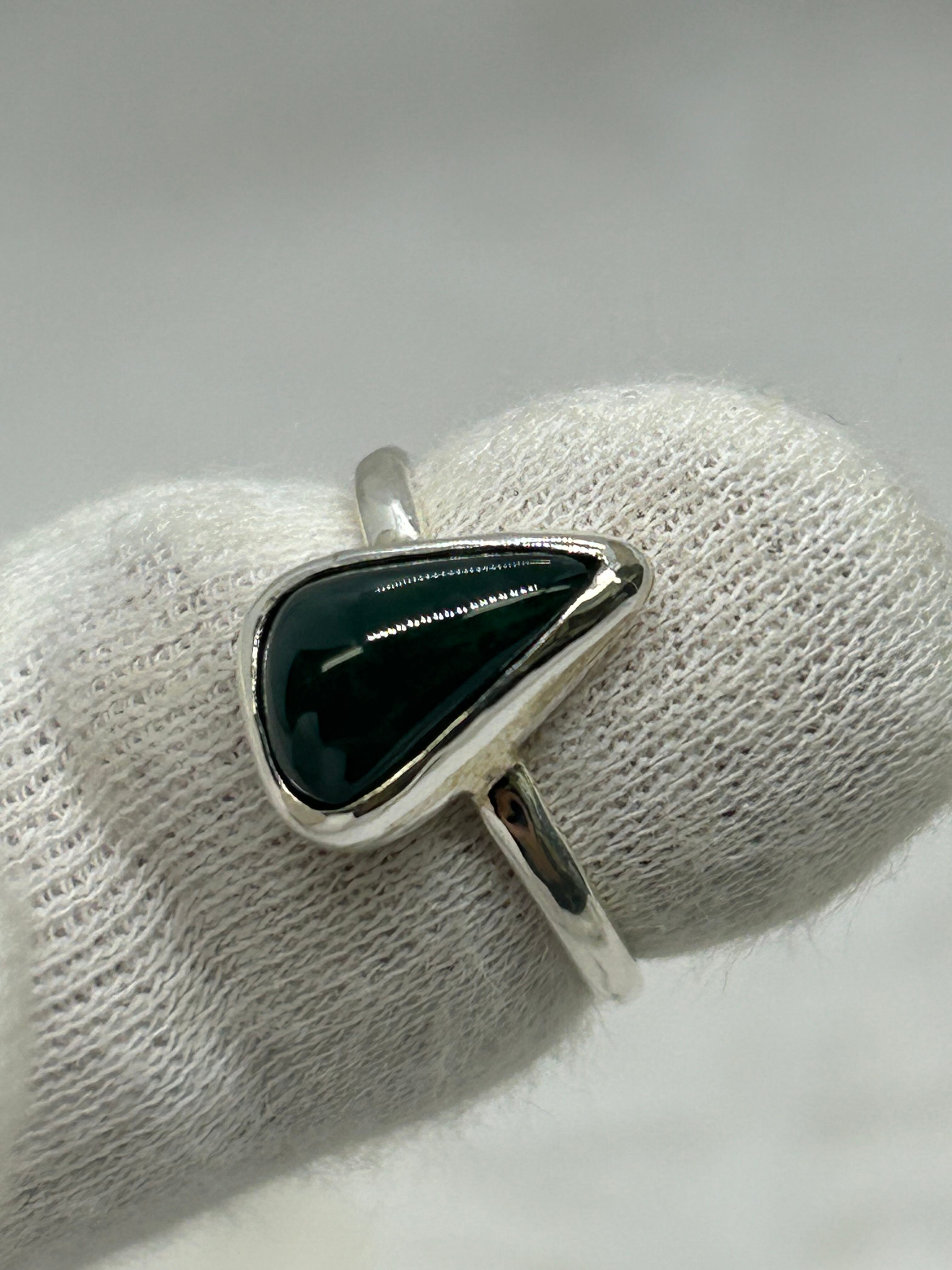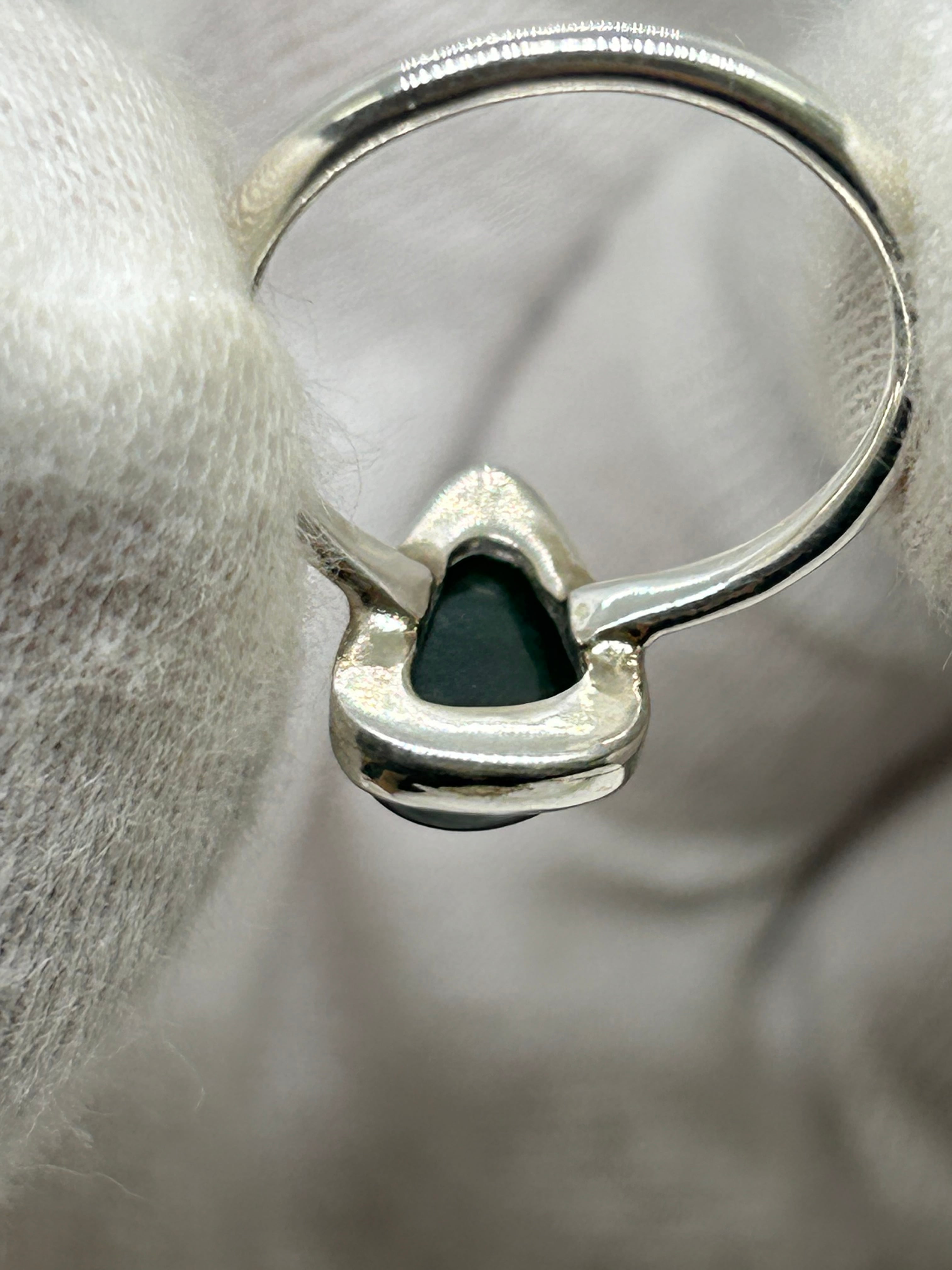 大変濃い緑色を含む糸魚川翡翠の原石から、もっとも緑色が濃く、石目もほぼ無い部分をルースにして、Silver925の覆輪留めリング12号を作成しました。