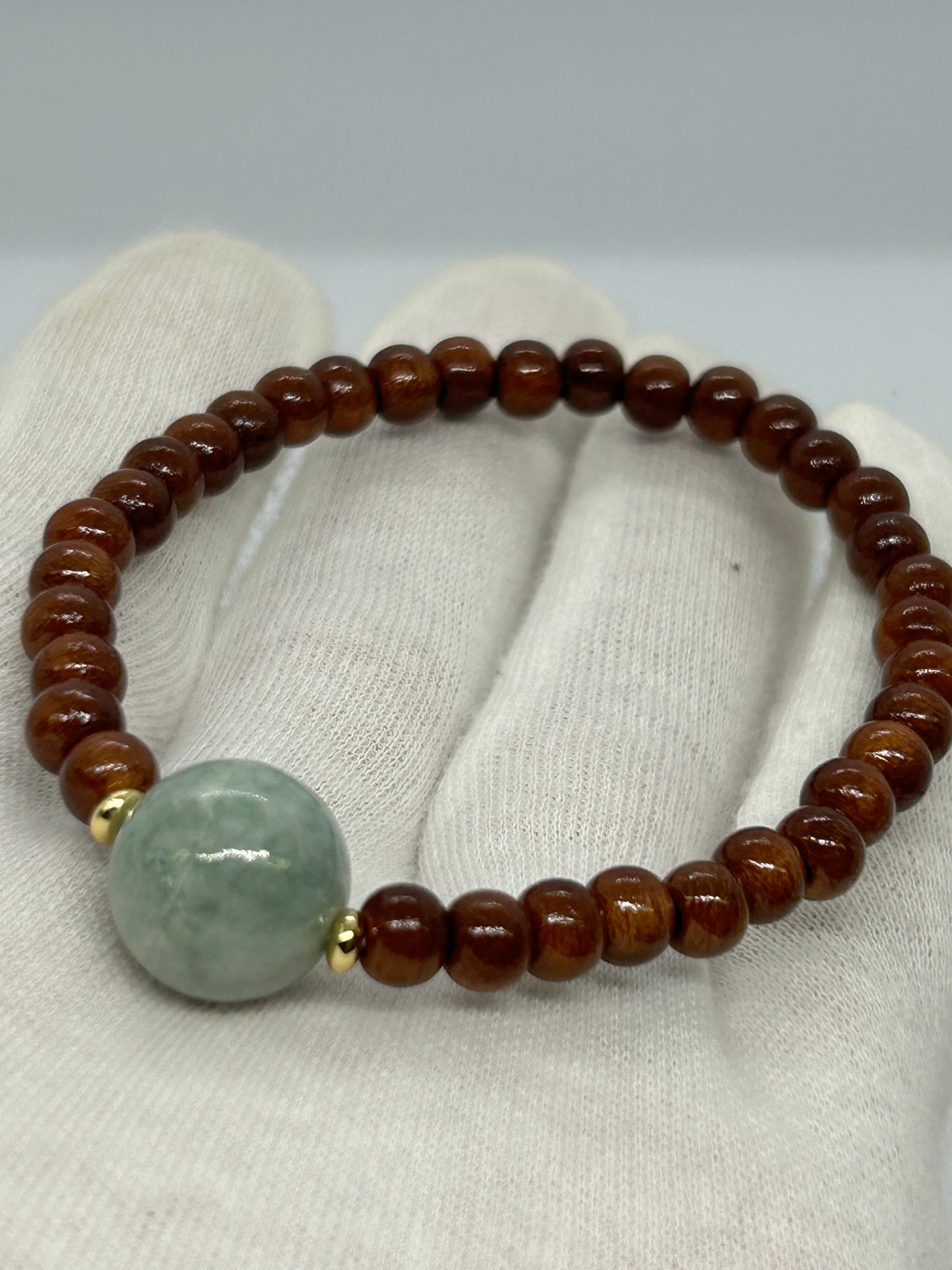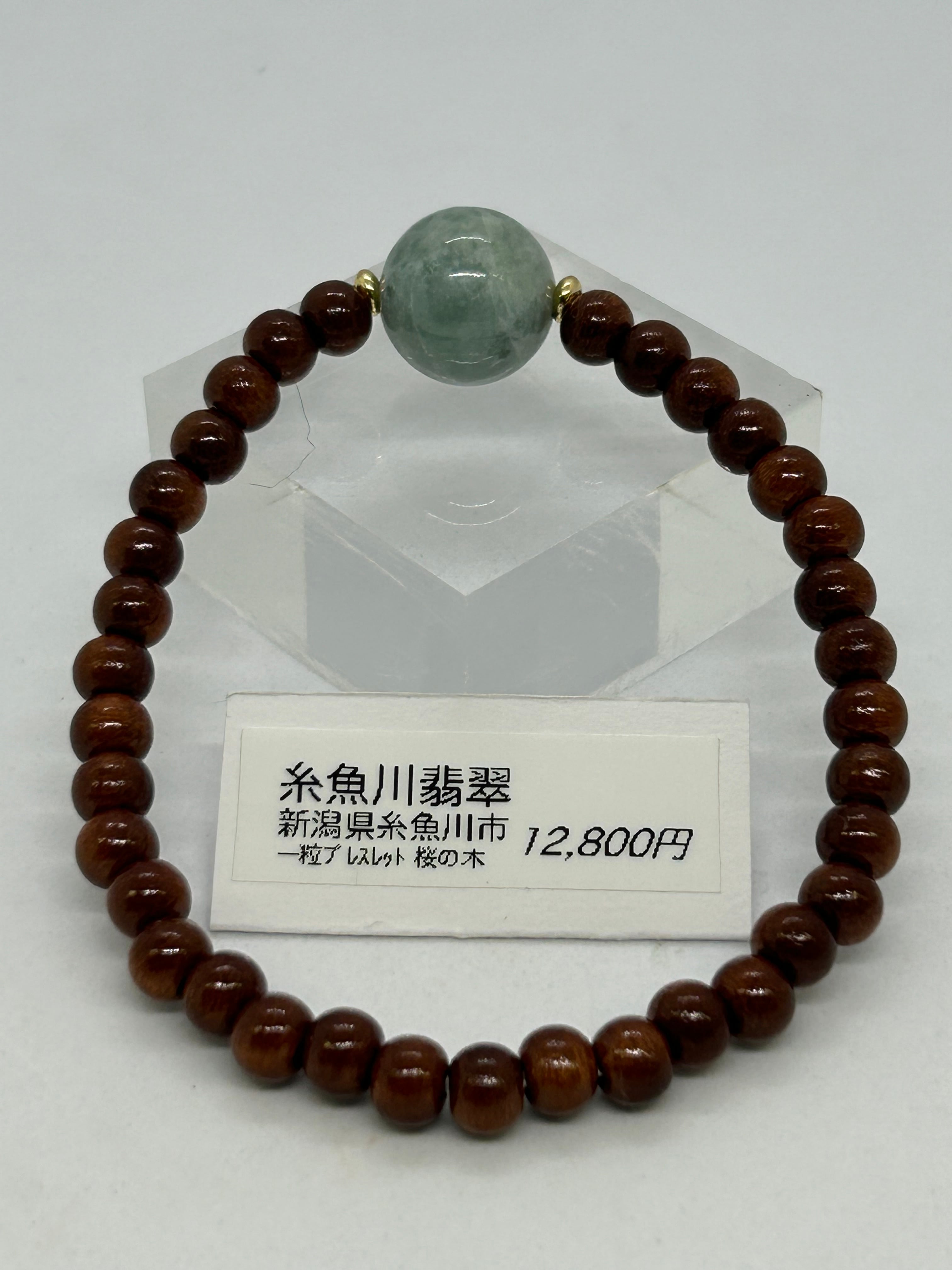 糸魚川翡翠にて、14㍉玉1粒と国産桜の木でブレスレットに仕上げました。