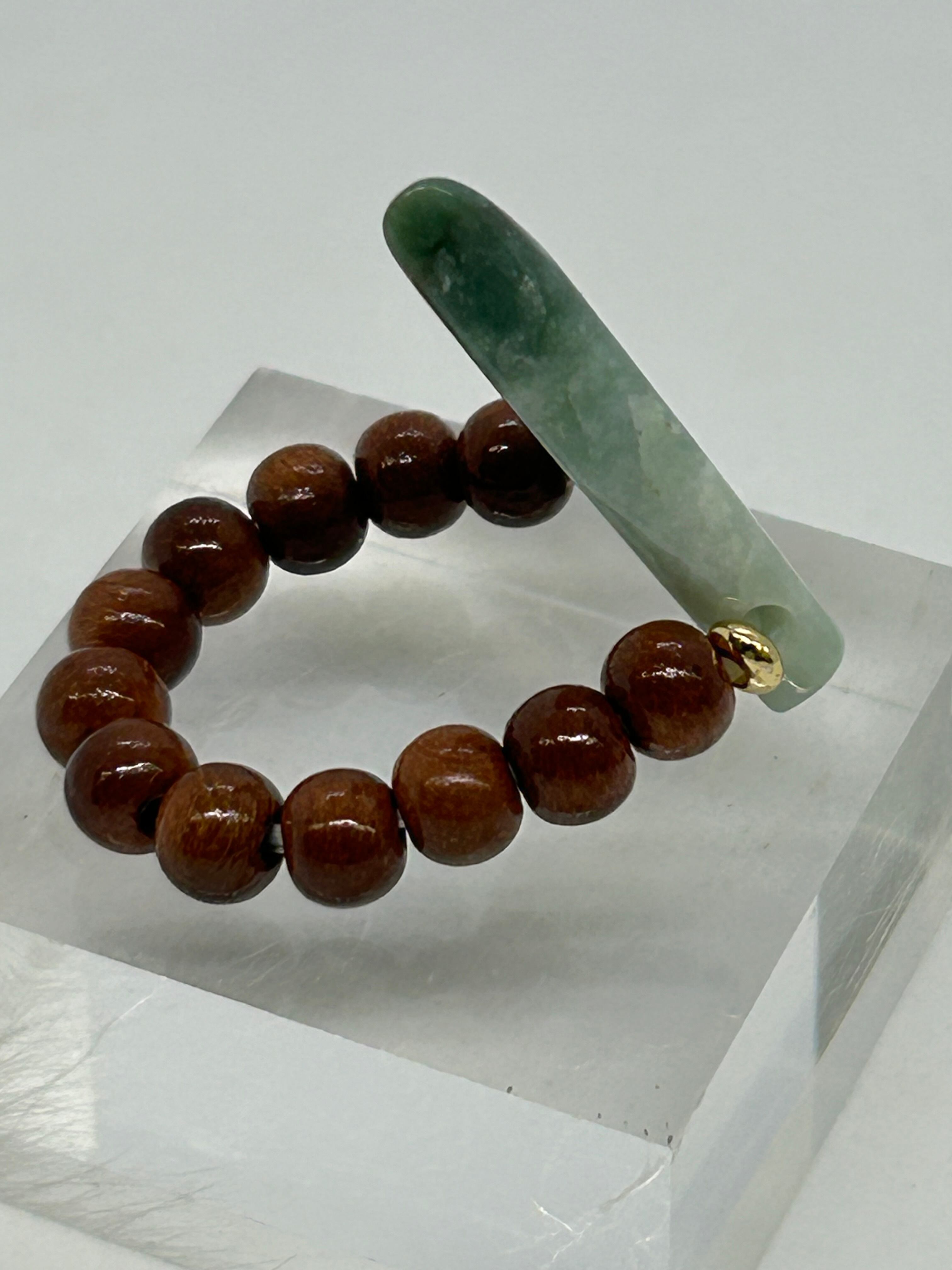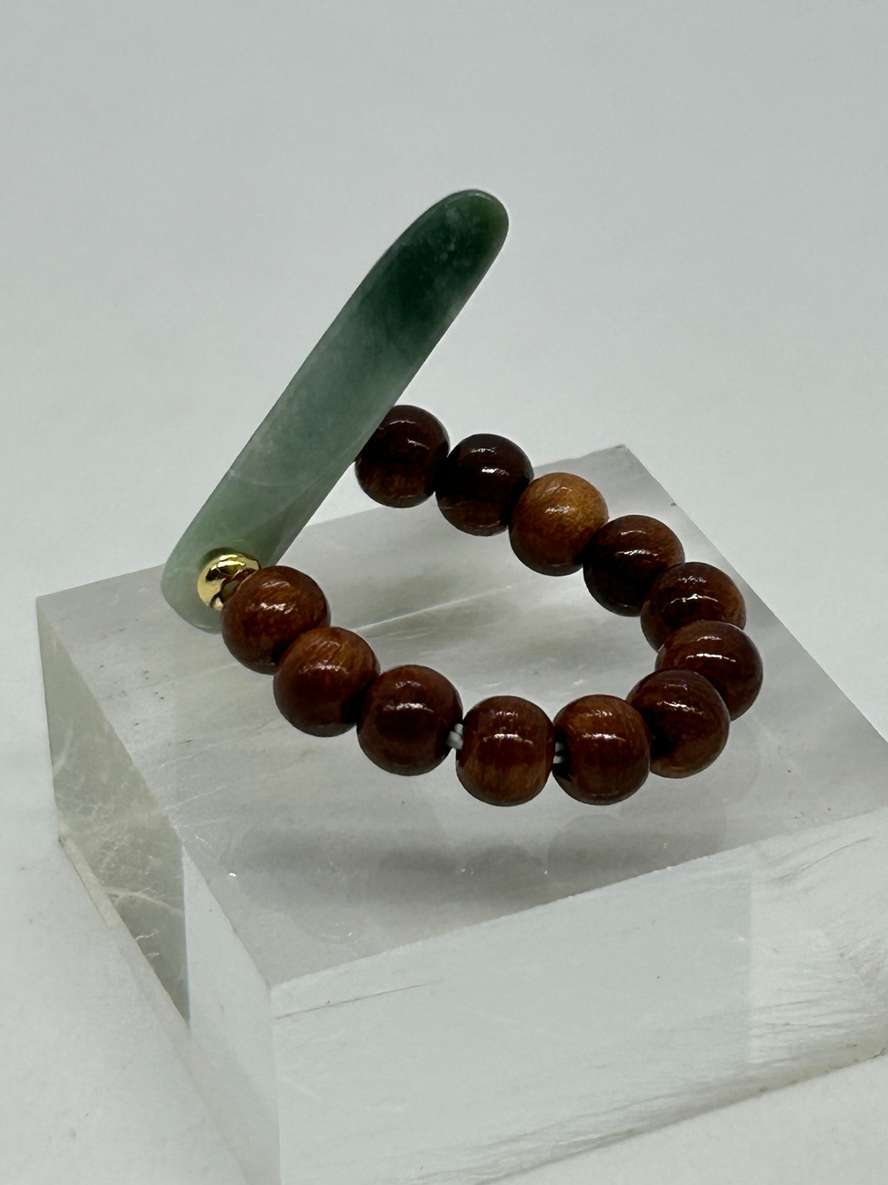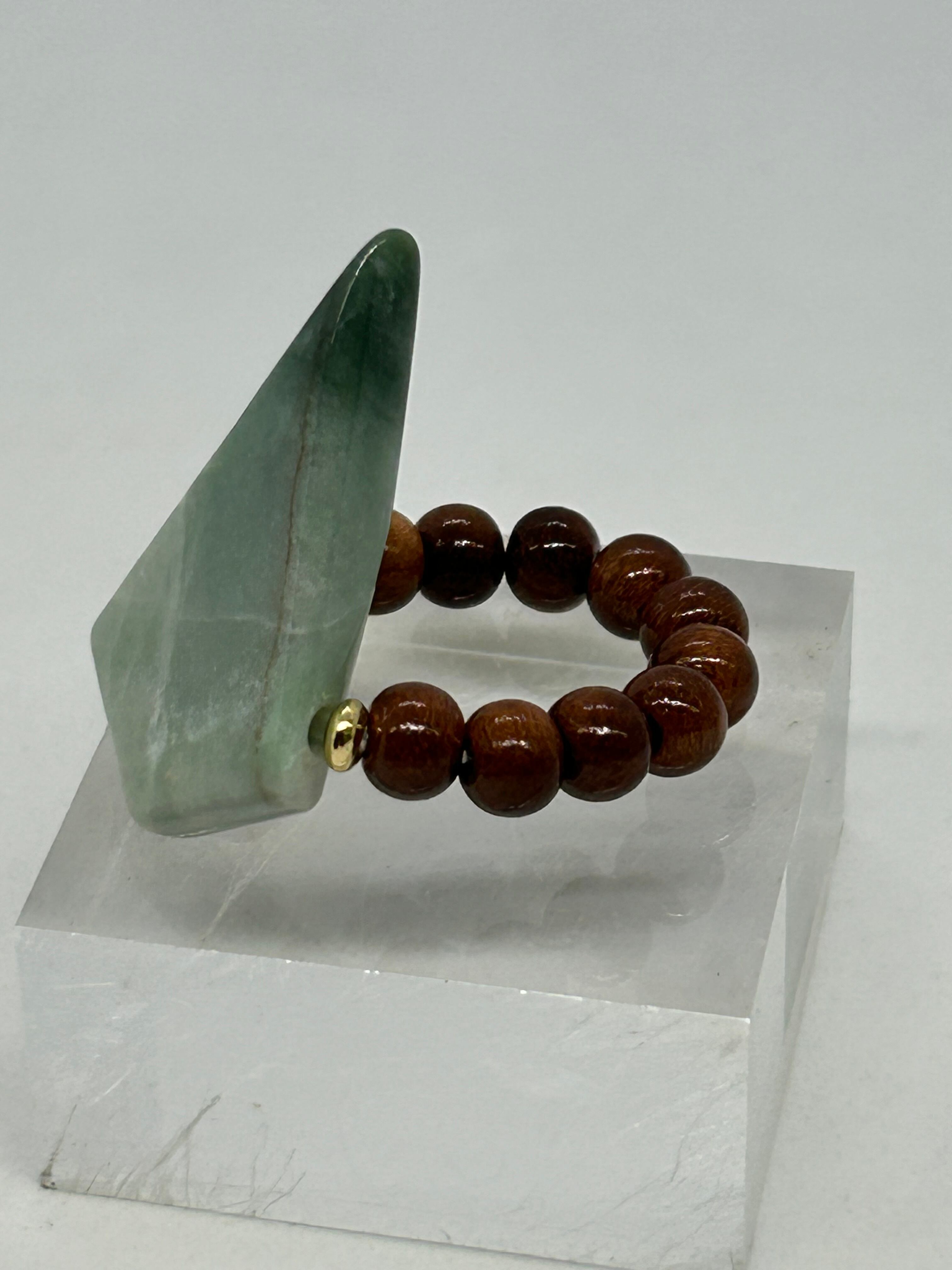 ツートンカラーの糸魚川翡翠でマーキスのルースをつくり、横穴を開けて、国産桜の木ビーズでフリーサイズのリングにしました。