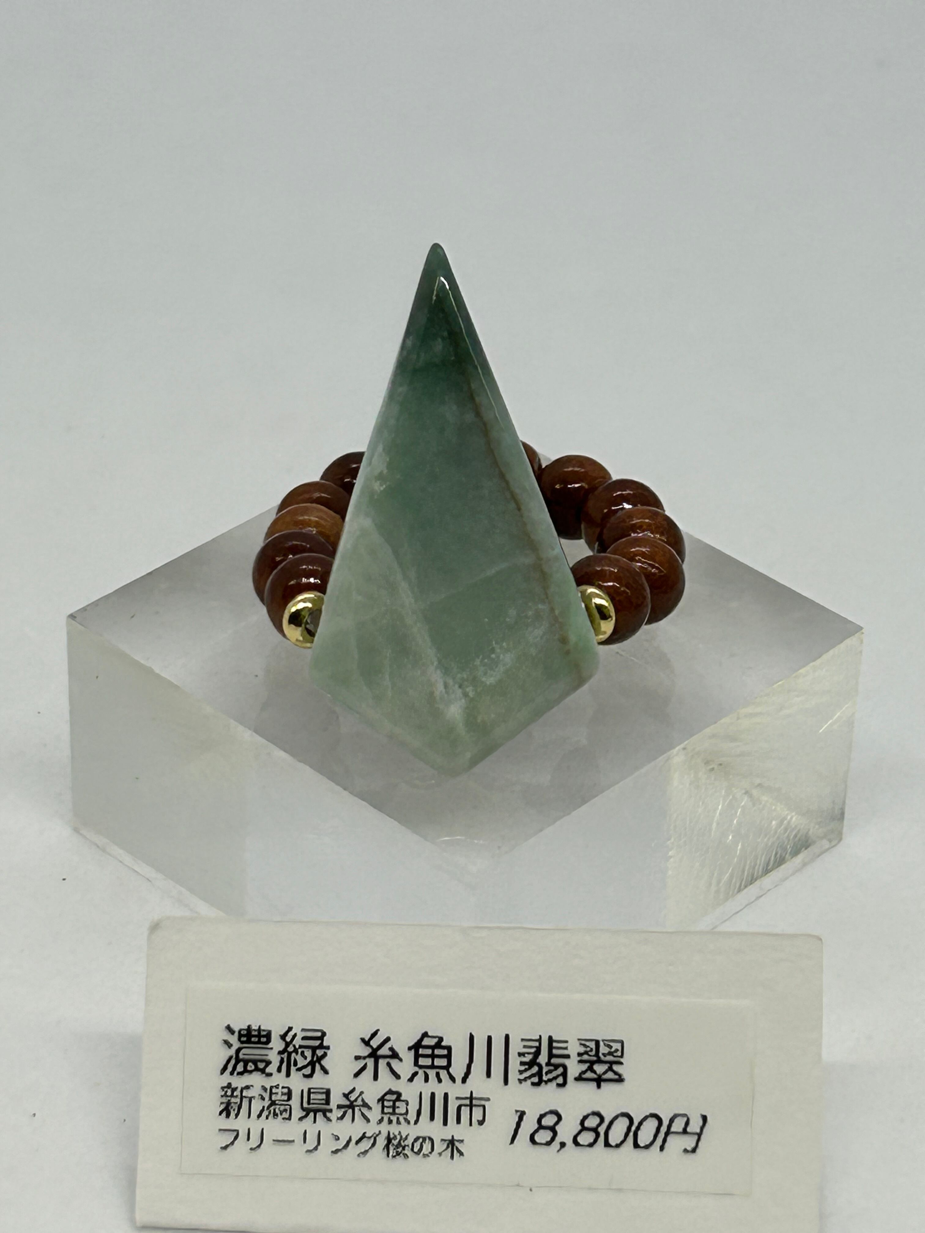 濃緑色 ツートンカラー糸魚川翡翠 フリーサイズリング 桜の木ビーズ