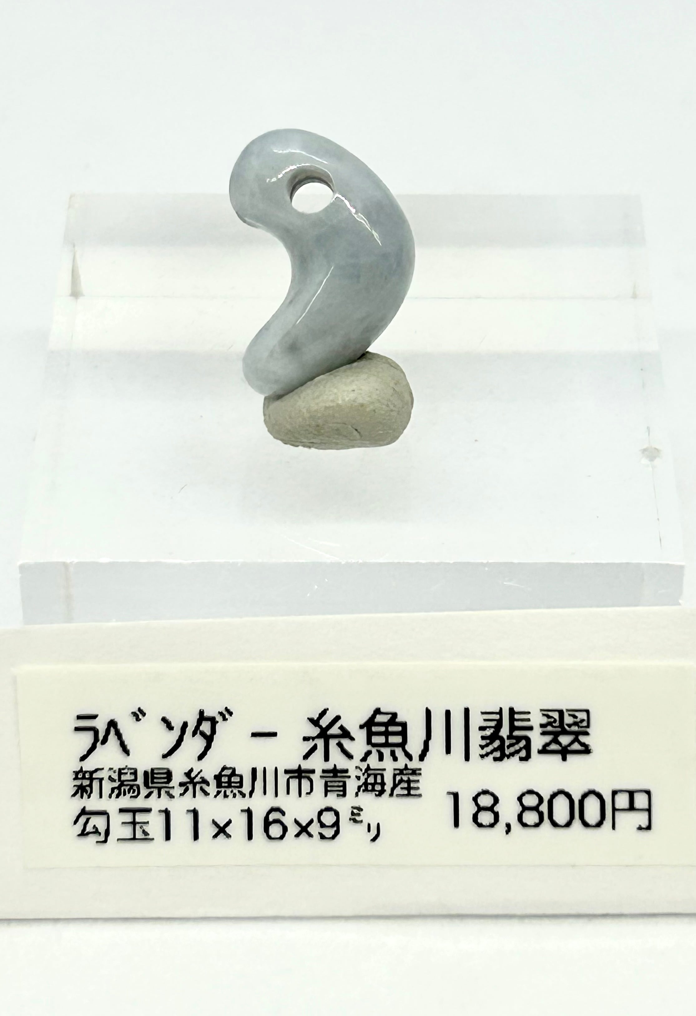 糸魚川青海産の翡翠、ラベンダーカラーの原石から勾玉を作成しました。