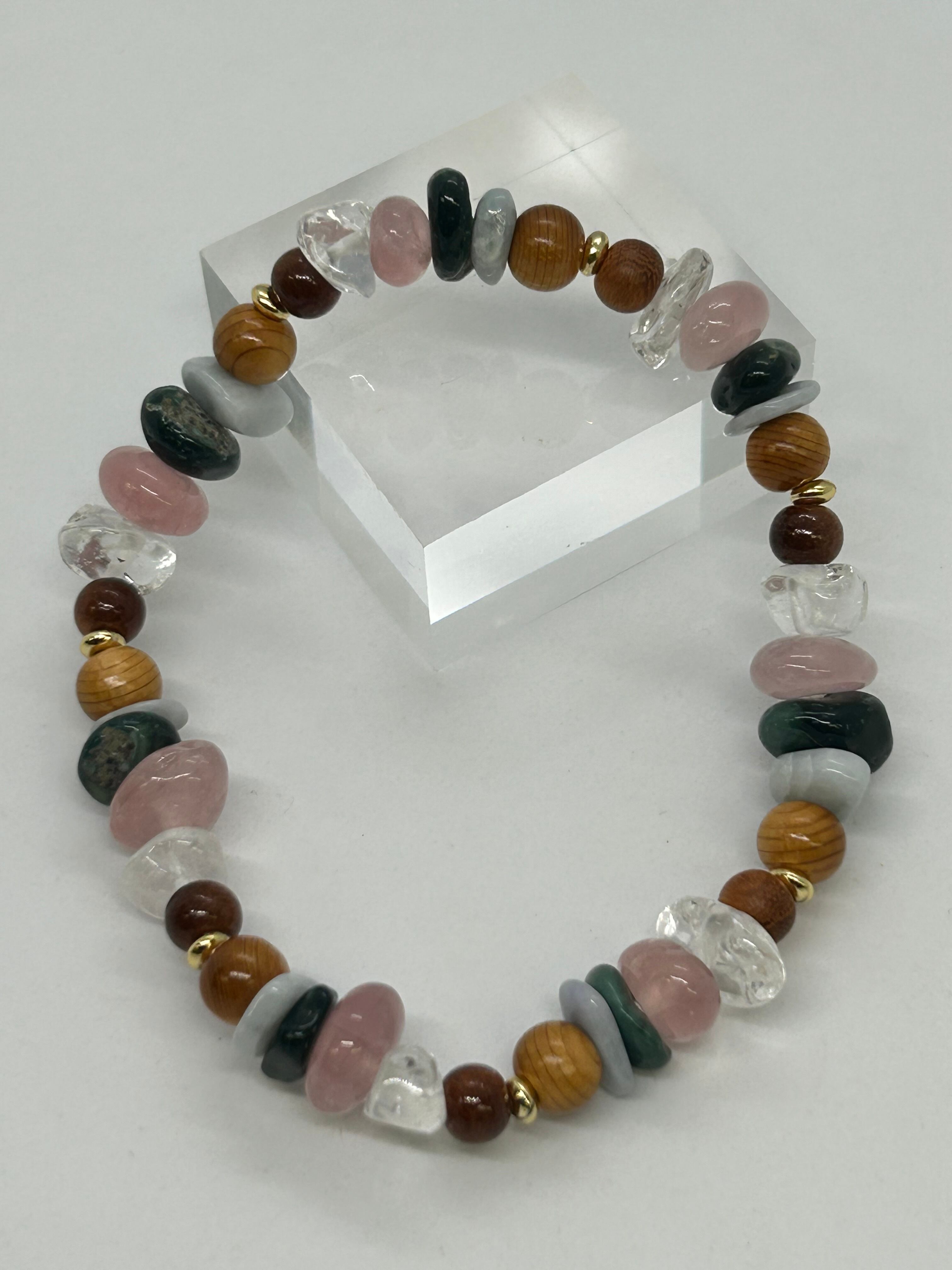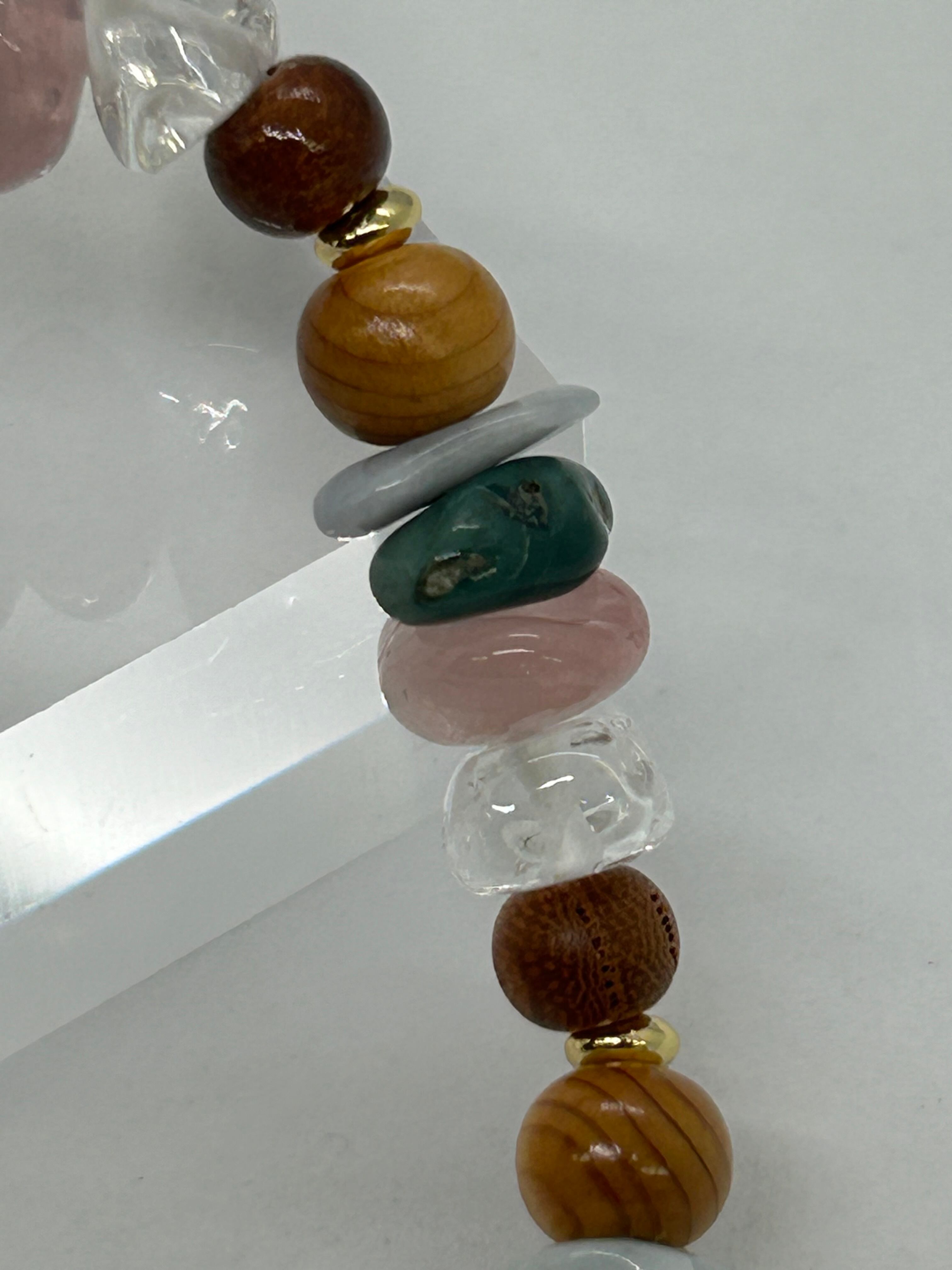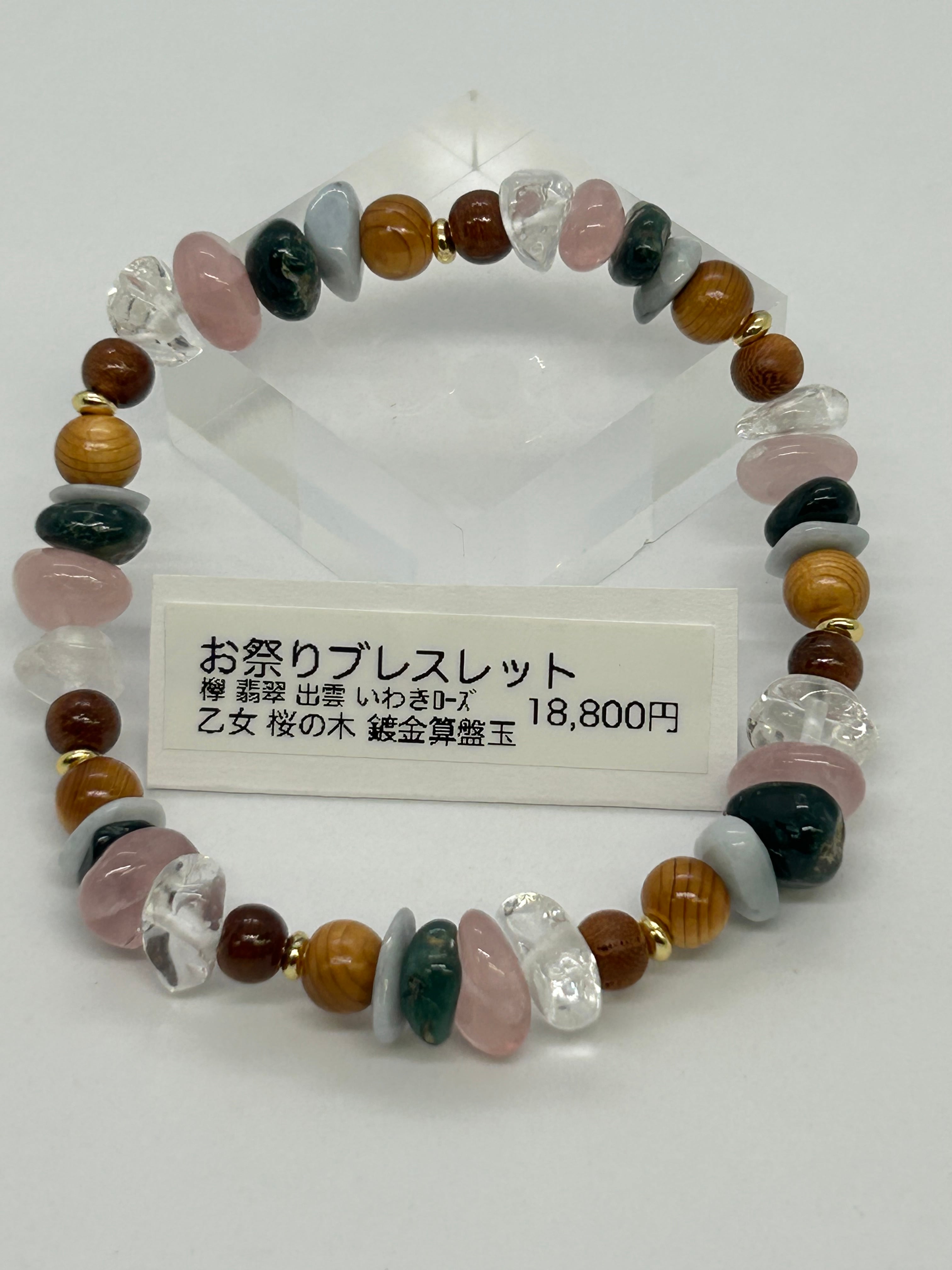 お祭りの雰囲気をブレスレットで再現してみました。欅の木、青海翡翠、出雲石、いわきローズクォーツ、乙女水晶、桜の木、金色鍍金算盤玉、この7つの組み合わせを7回繰り返して内周18㌢のブレスレットにしました。サイズは大きめですが、小さいさざれ石を使っていますので、ふだん15㌢のブレスレットをつける人でも違和感なく着けられると思います。