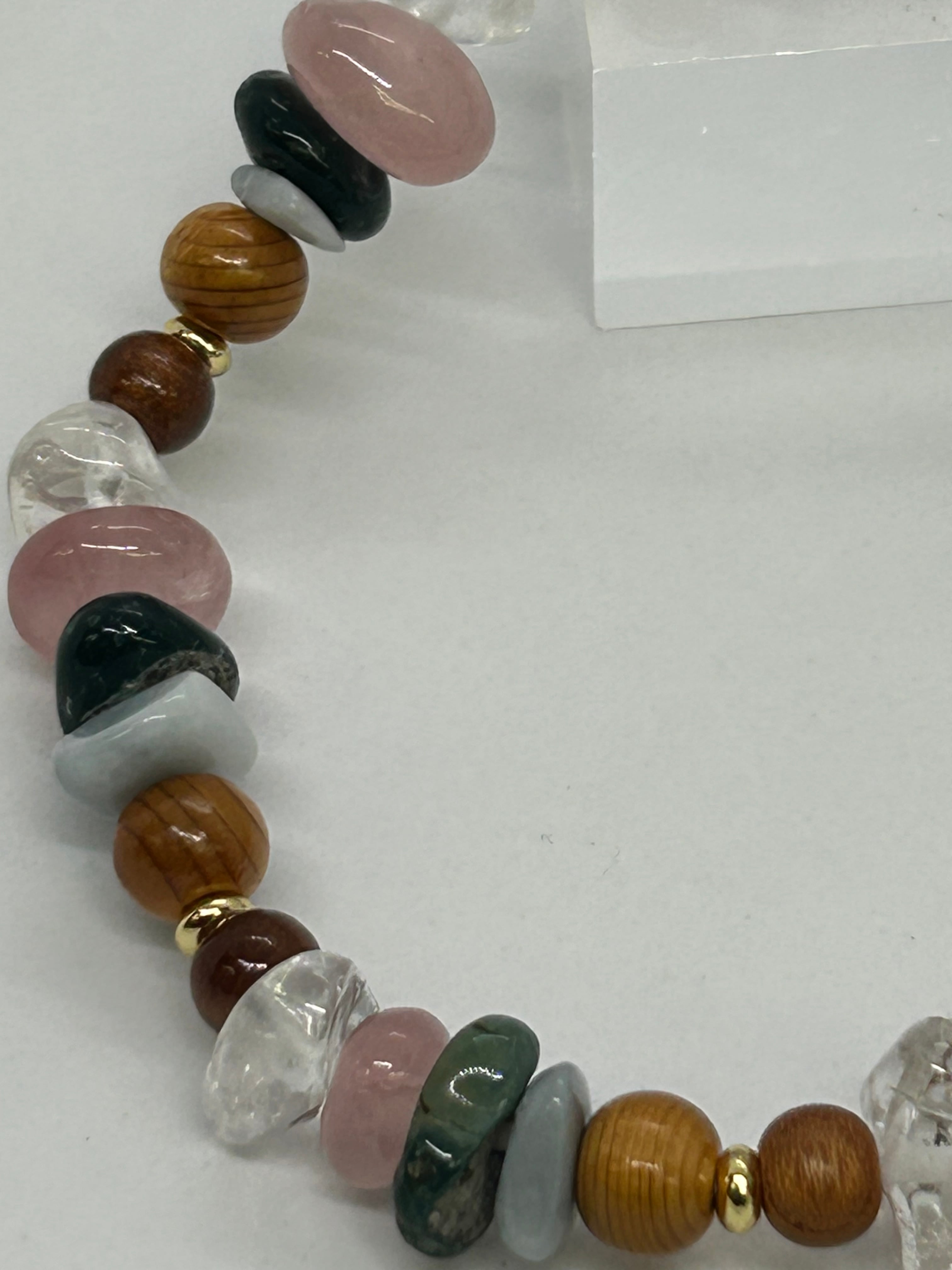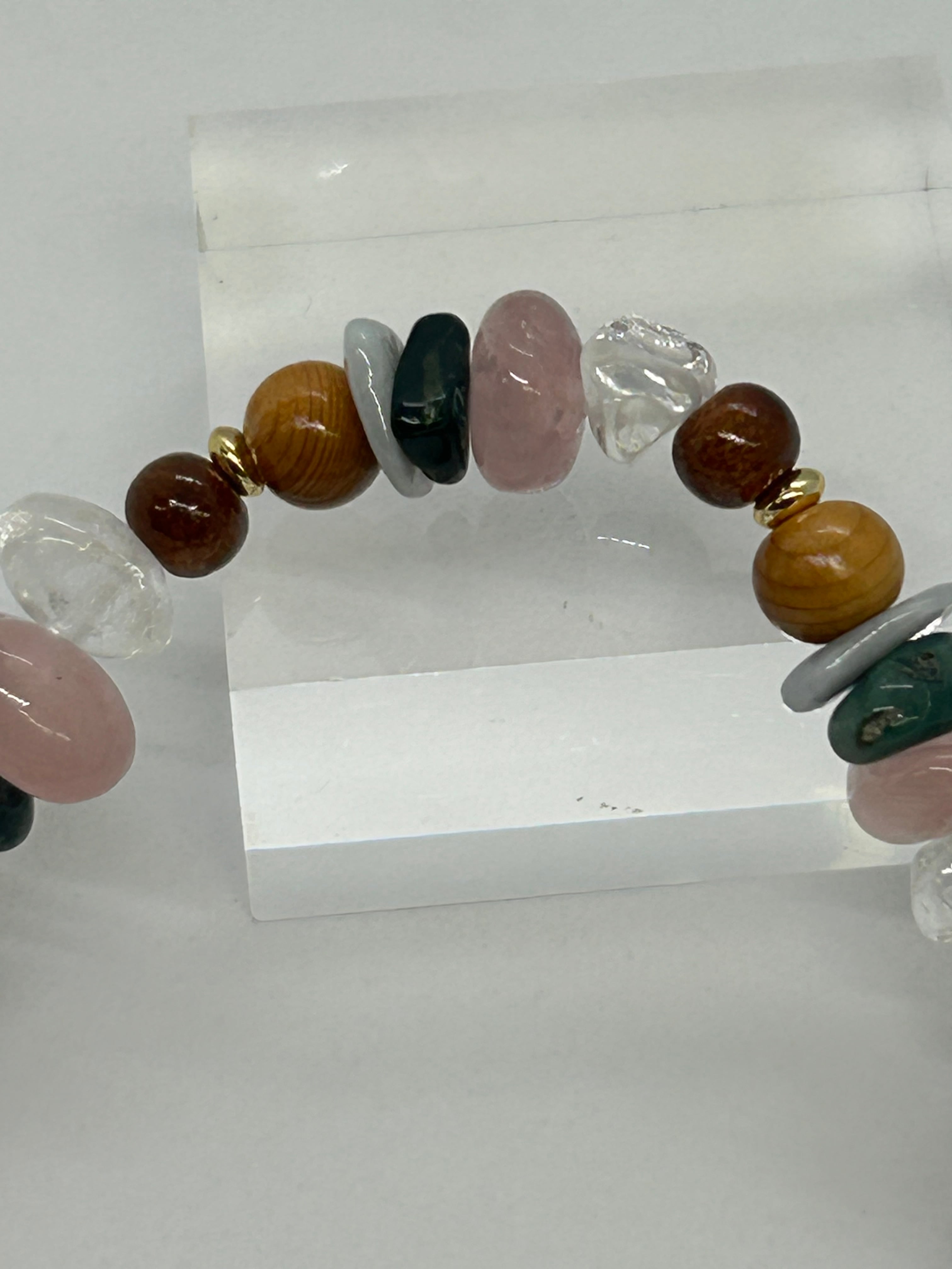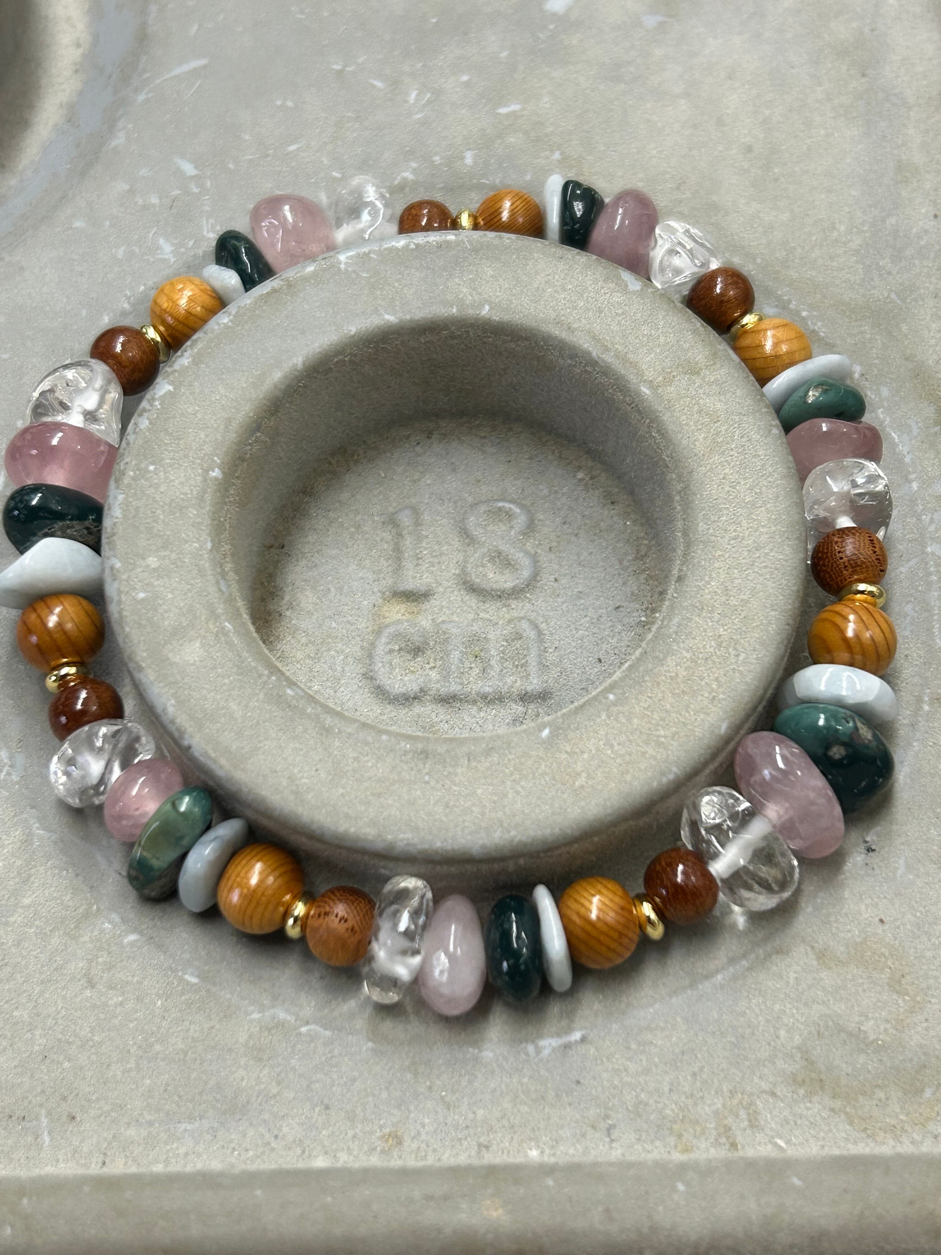 お祭りの雰囲気をブレスレットで再現してみました。欅の木、青海翡翠、出雲石、いわきローズクォーツ、乙女水晶、桜の木、金色鍍金算盤玉、この7つの組み合わせを7回繰り返して内周18㌢のブレスレットにしました。サイズは大きめですが、小さいさざれ石を使っていますので、ふだん15㌢のブレスレットをつける人でも違和感なく着けられると思います。