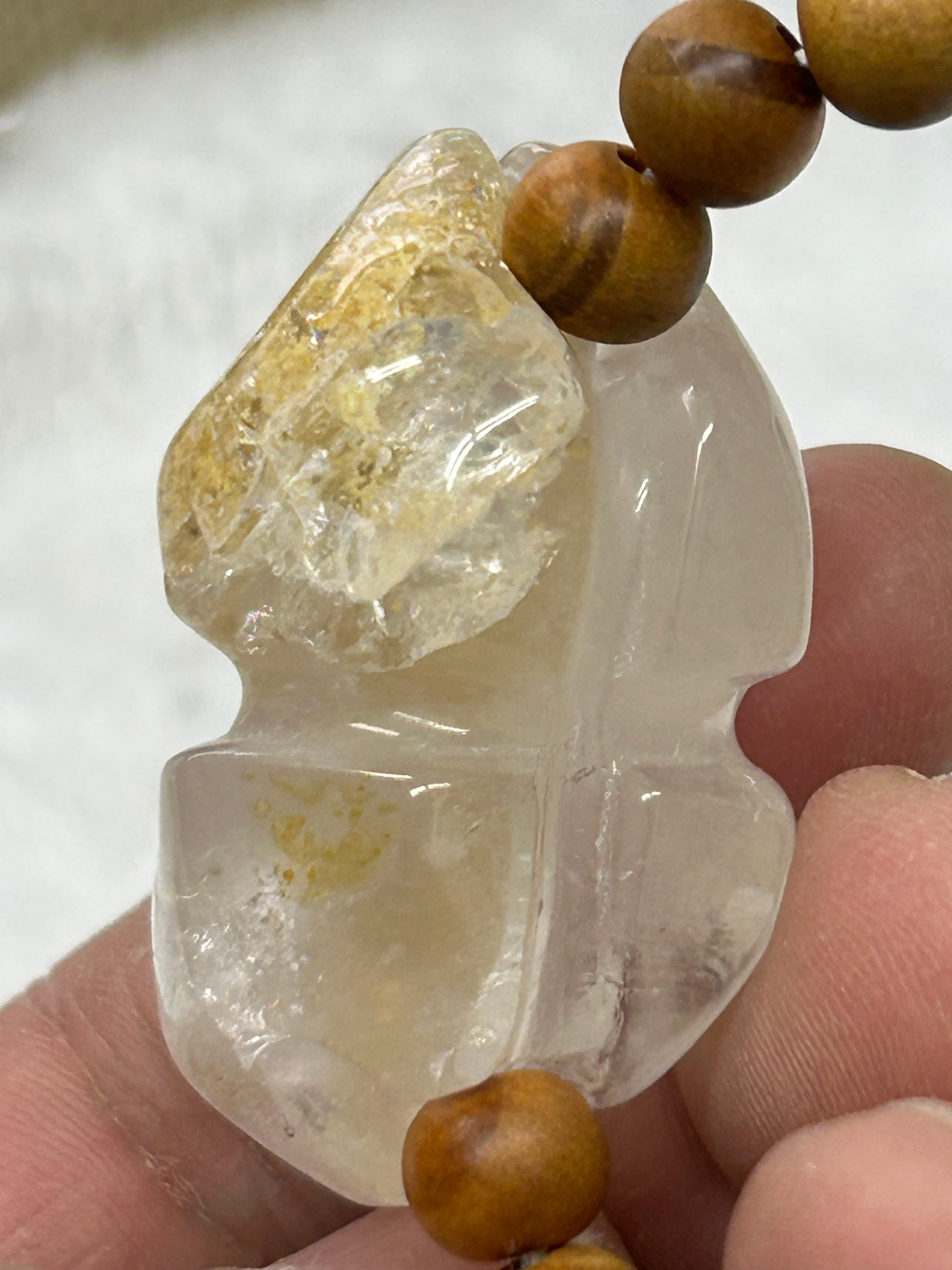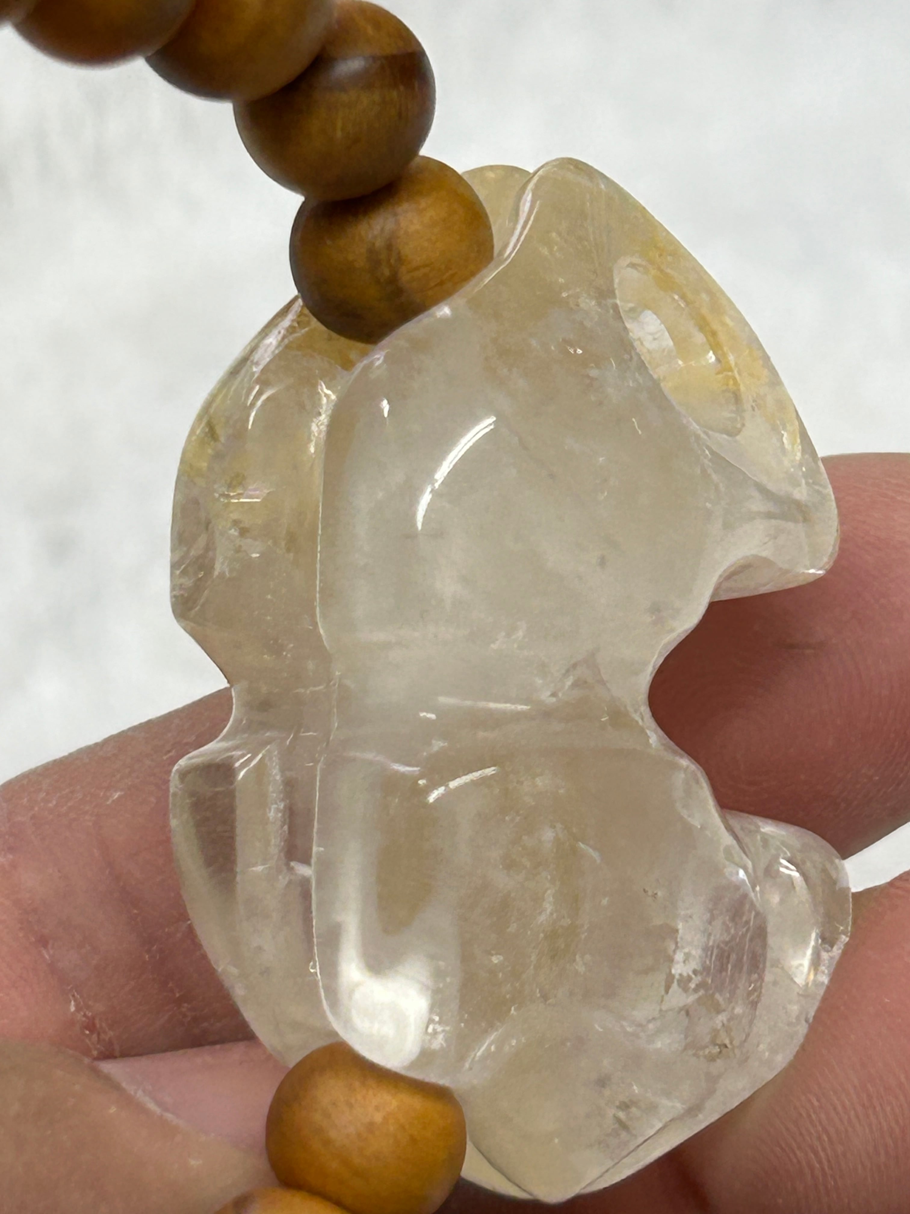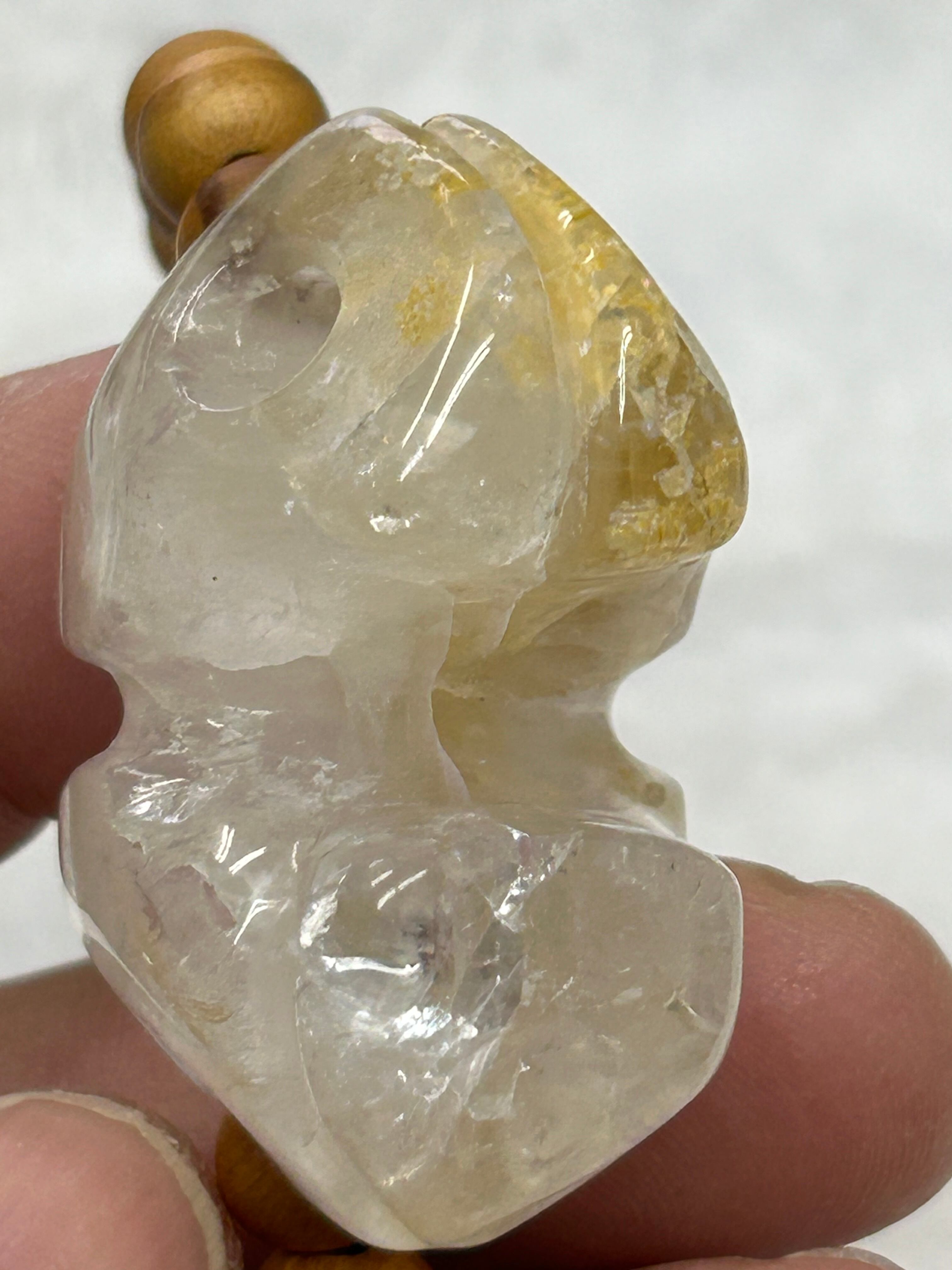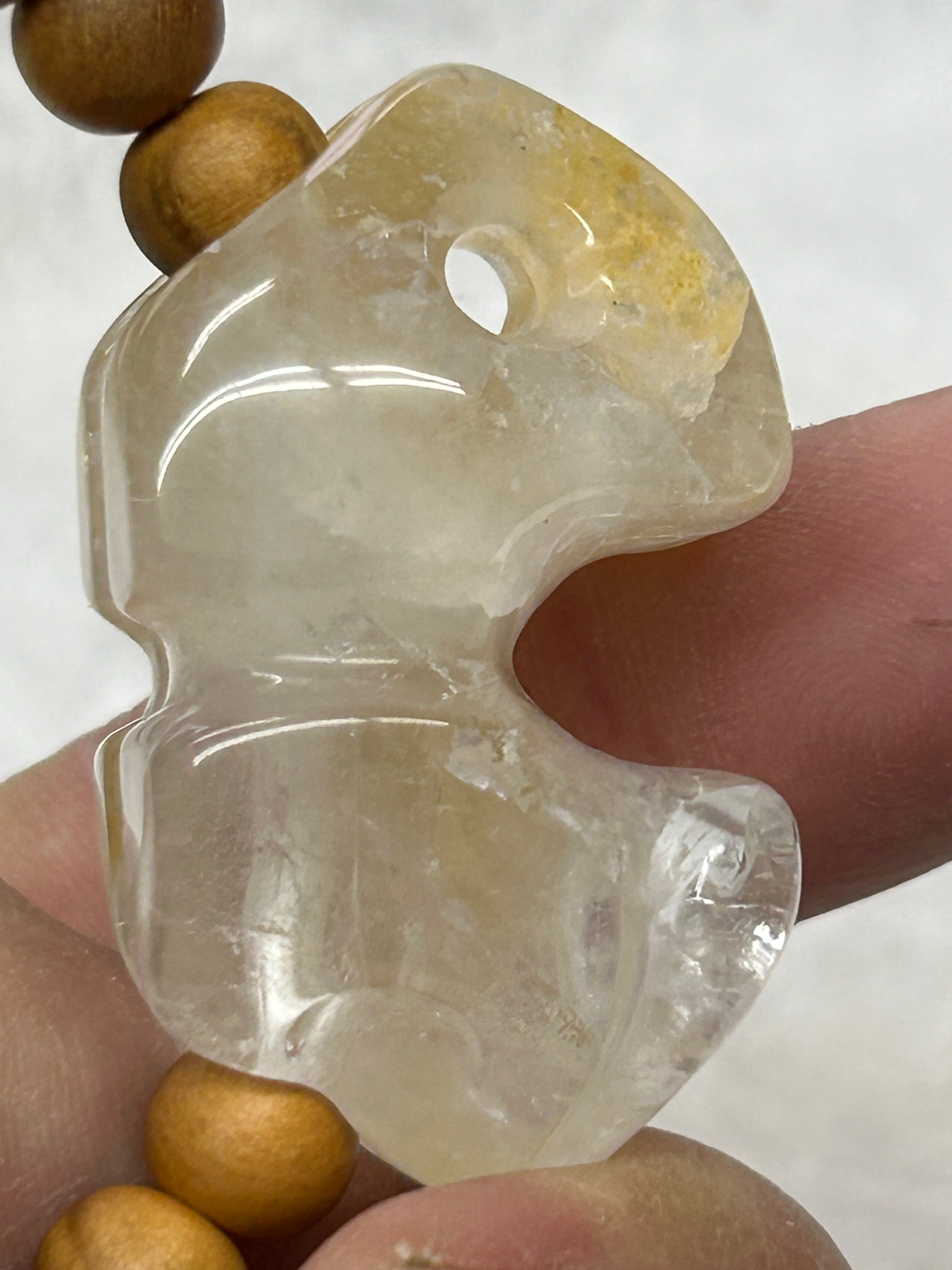 天川村の水晶ならではの透明感と独特な模様が、この勾玉に自然の神秘さを与えています。優雅で流れるようなフォルムは、見る人を魅了し、気品を放つことでしょう。