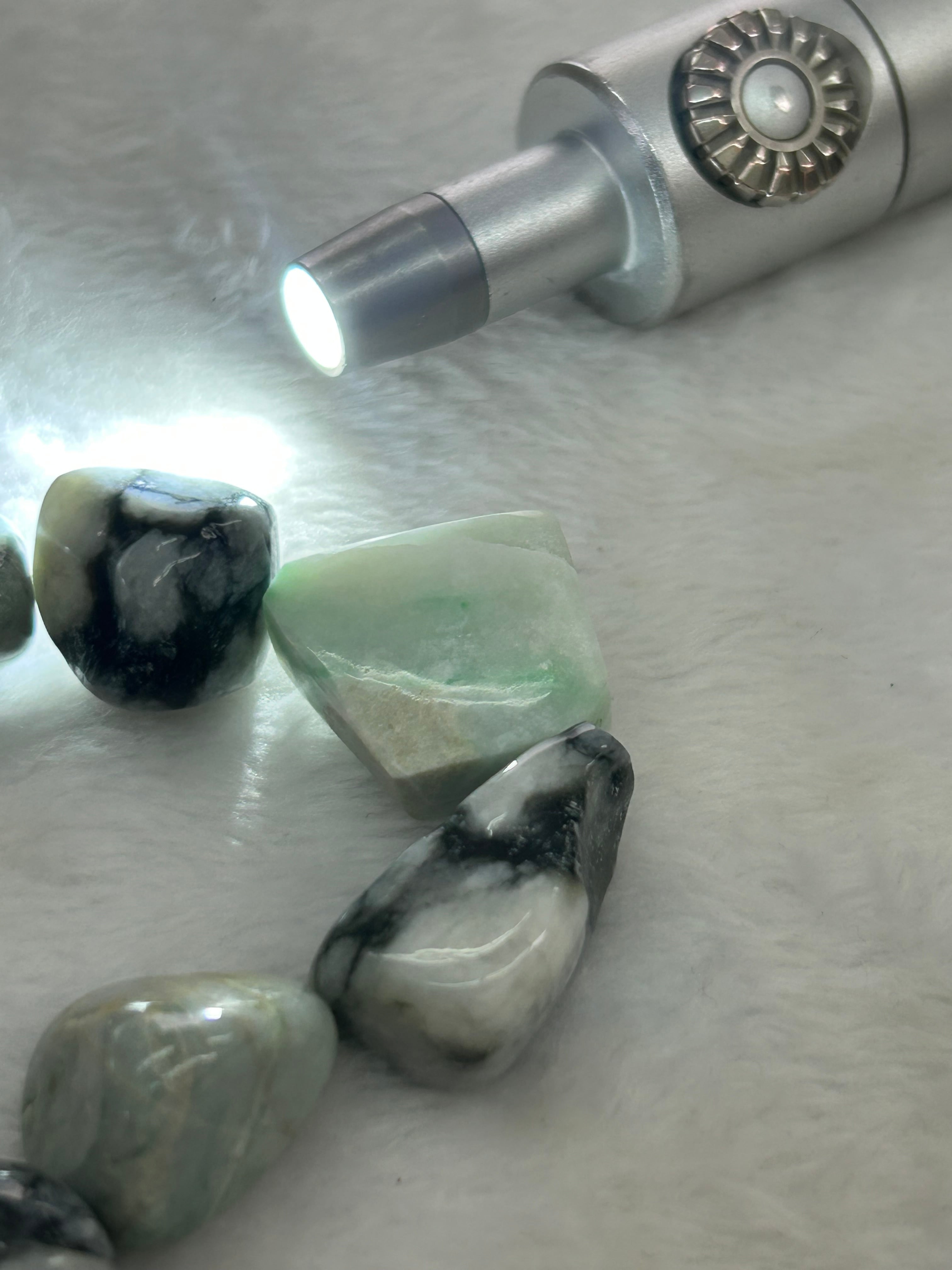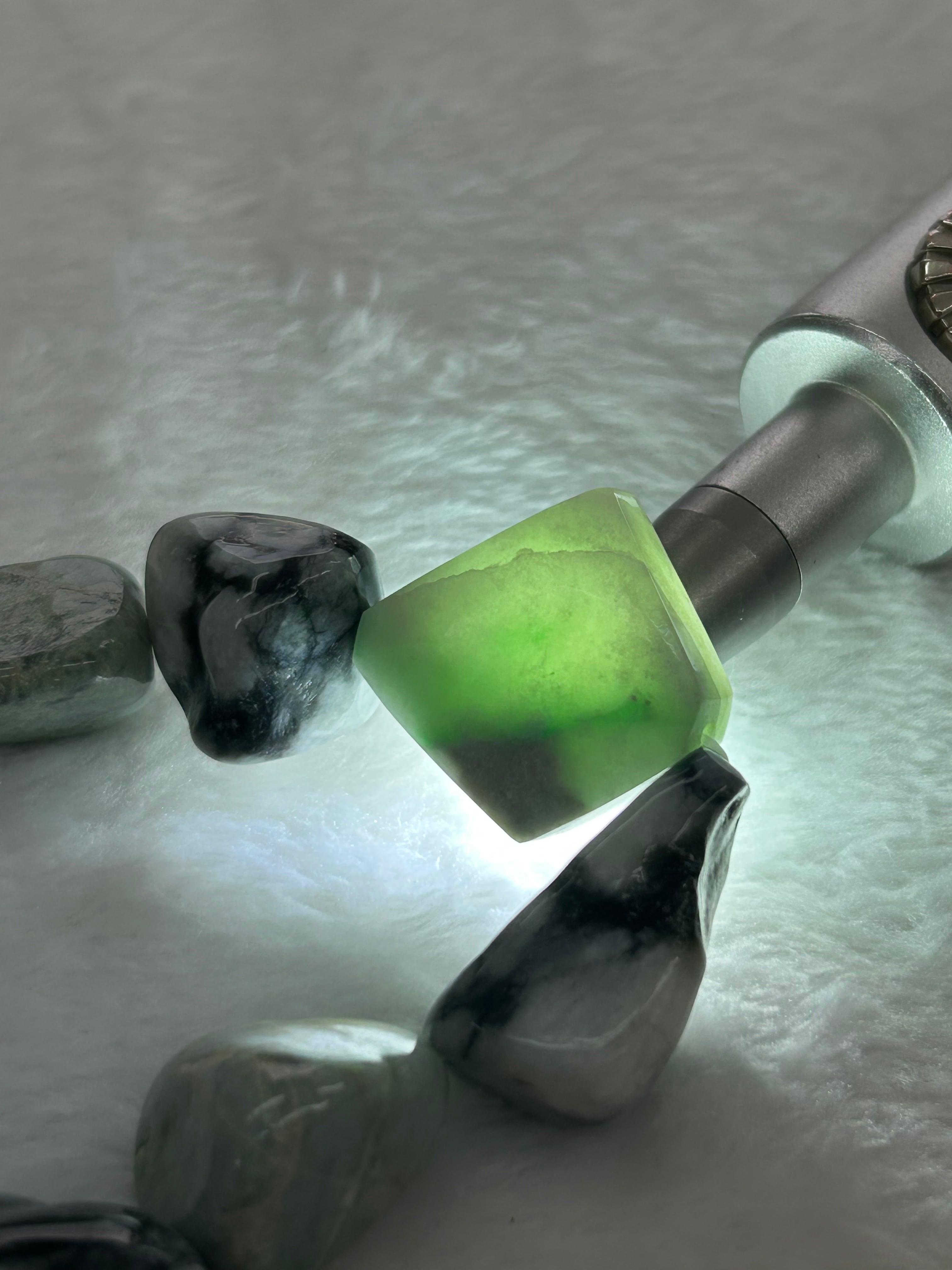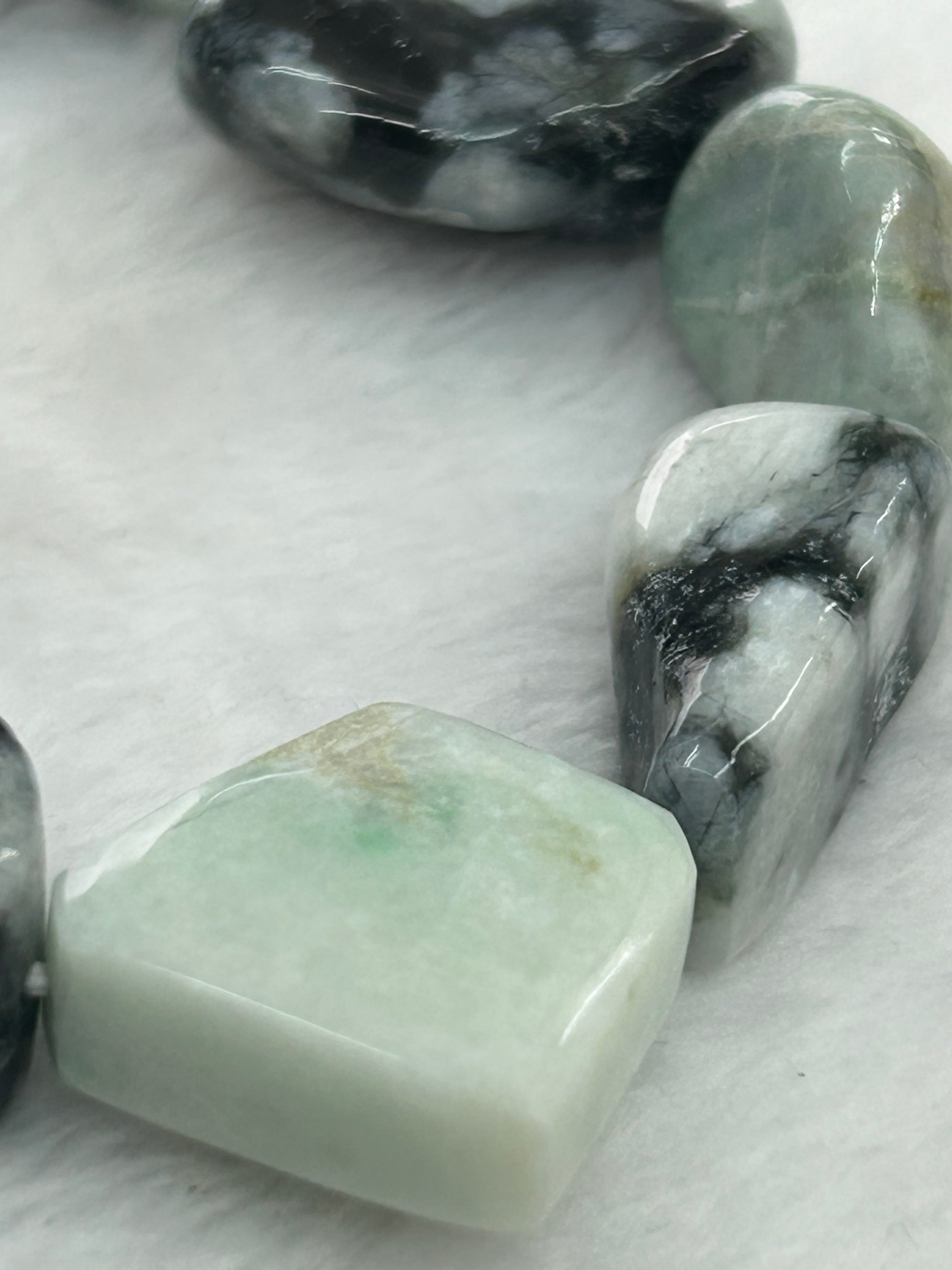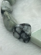 こちらのブレスレットには、親不知で採集された海中翡翠や独特な圧砕翡翠、さらには透過する矩形の翡翠が使用されており、多彩な表情を持つデザインが特徴です。これにより、あなたの手元に優雅な彩りを添える一品となっています。