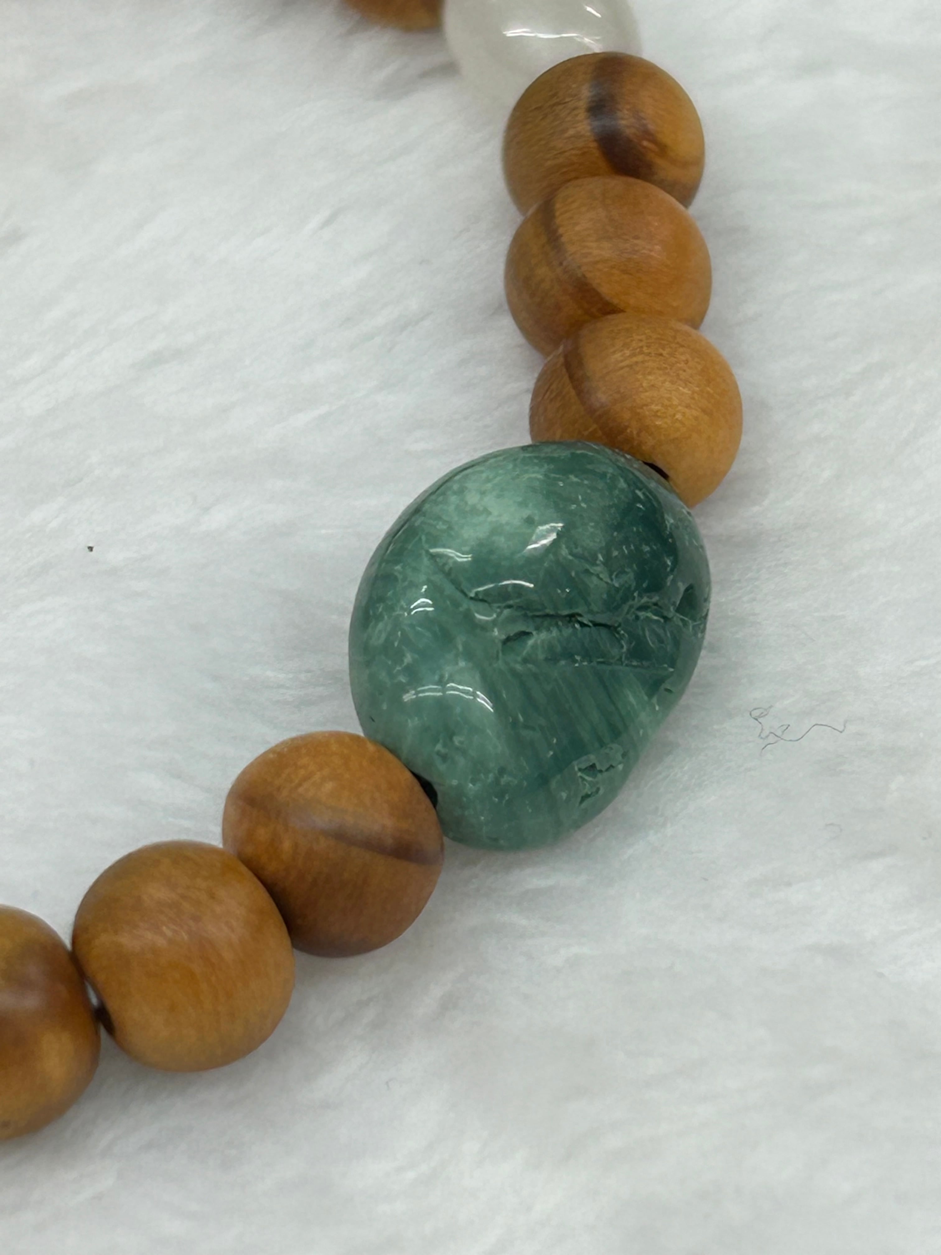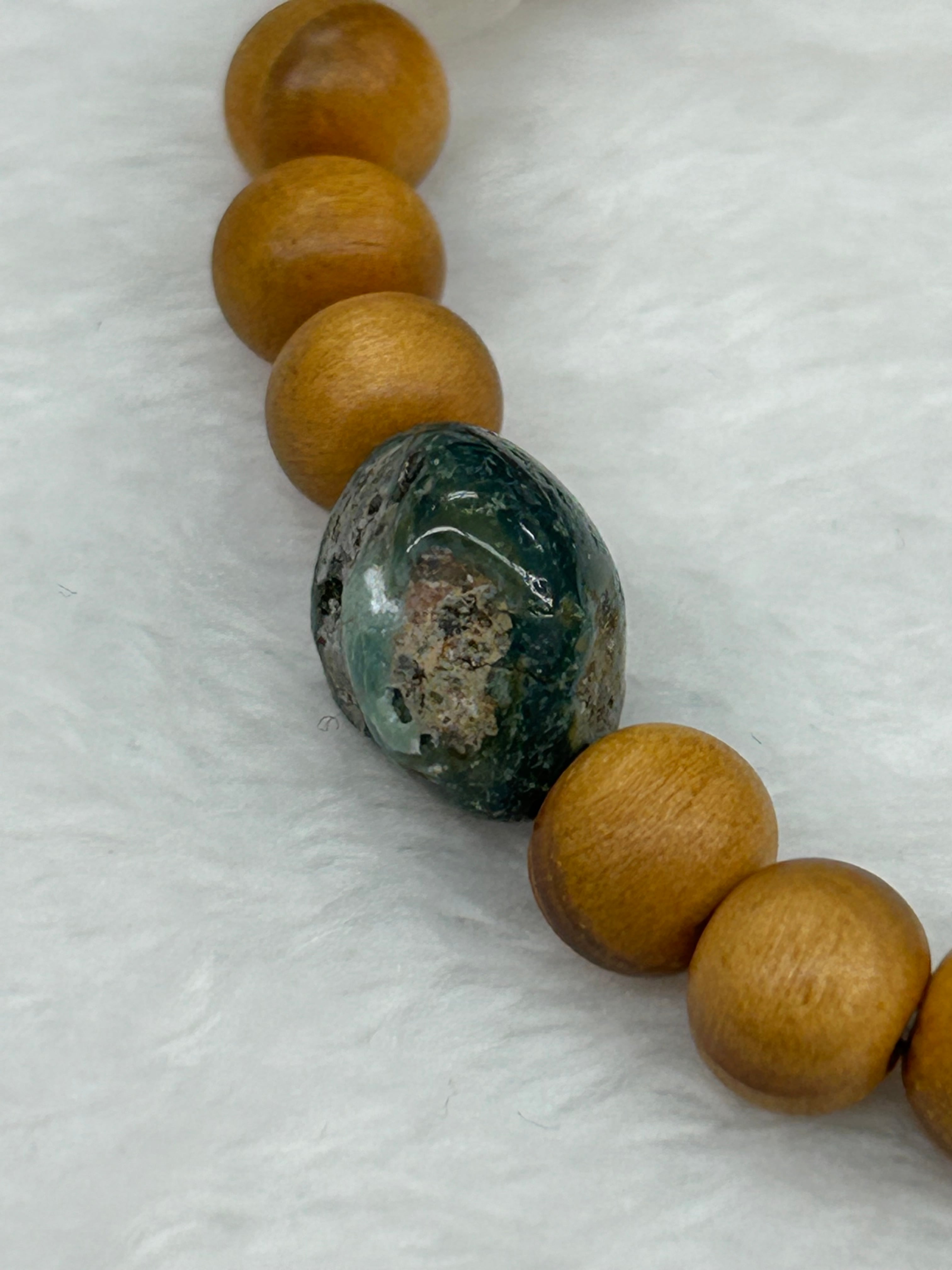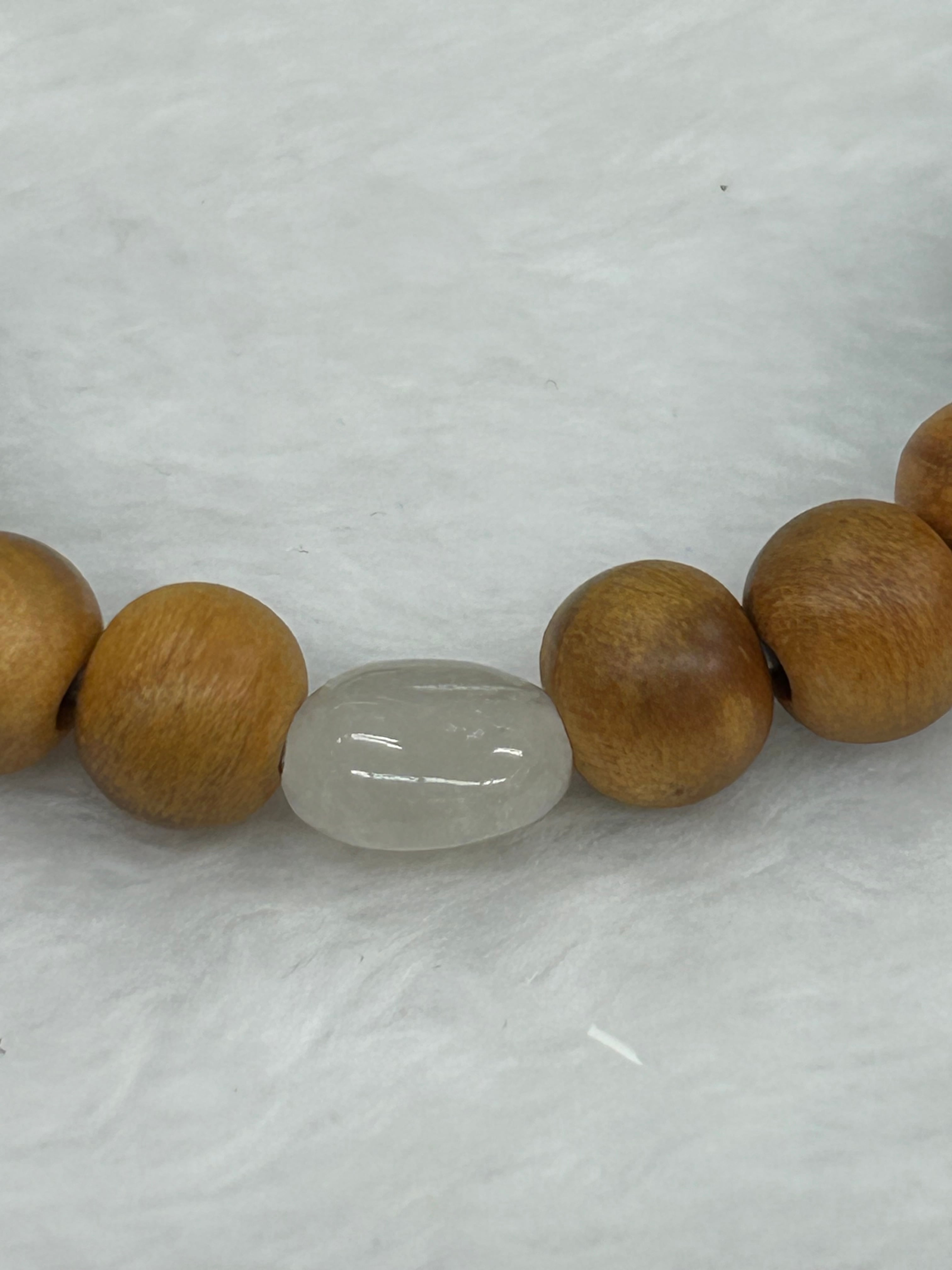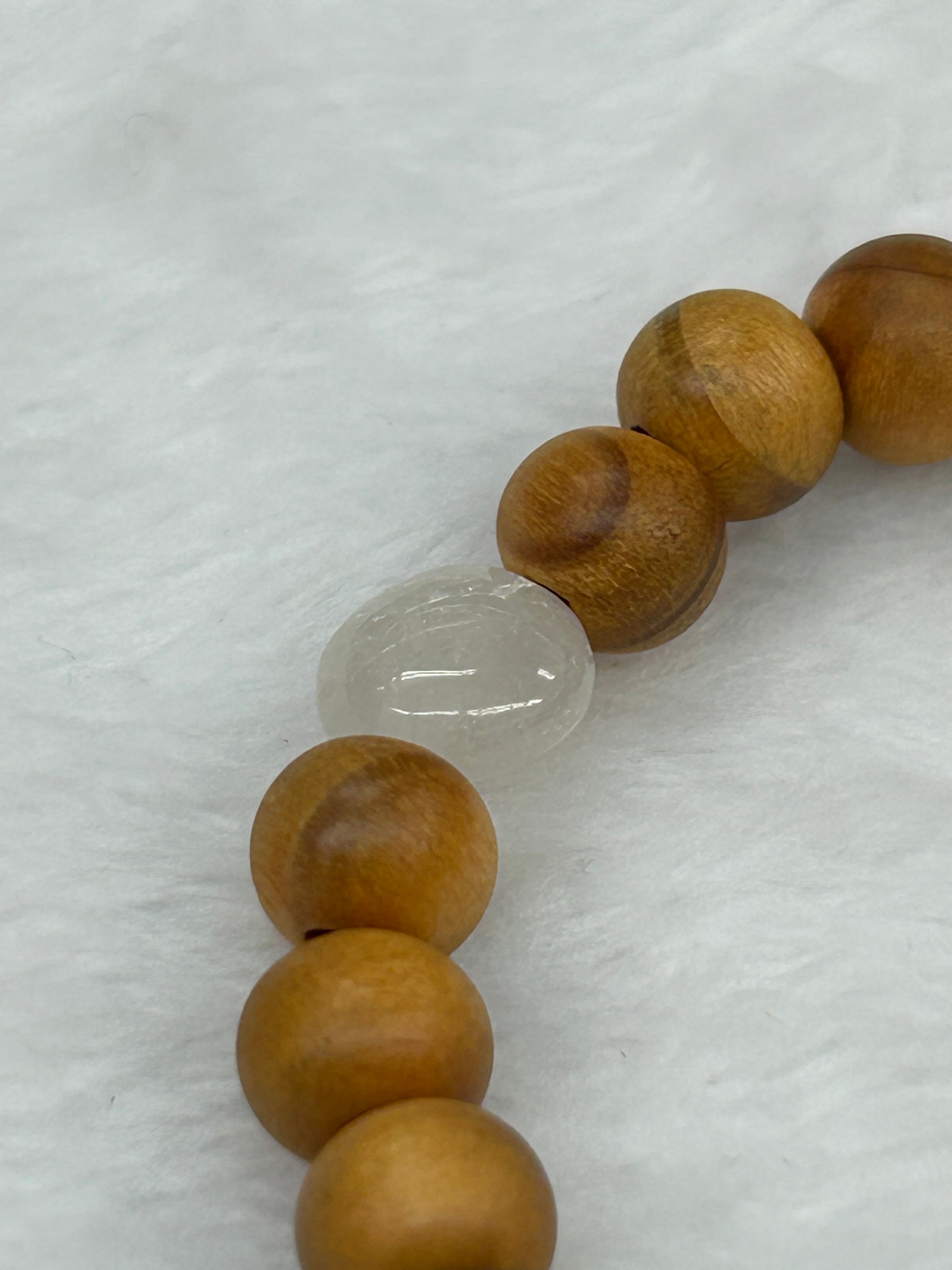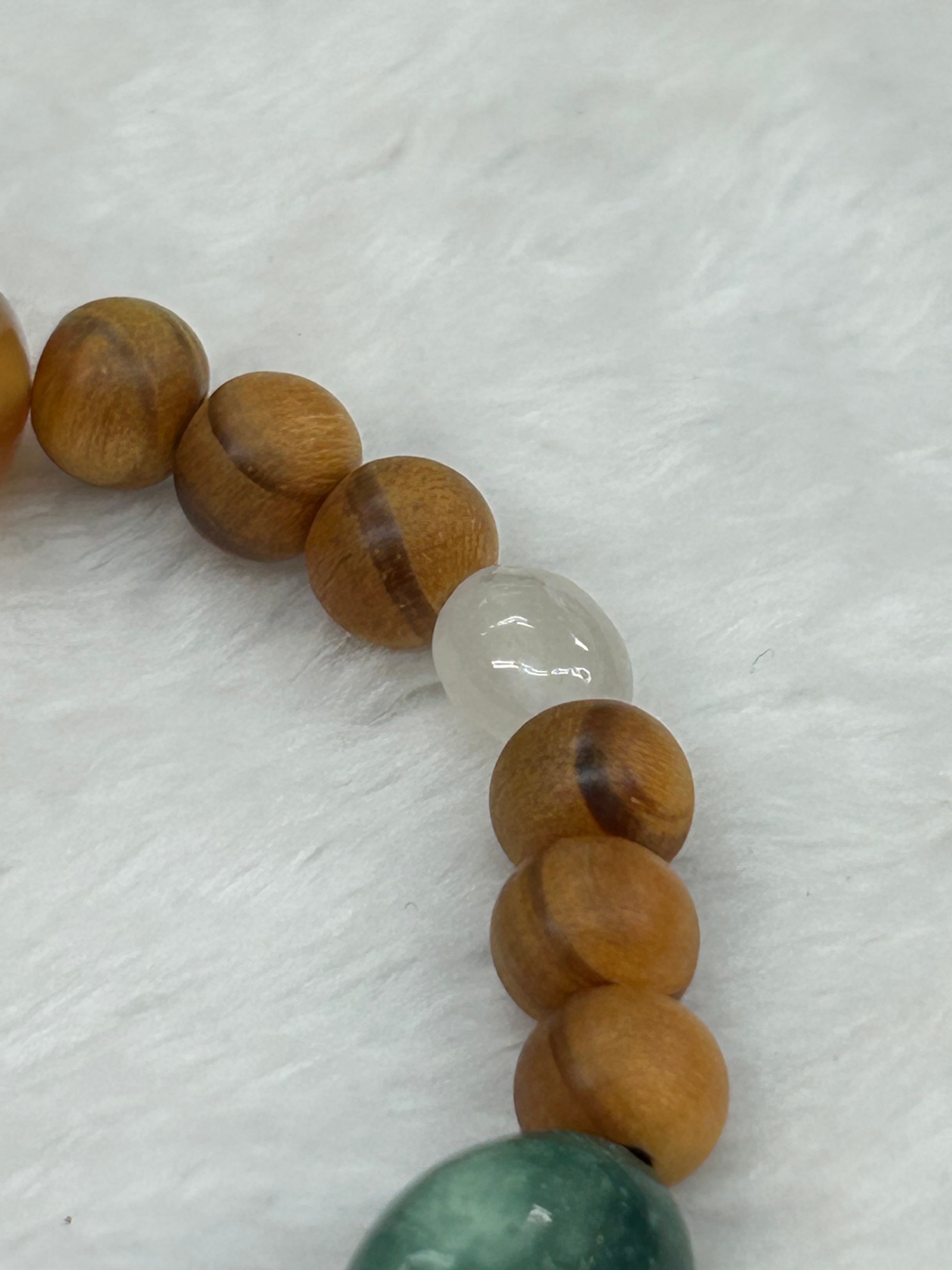 ブレスレットの内周は16.5㌢に仕上げられており、心地よいフィット感を提供します。内周に関する変更希望がある場合は、お気軽にお問い合わせください。滑らかな石たちと国産の松の木ビーズがやさしく腕に馴染み、快適に着用できる設計となっています。