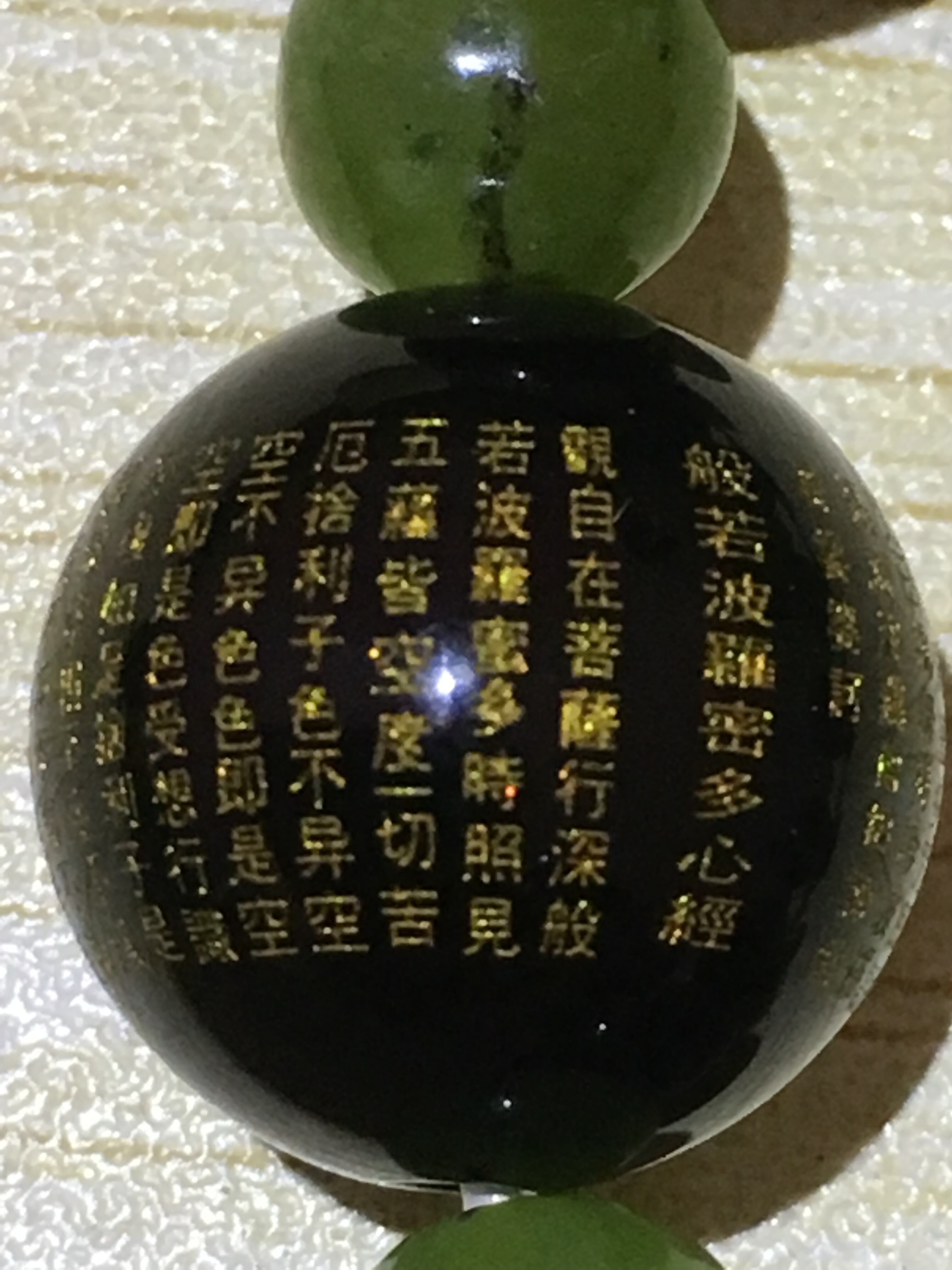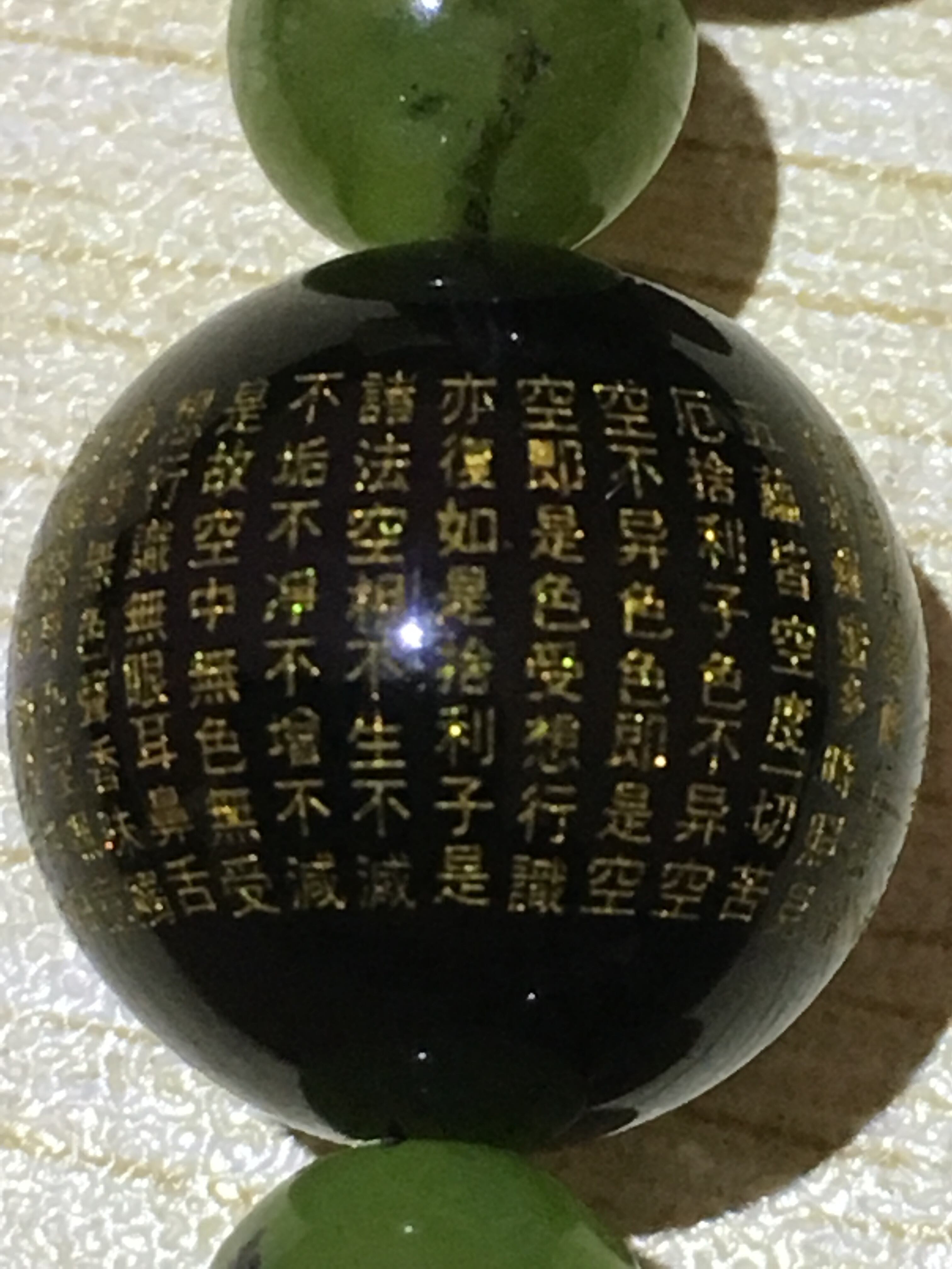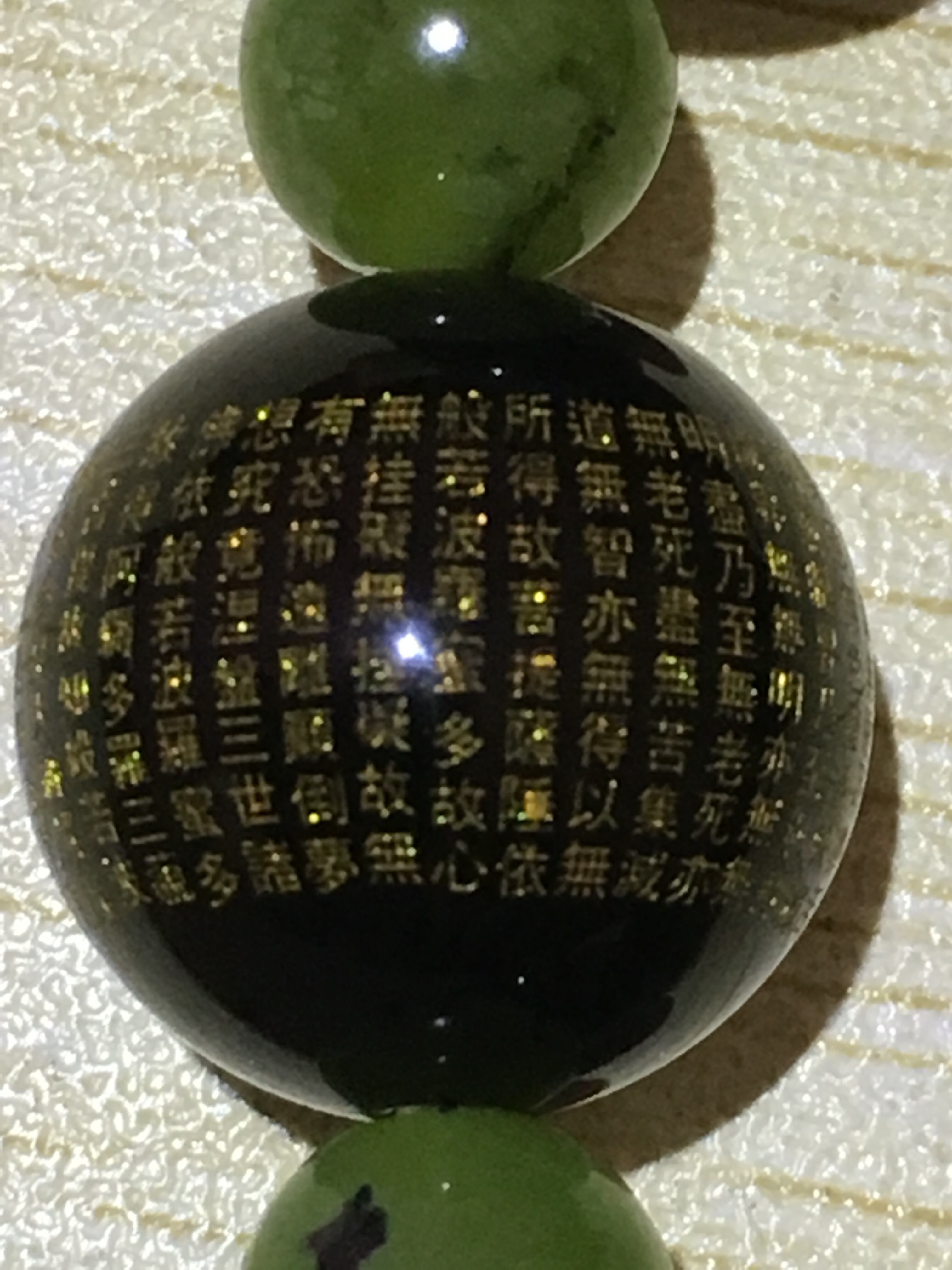 腎臓の守り石とされるネフライトの鮮やかなグリーンカラーが、般若心経の金文字と組み合わされることで、癒しの要素が生まれてきます。