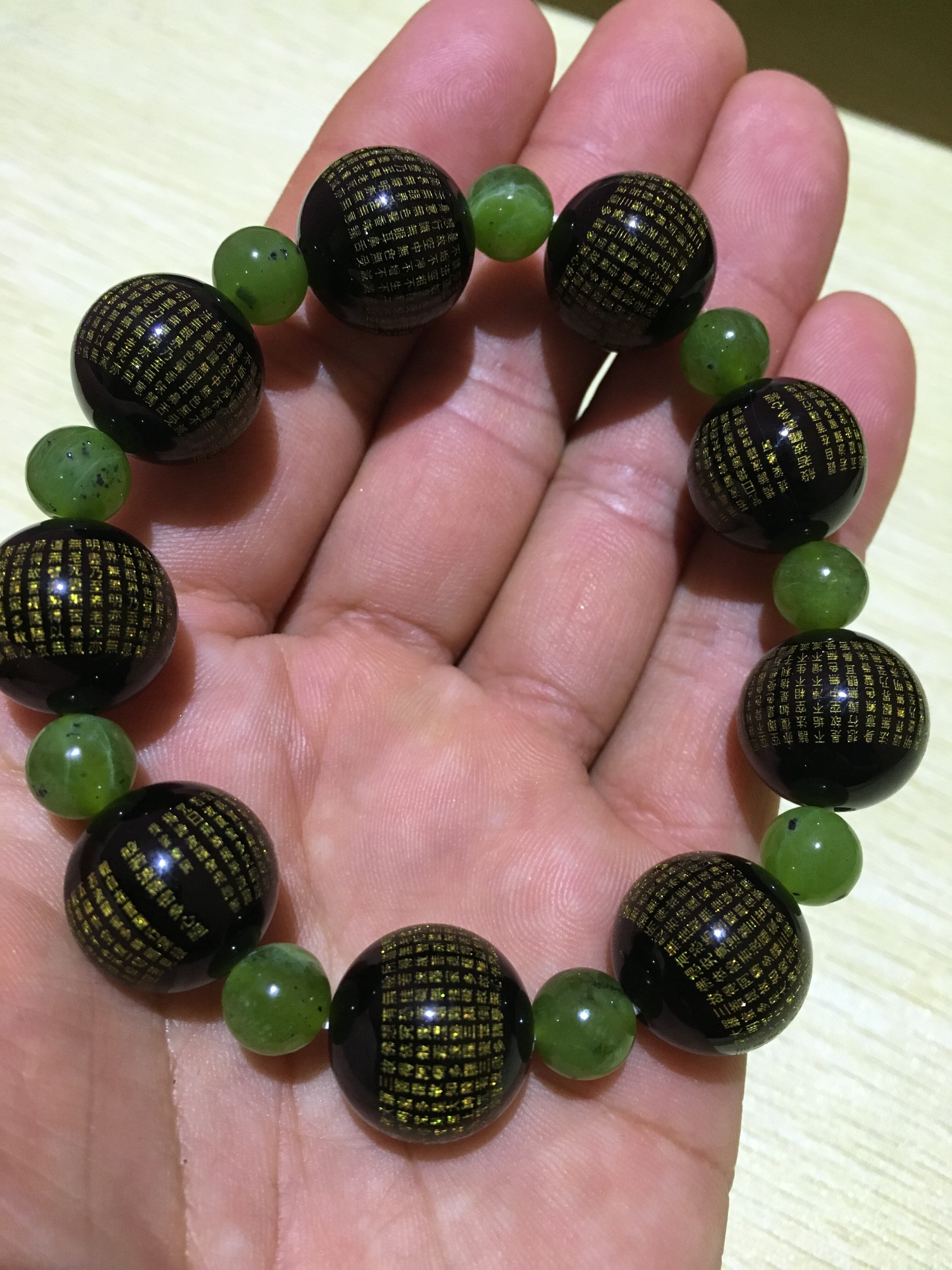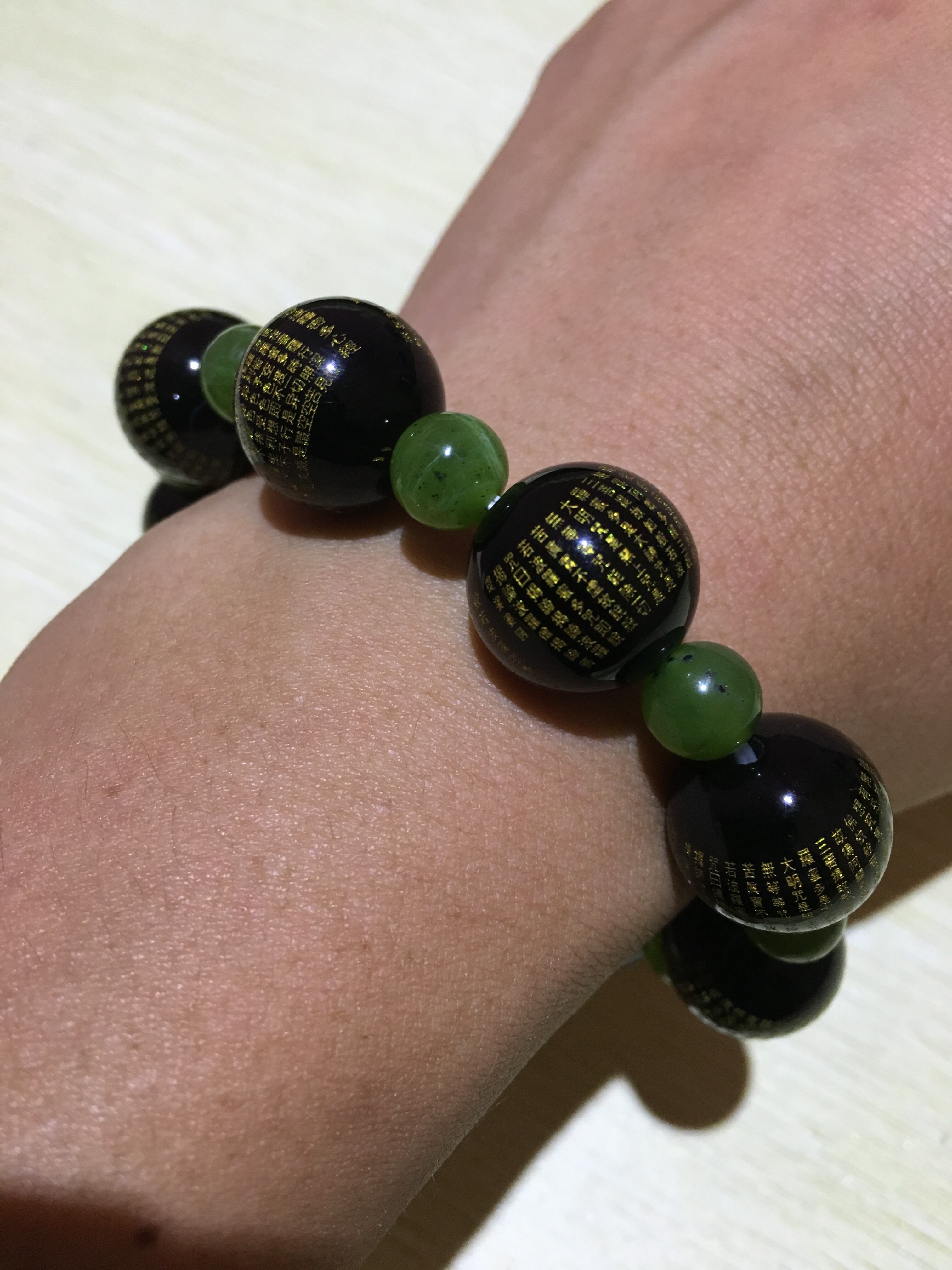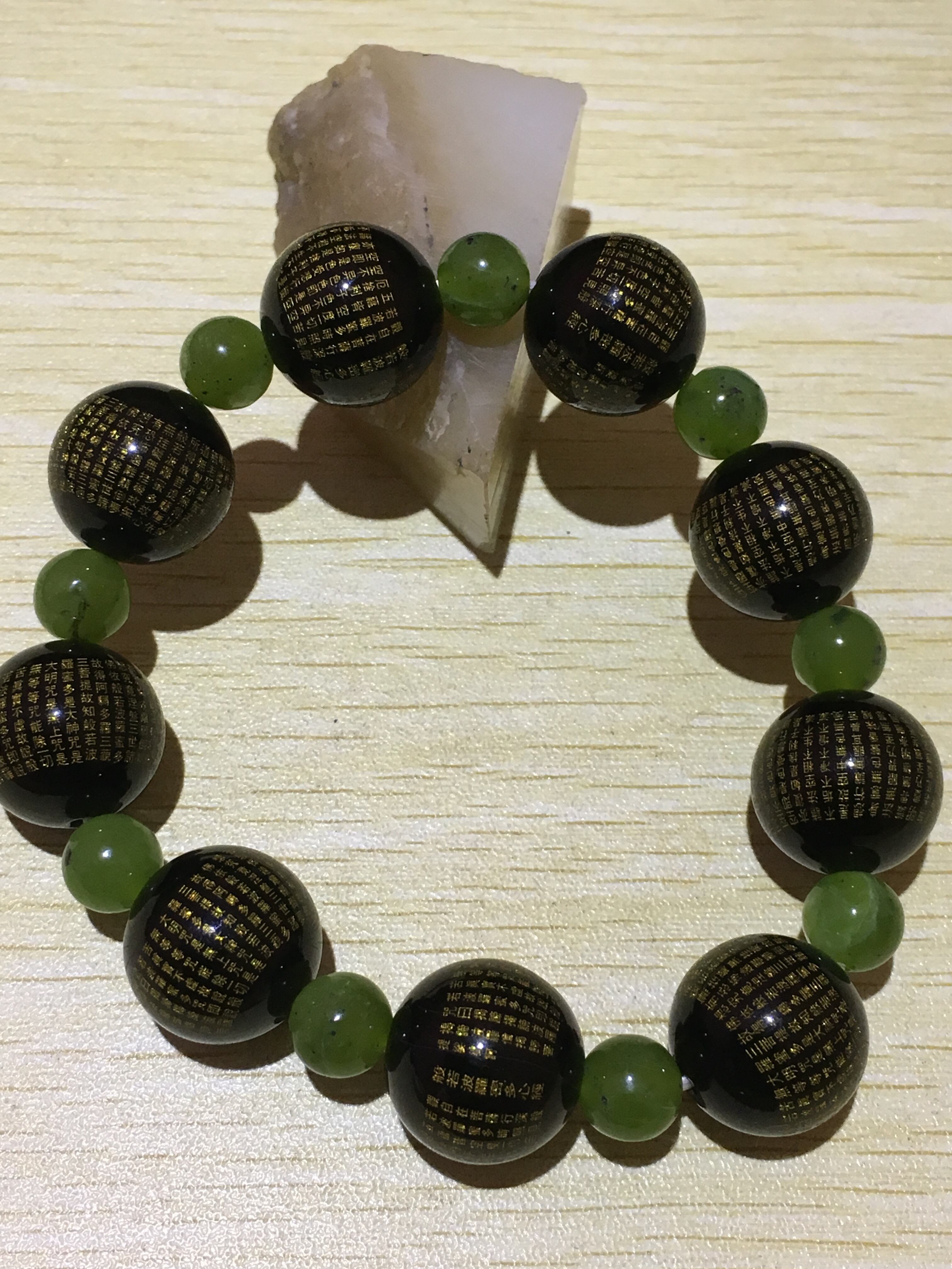 腎臓の守り石とされるネフライトの鮮やかなグリーンカラーが、般若心経の金文字と組み合わされることで、癒しの要素が生まれてきます。