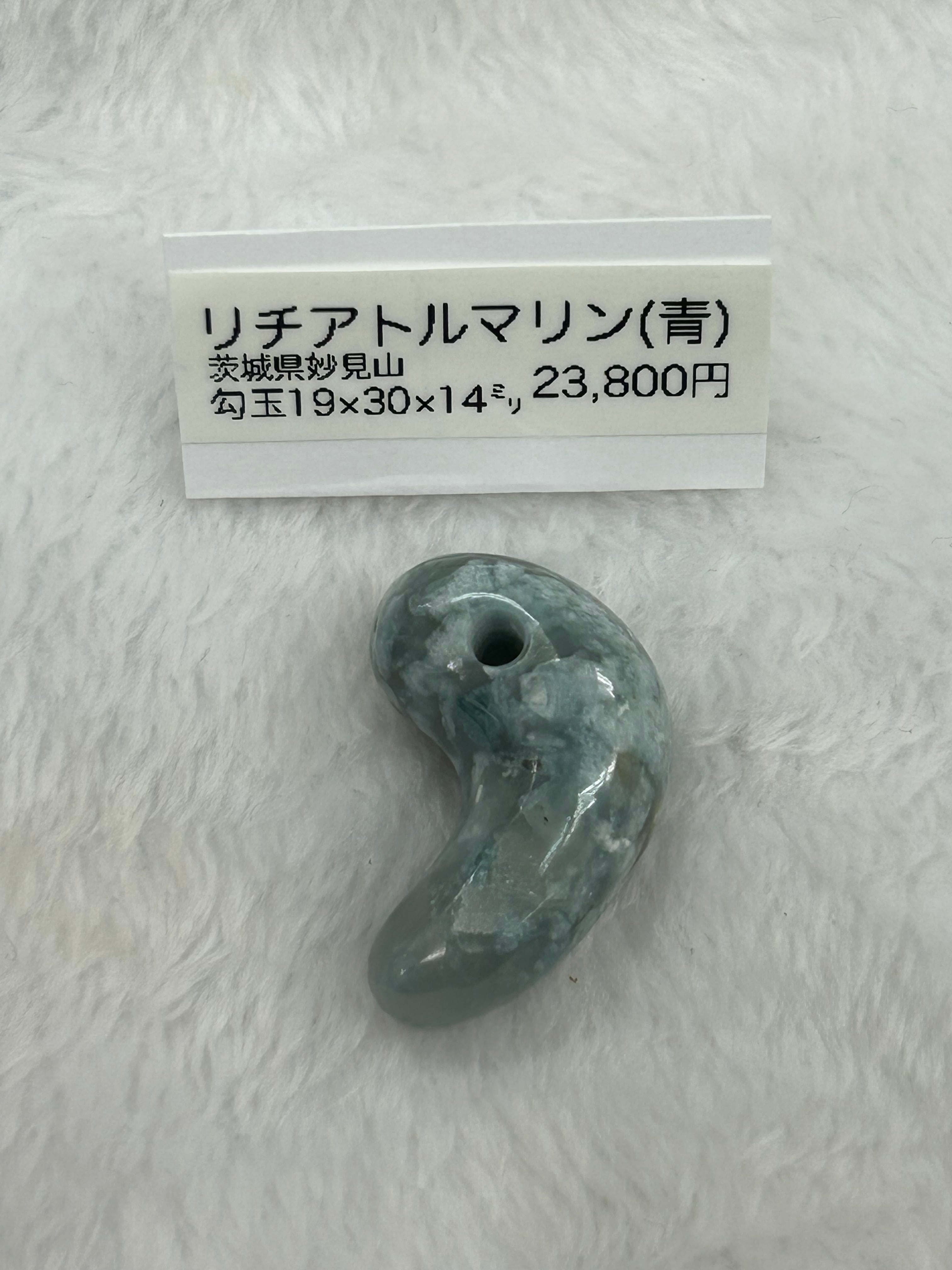 この商品は、茨城県妙見山のリチアトルマリンを使用して作られた「(青)リチアトルマリン入り長石 勾玉19×30×14ミリ」です。