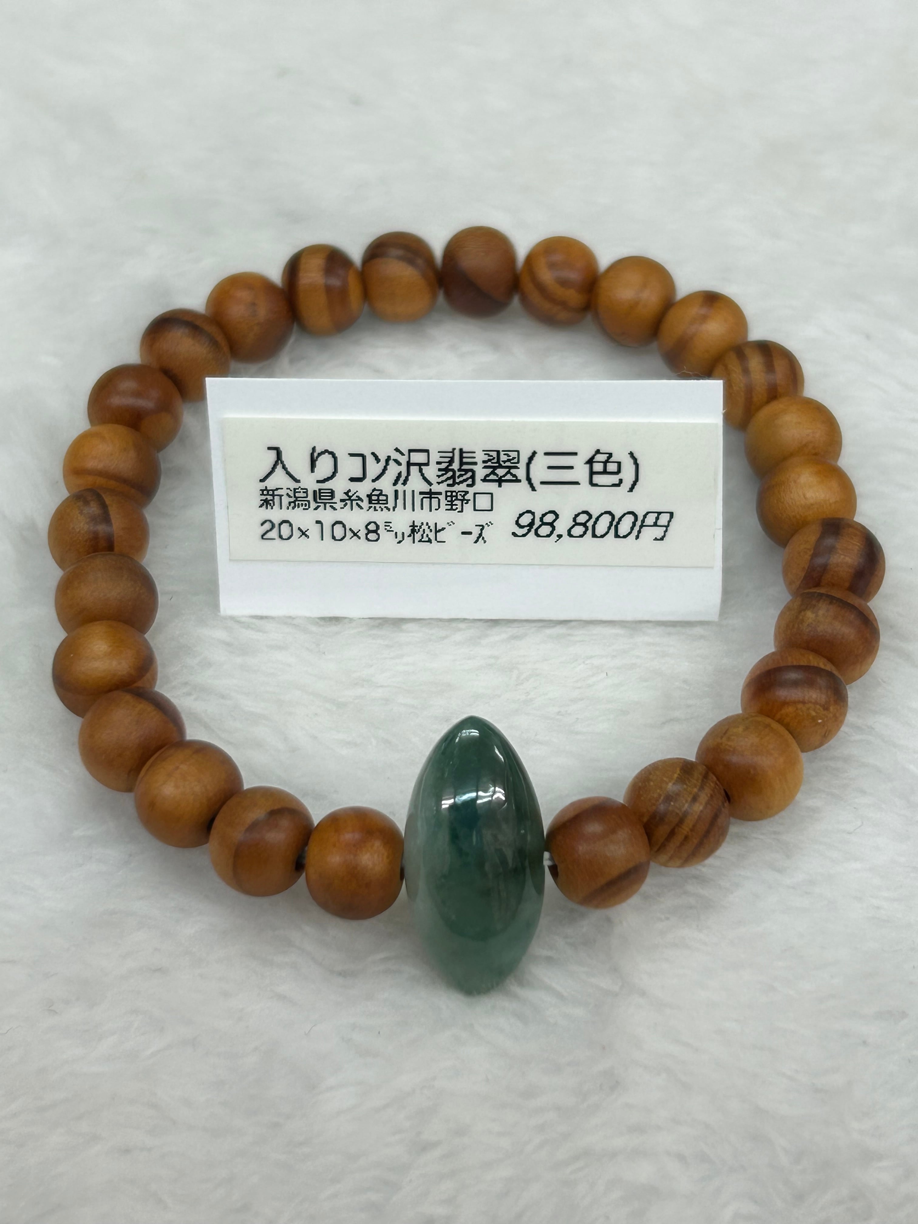 この商品は、糸魚川産の希少な翡翠を使用した「三色入りコン沢マーキスビーズ20×10×8㍉ 松の木ビーズブレスレット内周17㌢」です。