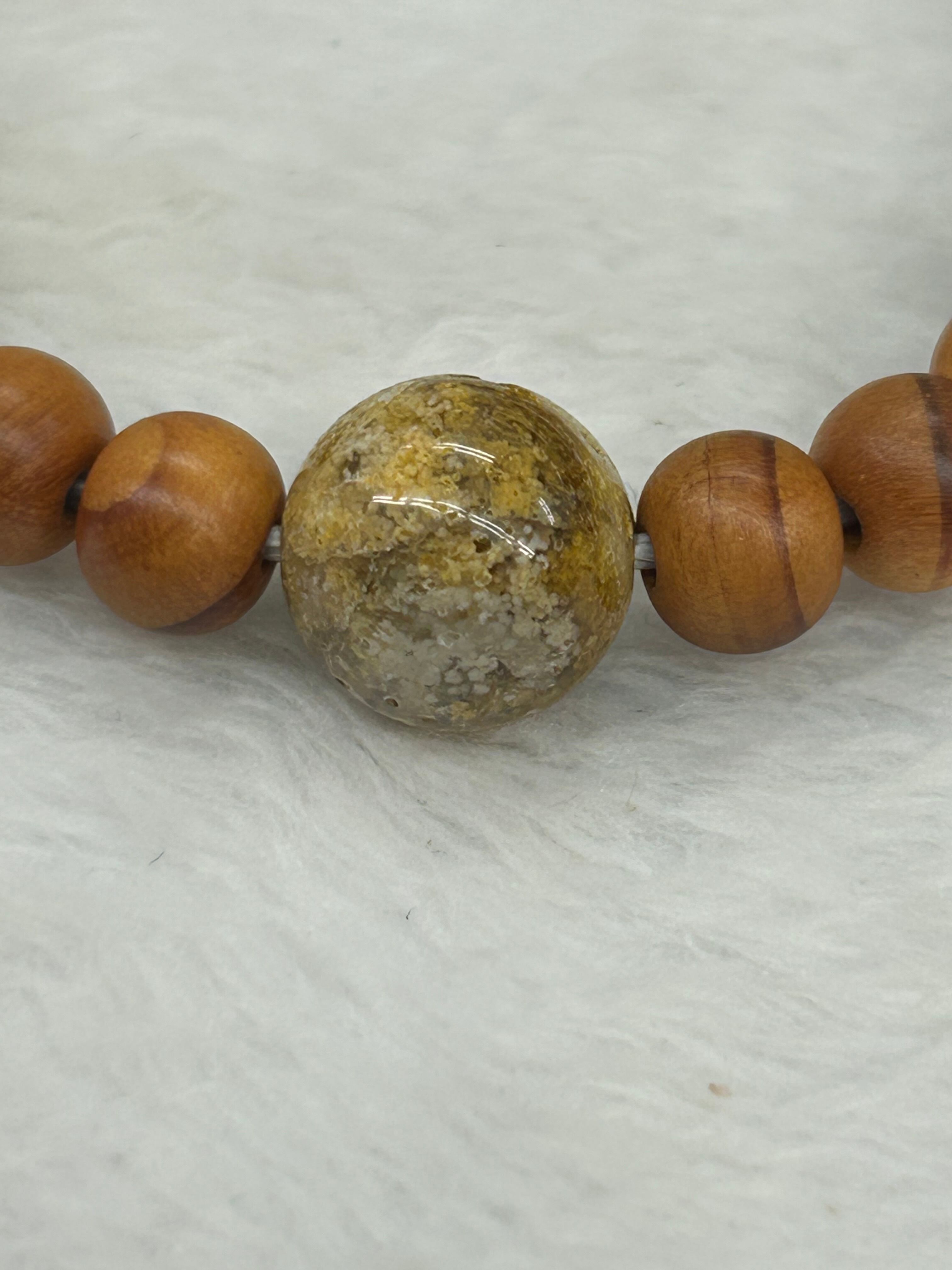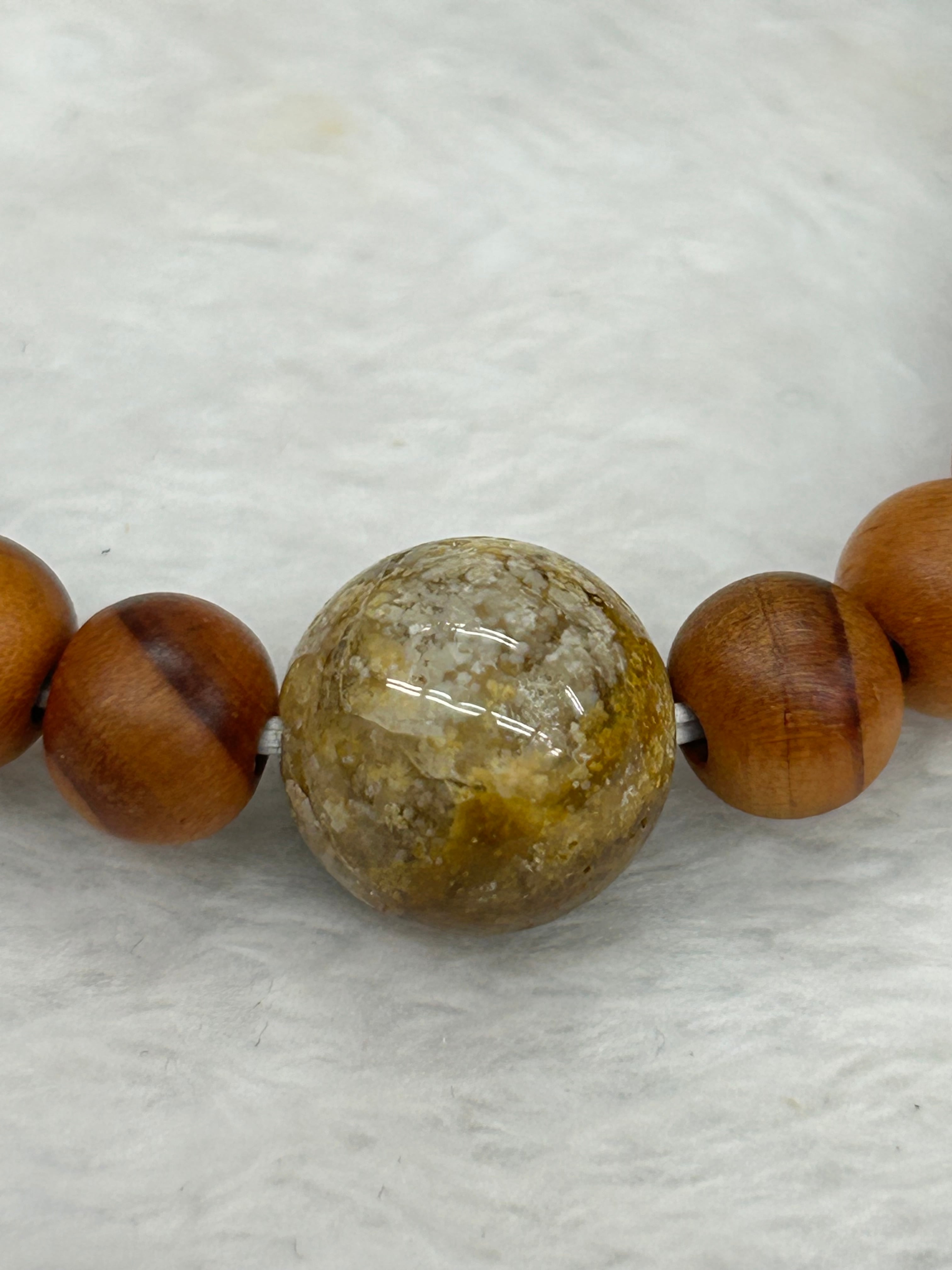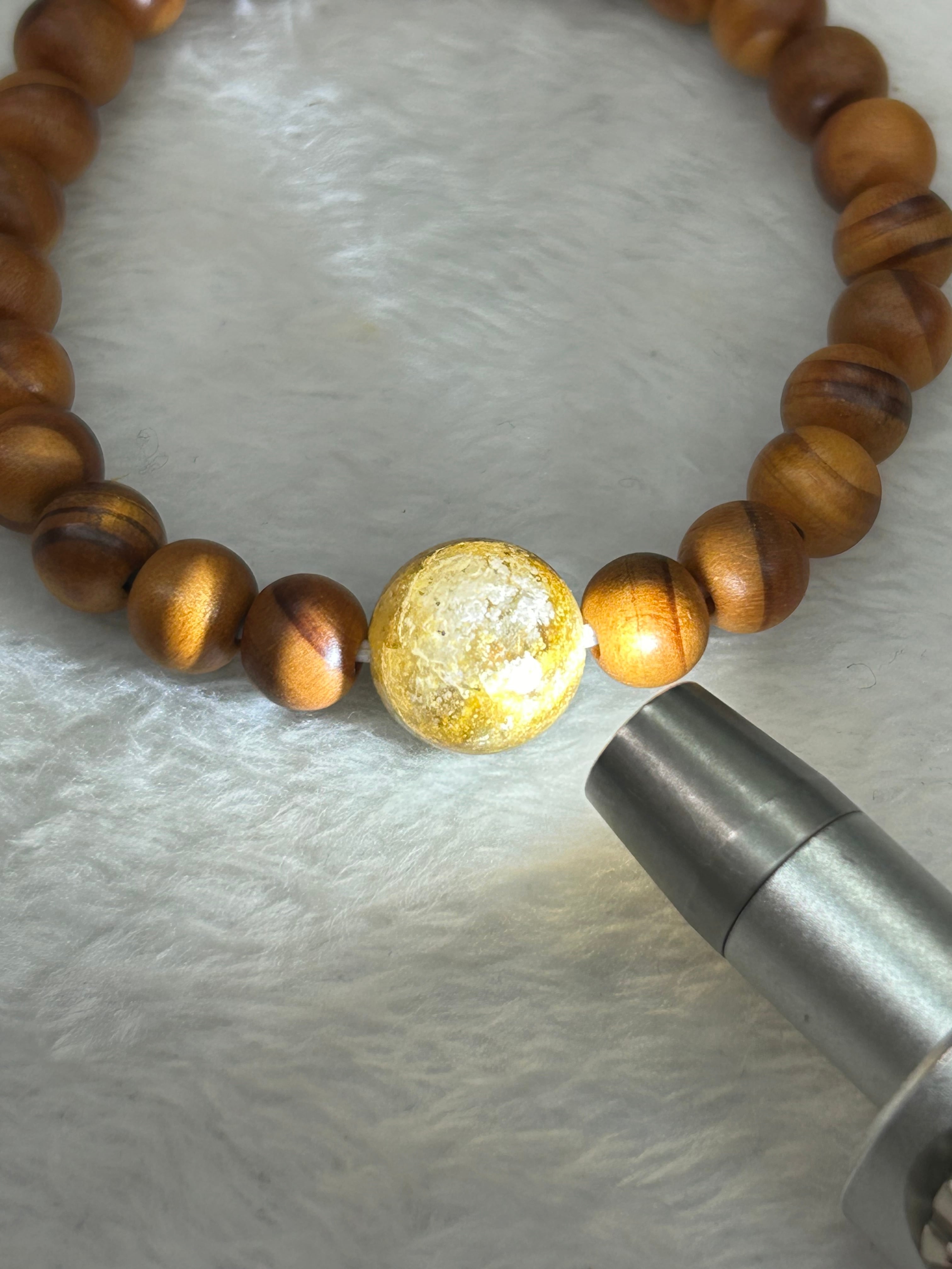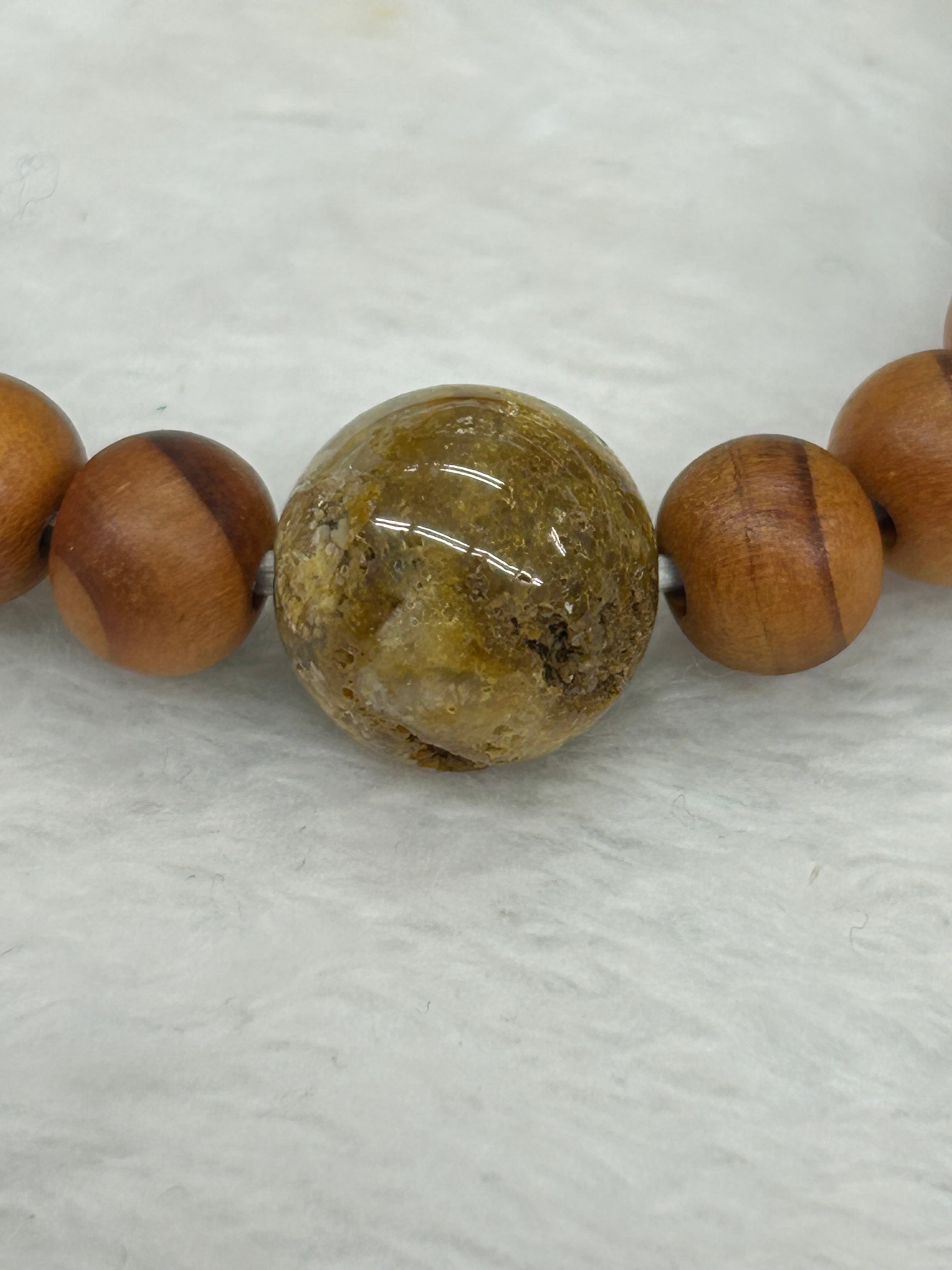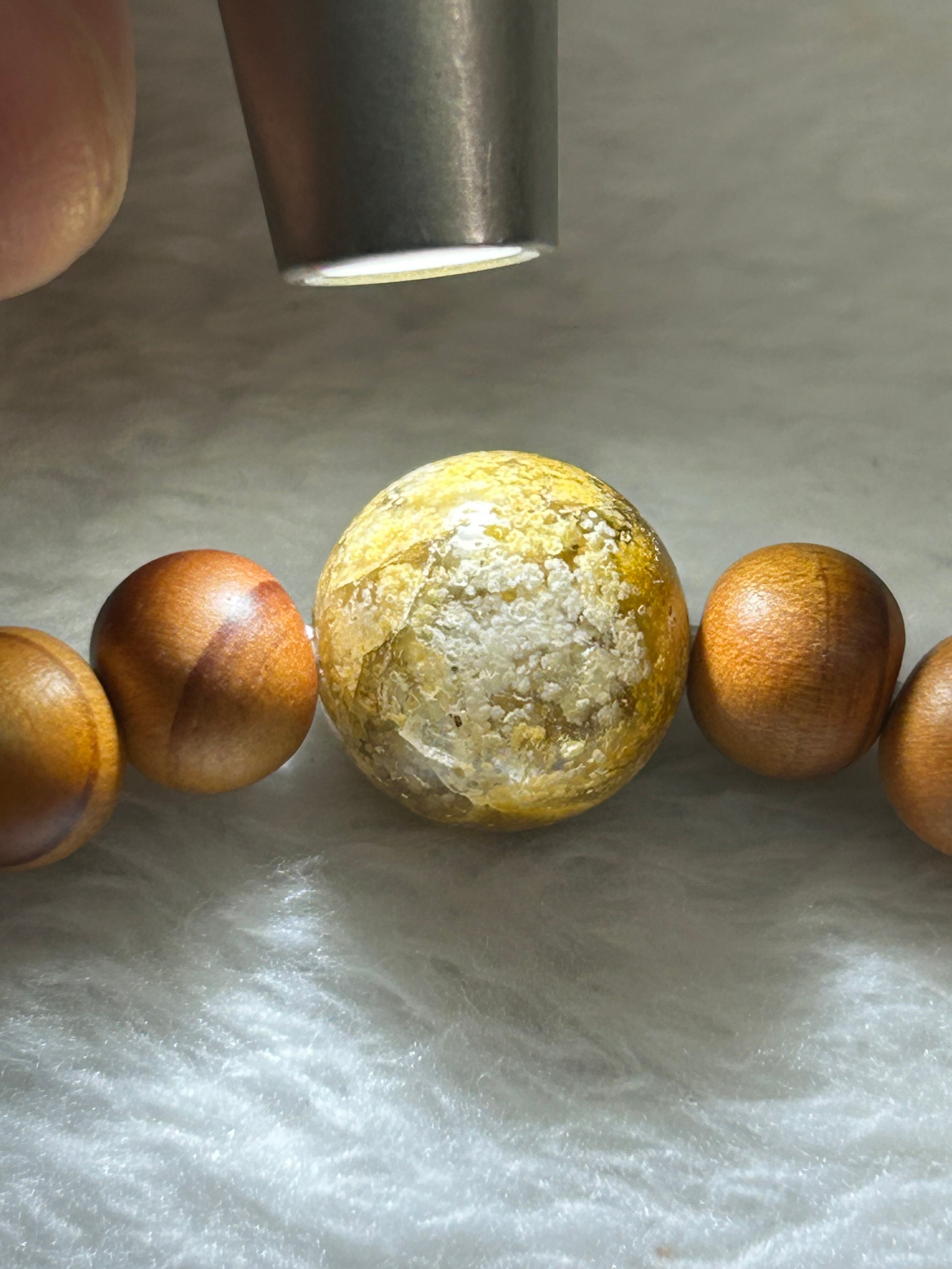 こちらのブレスレットには、13㍉玉で特徴的な白と黄色の内包物が含まれています!美しく透明な部分が約2割ほど見え、まるで自然の芸術品のような魅力を持つ一品です。国産の松の木を使用し、丁寧に組み上げたこのブレスレットは、製品としての温もりを感じさせます。内周は約16.5センチで、程よいフィット感を実現しています。ブレスレットのサイズ変更できます。メッセージをお願いいたします。