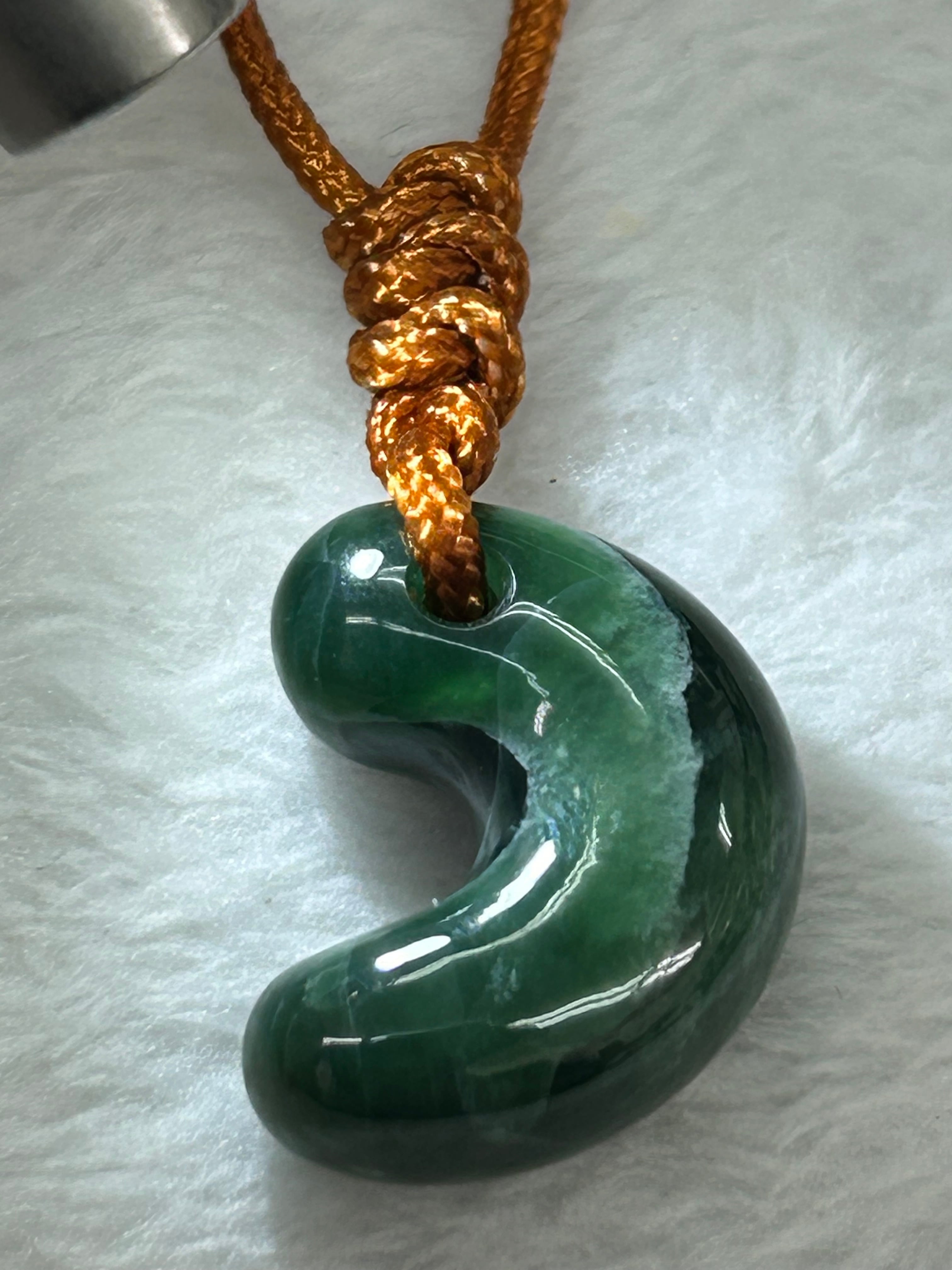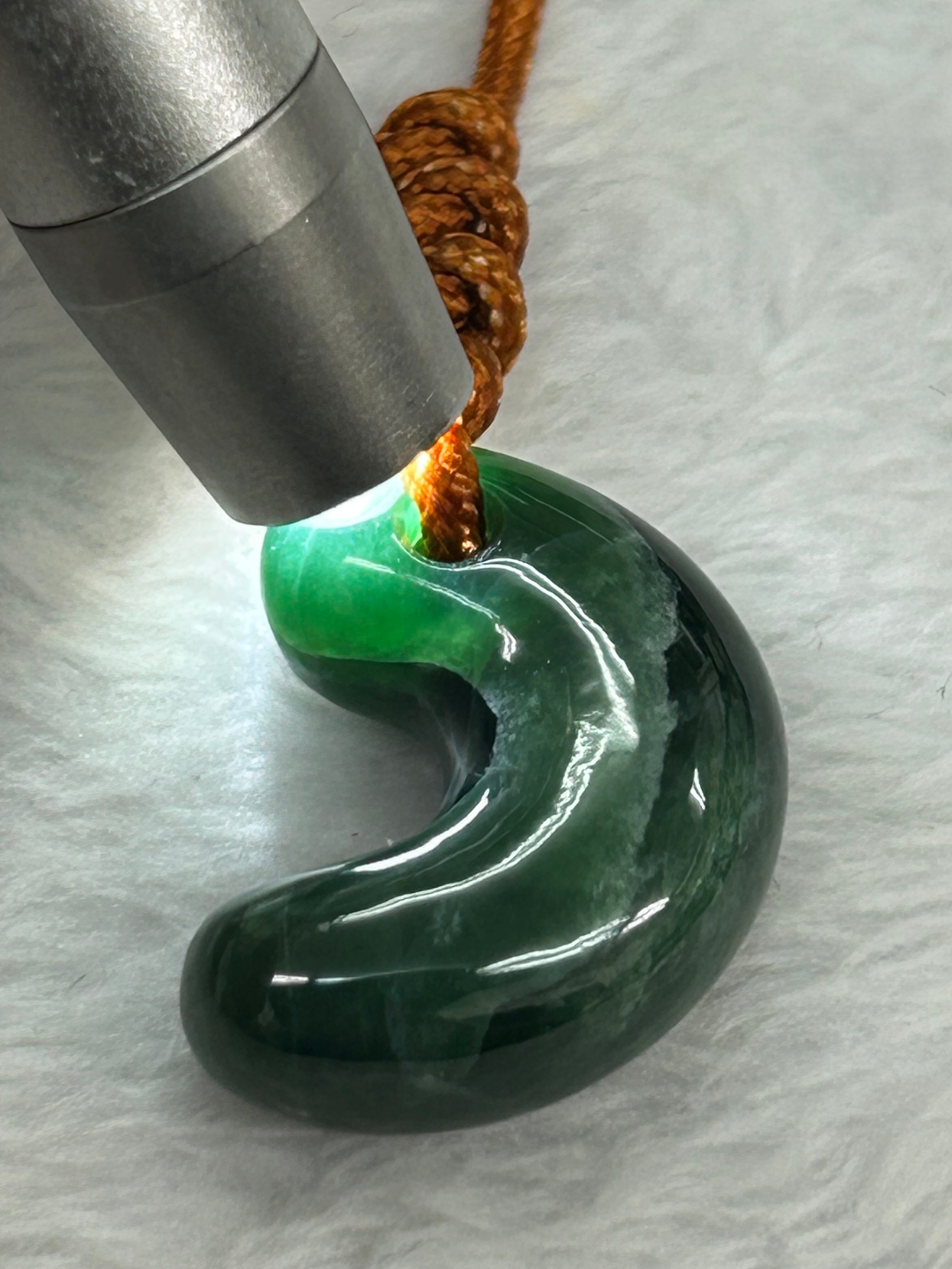 こちらの勾玉は、濃い緑色の翡翠を贅沢に使っており、独特な石目(クラック)が存在しますが、それもまたこの翡翠の魅力の一部です!この勾玉は、丁寧に仕上げられており、翡翠の深みある色合いがあなたの存在感を引き立てることでしょう。サイズは幅17×高さ22×厚み9ミリで、手に馴染む絶妙な大きさです。