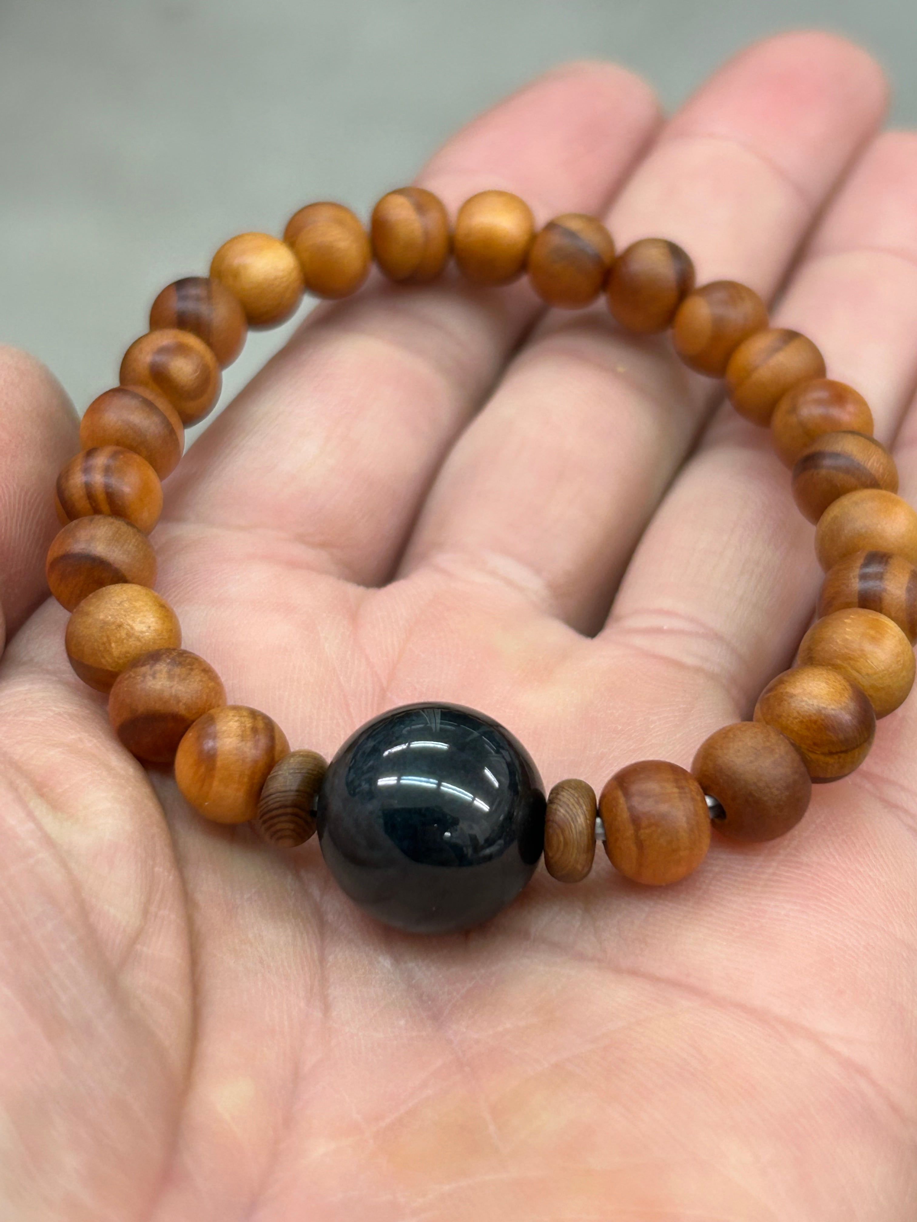 15ミリ 入りコン沢 1粒ブレスレット 松の木、杉の木ビーズ16.5㌢内周