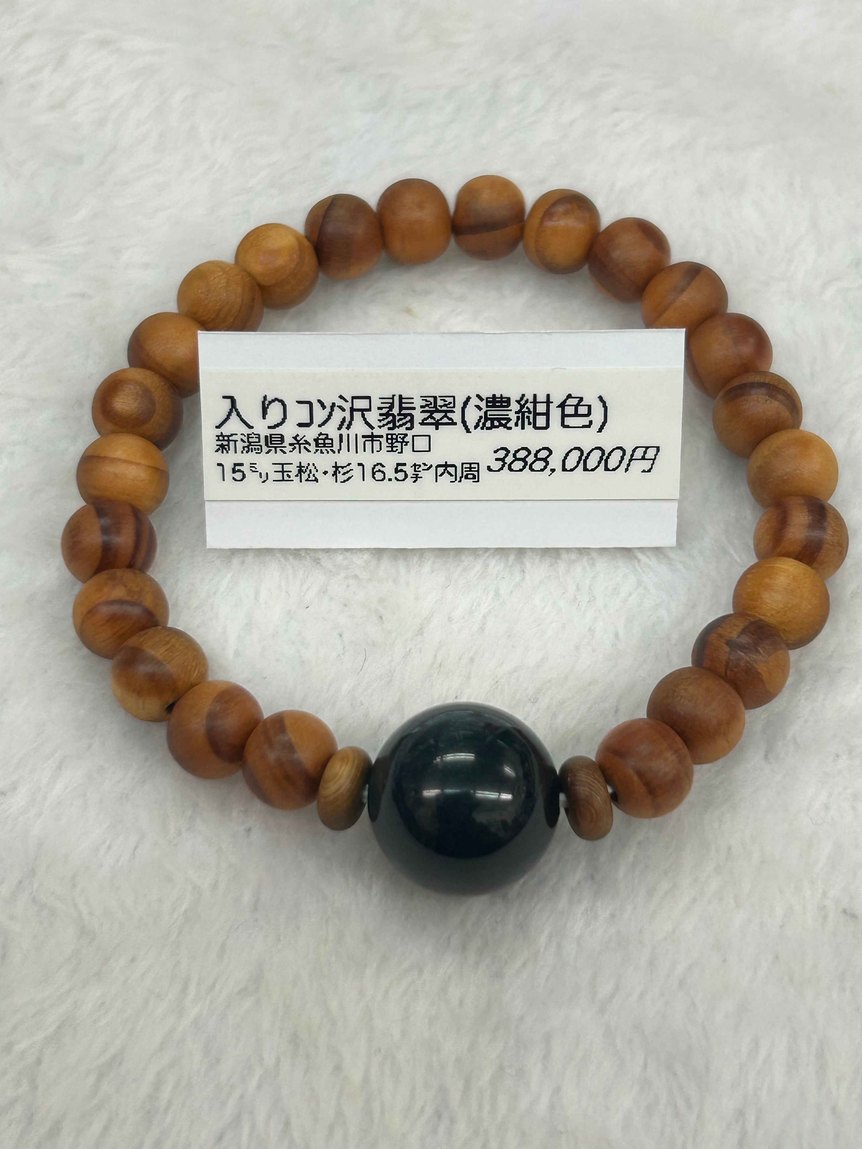 この商品は、大変濃い紺色の糸魚川翡翠を使用した「15ミリ 入りコン沢 1粒ブレスレット 松の木、杉の木ビーズ16.5㌢内周」です。