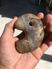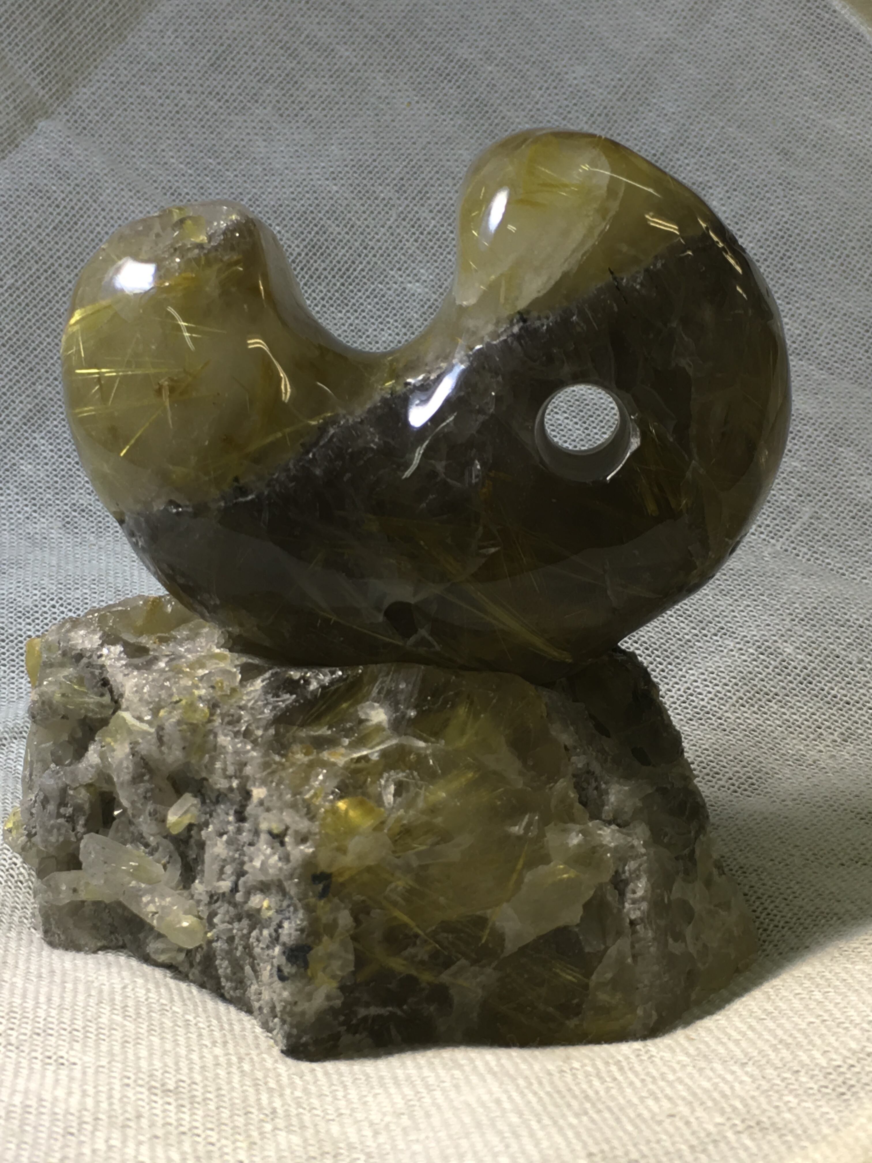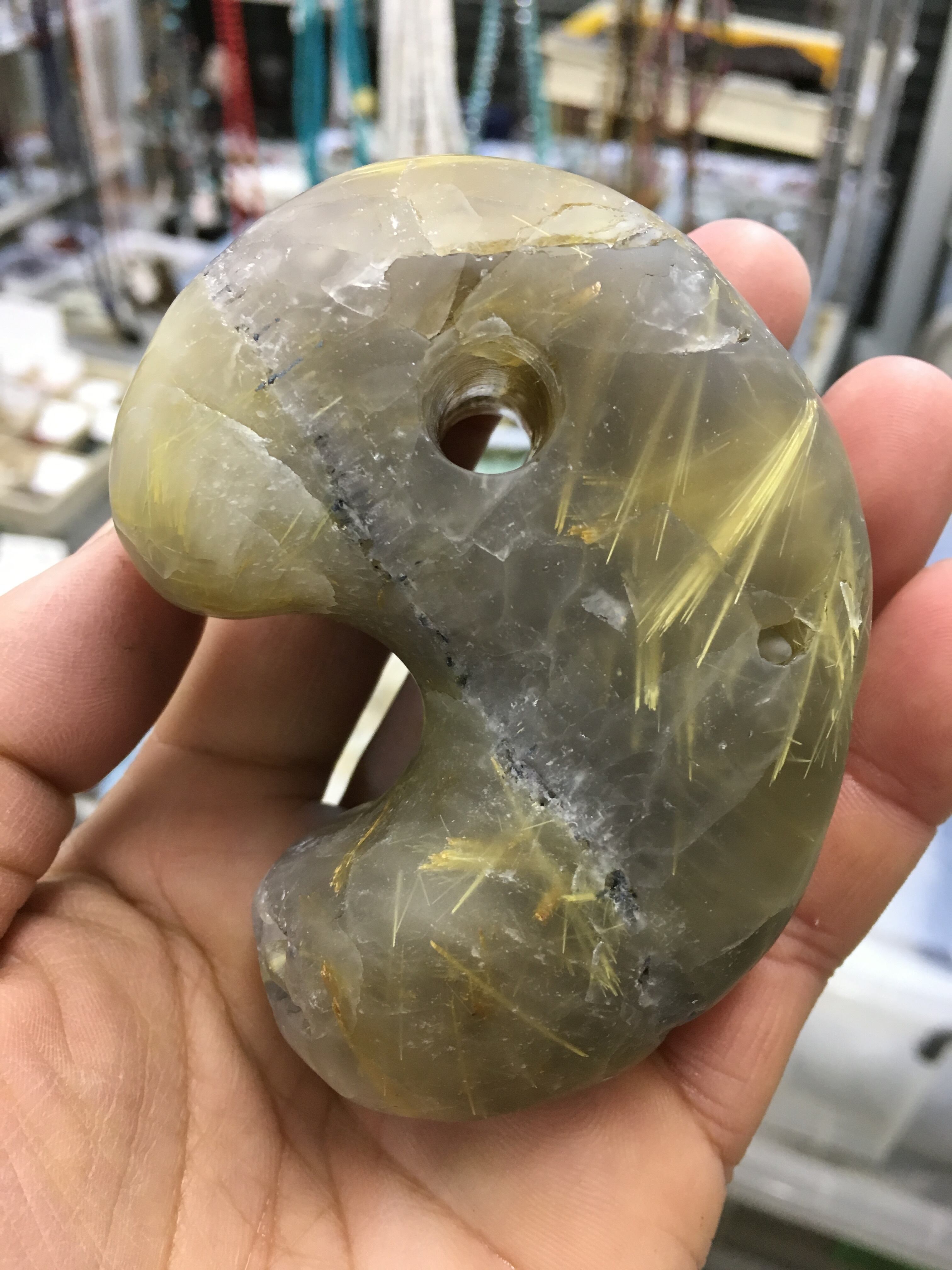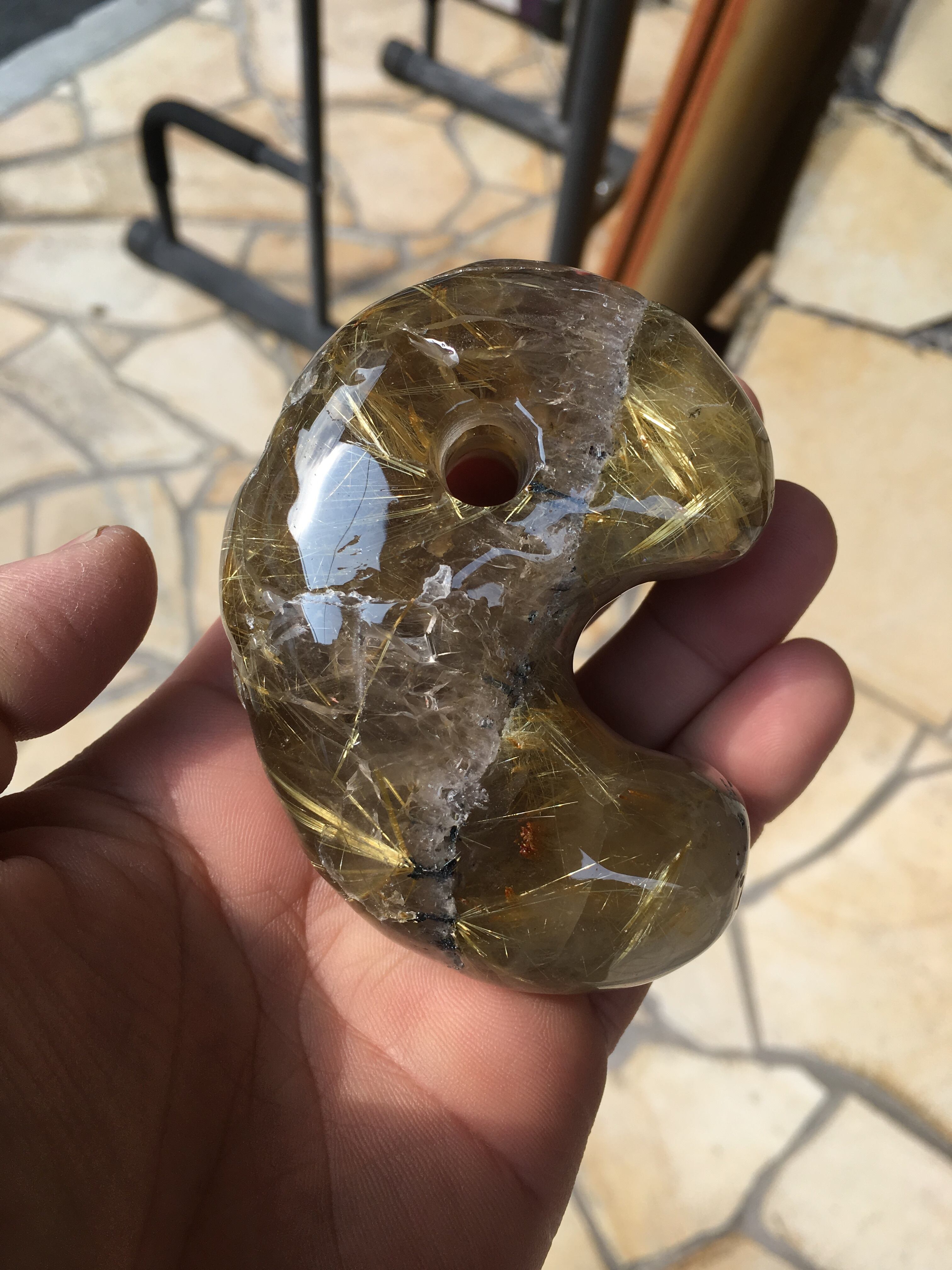 この勾玉は、ルチルクォーツのクラスター的な原石から削り出しました。