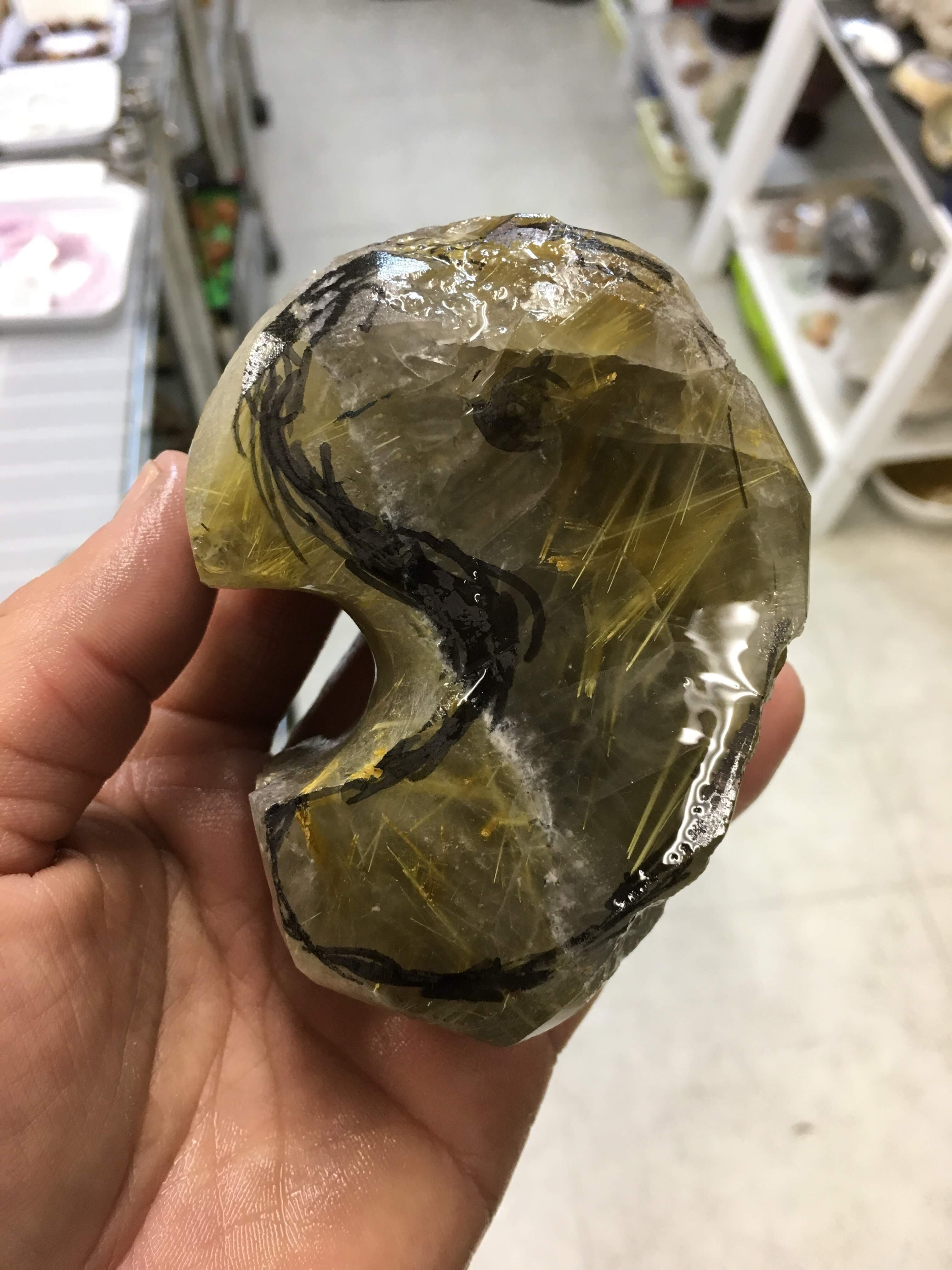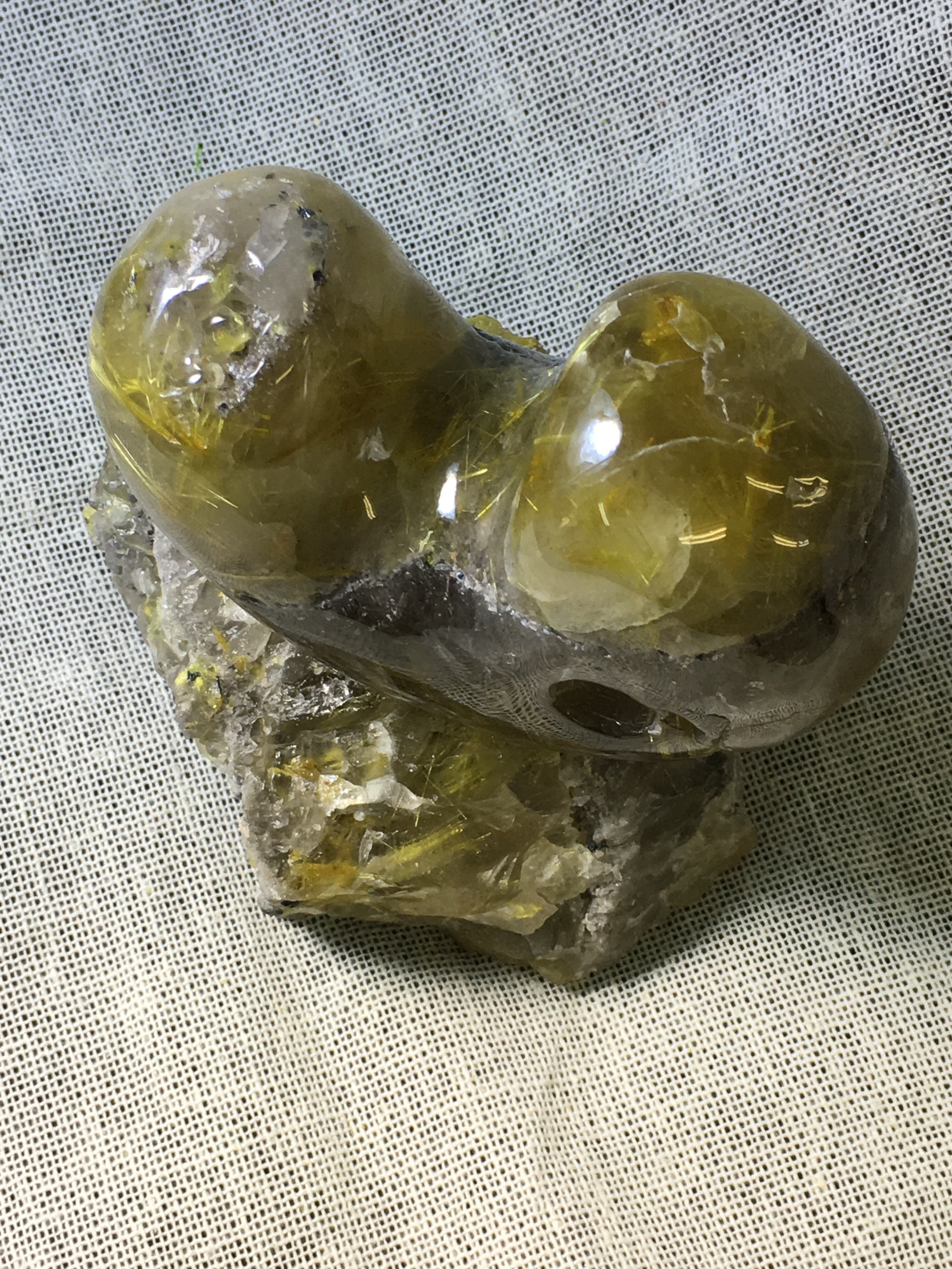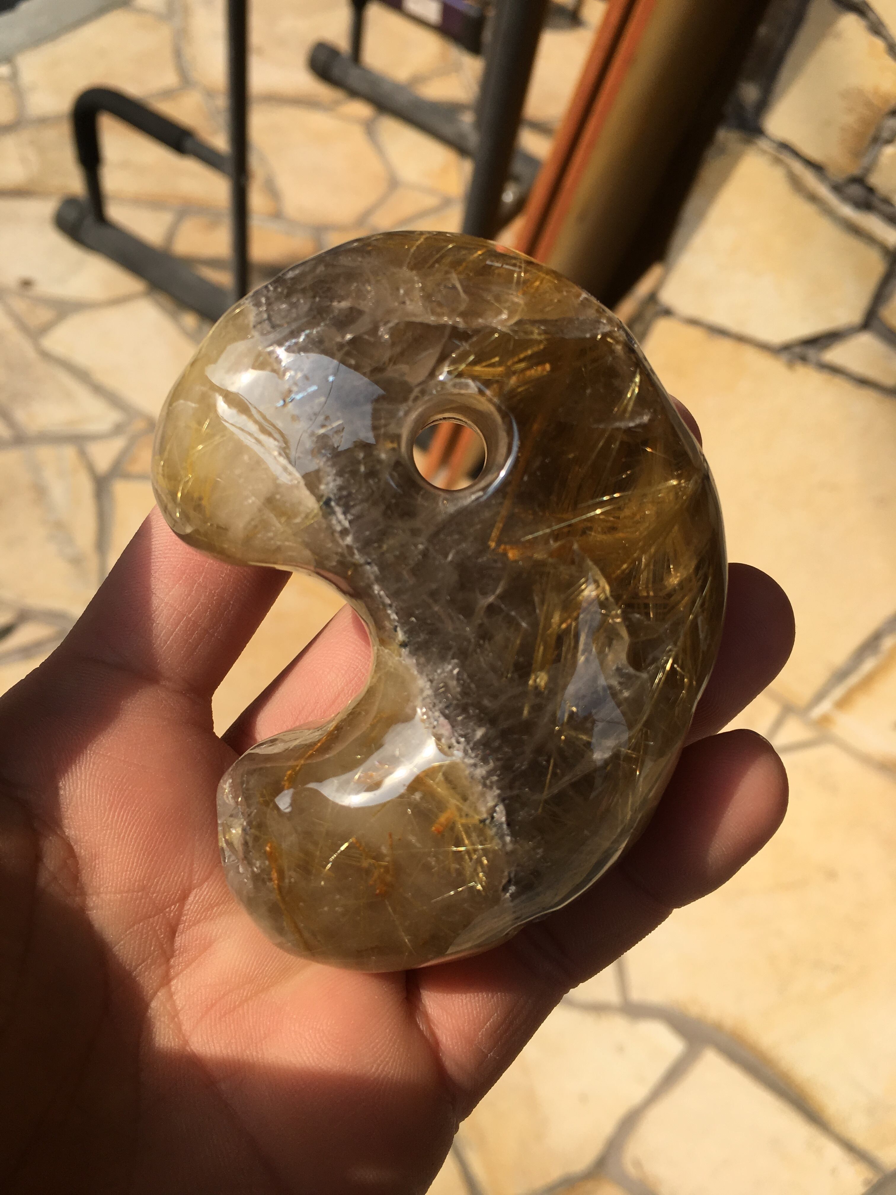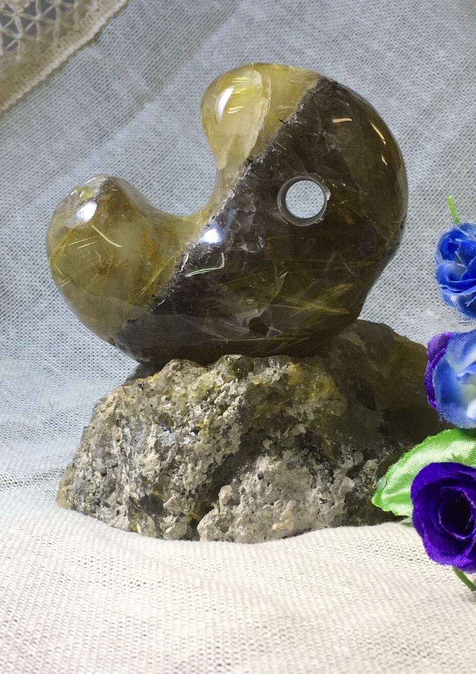 この勾玉は、ルチルクォーツのクラスター的な原石から削り出しました。