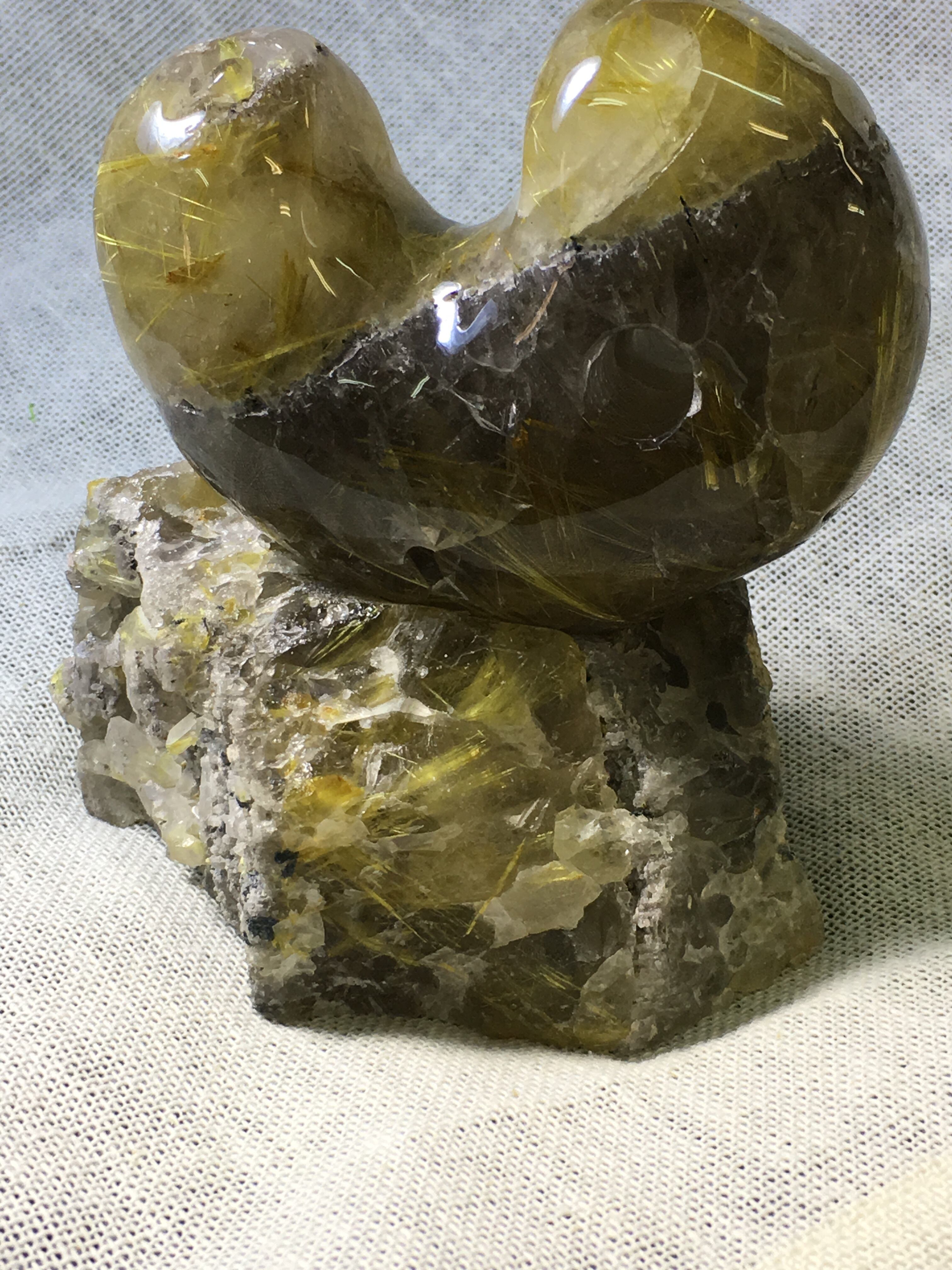 原石のワイルドな感じを残しつつ、ルチル(チタン)が美しく、女神の髪の毛の様に美しく光る深さまで削って行きました。