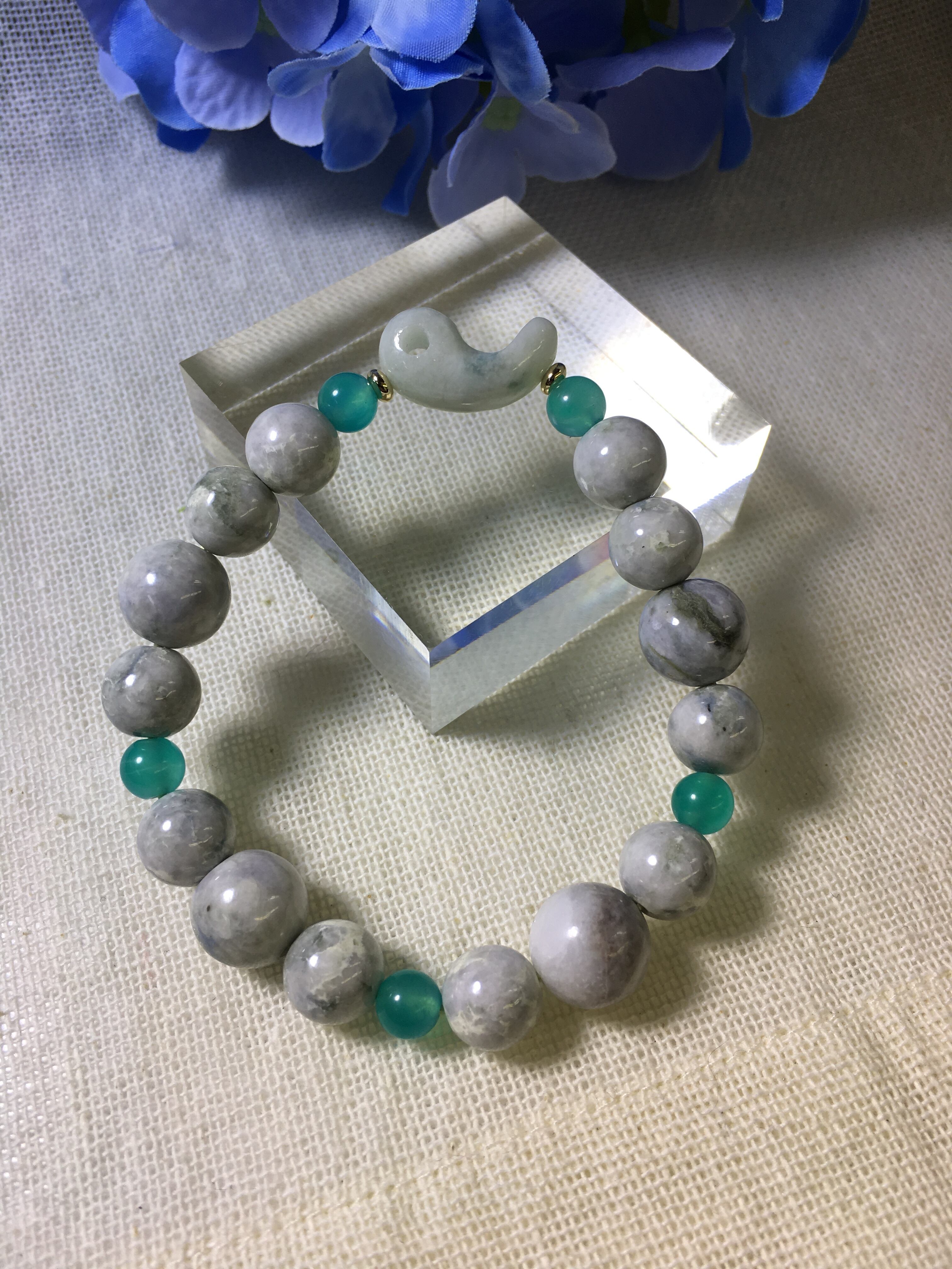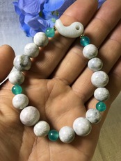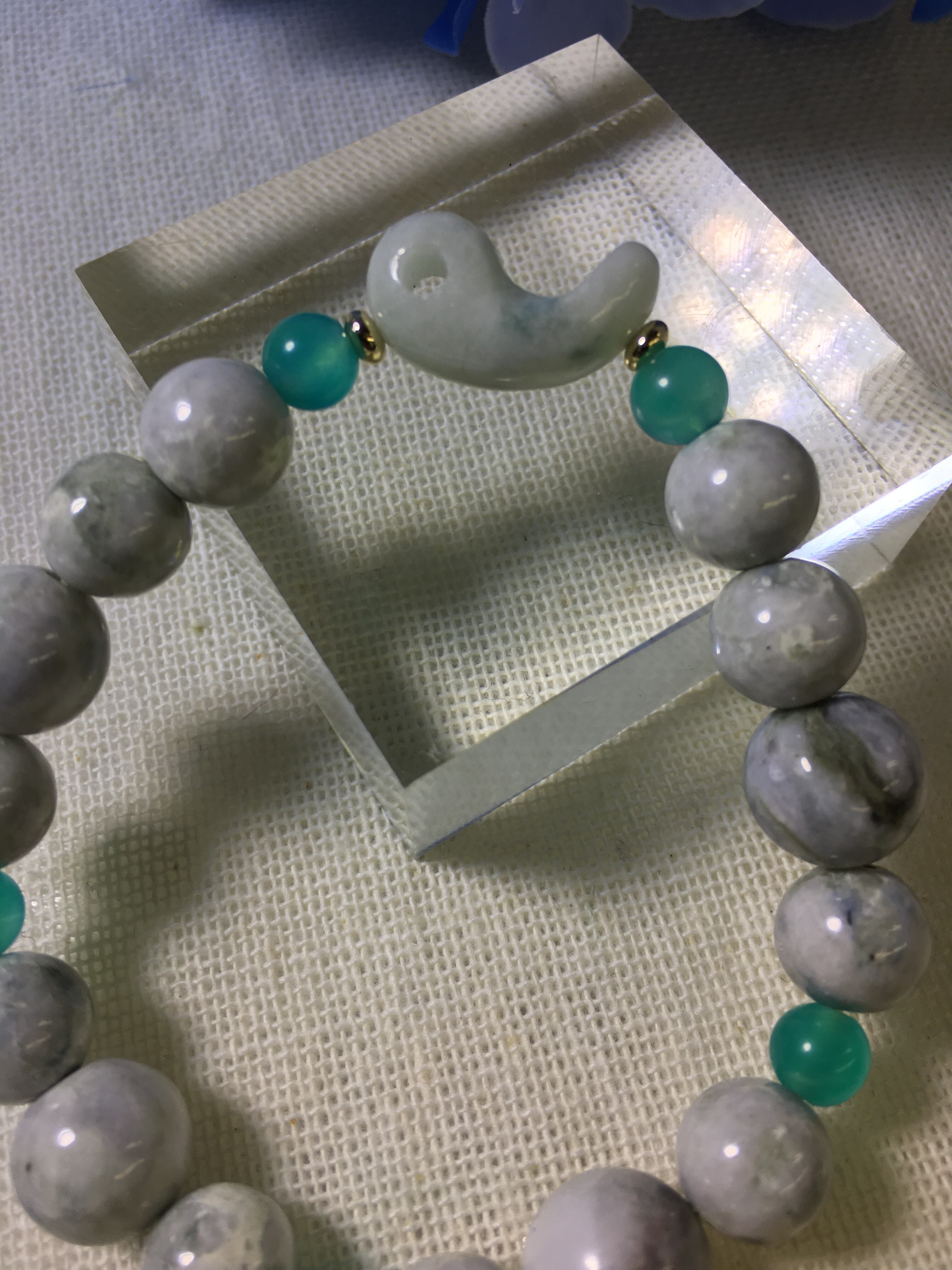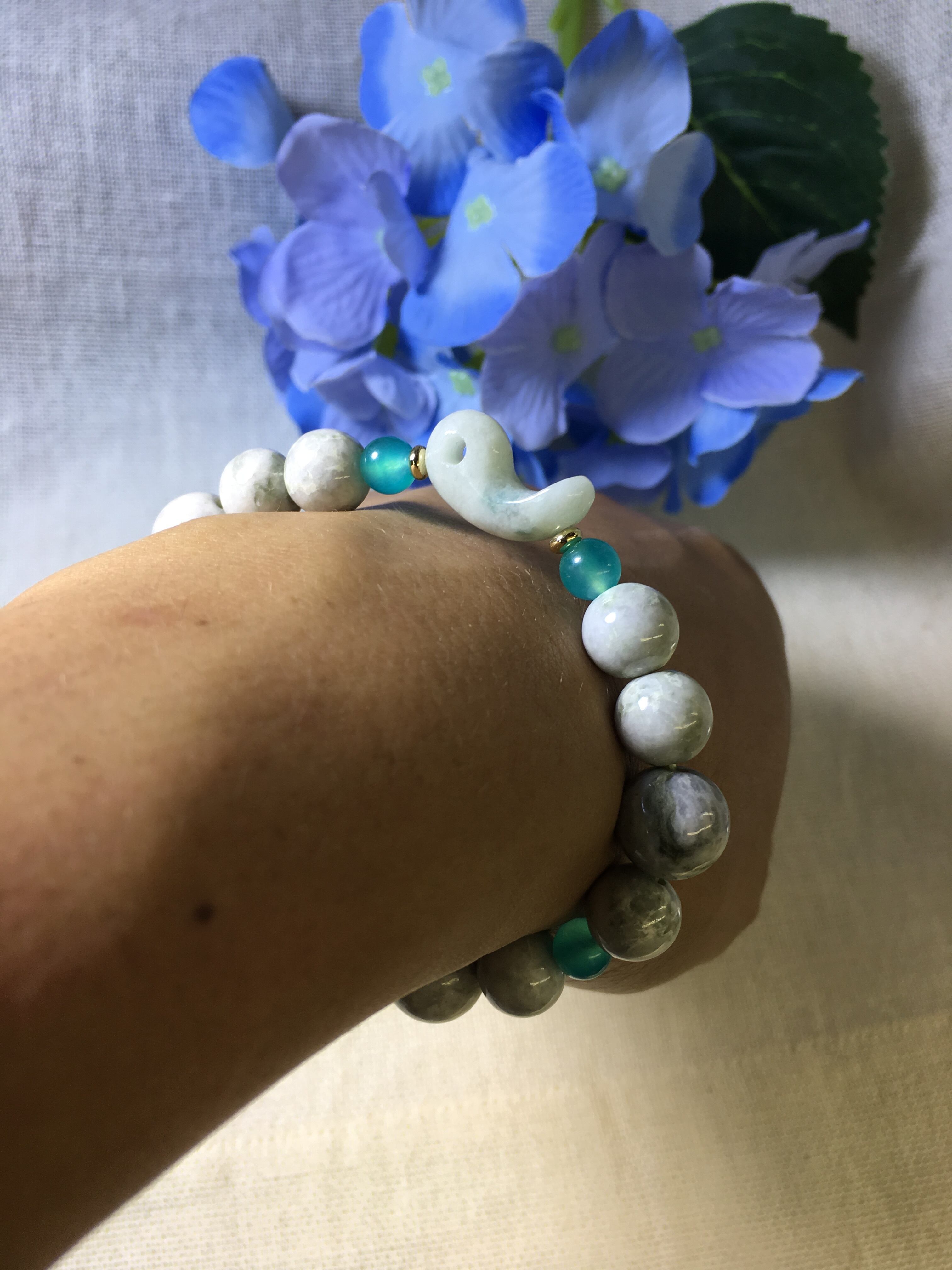 アクアアマゾナイト、糸魚川翡翠ビーズ、糸魚川翡翠勾玉で特製ブレスレット作成しました。