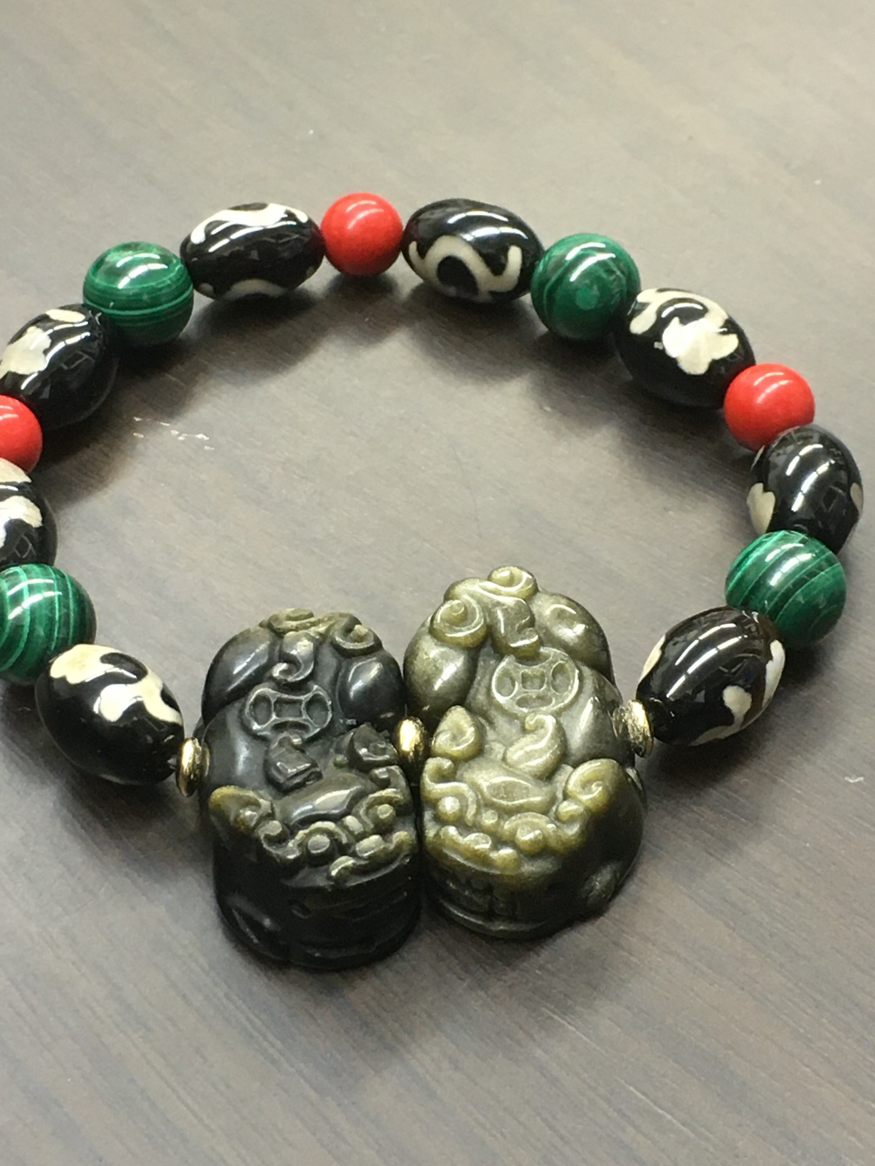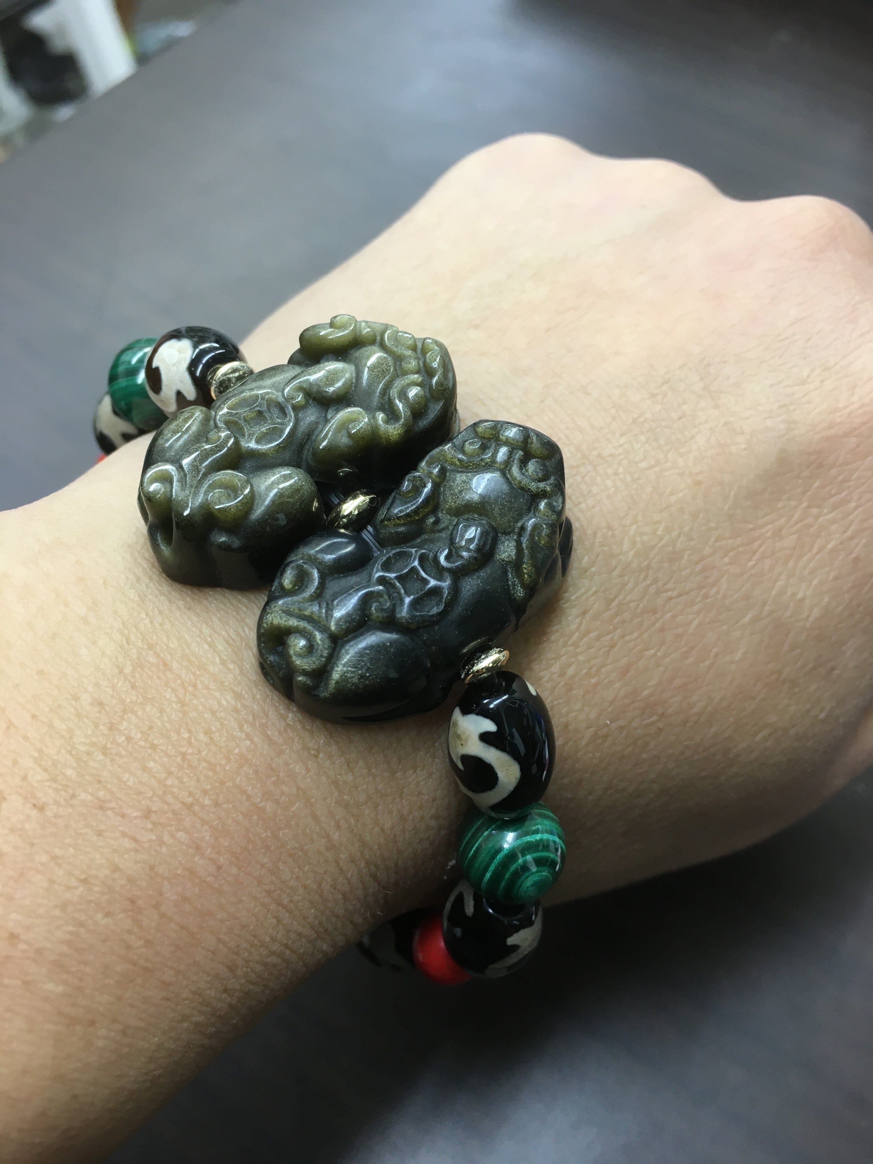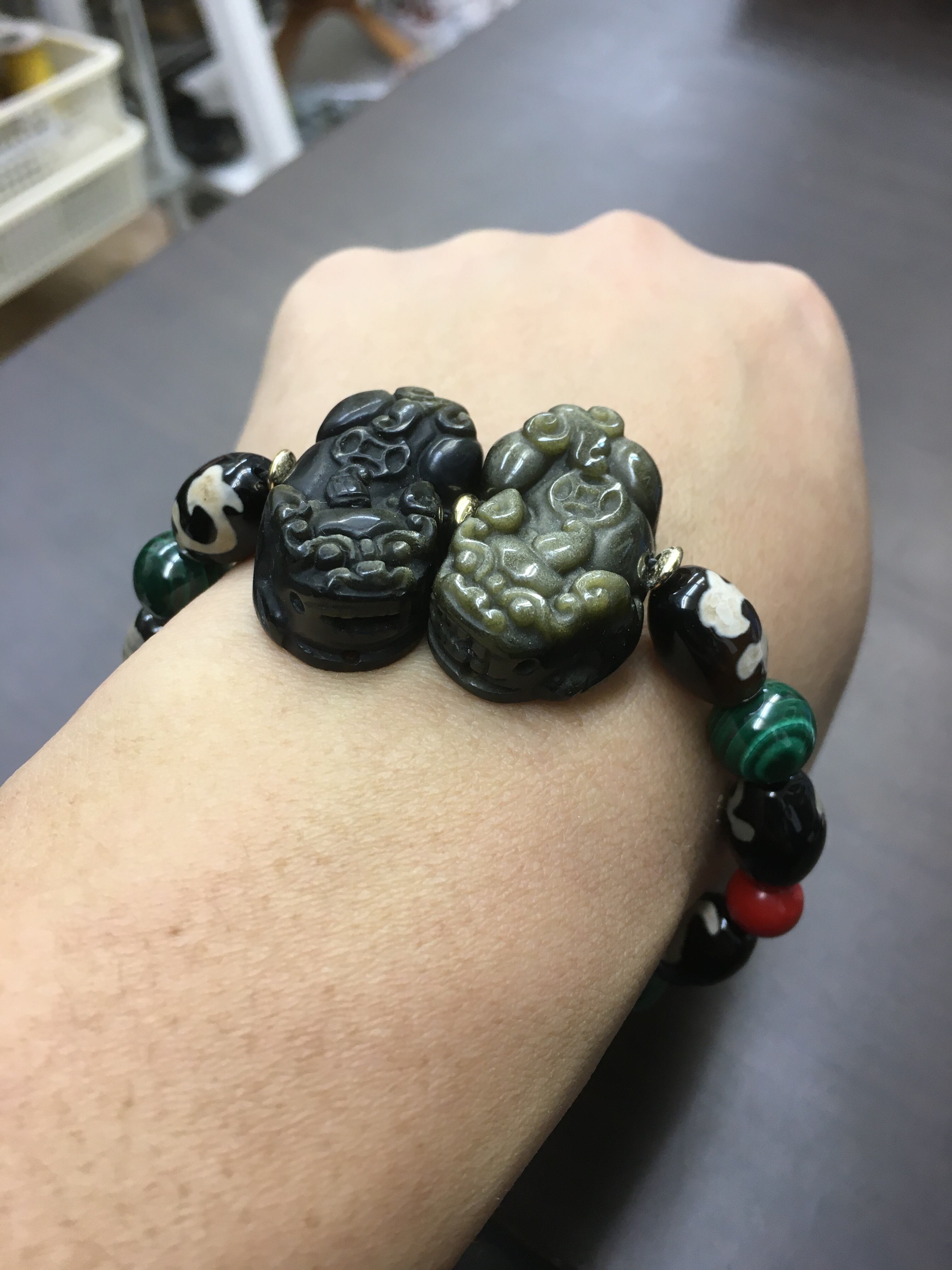 ゴールデンオブシディアンの貔貅(オス・メス)に横穴を開けて、ブレスレットにINしました。