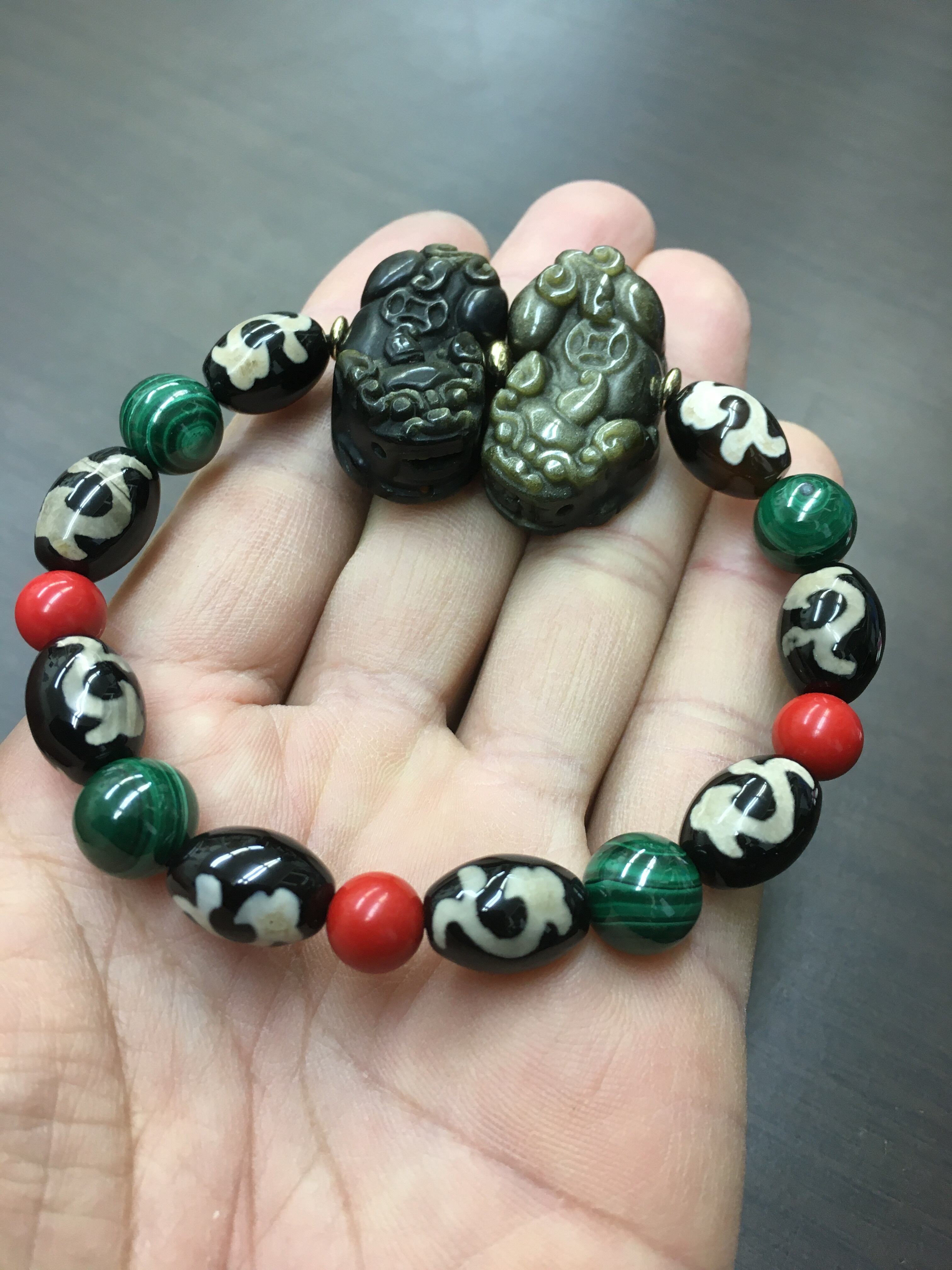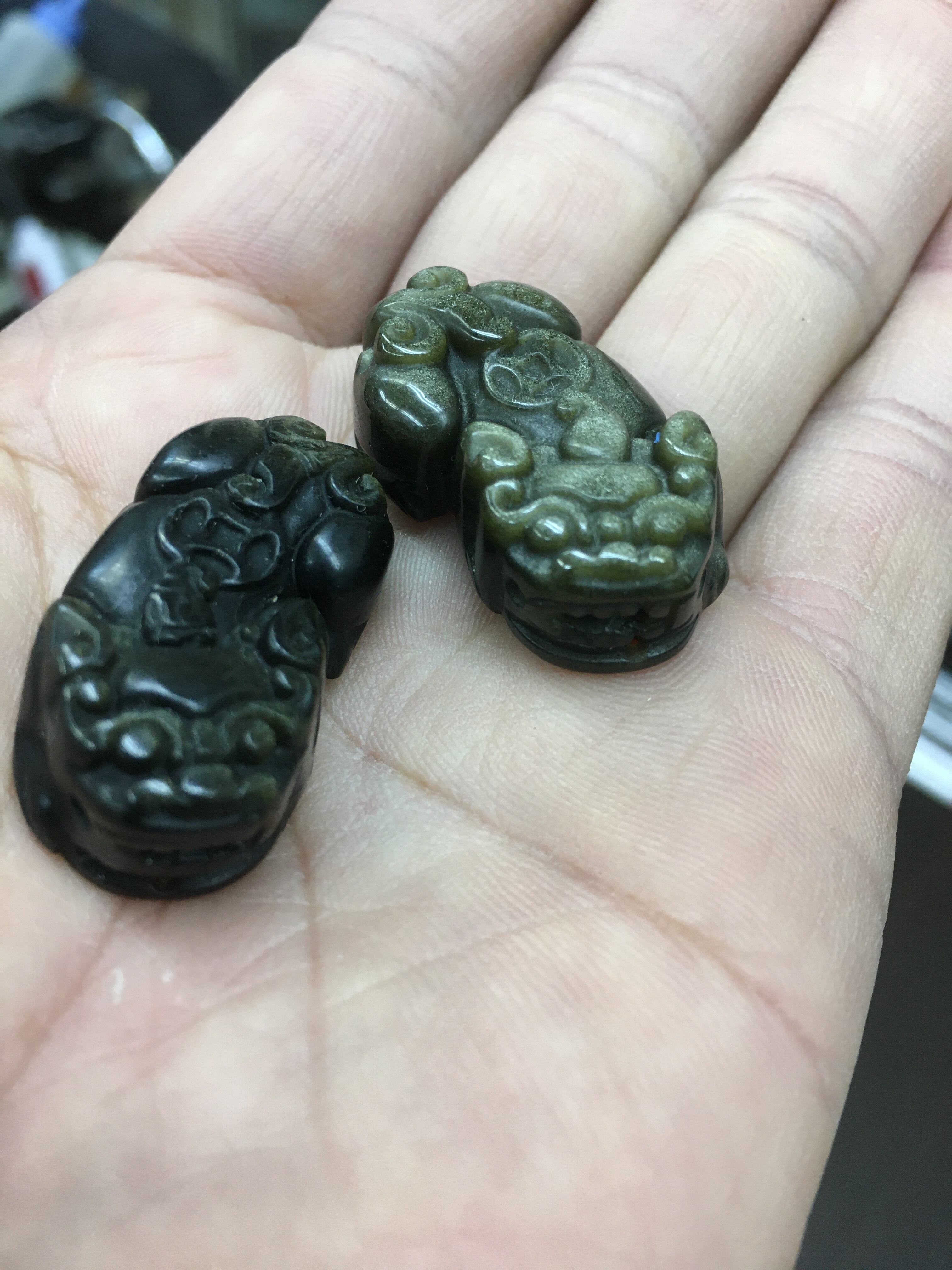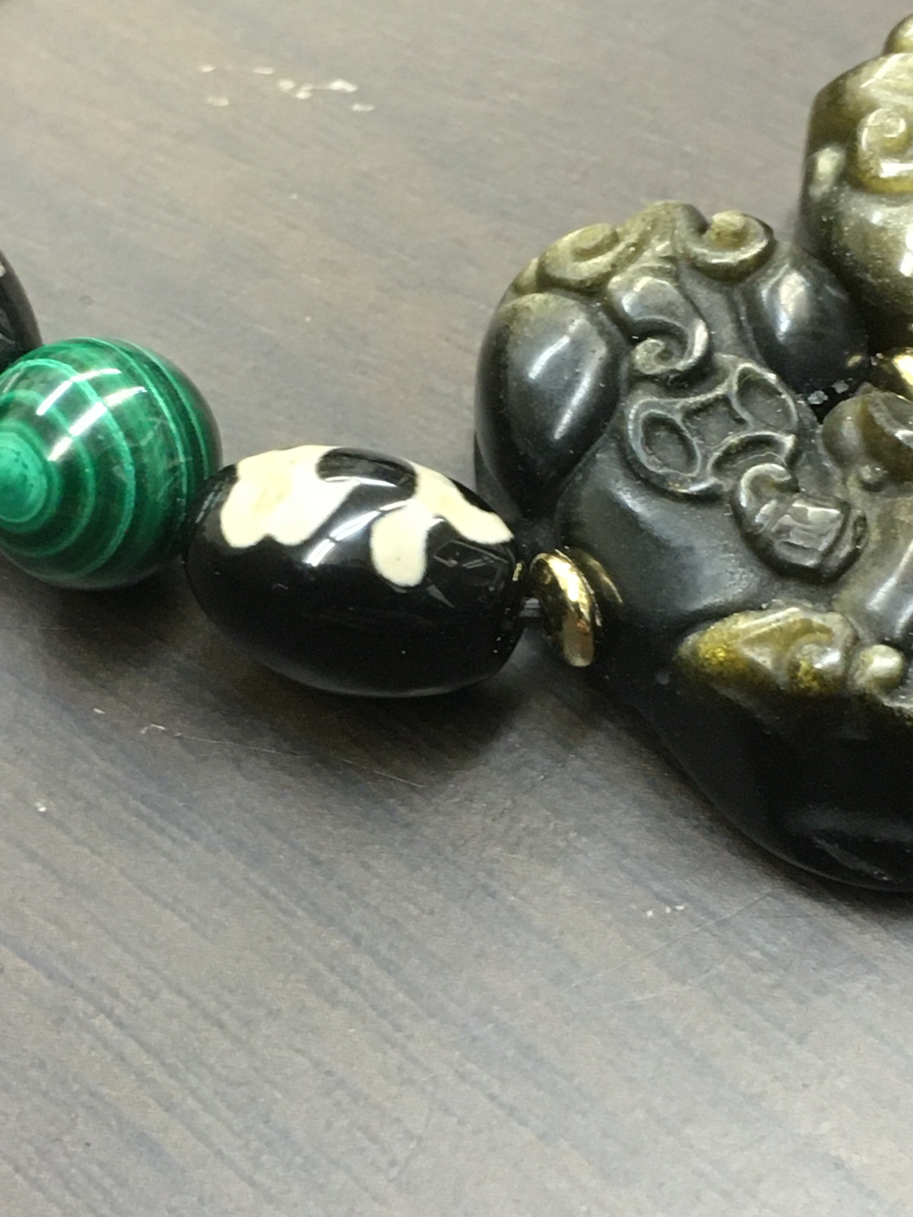 ゴールデンオブシディアンの貔貅(オス・メス)に横穴を開けて、ブレスレットにINしました。