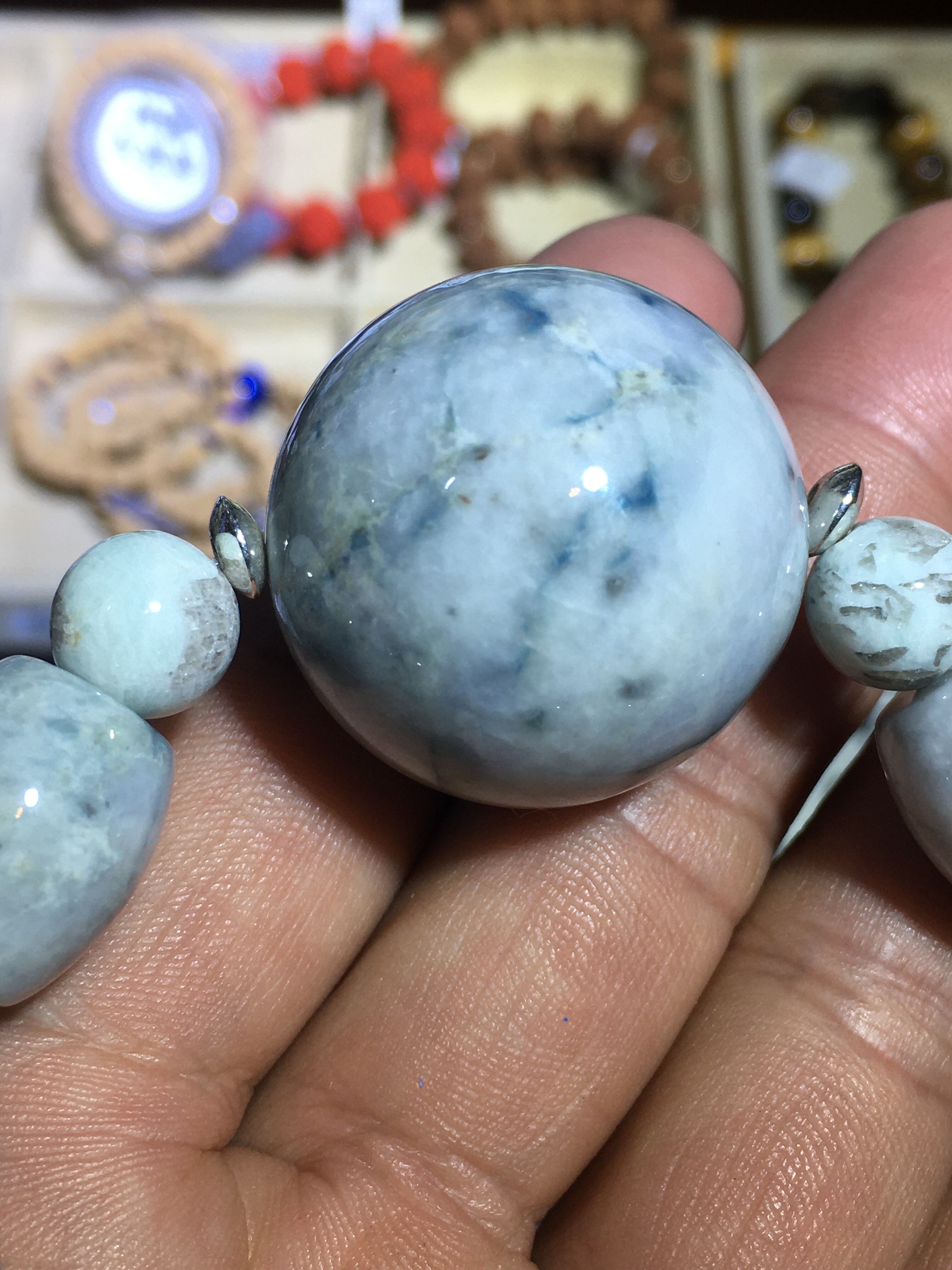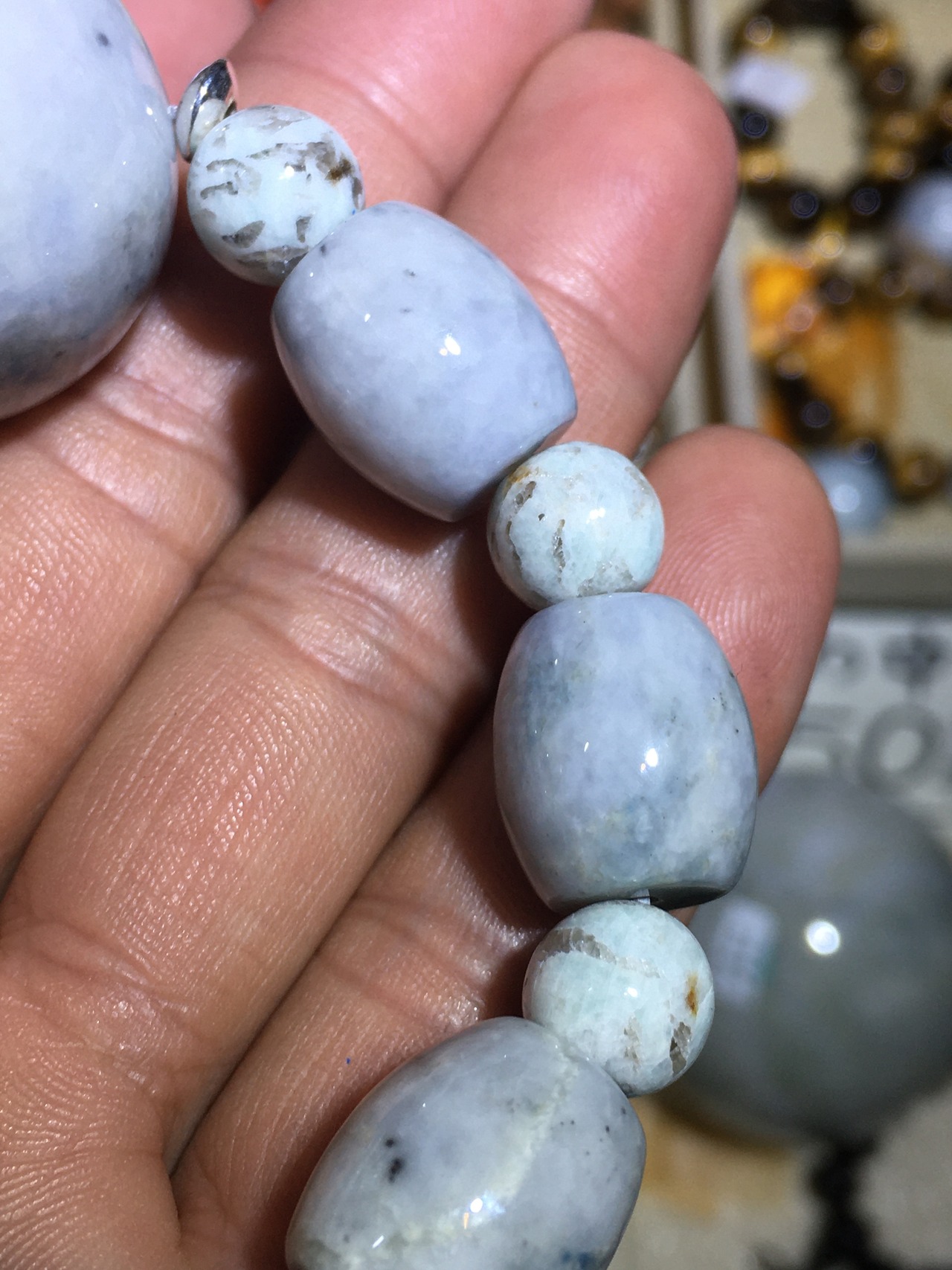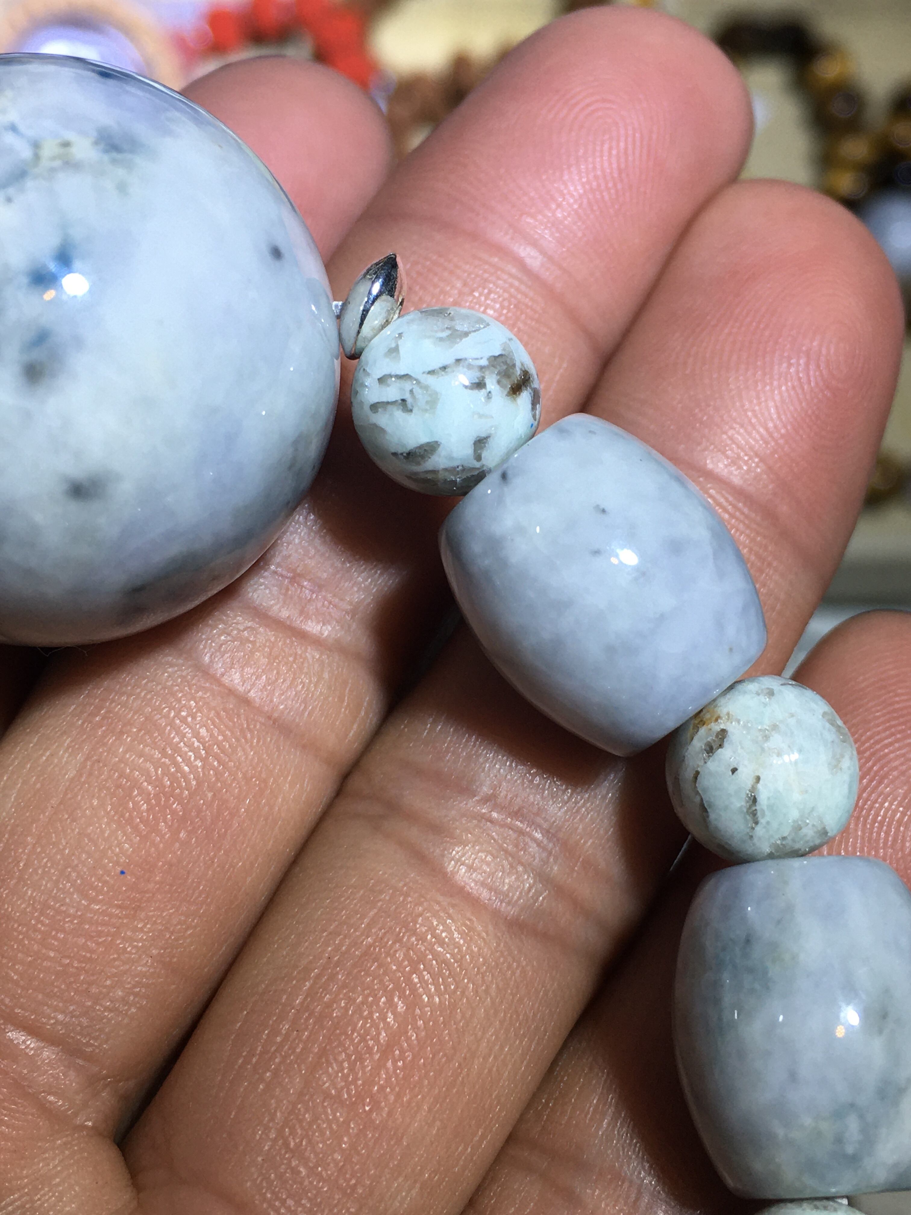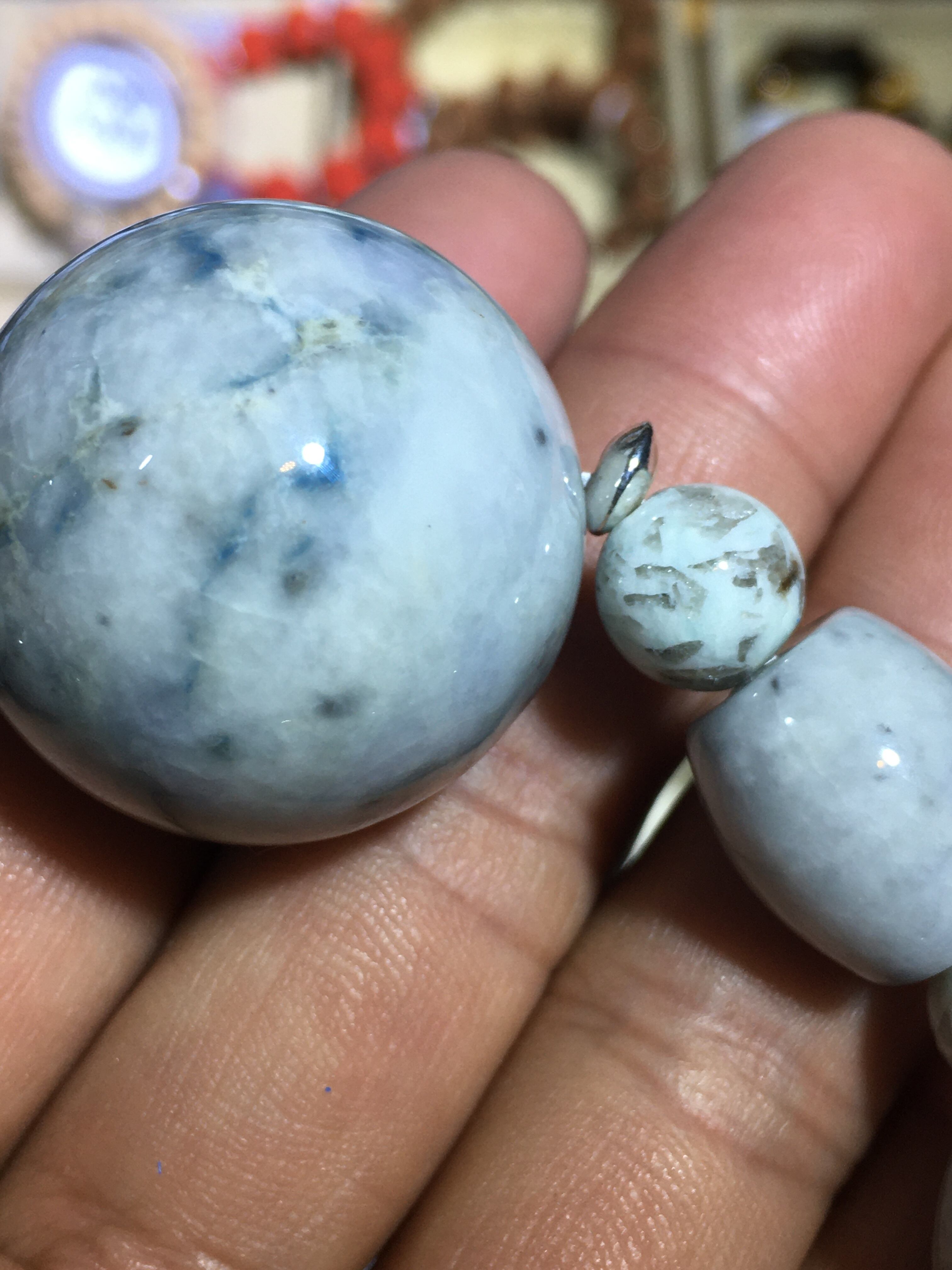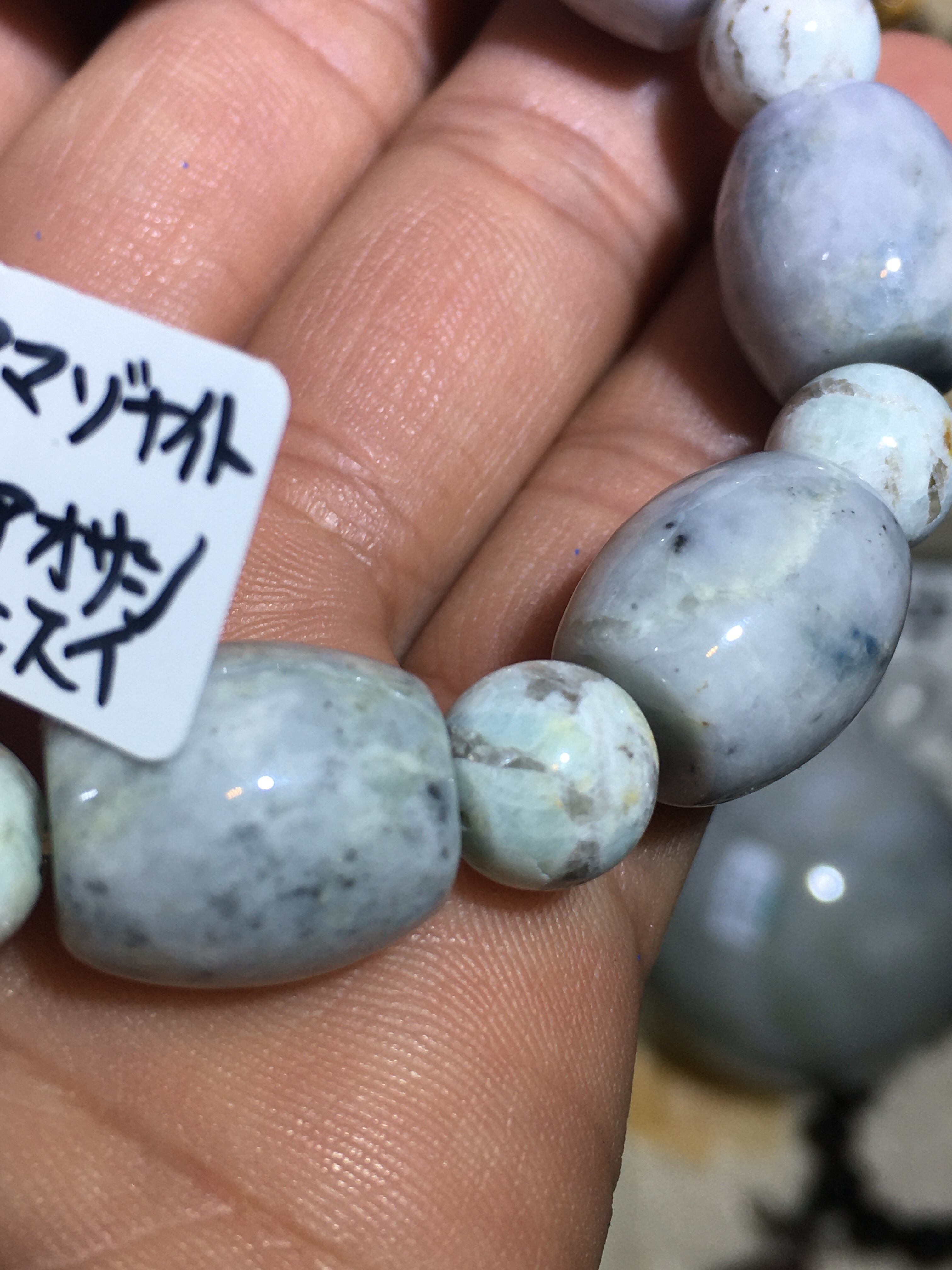 (アマゾナイトのビーズに見える茶色部分は、煙水晶スモーキークォーツです。)