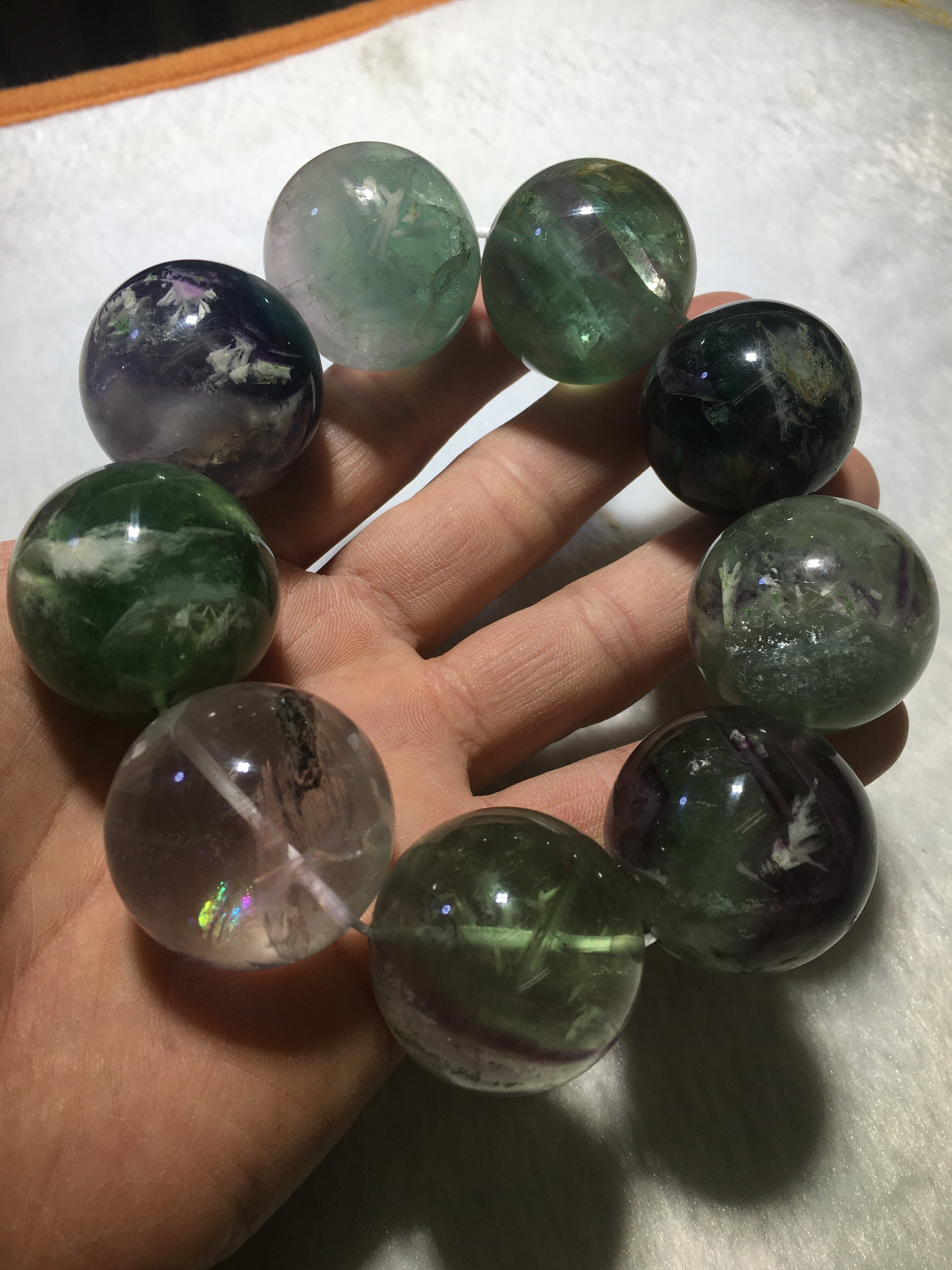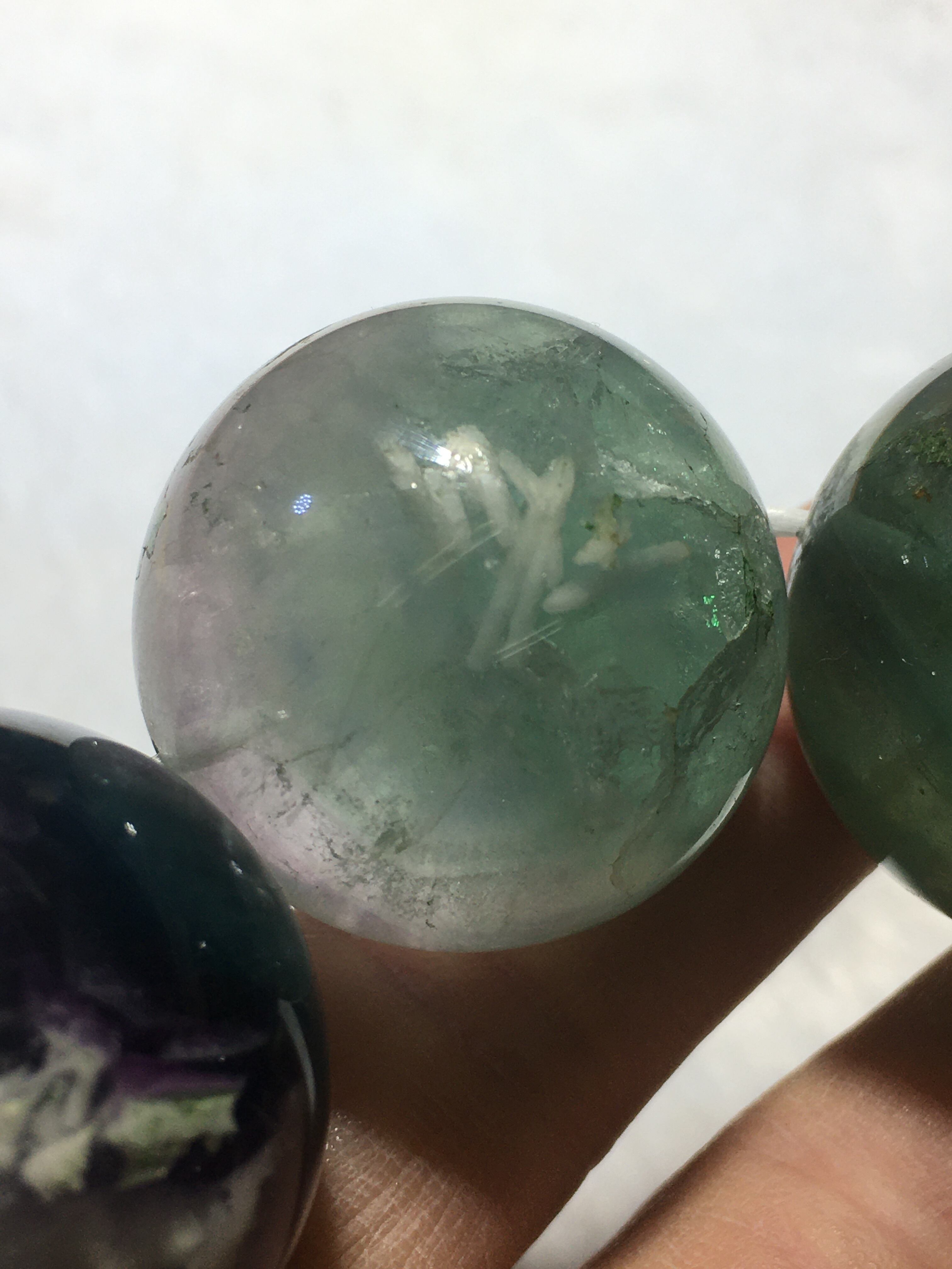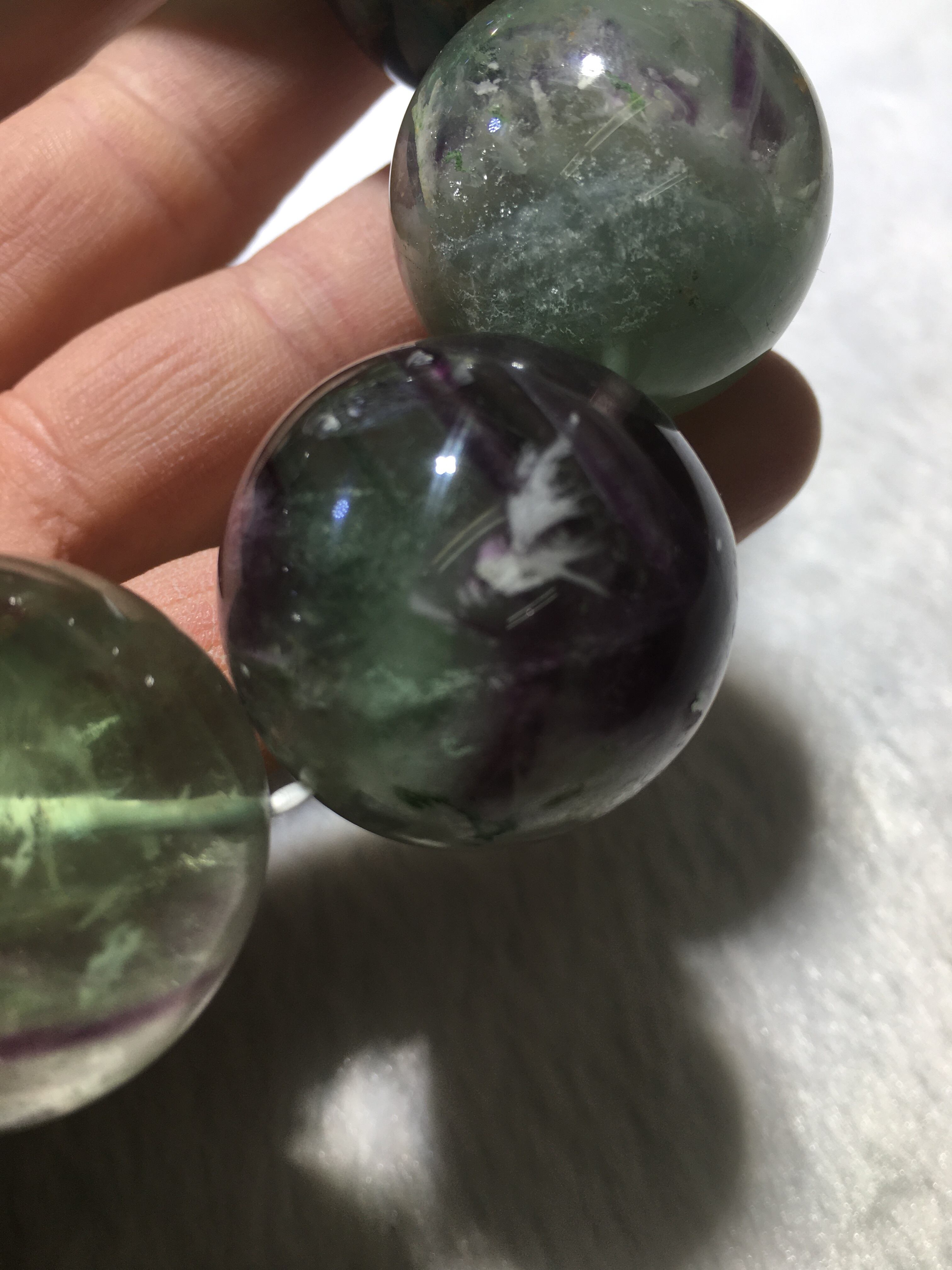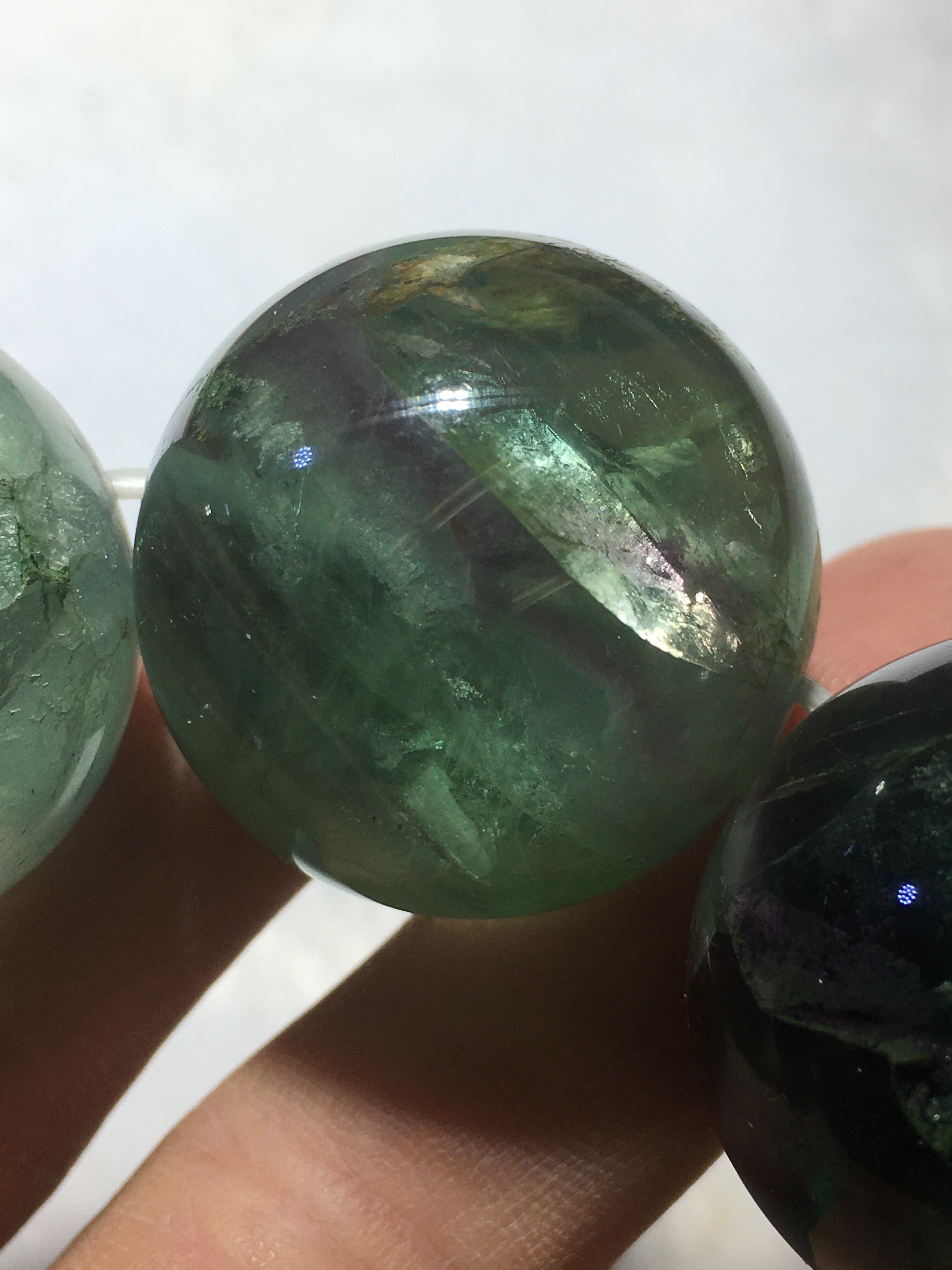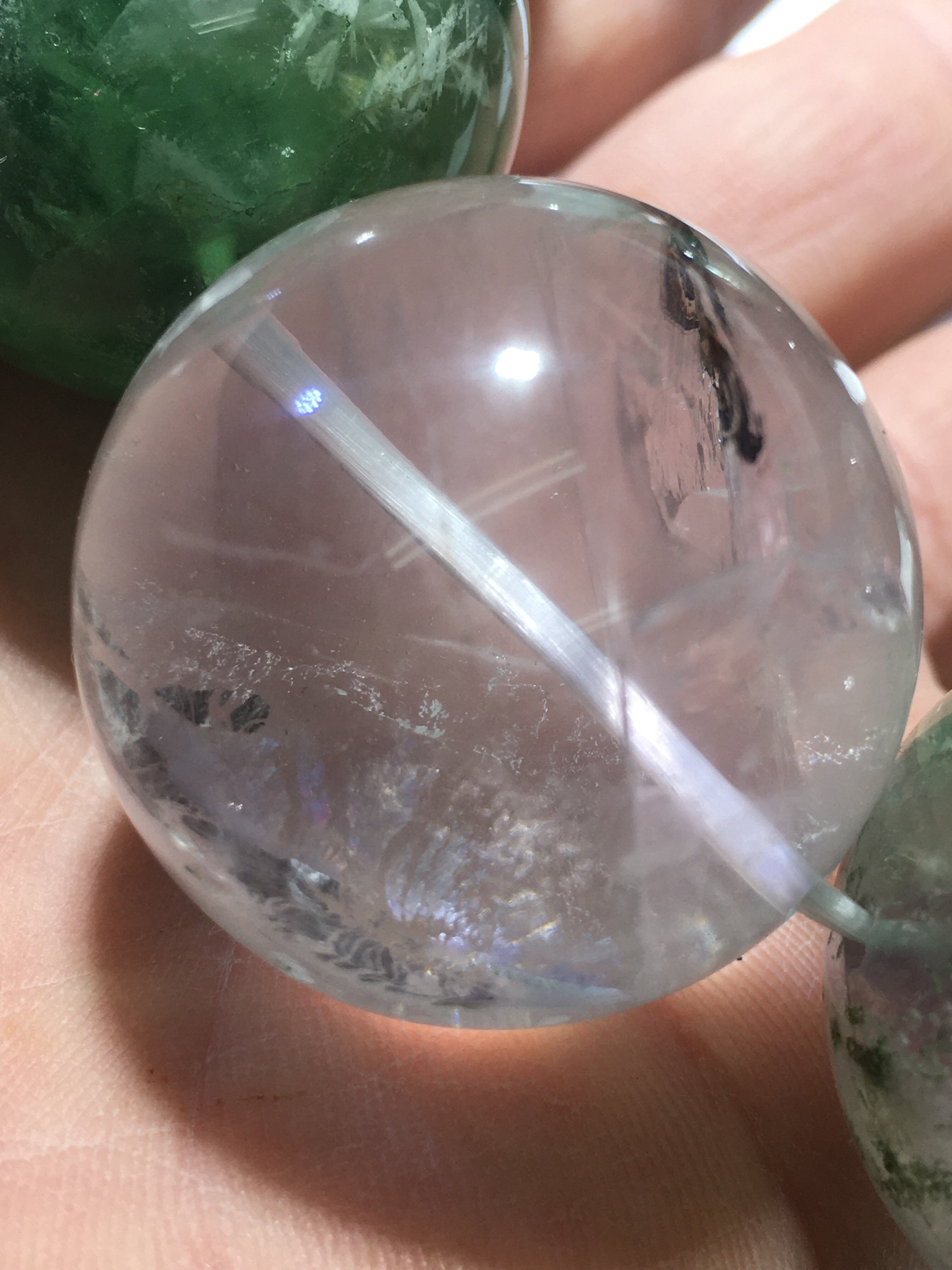 濃い緑色の様な1玉は、ライトに透かすと、濃いブルーの色合いが見られます。