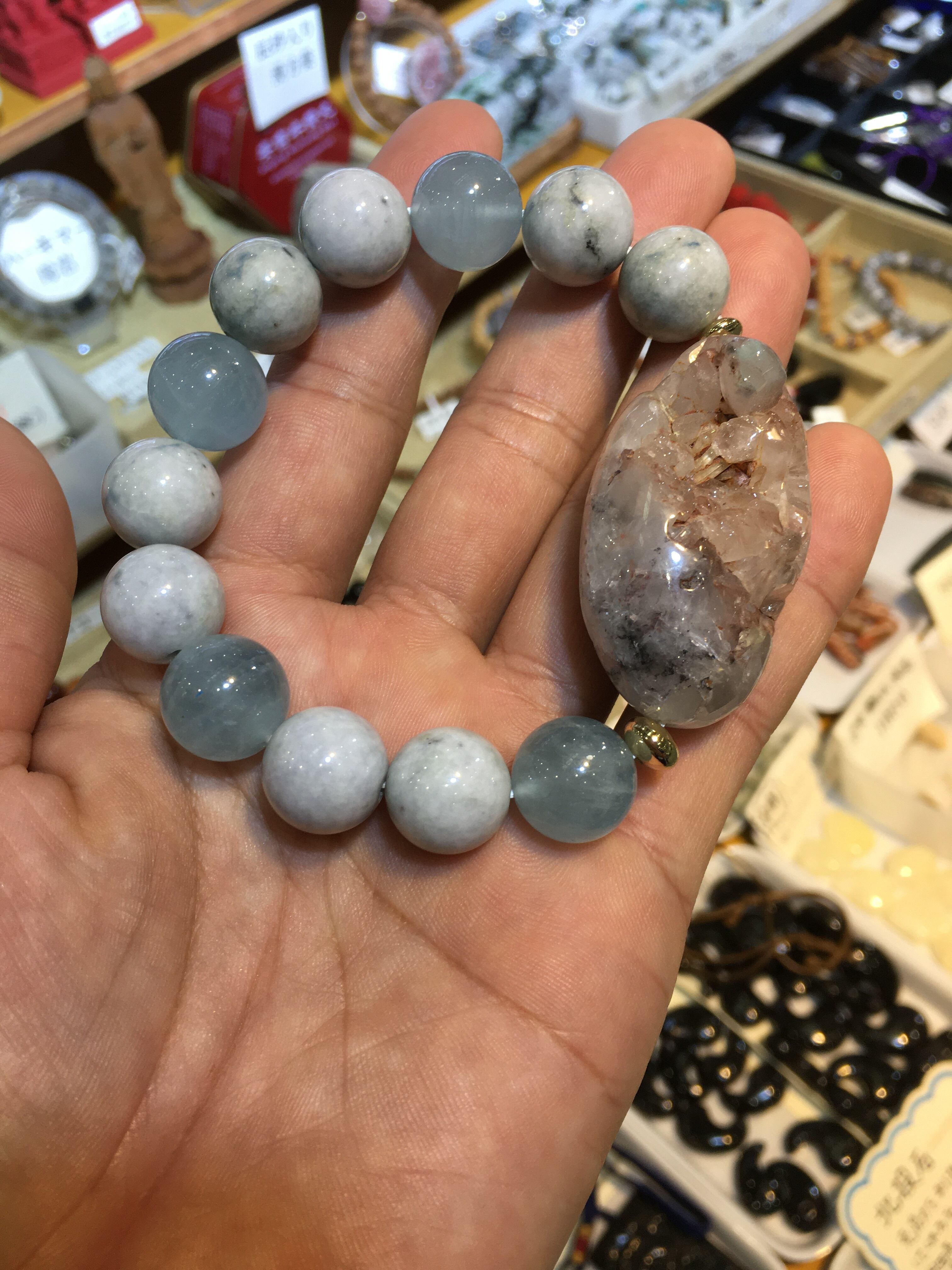 色合いの合う、糸魚川青刺し翡翠と、アクアマリン(新疆ウイグル産)の14mmビーズで、ブレスレットにいたしました。