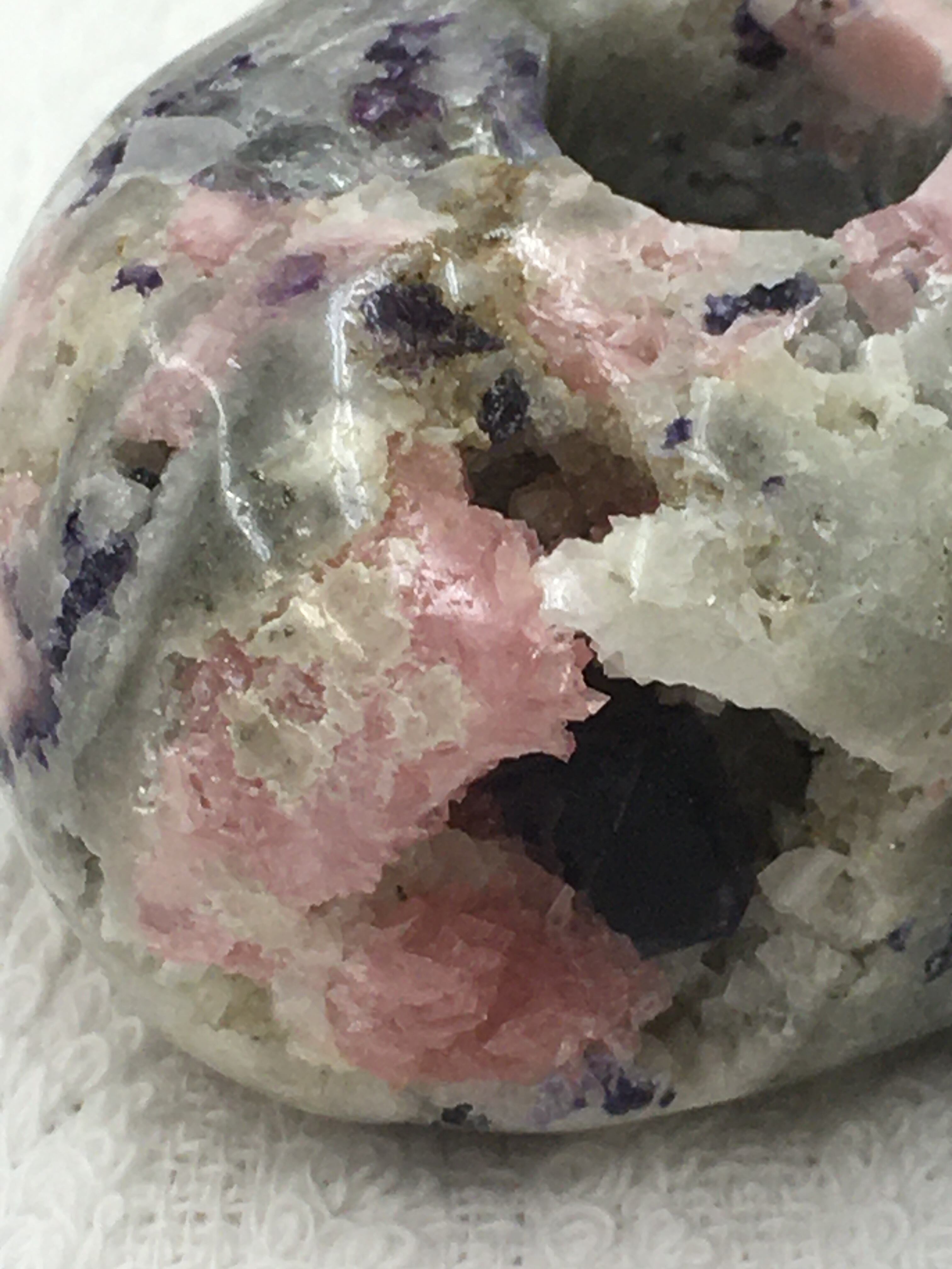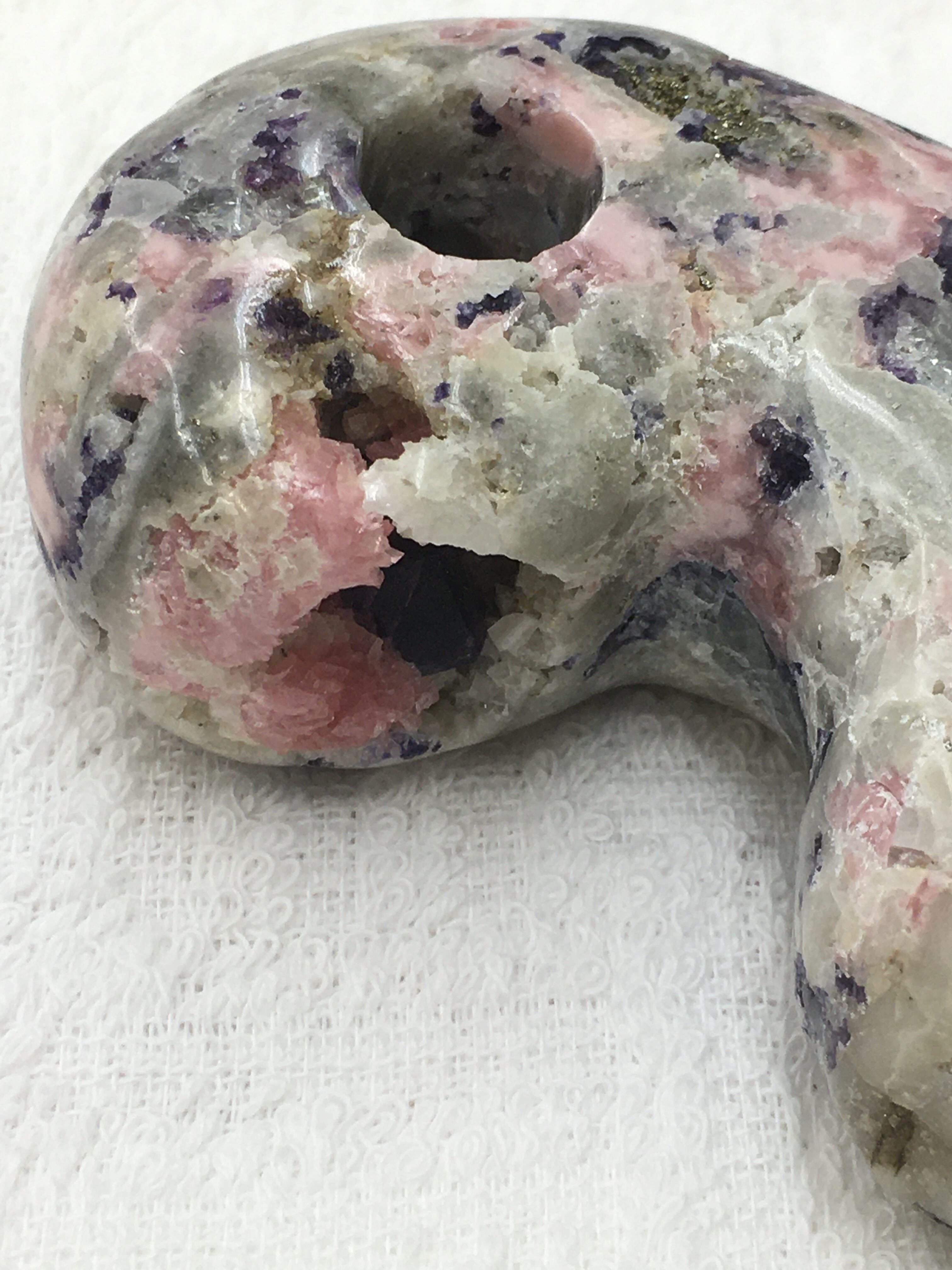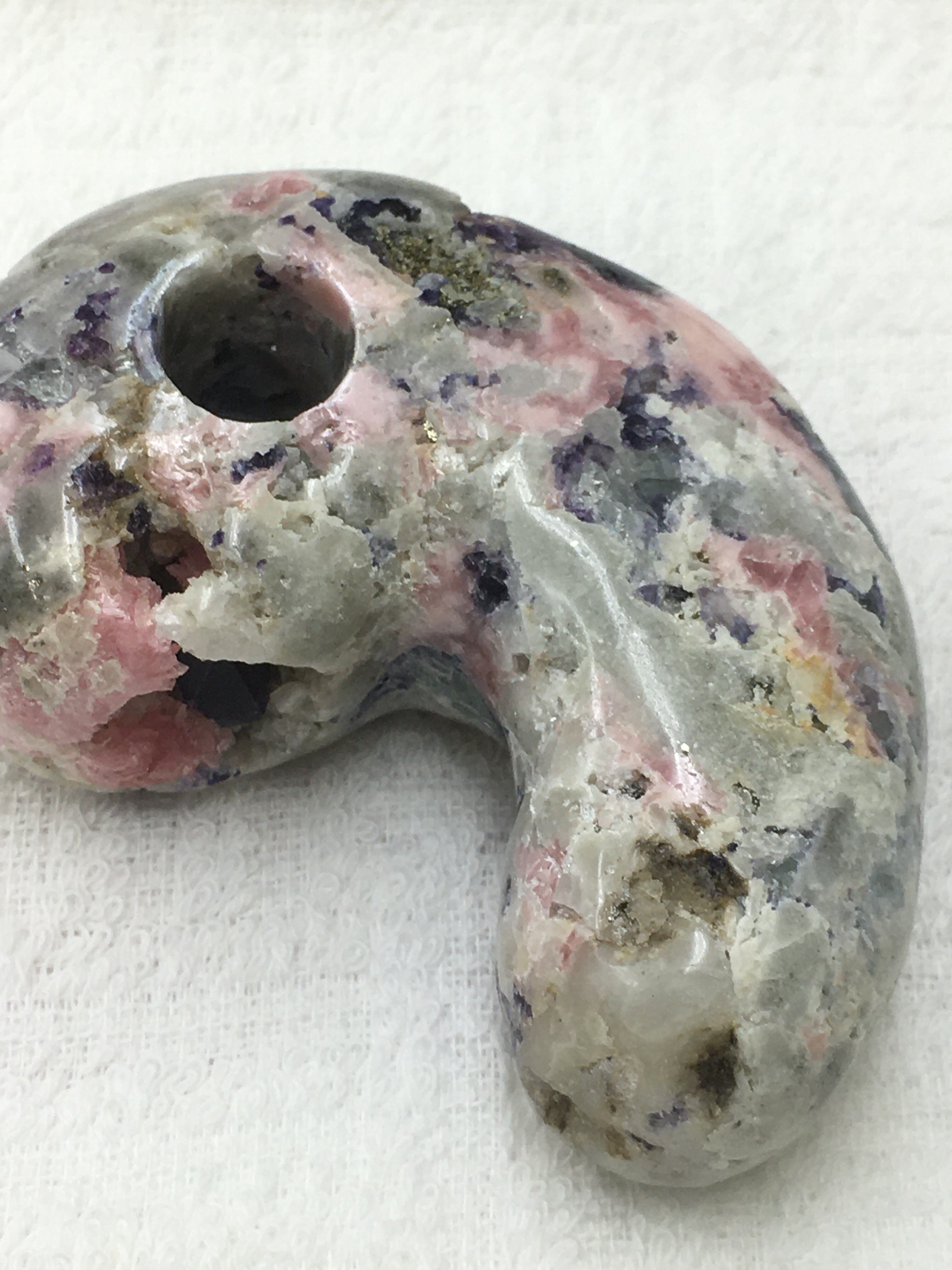 この勾玉は、是非ルーペで拡大してご覧になって欲しいです。色々な鉱物がひしめき合って共生しているのが、良く分かります。