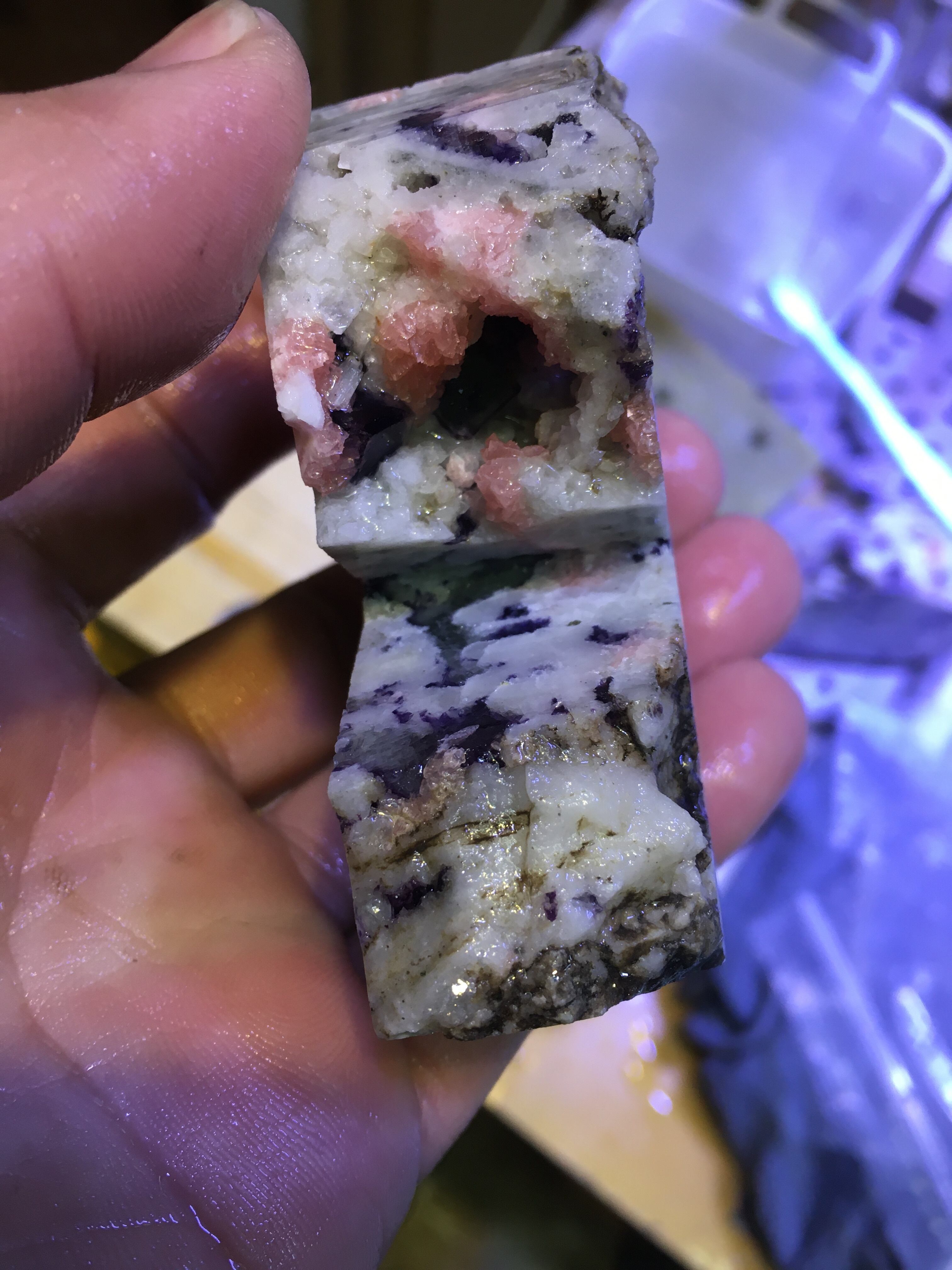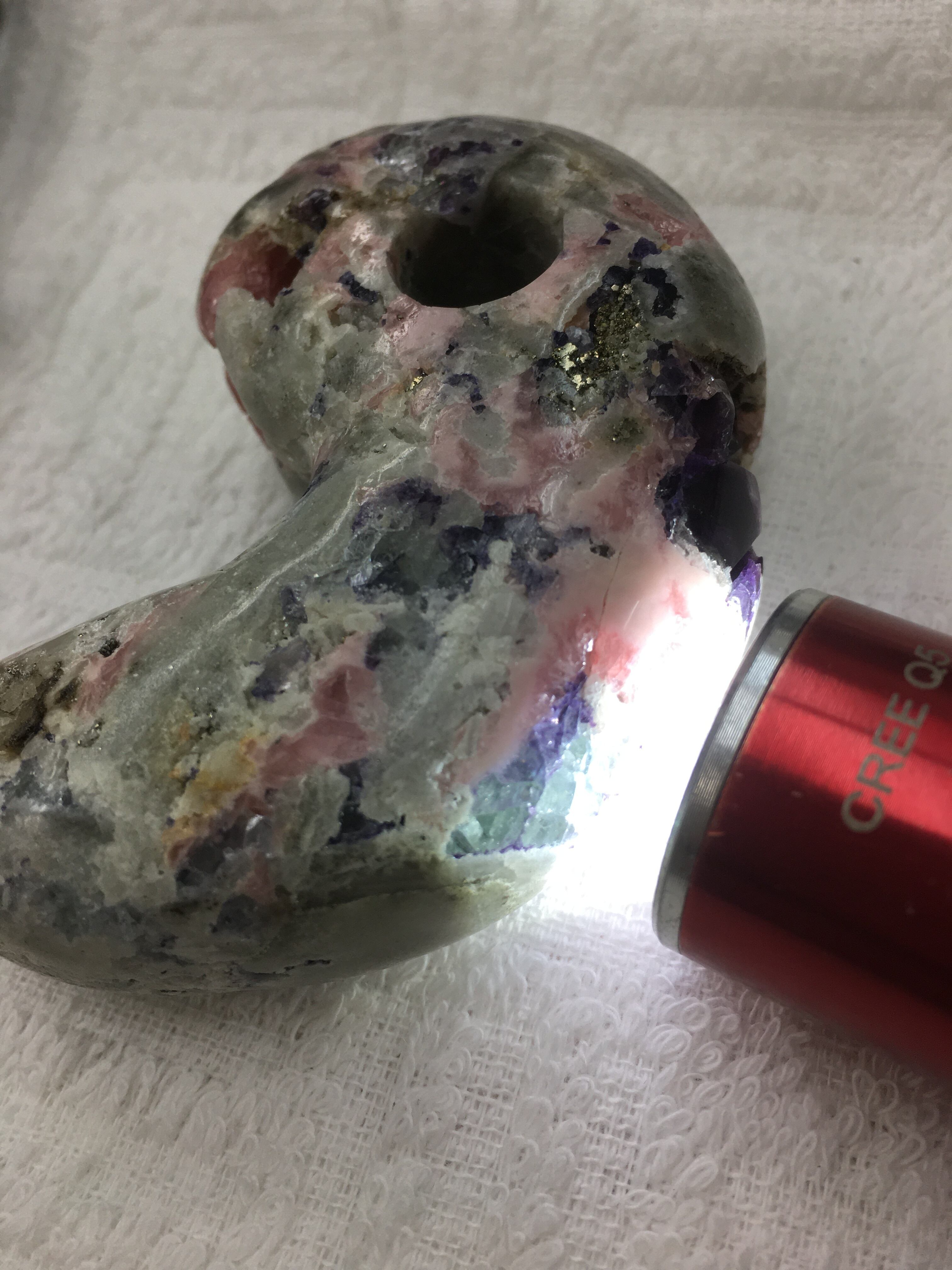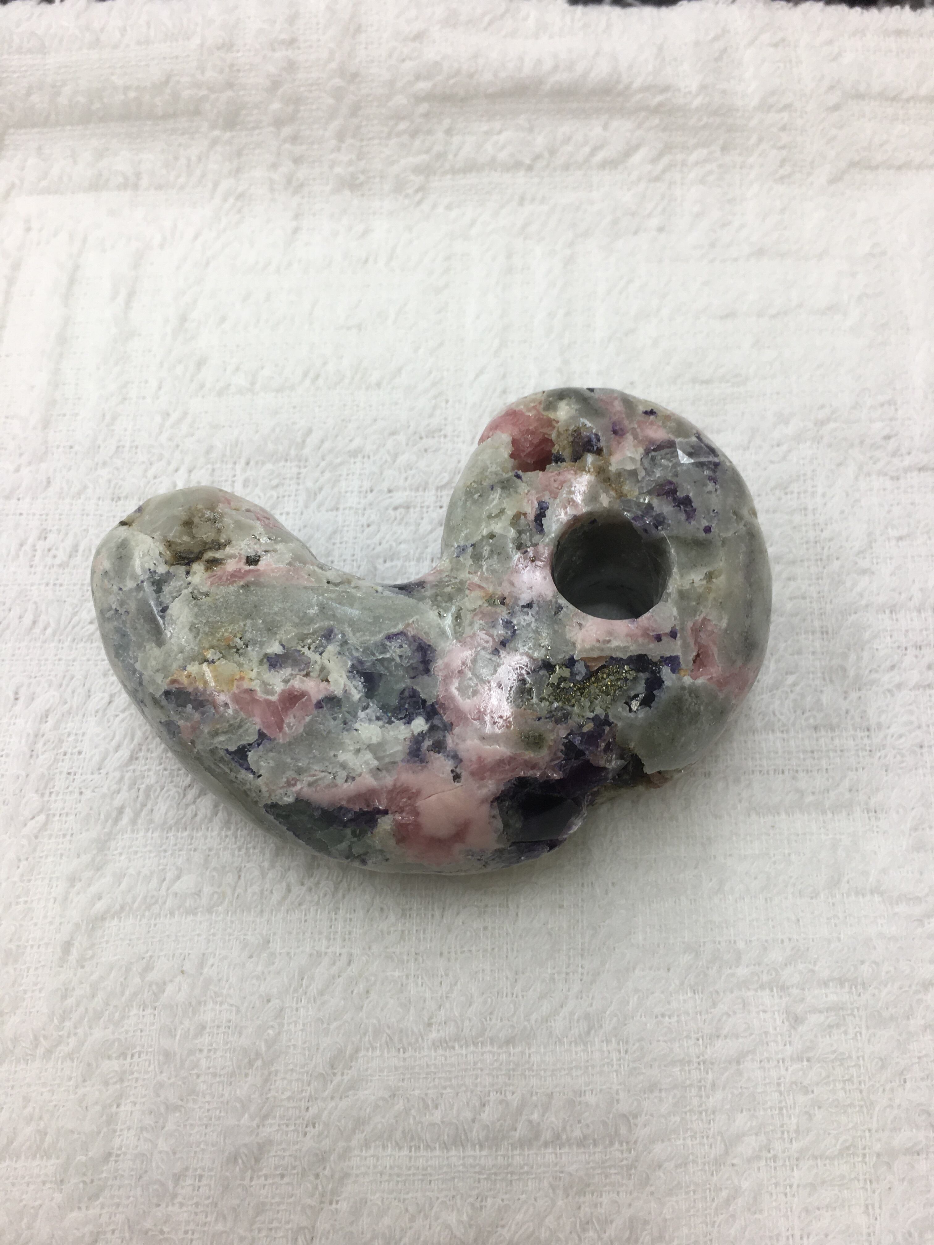 この勾玉は、是非ルーペで拡大してご覧になって欲しいです。色々な鉱物がひしめき合って共生しているのが、良く分かります。