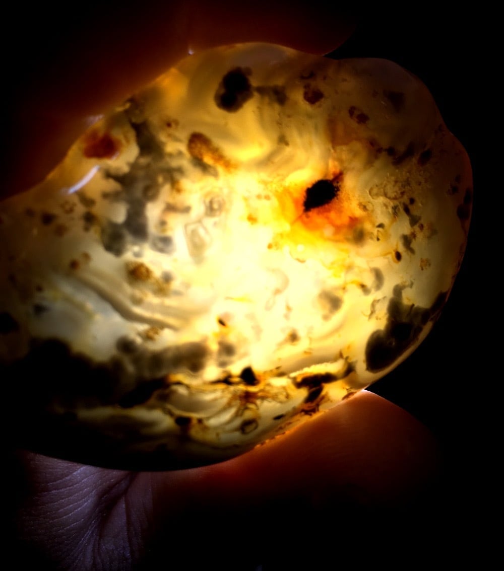 瑪瑙の中に水がはいっています。ライトで透かすと中の水と気泡がよく動きます。また、幅の広い所を左右にして振ると水の♪ちゃぽんちゃぽんという音もはっきりと聞こえます。