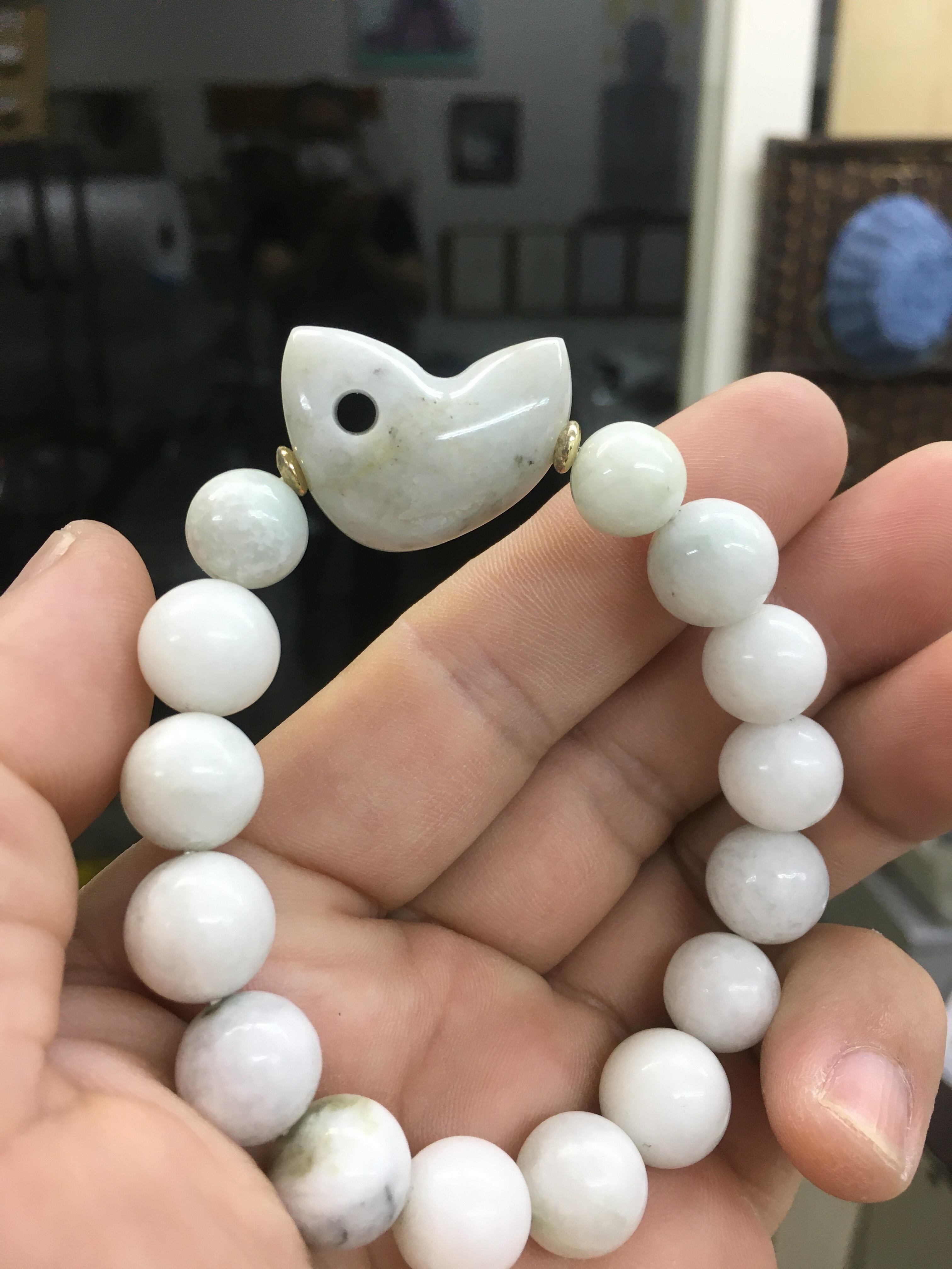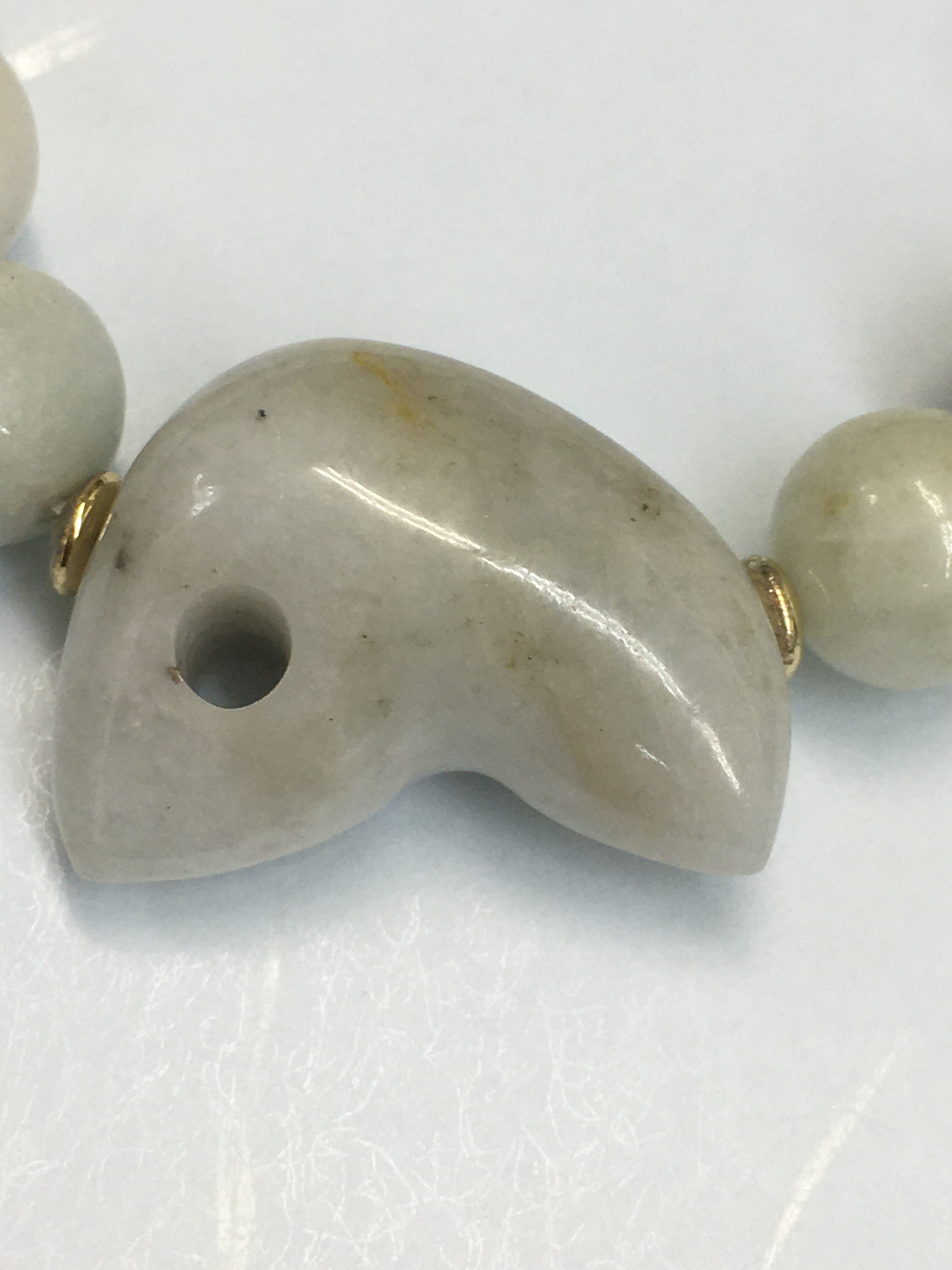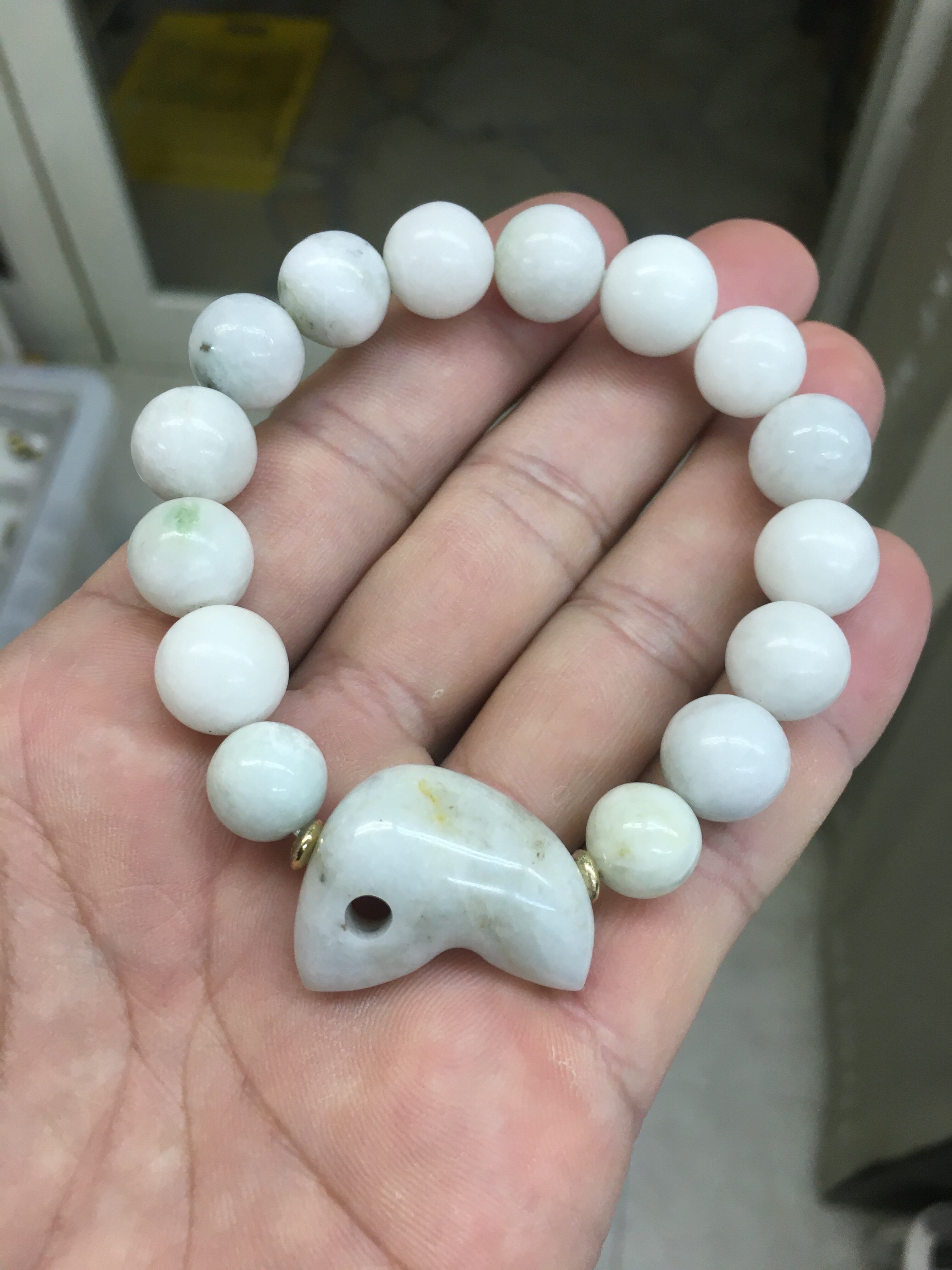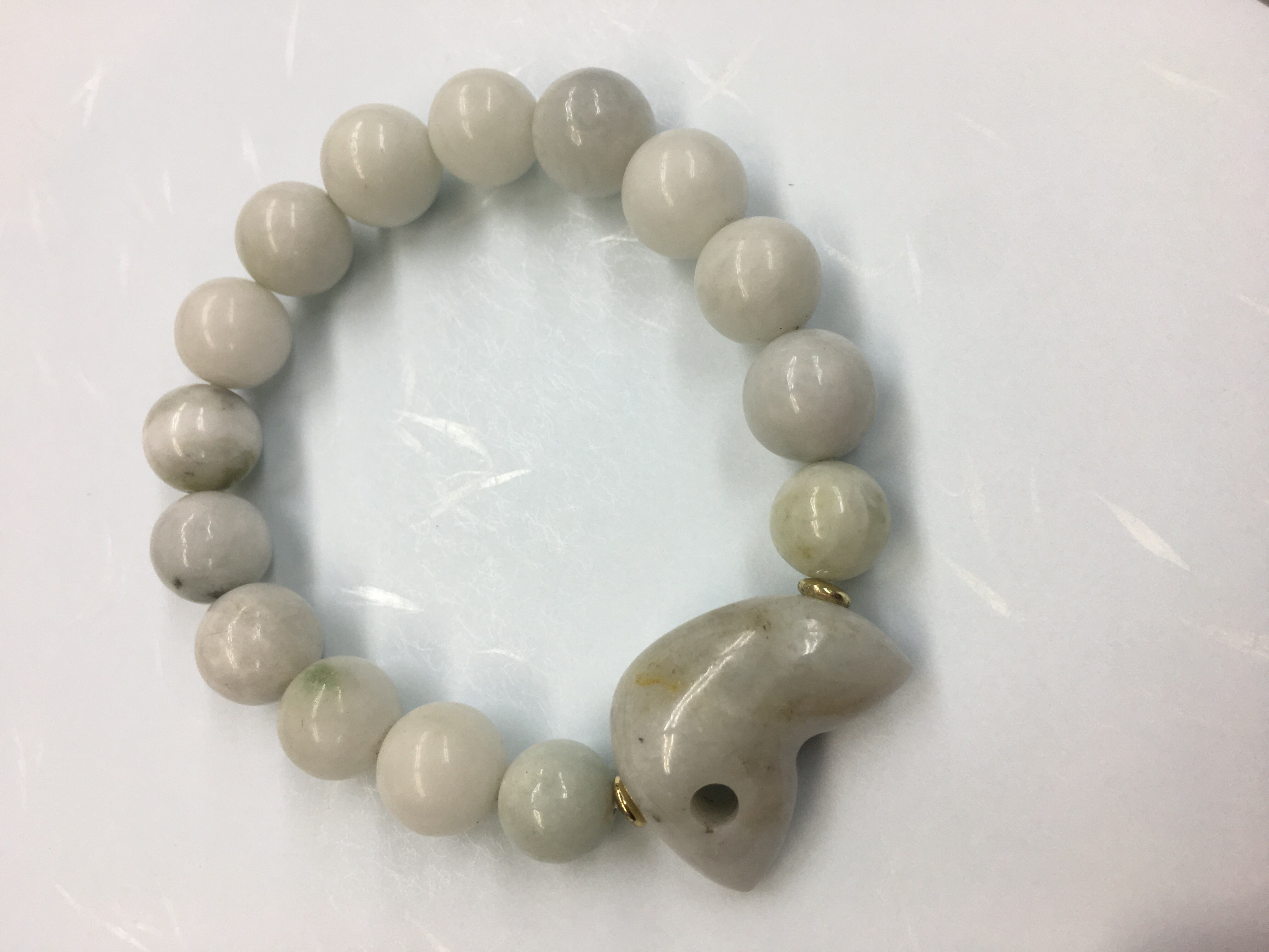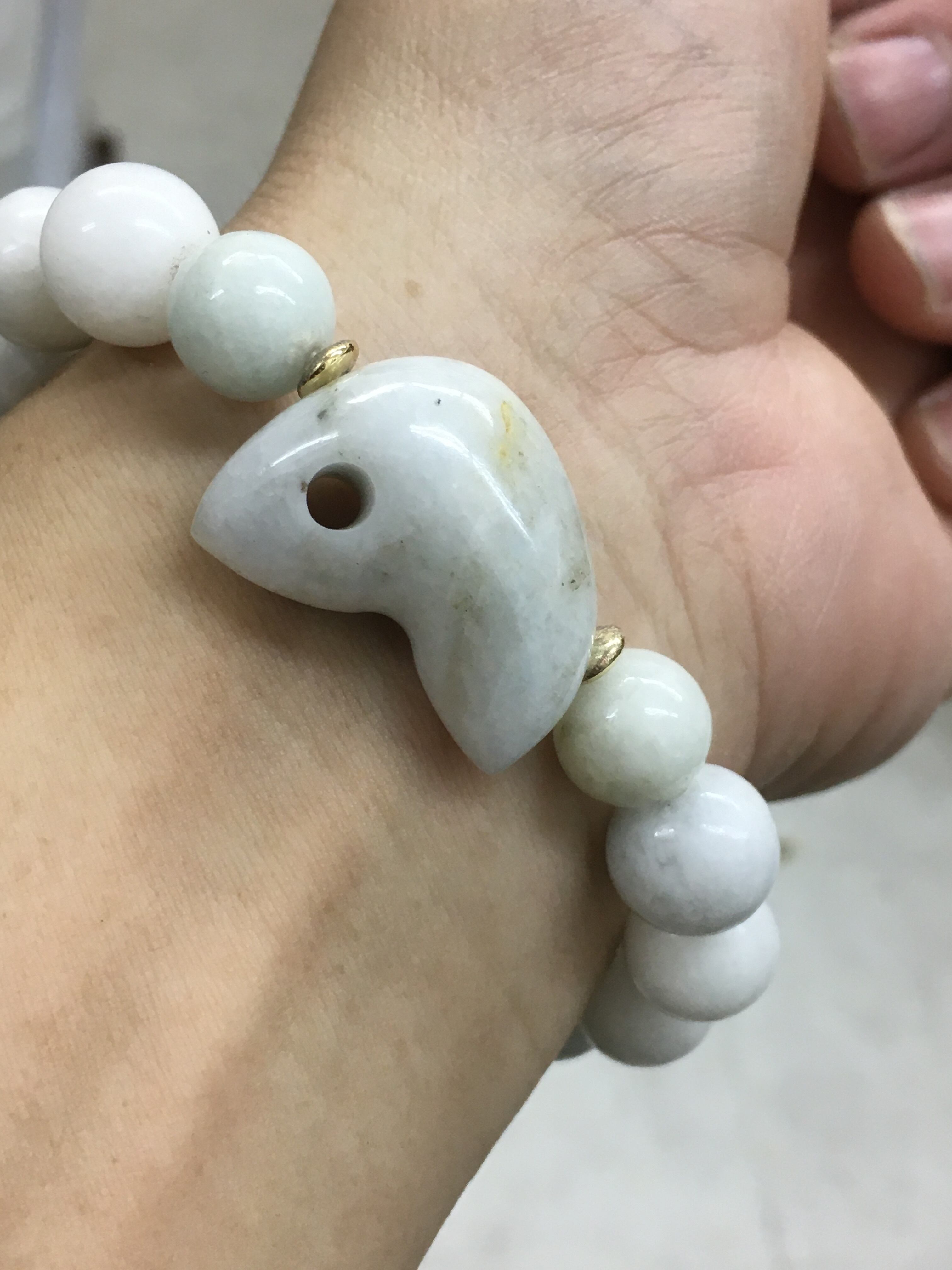 ブレスレットの丸玉は、白い糸魚川翡翠12mm玉が13粒、10mm玉が2粒、勾玉の左右に金属のメッキ算盤玉が2つ付いています。