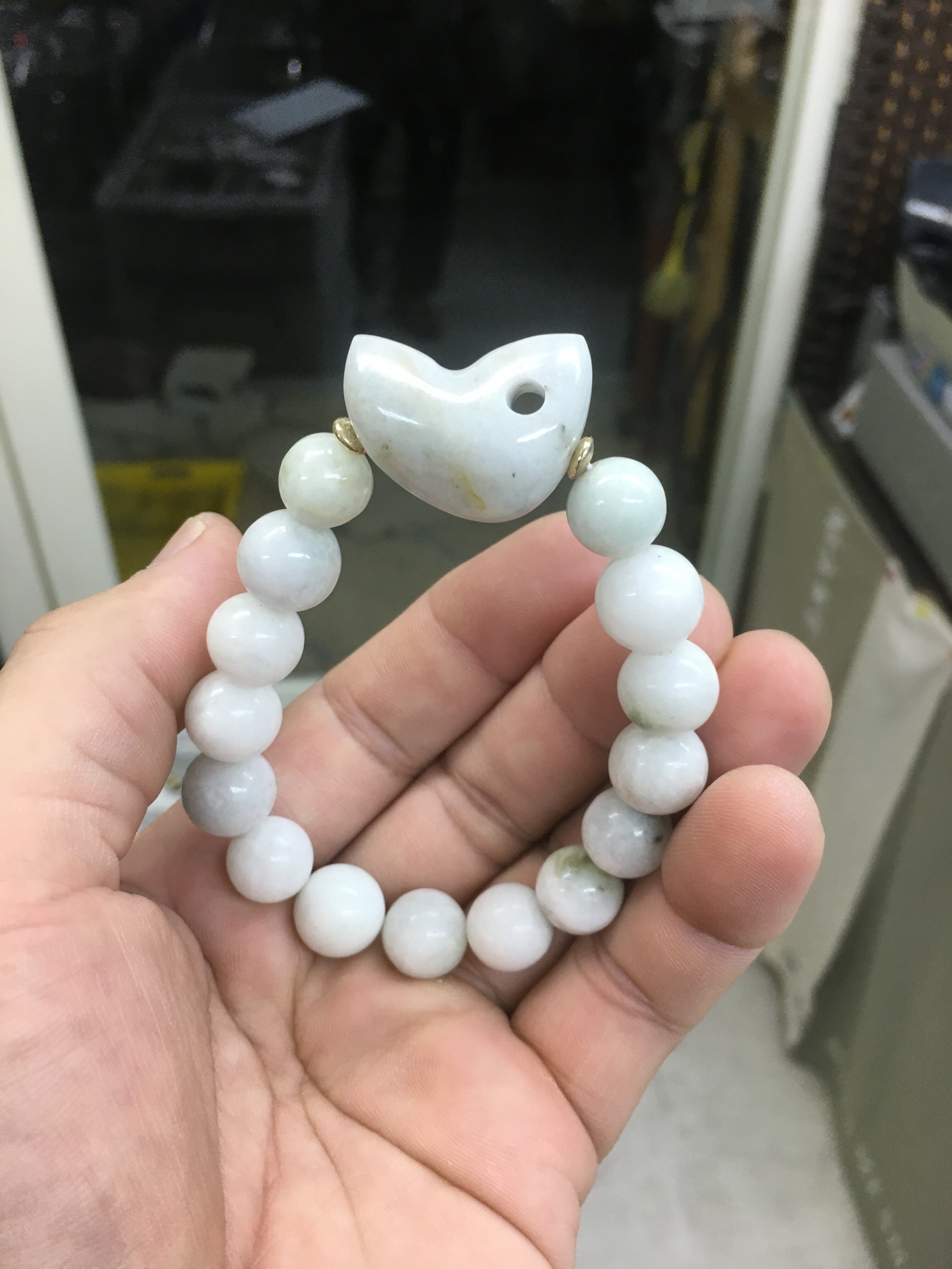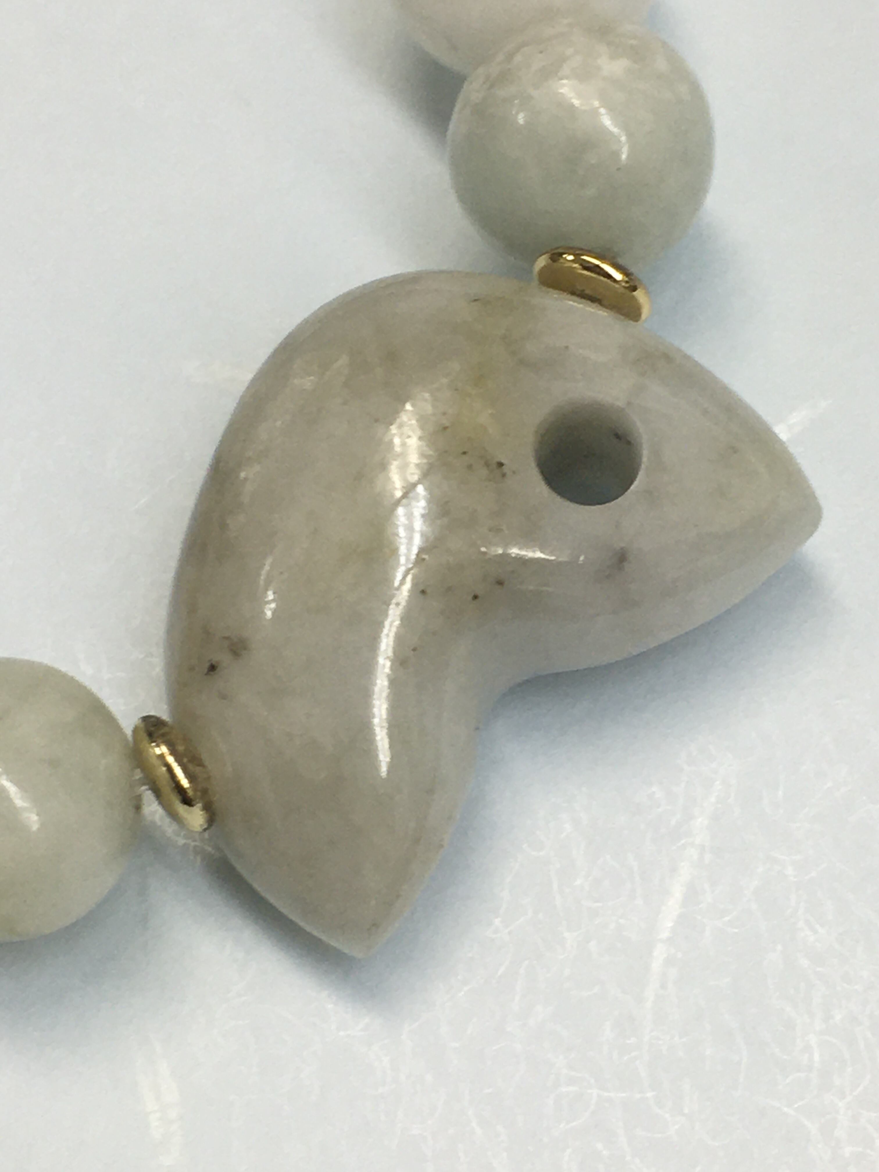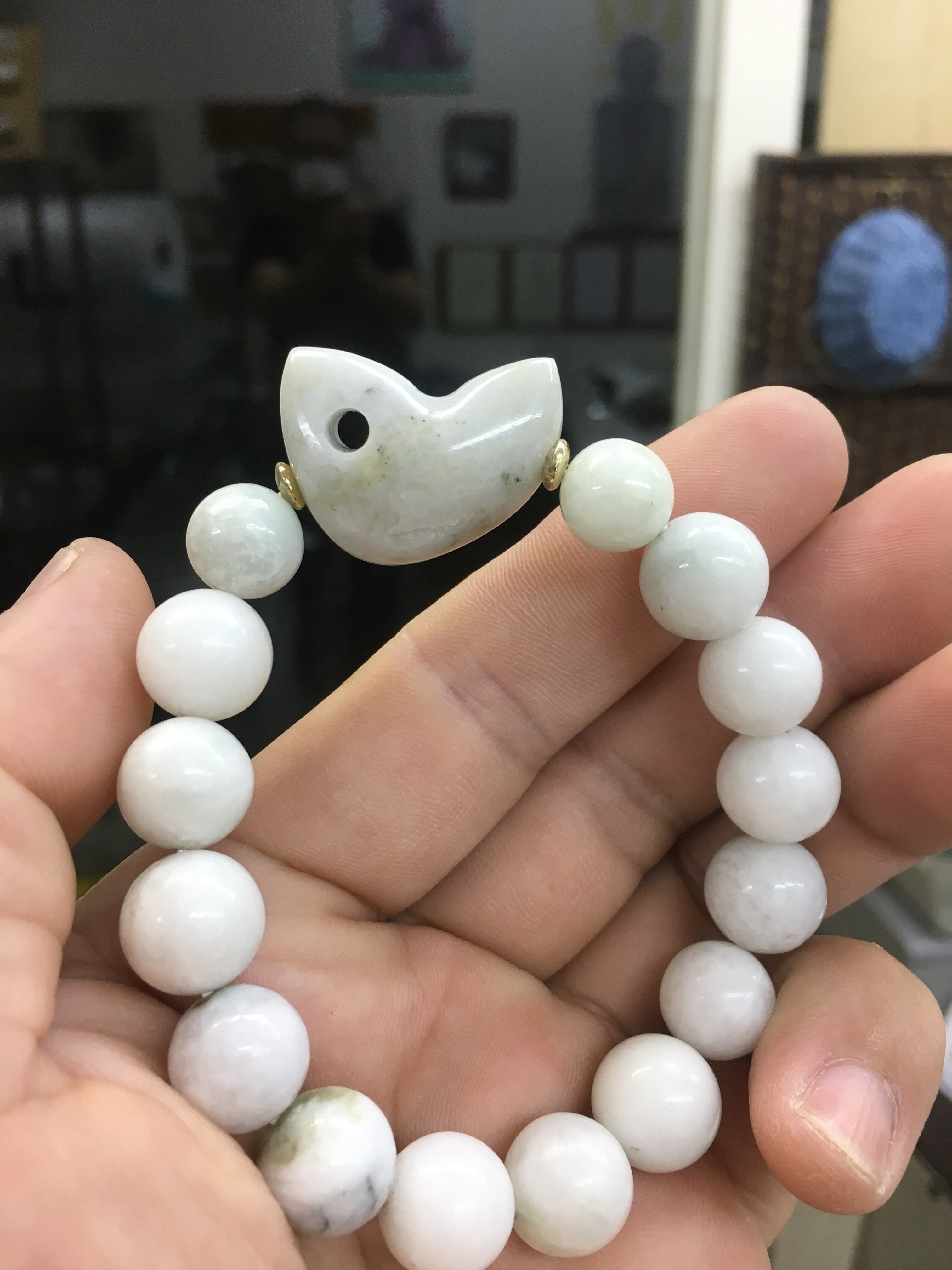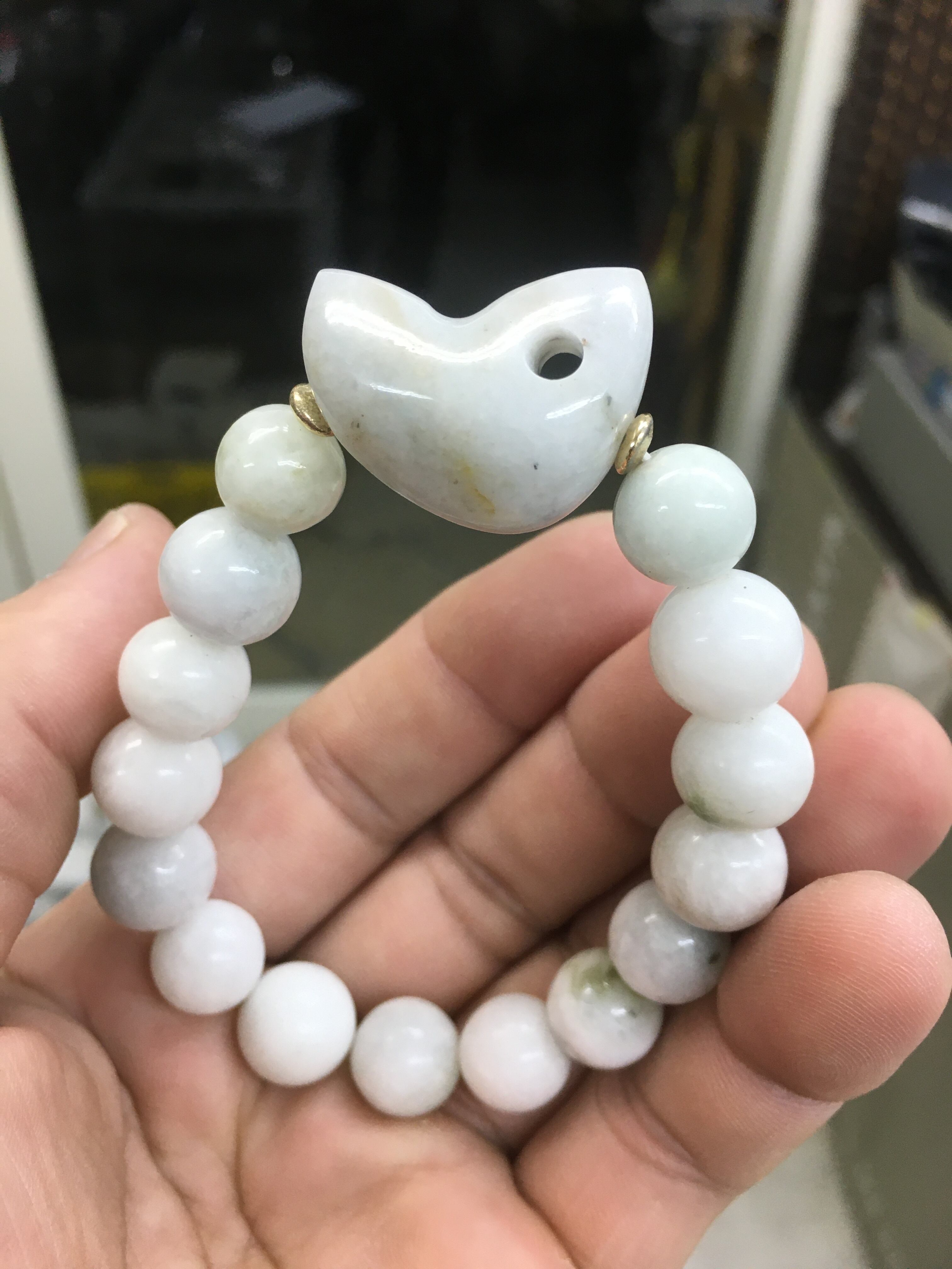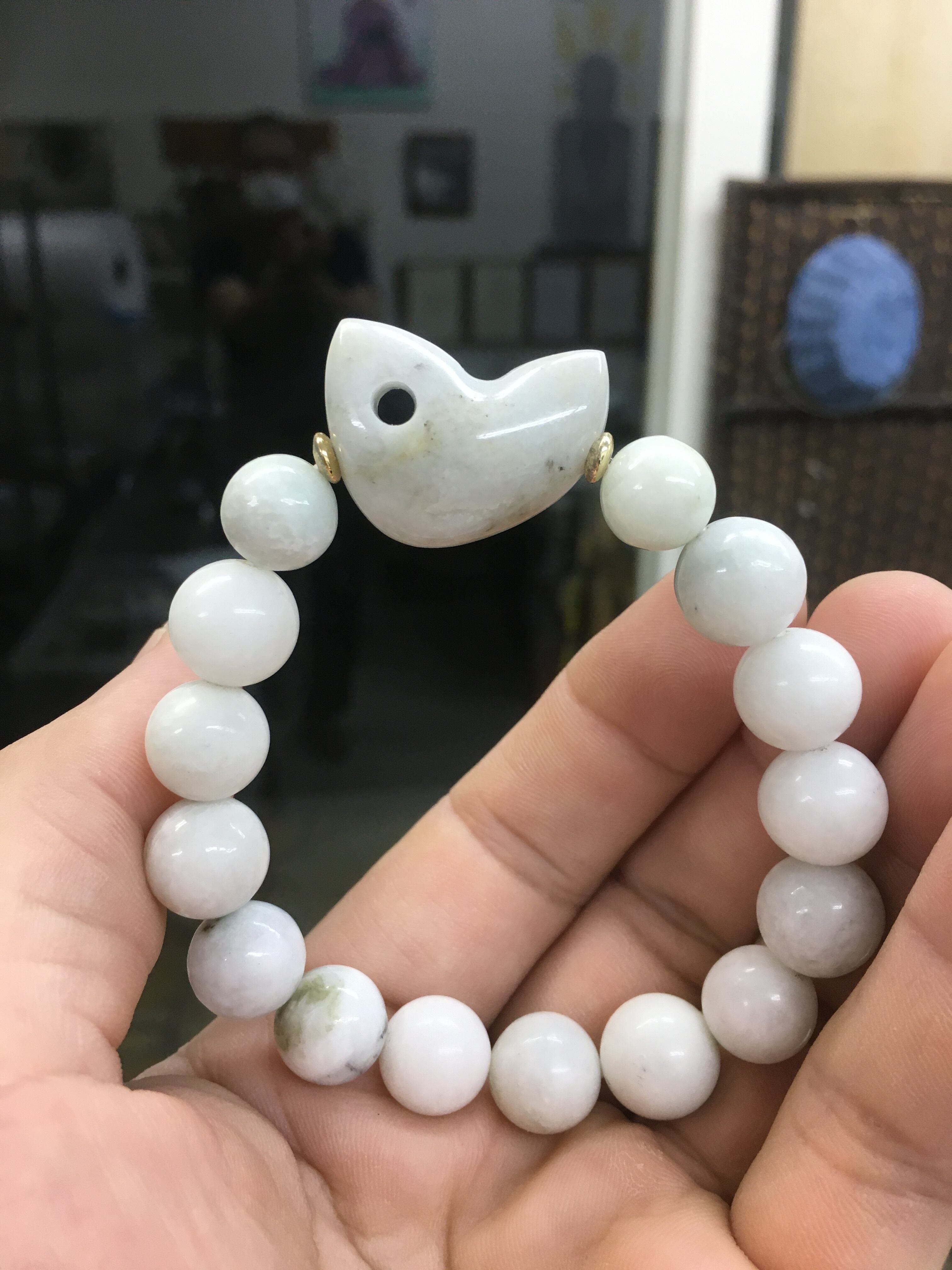 ブレスレットの丸玉は、白い糸魚川翡翠12mm玉が13粒、10mm玉が2粒、勾玉の左右に金属のメッキ算盤玉が2つ付いています。