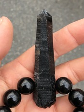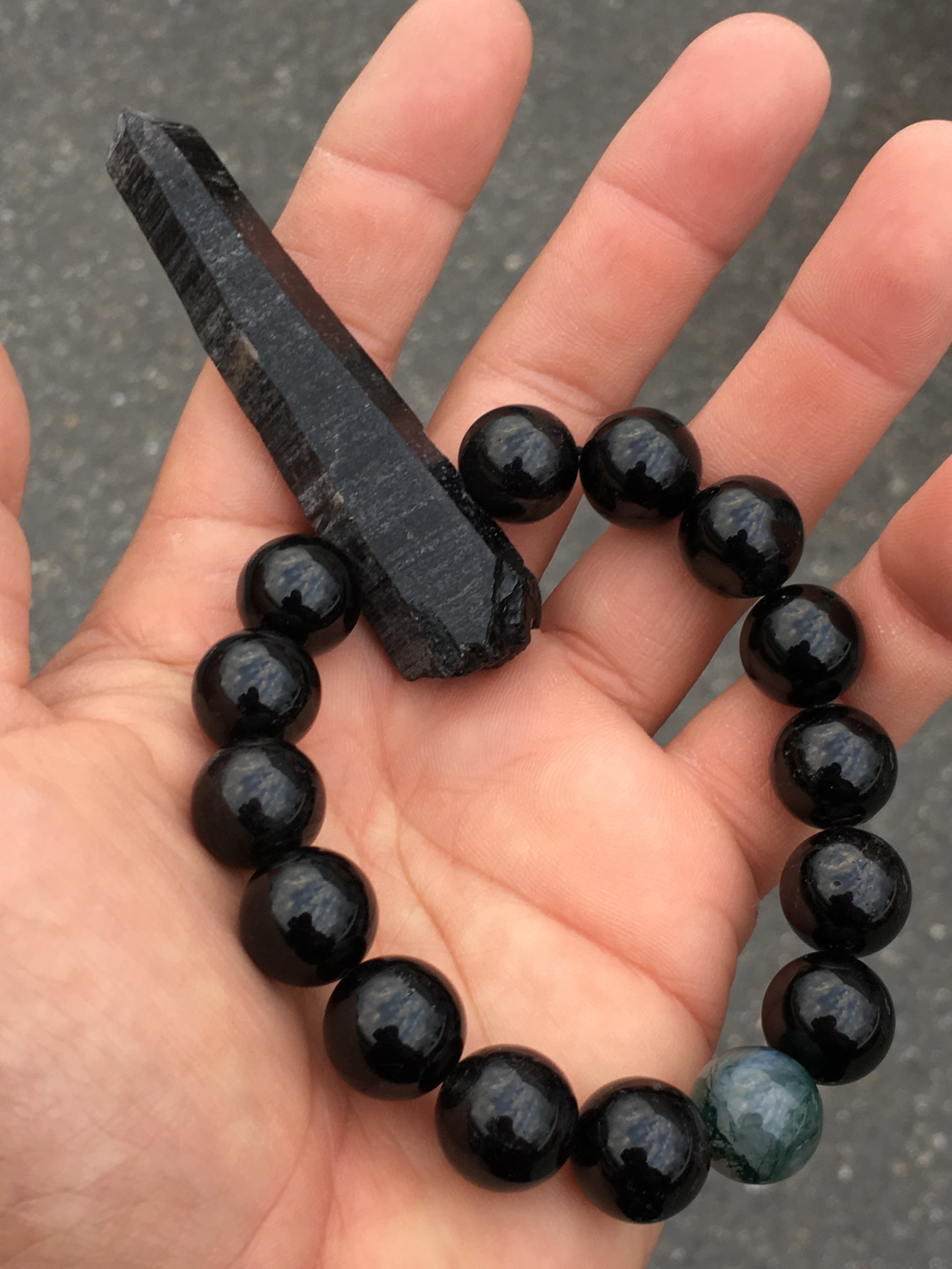 モンゴルのモリオンポイントと山東省のモリオン14mm玉、モスアゲートのビーズでブレスレットを組みました。