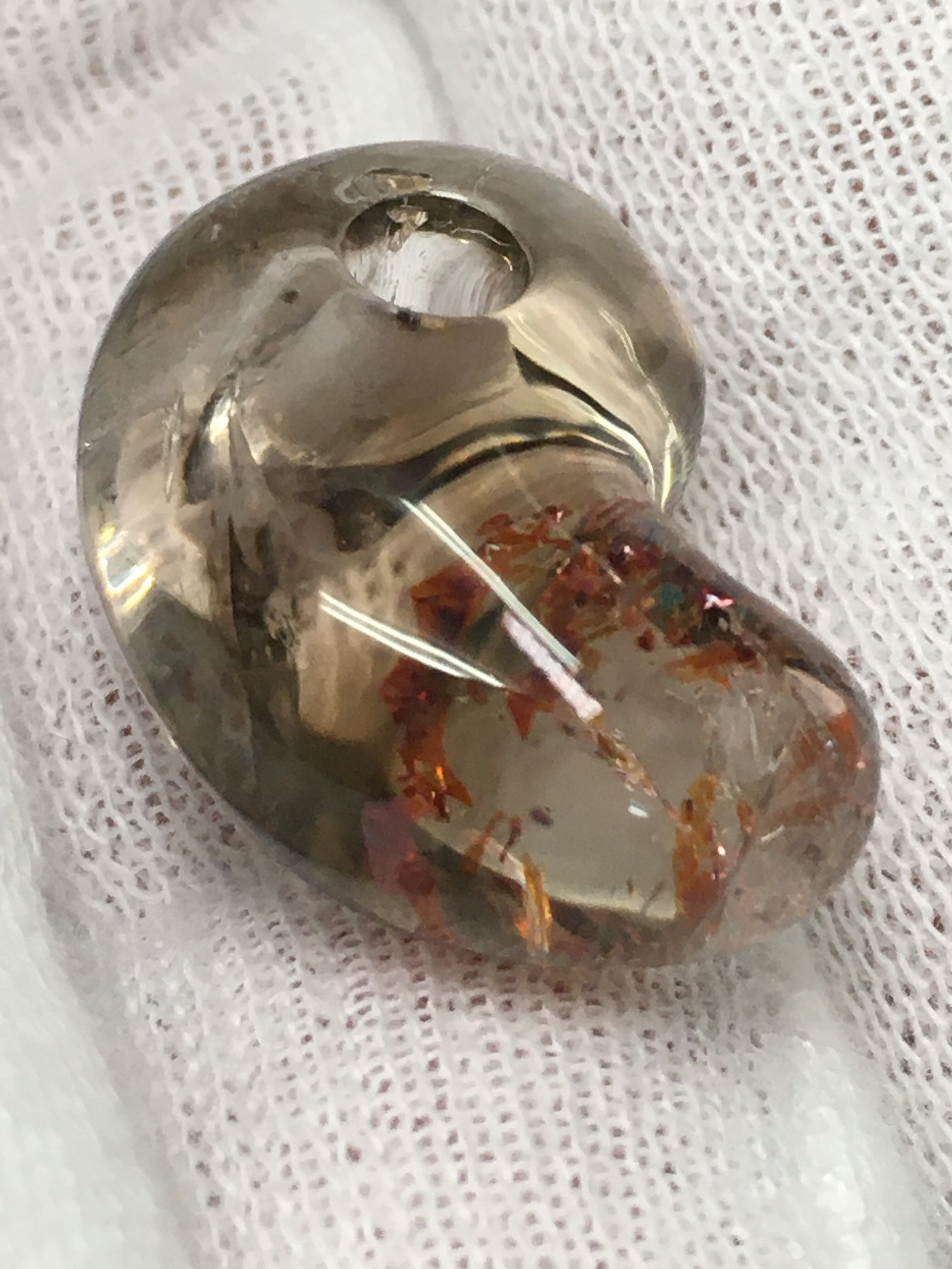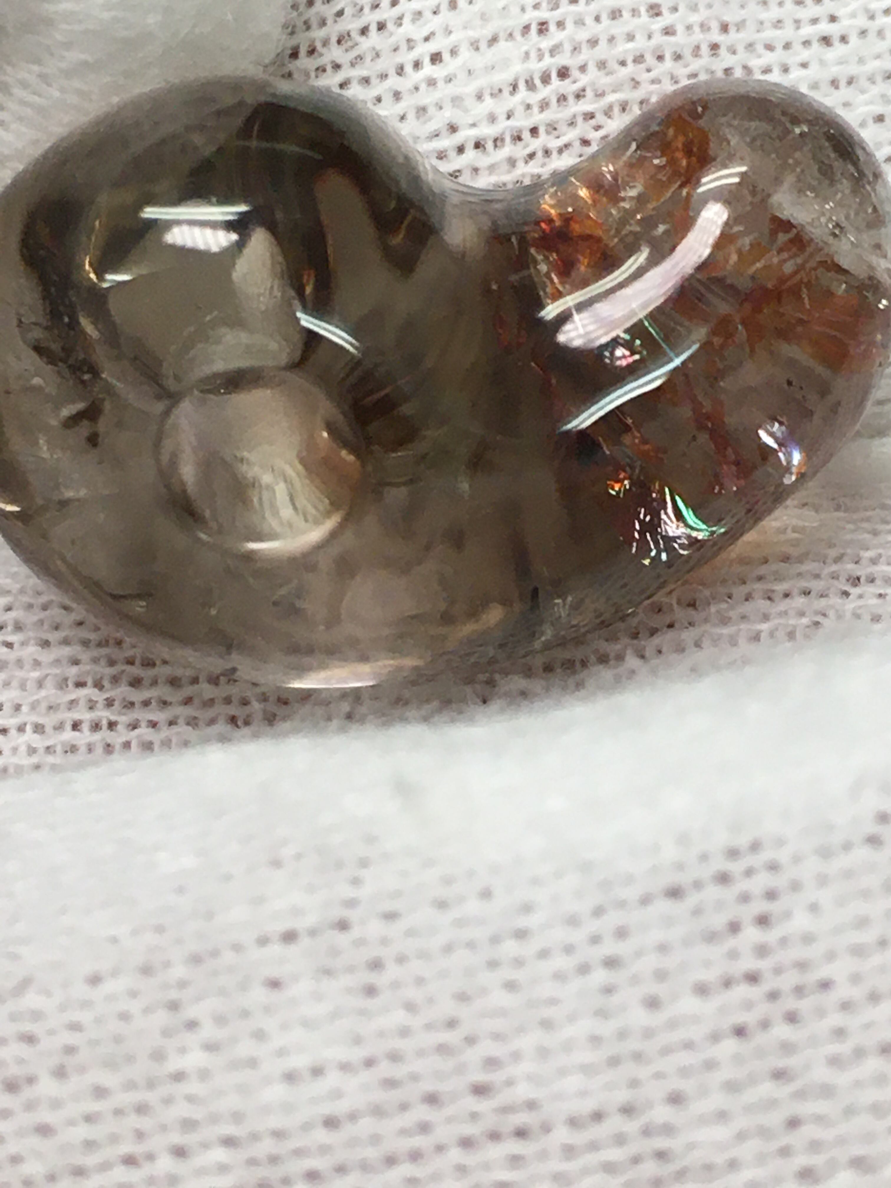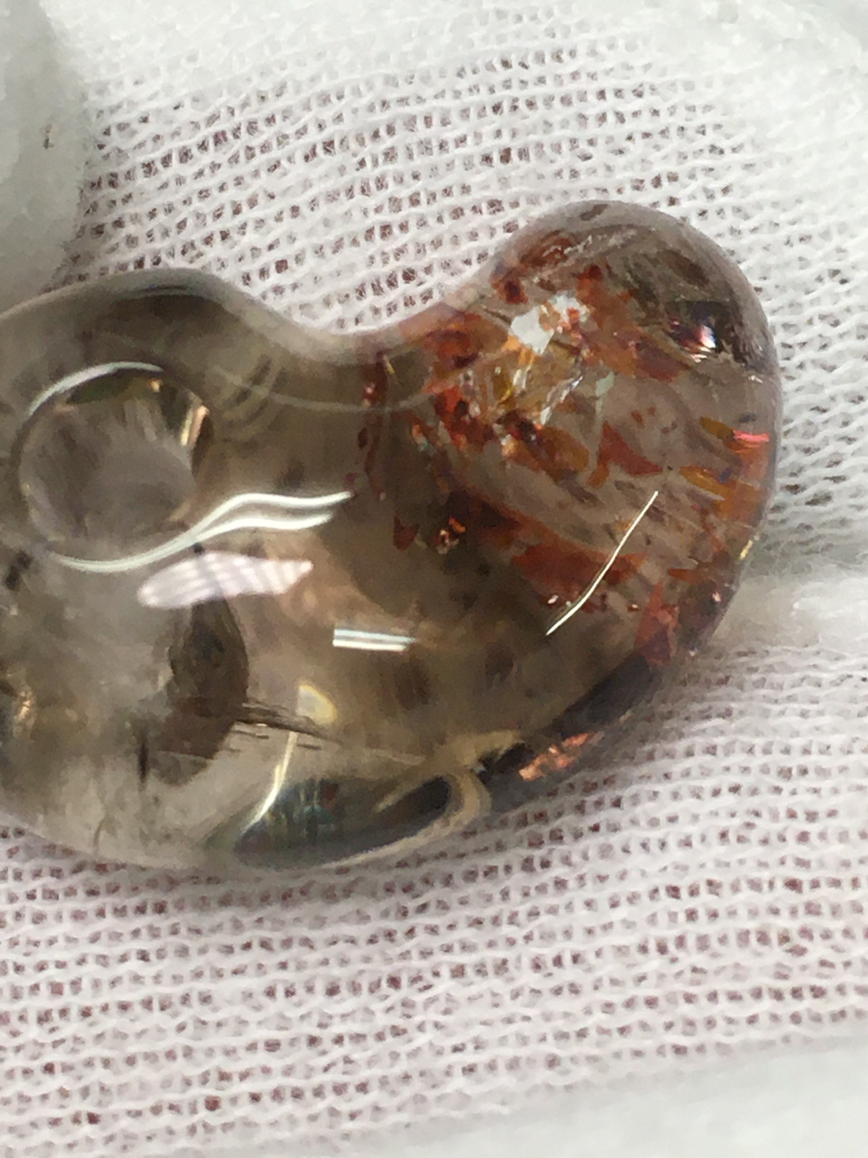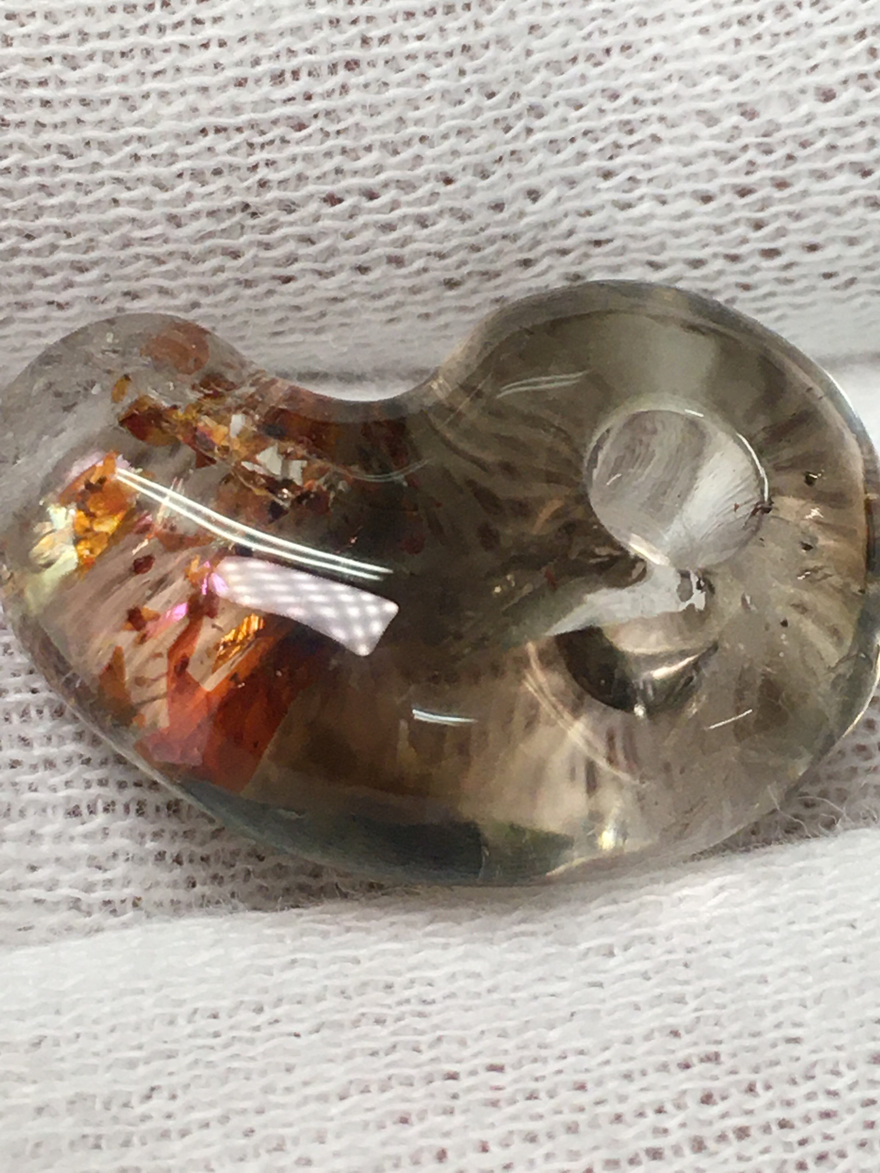 スモーキークォーツと、レピドクロサイト入水晶のファントムの所を勾玉にしました。