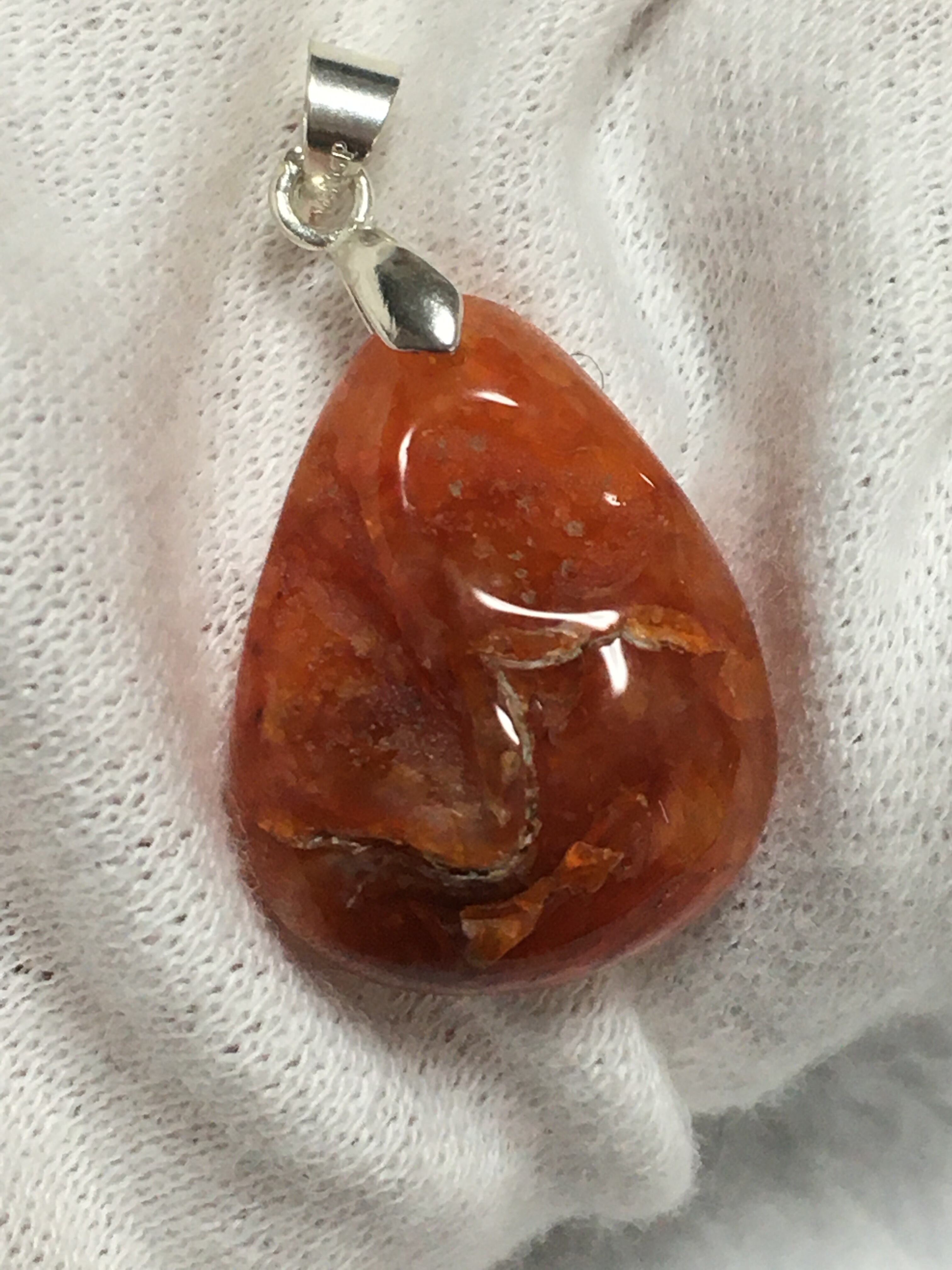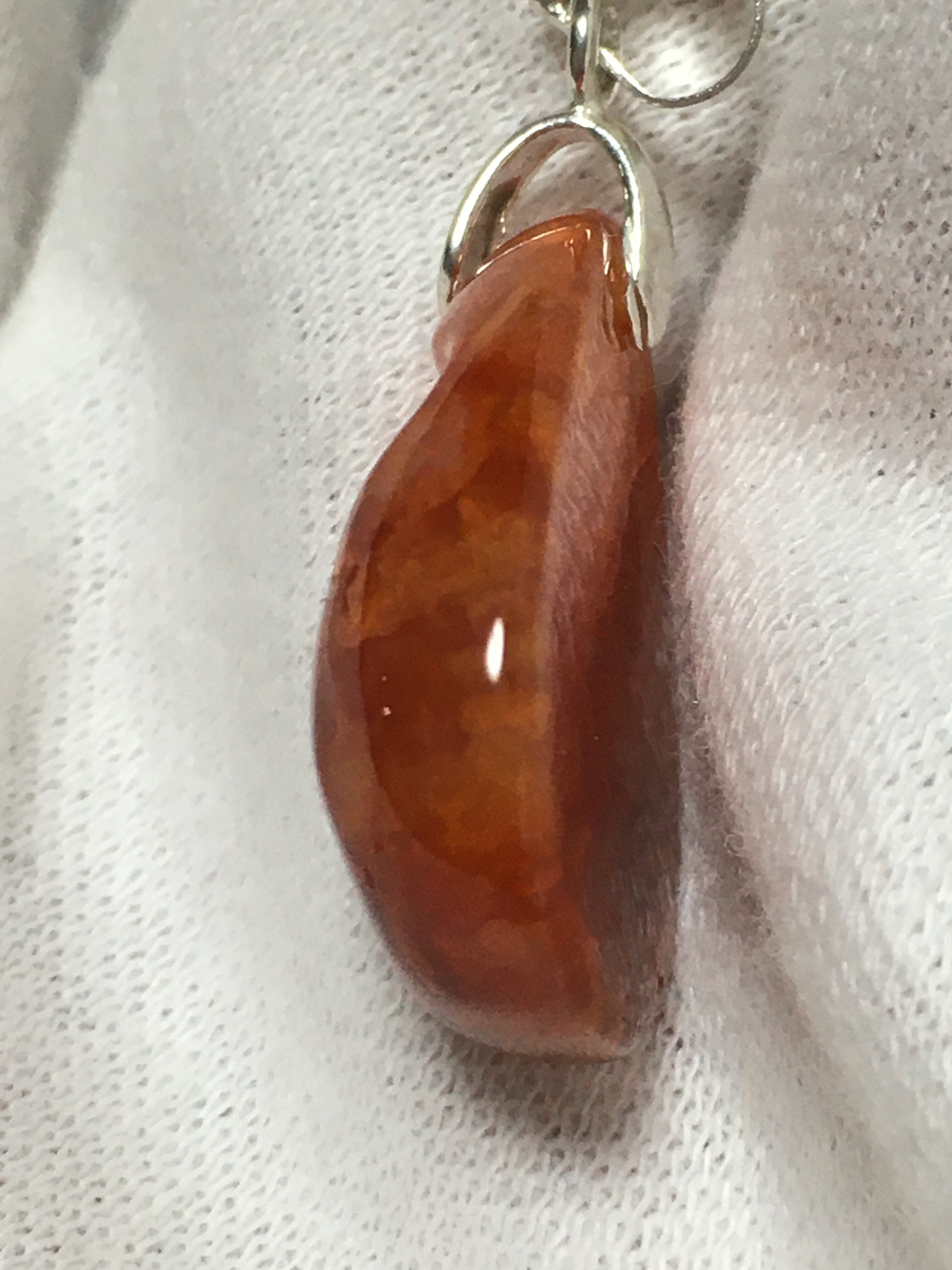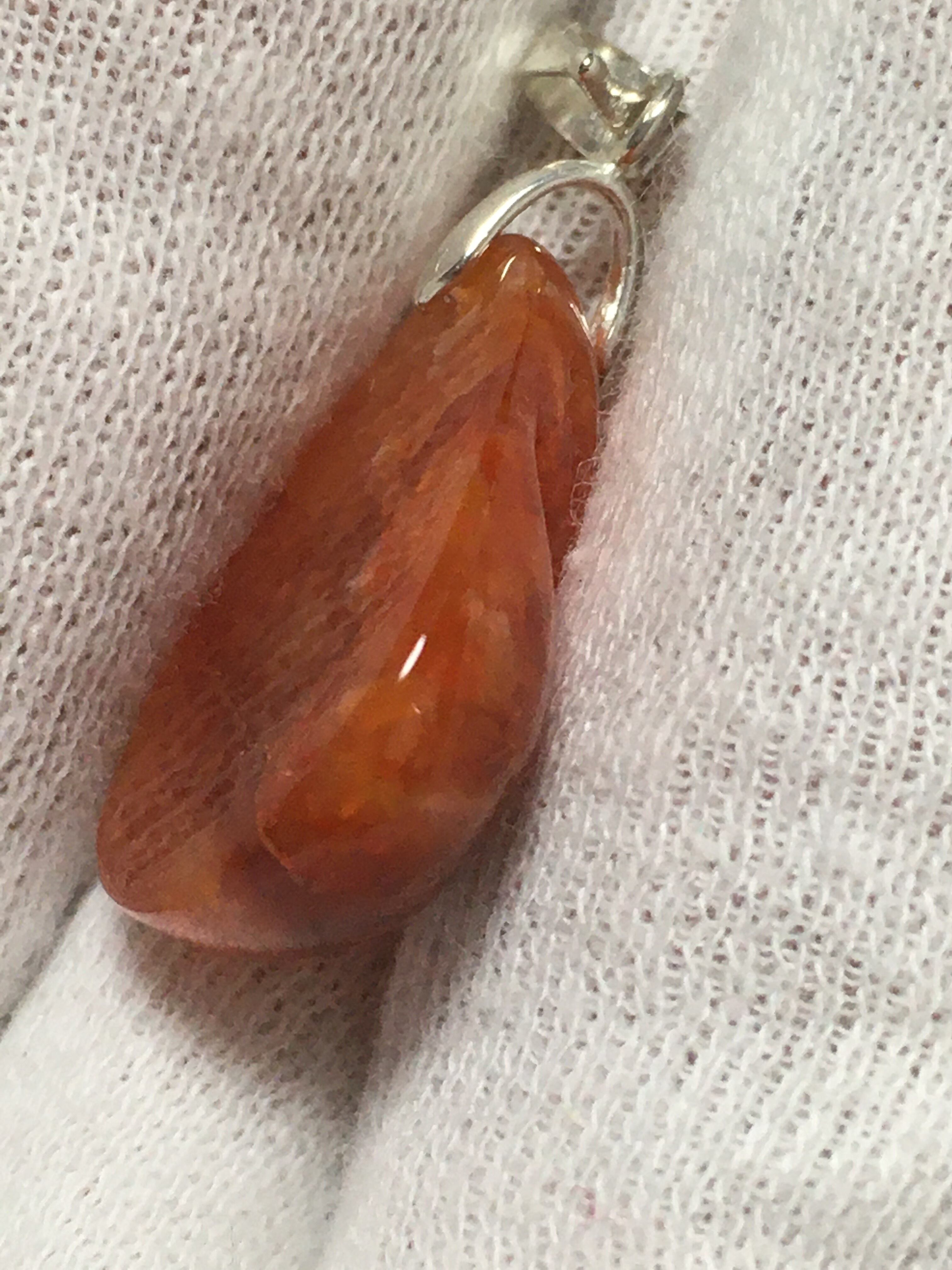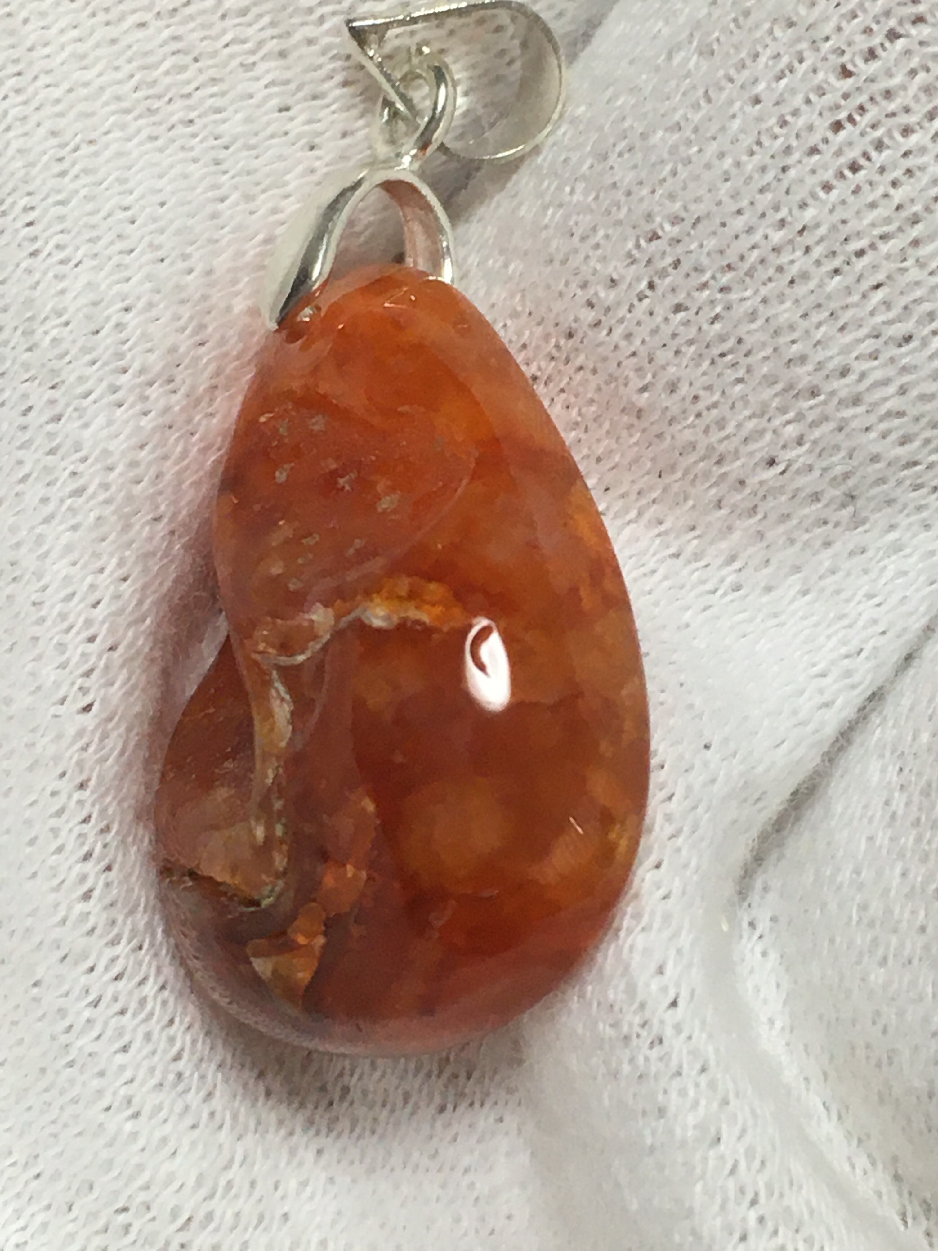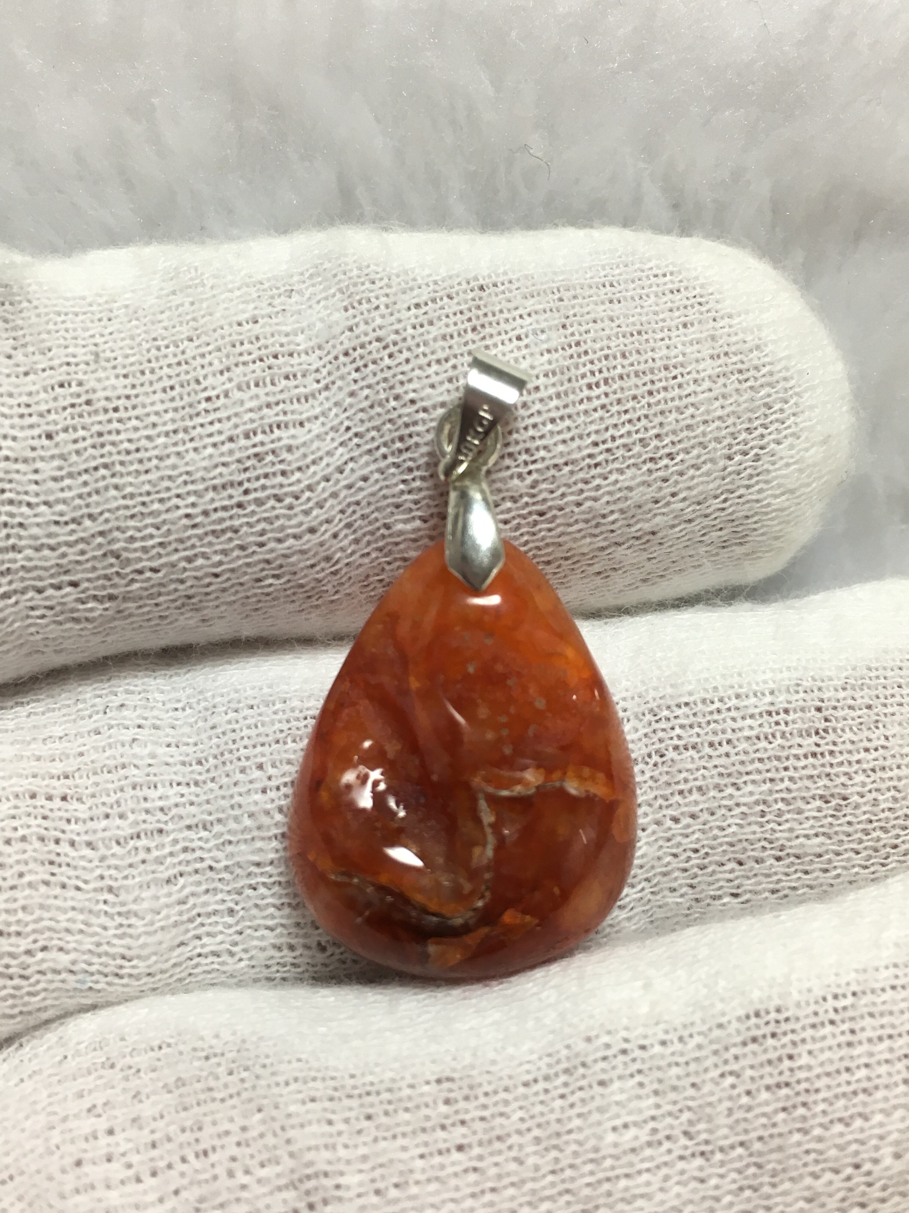 クレーターの様に、凹みを残したドロップ形に磨きました。ライトを当てると、血液の様な赤・橙色に染ります。指先で瑪瑙の凹みを感じとってください。