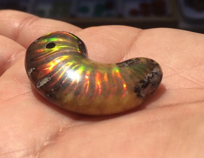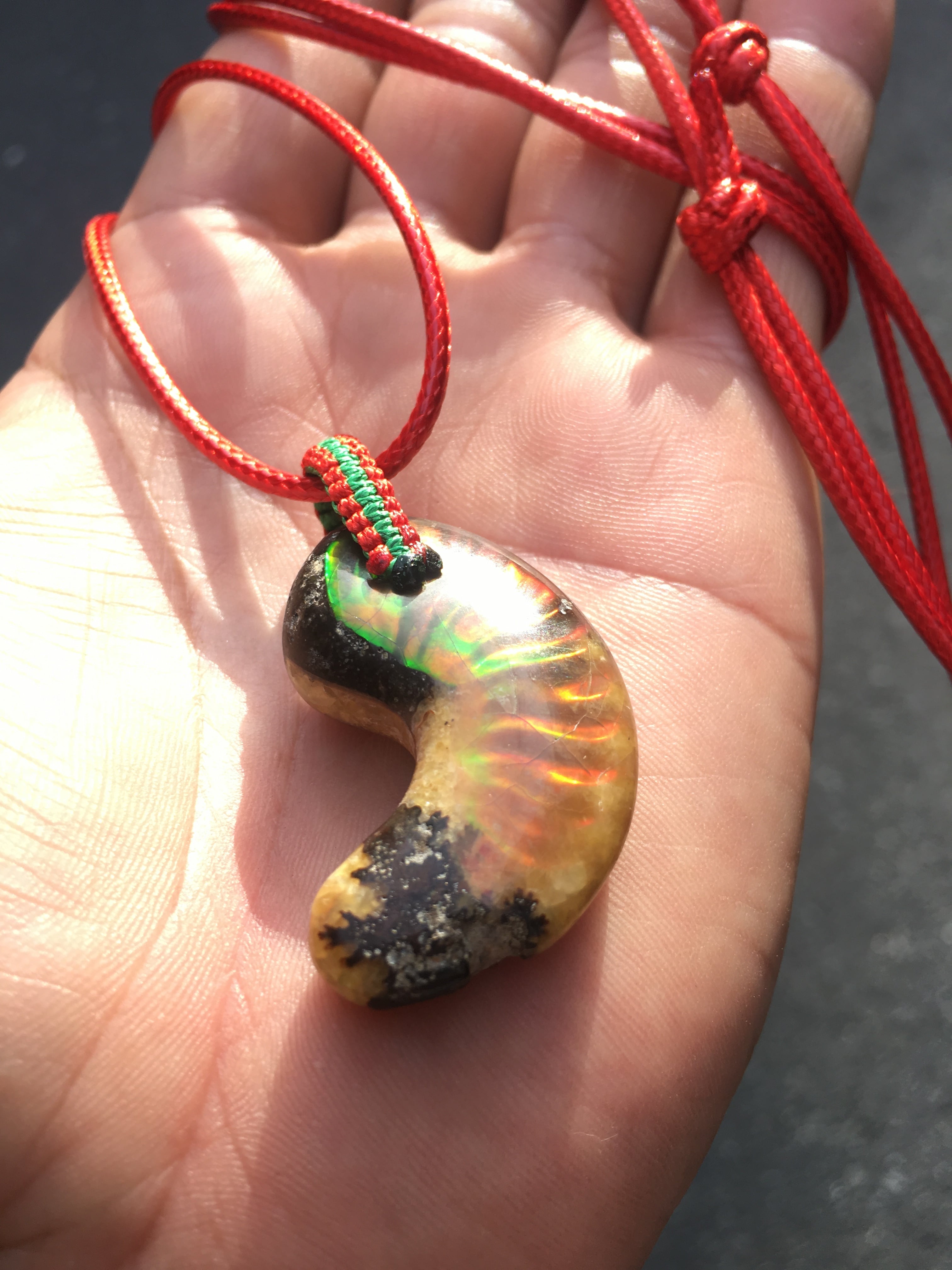 太陽の光には全ての色が含まれ、それを教えてくれるかのように、レインボーを表してくれるアンモナイトの勾玉です。