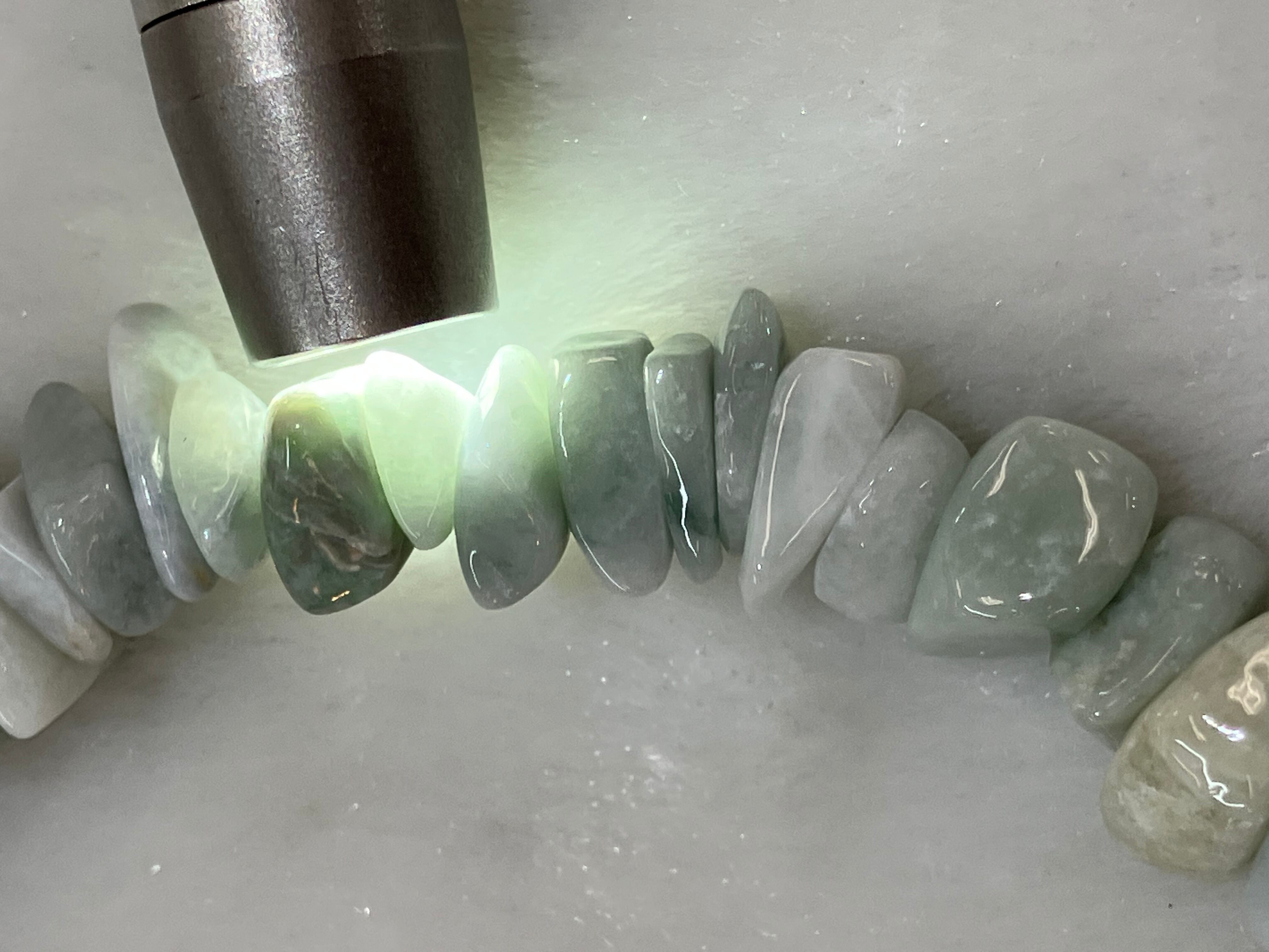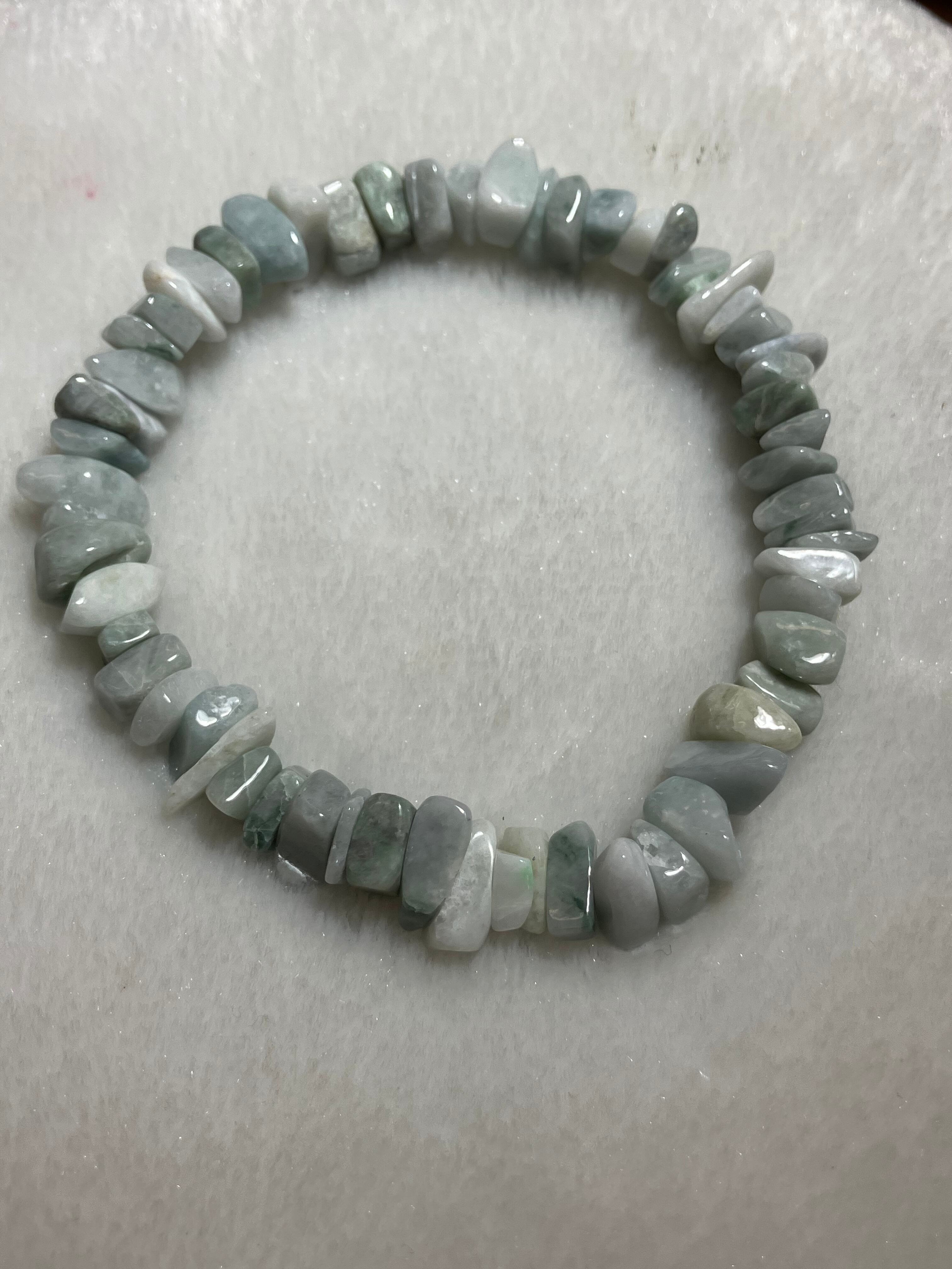 作成した糸魚川翡翠の、さざれ石ブレスレットです。小さい内周への変更可能です。(無料)