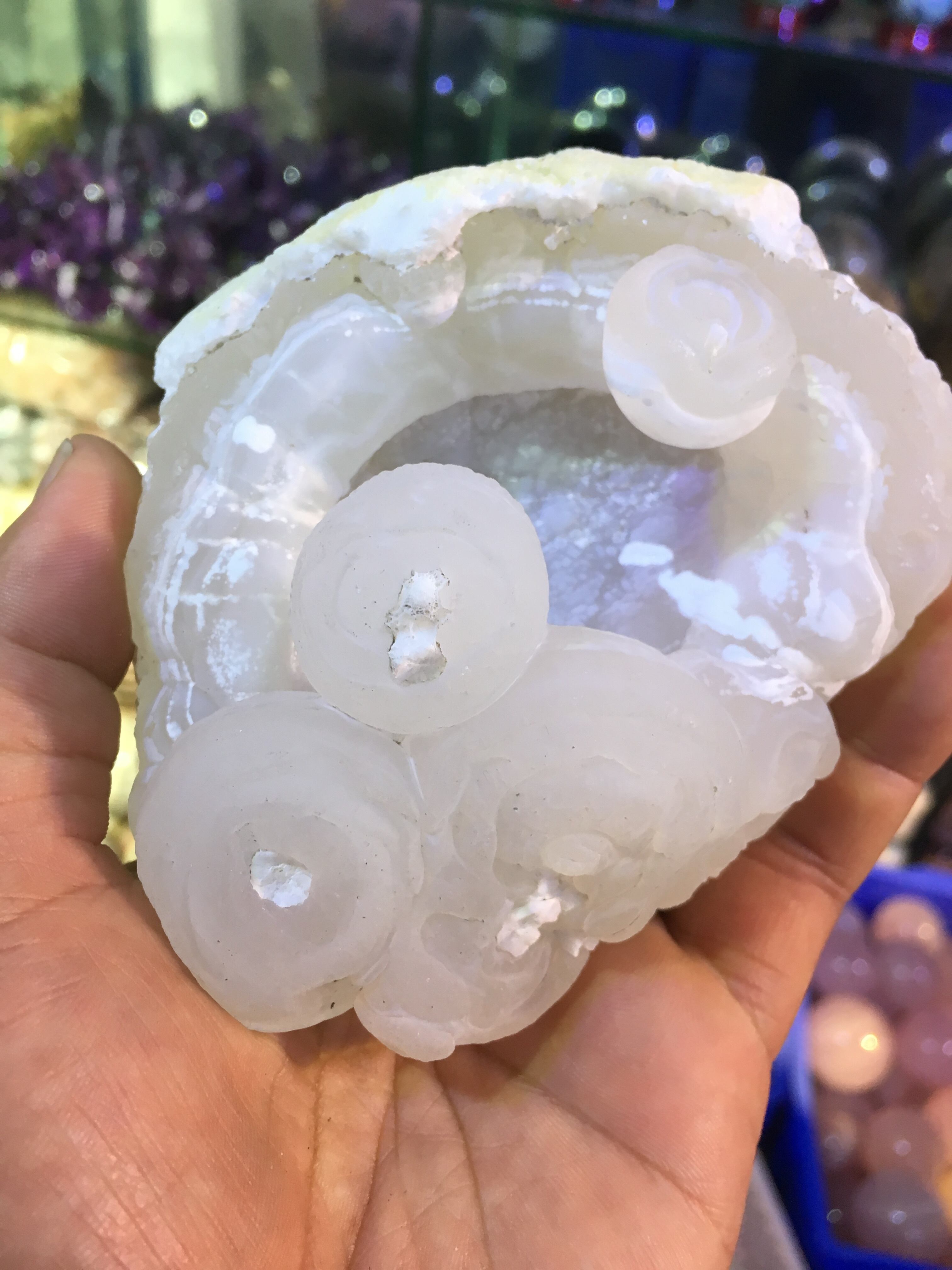 鑑賞用に台座をつけております。また、内部に空間がありますので、ちょっと贅沢ですが、セイジを炊く浄化用の受け皿もしても利用できるのではないかと思います。手触りも独特で、手のひらの上で鑑賞されるのも一つかと思います。清らかで、枯れない石の花は繁栄の象徴として、昔から人気を集めています。瑪瑙は健康の石として昔から利用されてきたことも有名です。(温めて肌の上から臓器を温める治療)