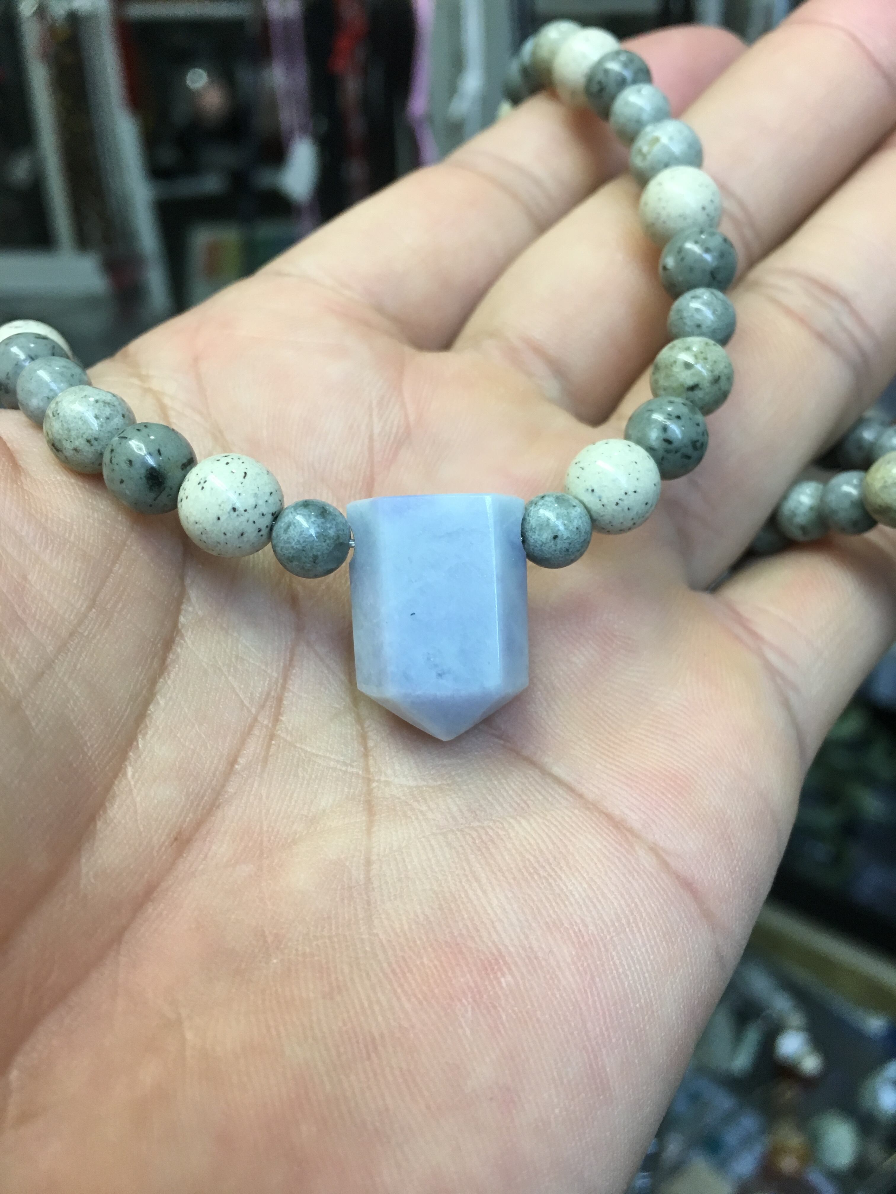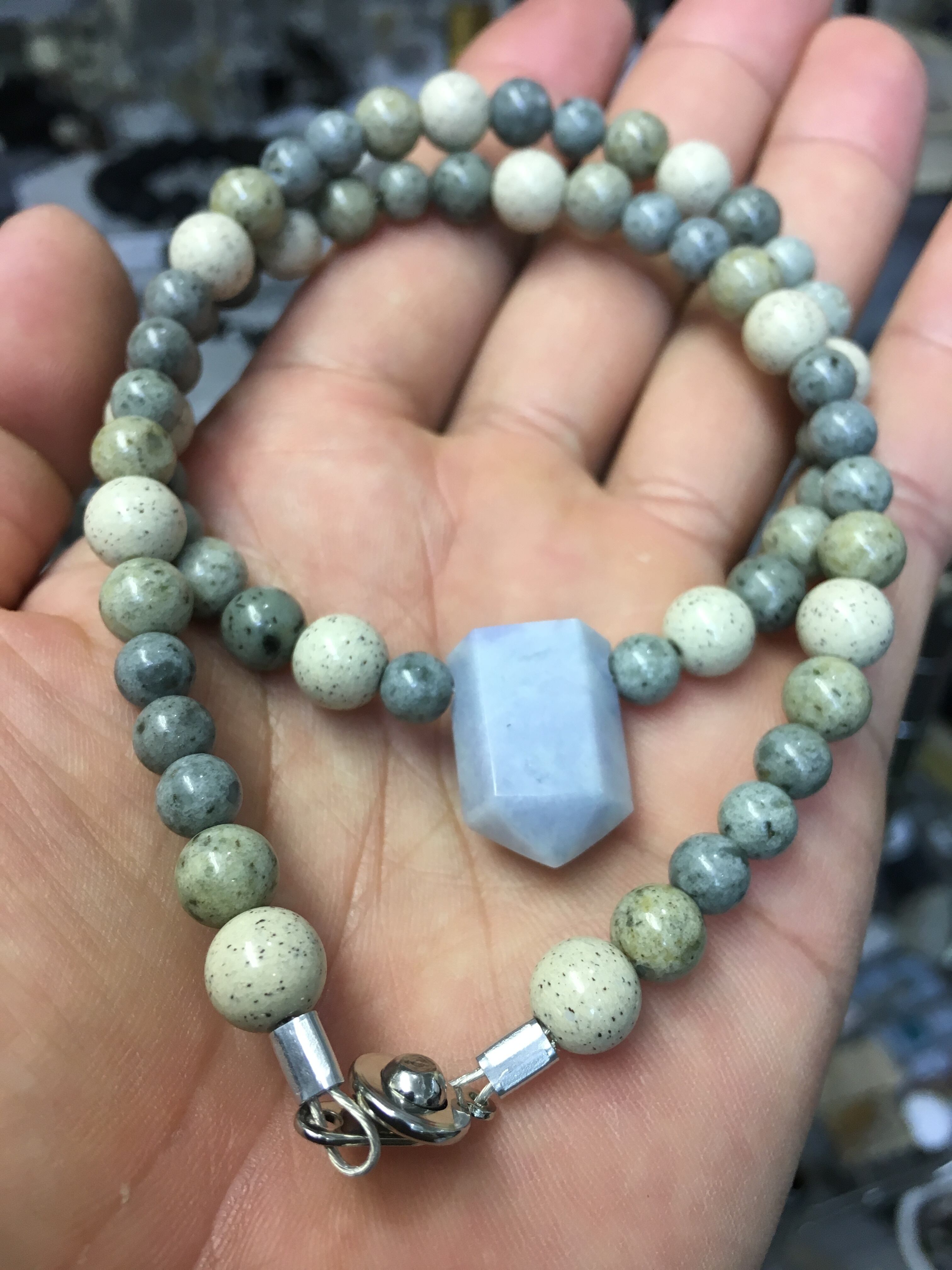 色味の合う、青海産の青海薬石と夏バテにも良いと言われるマイナスイオン(自然放射線)を放出する北投石を組みあわせて、ネックレスを作成いたしました。(サイズはおよそ45センチ)