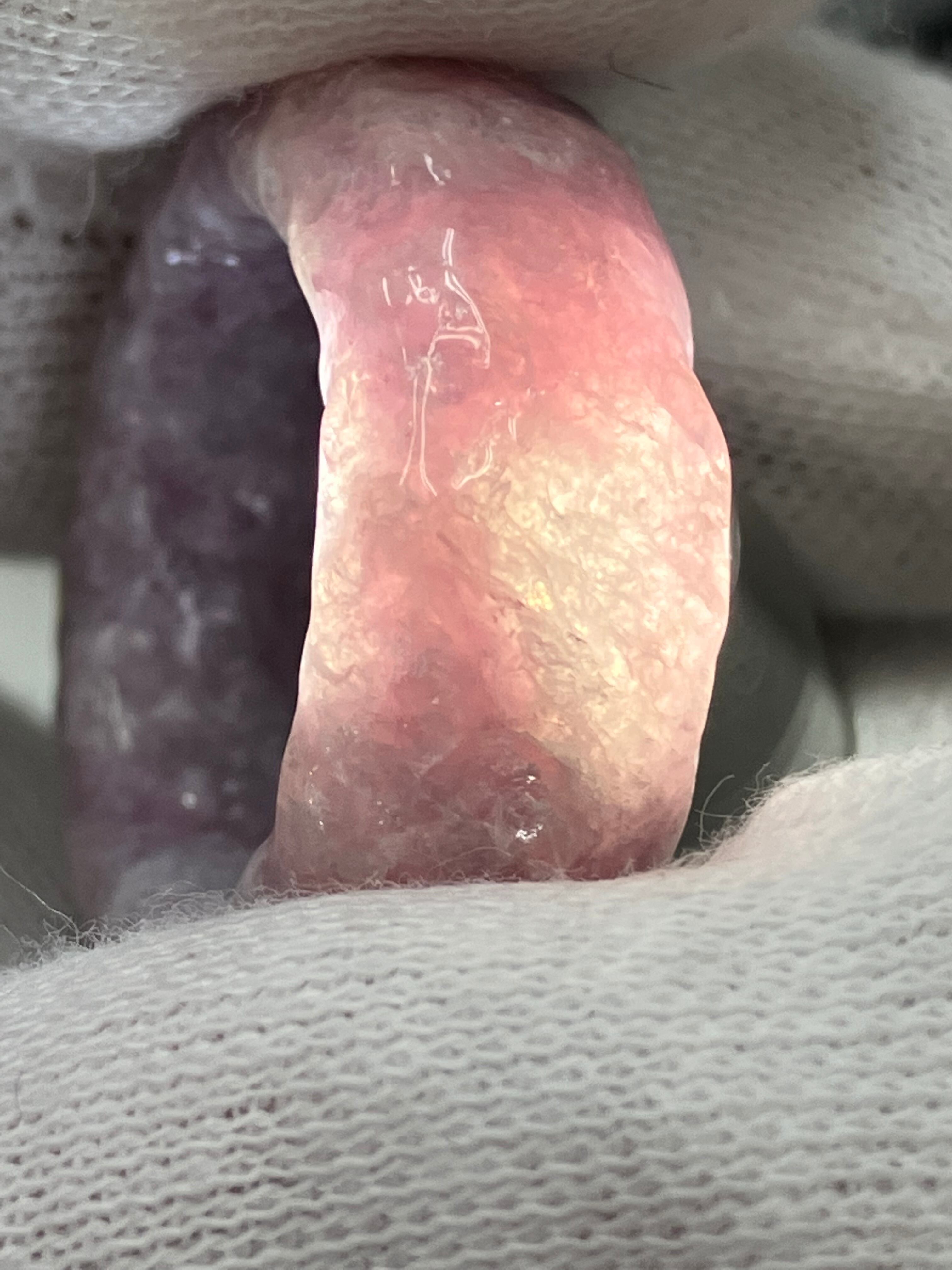 ライトを当てると、赤紫色に透過して優しい色合いを見ることができます。