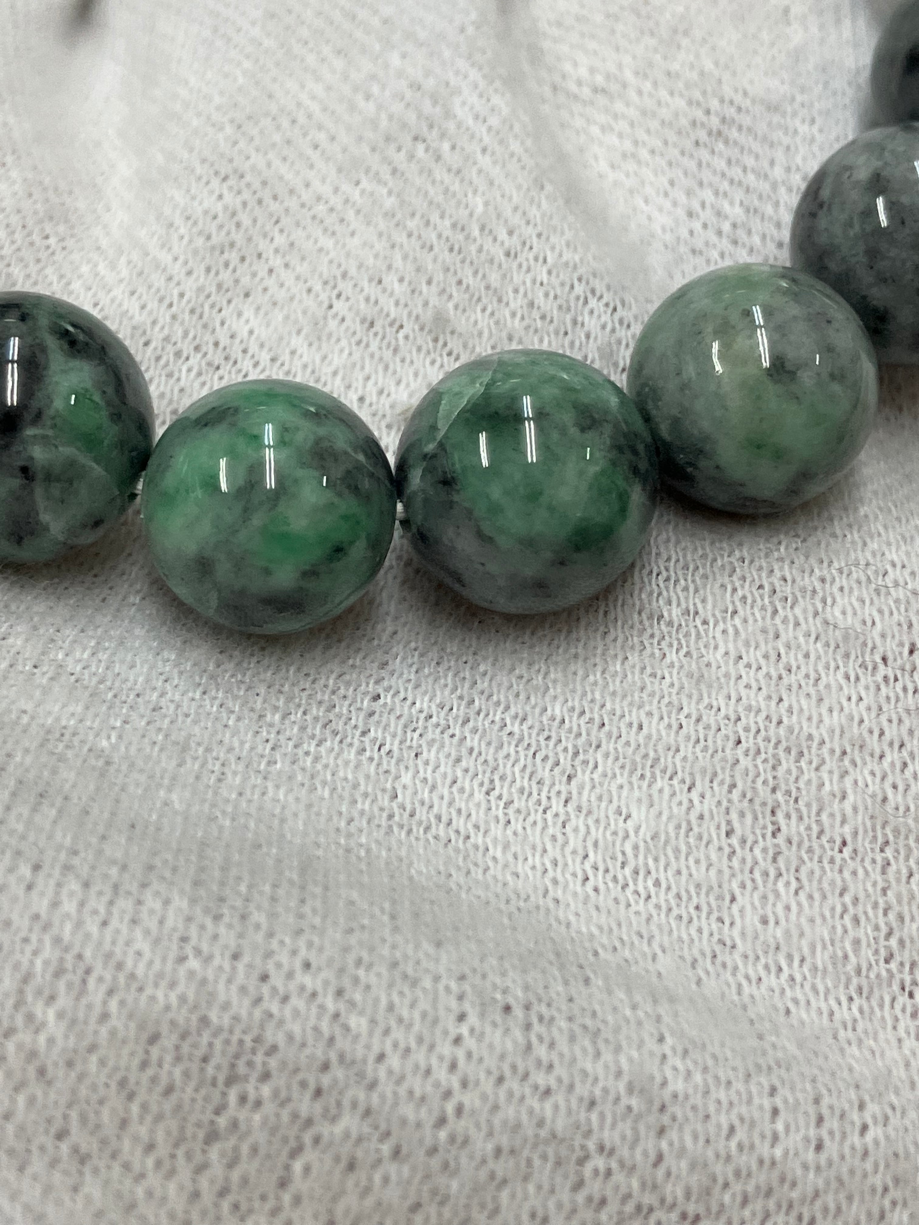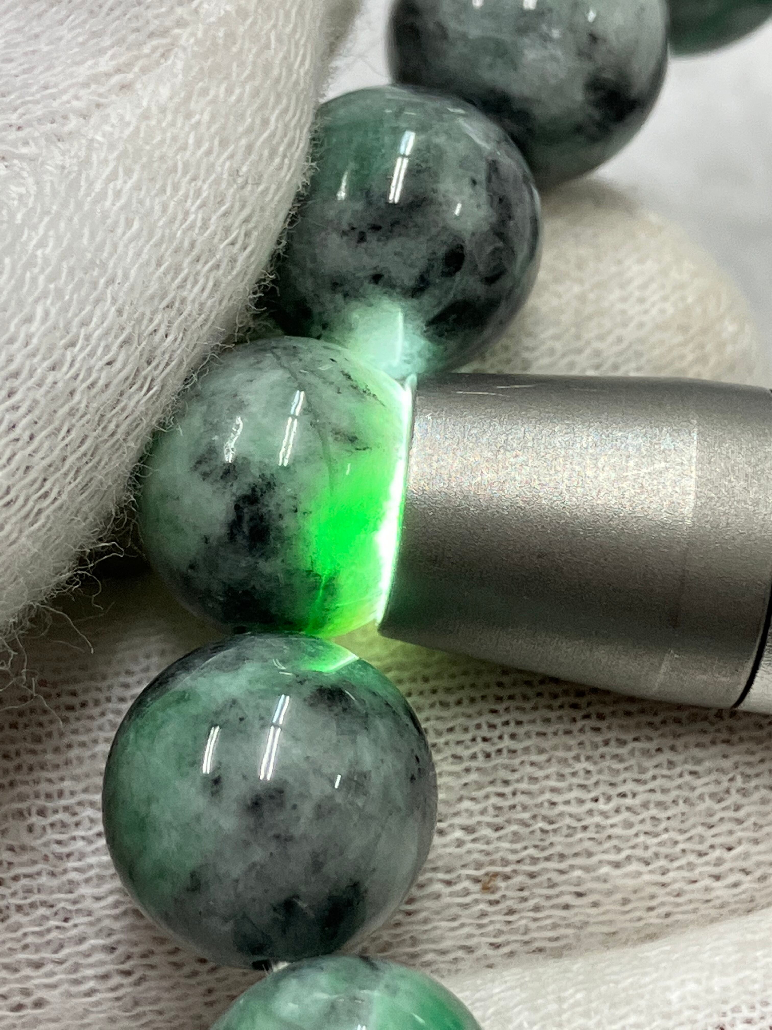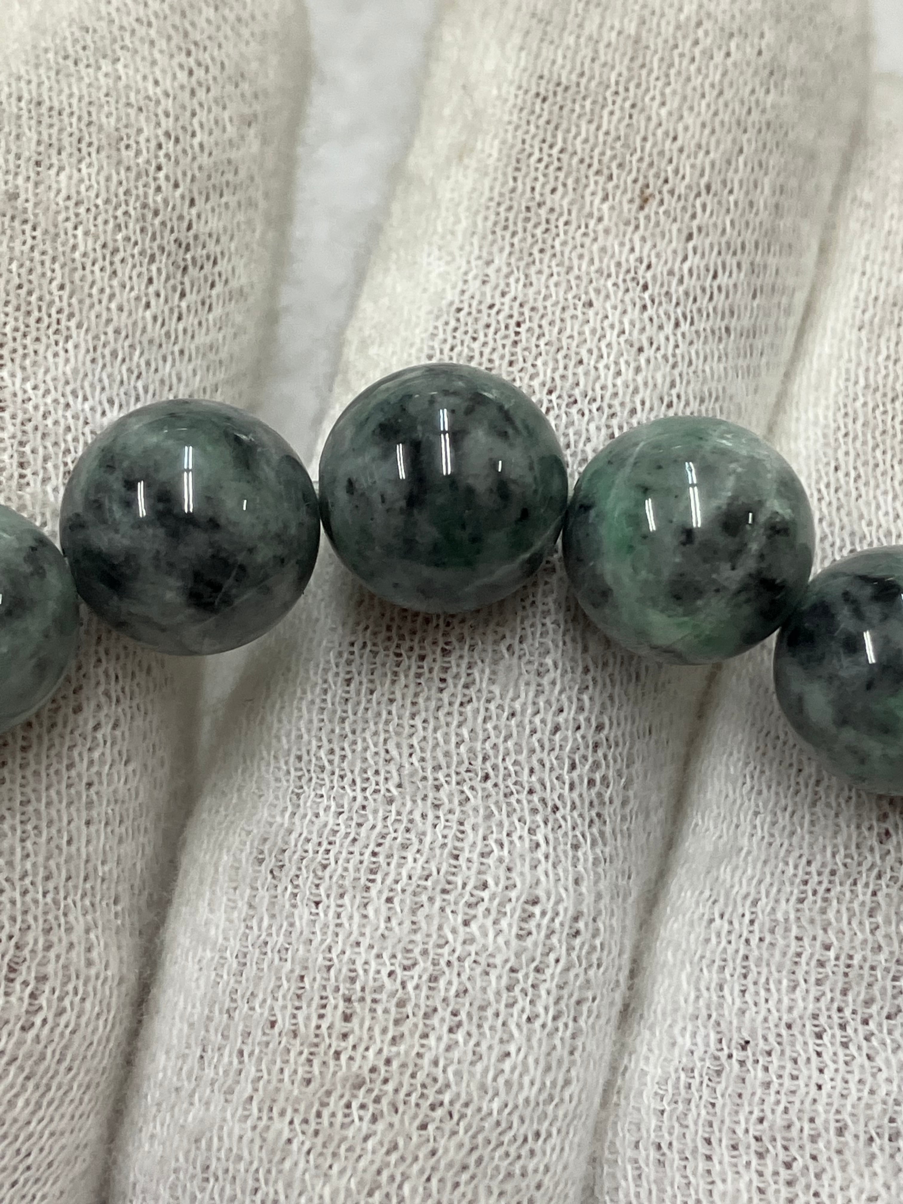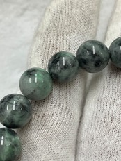 糸魚川翡翠の炭素質と呼ばれる黒い翡翠に緑色が入った部分を集めてブレスレットをつくりました。