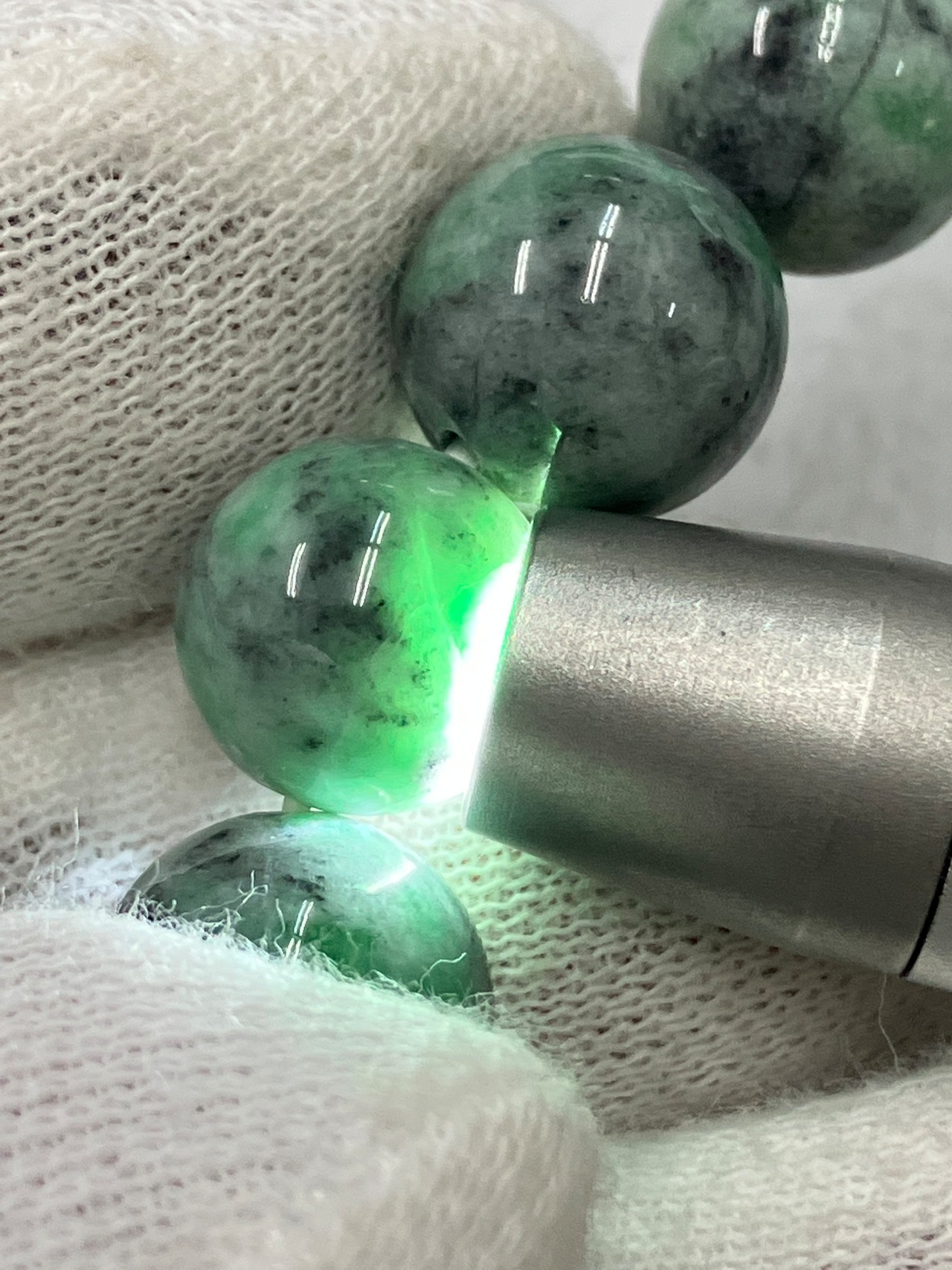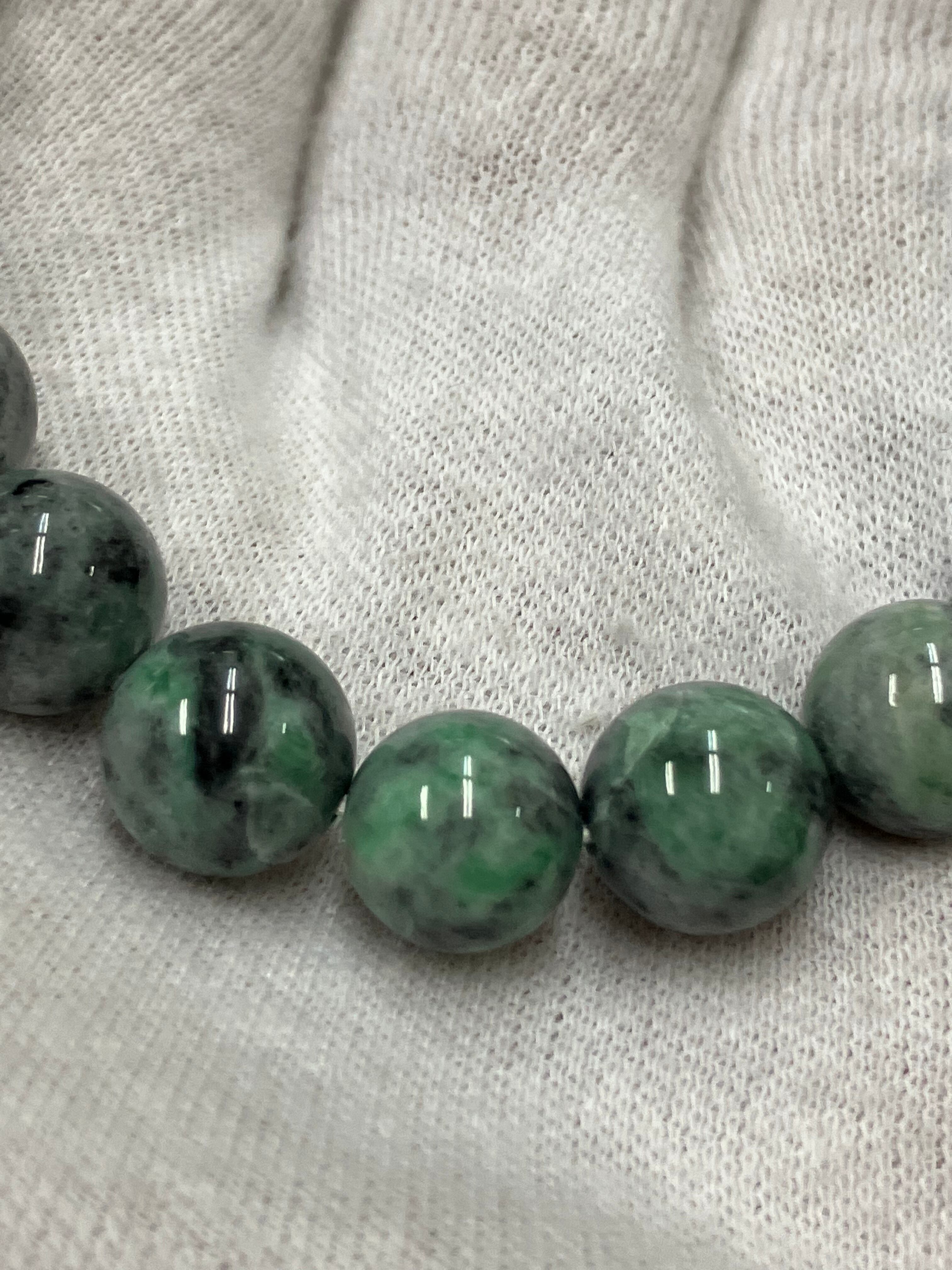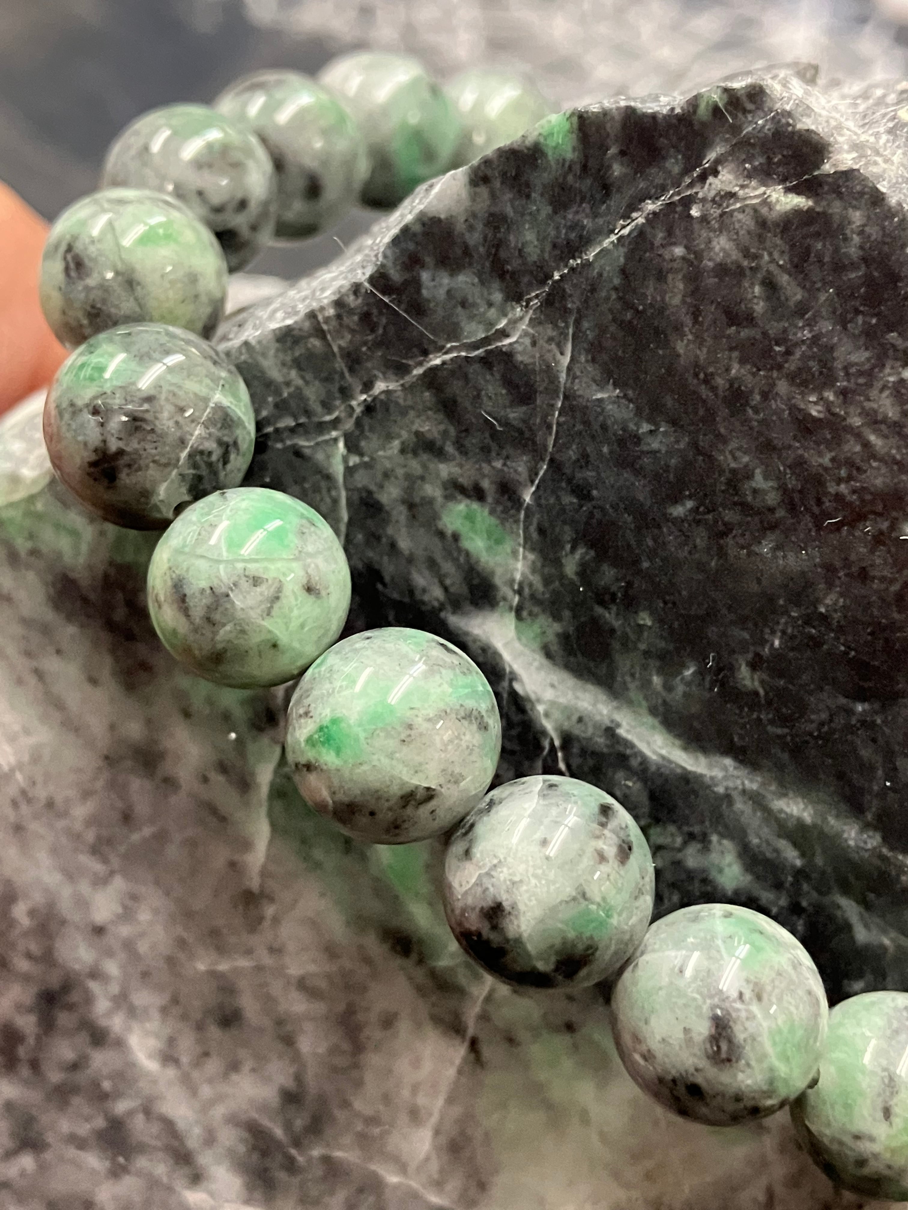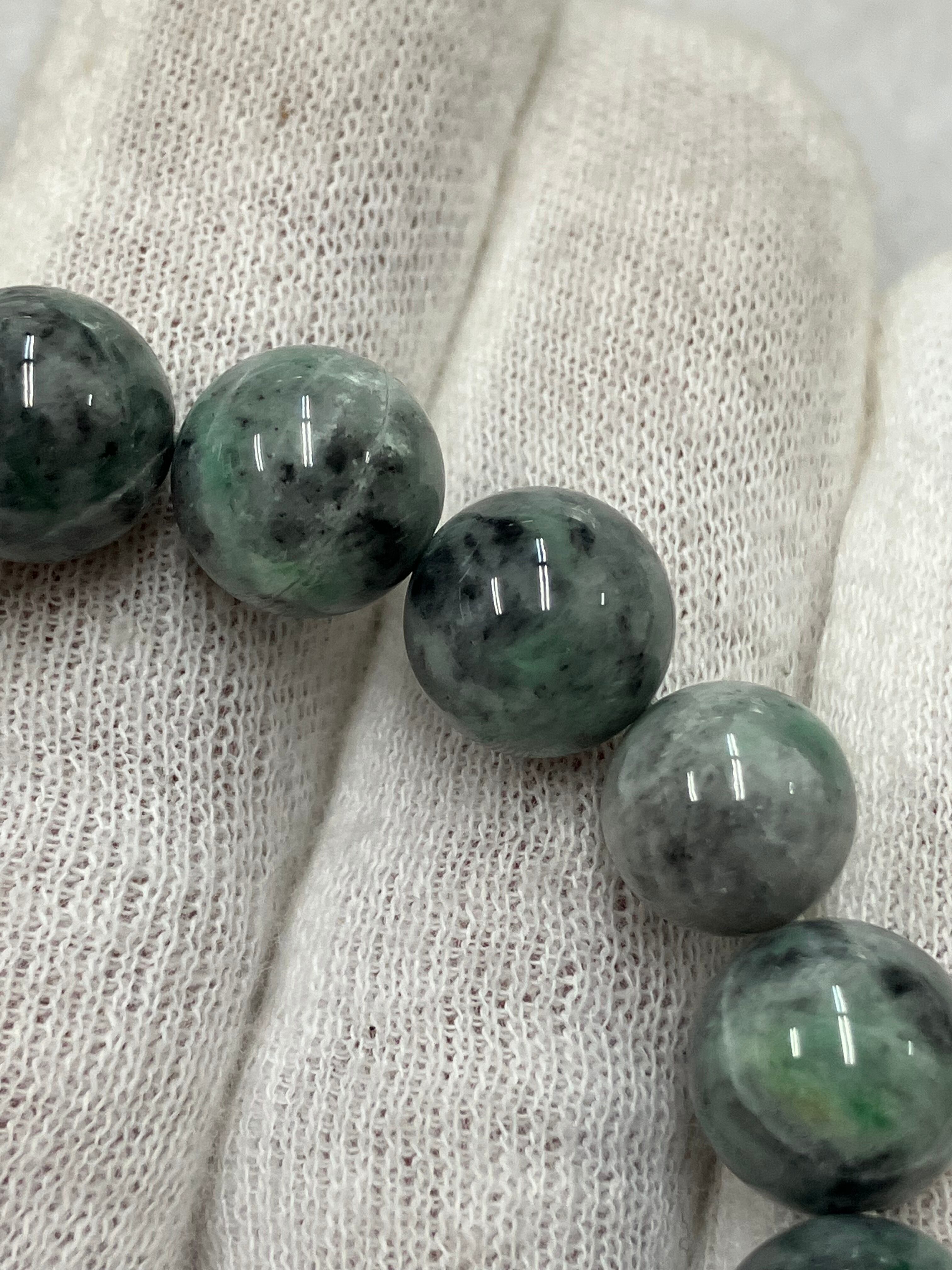 糸魚川翡翠の炭素質と呼ばれる黒い翡翠に緑色が入った部分を集めてブレスレットをつくりました。