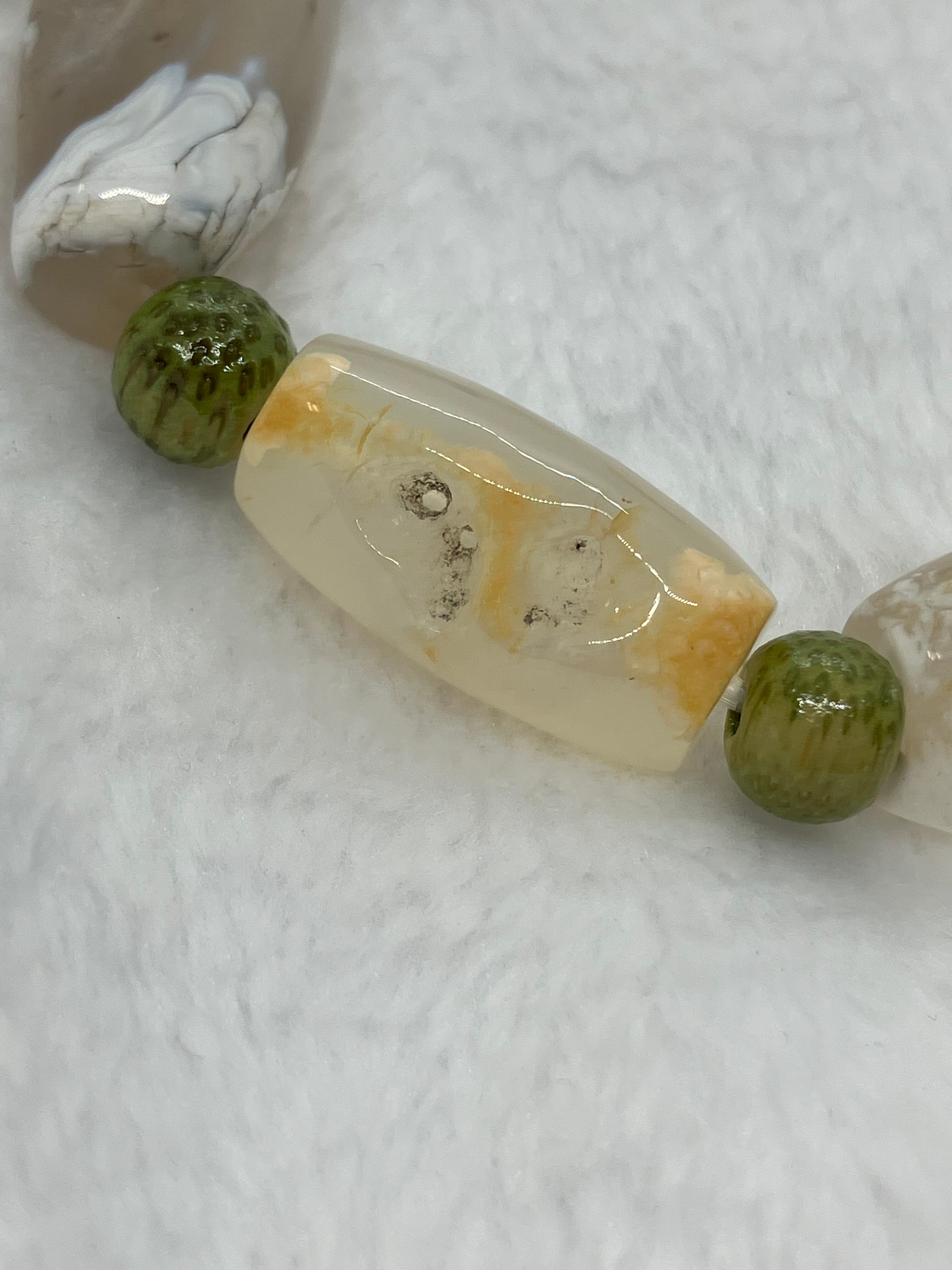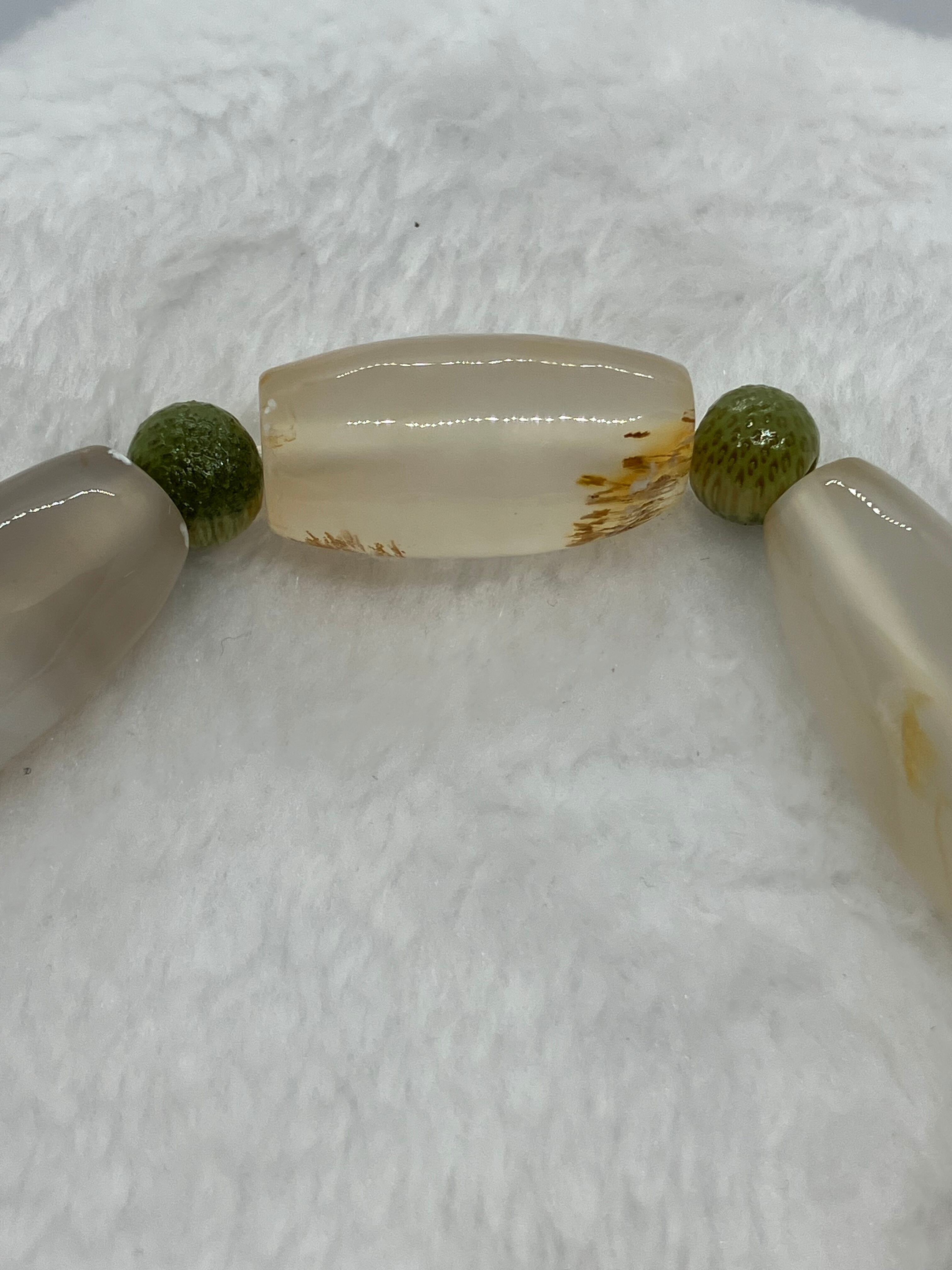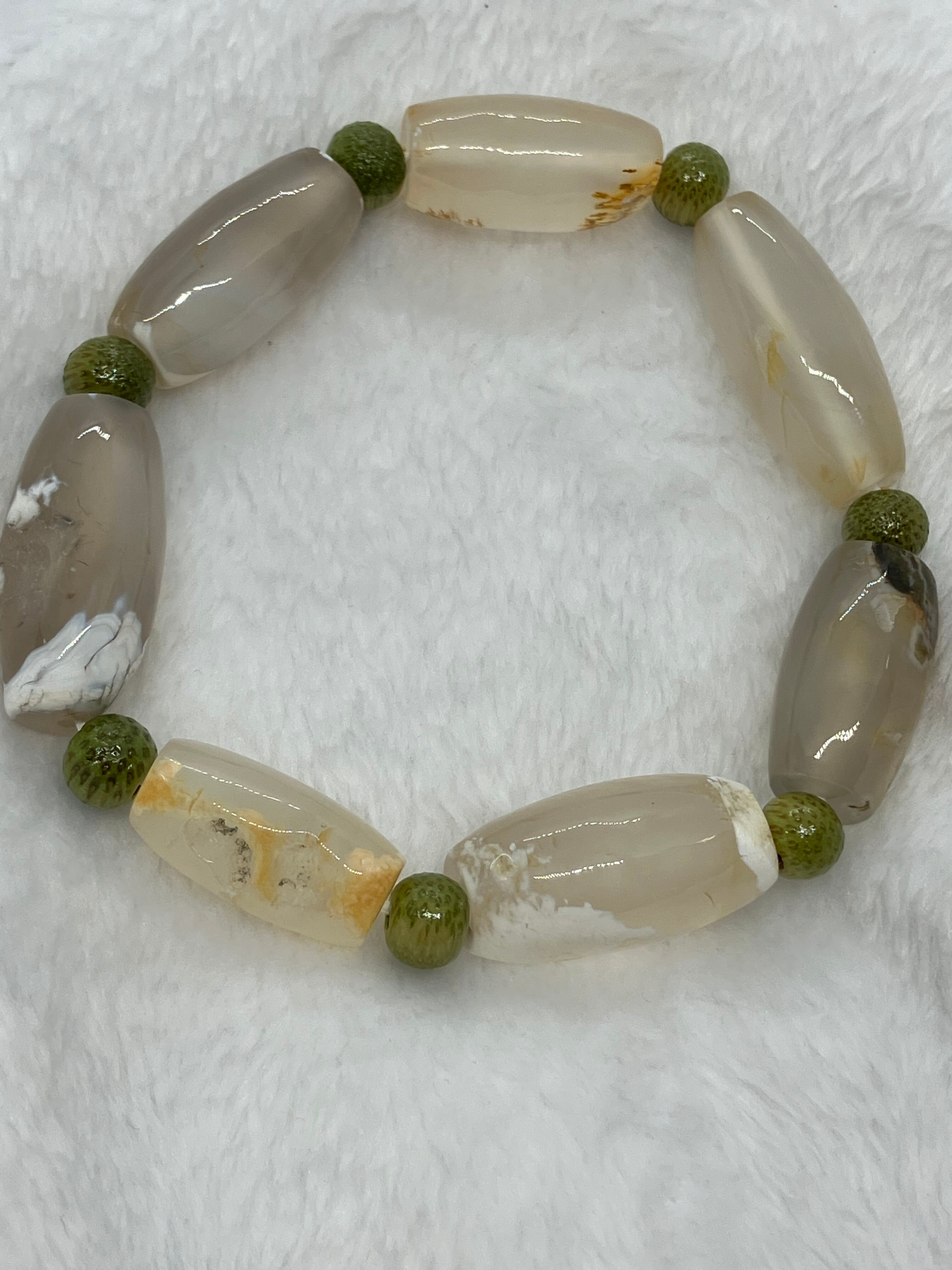 新潟県佐渡市産の、薄らと黄色味のある瑪瑙原石から天珠形(管形)ビーズを作成して、国産の竹のビーズでブレスレットにしました。