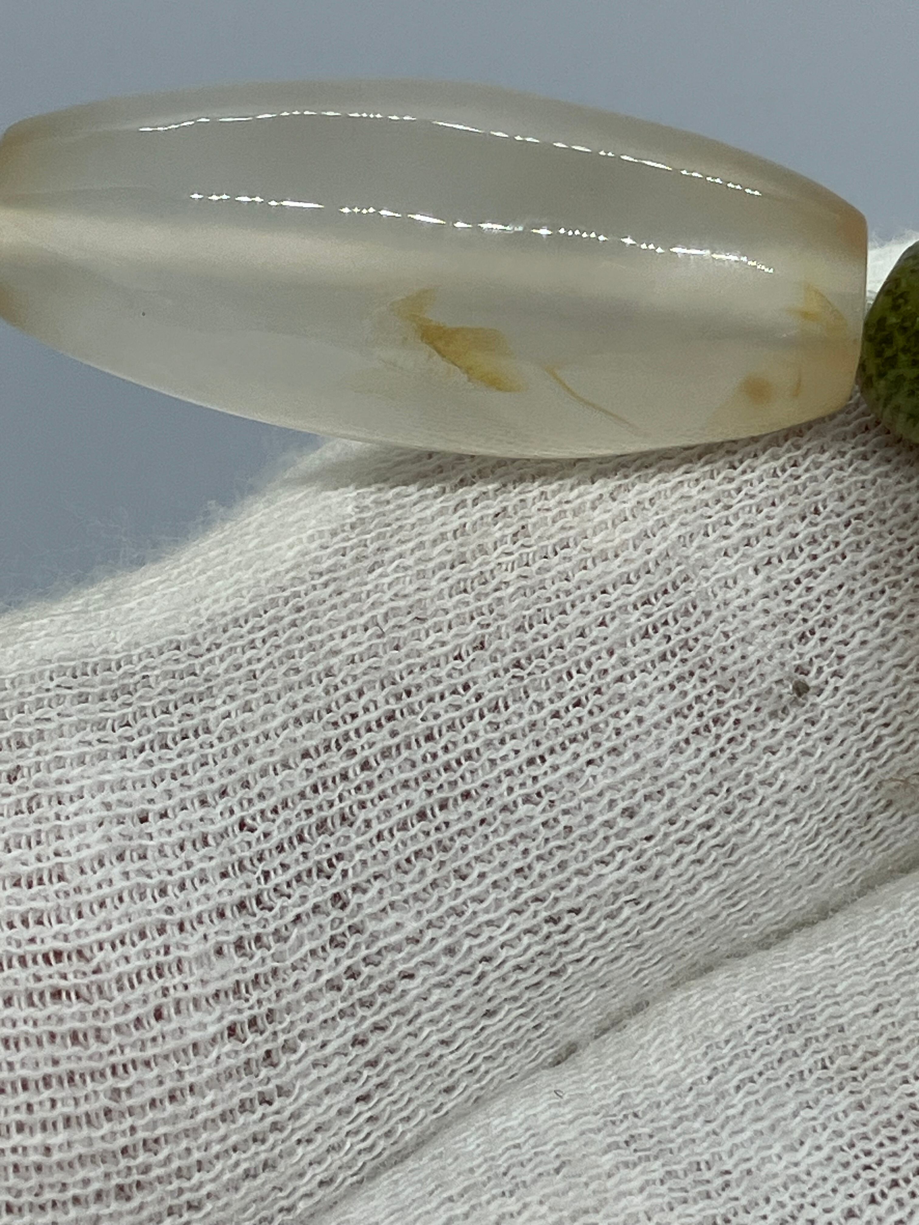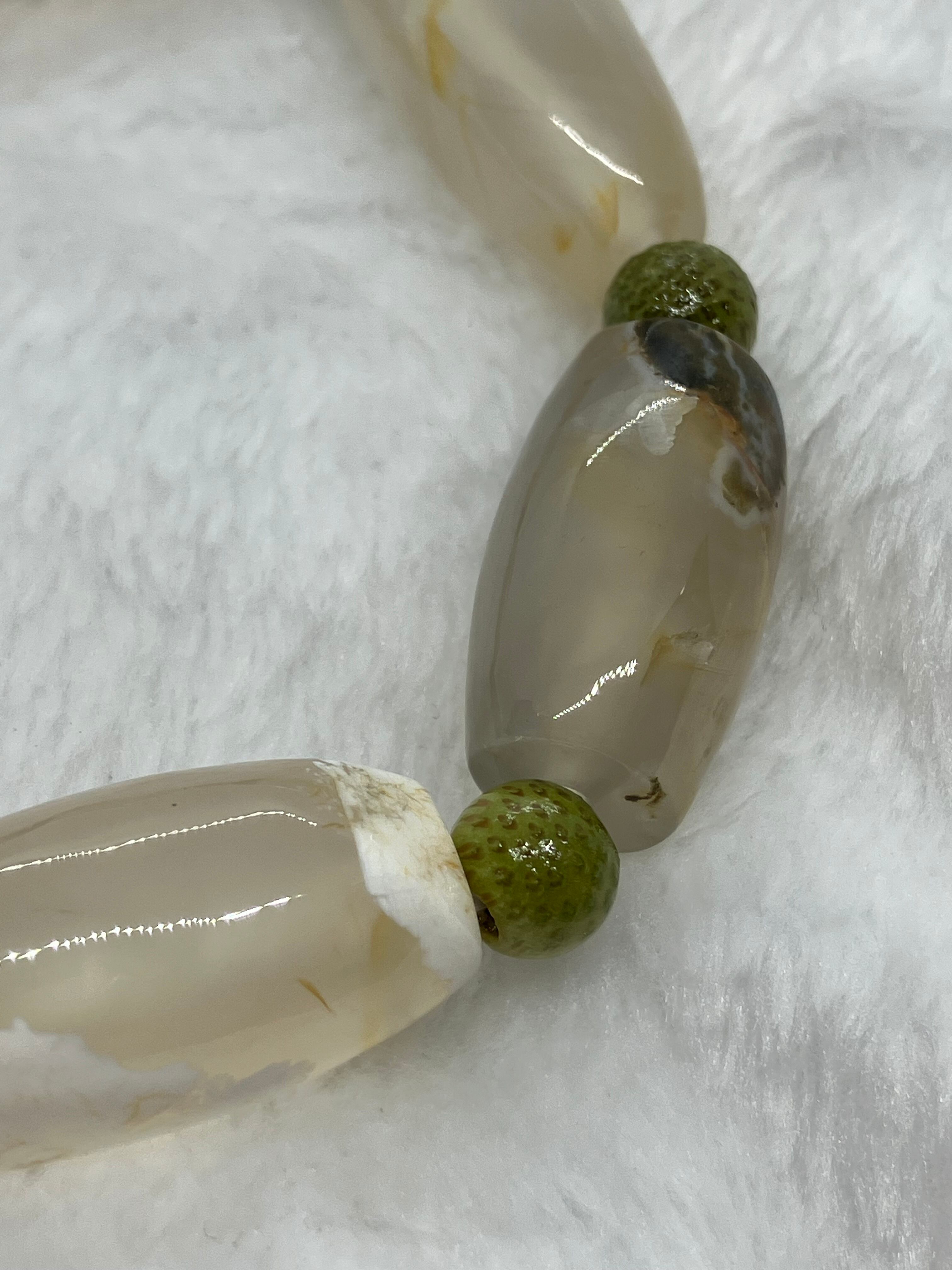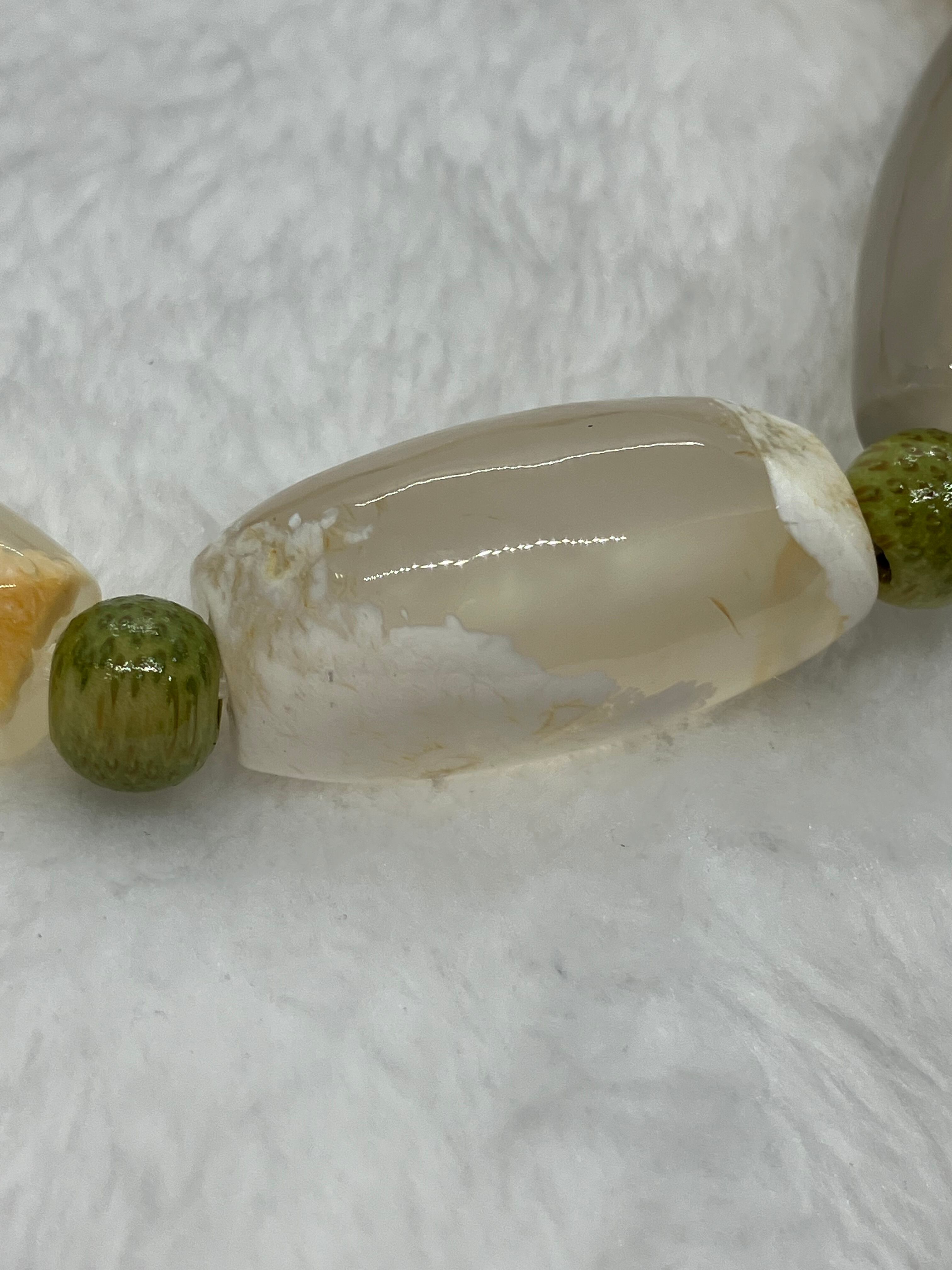 新潟県佐渡市産の、薄らと黄色味のある瑪瑙原石から天珠形(管形)ビーズを作成して、国産の竹のビーズでブレスレットにしました。