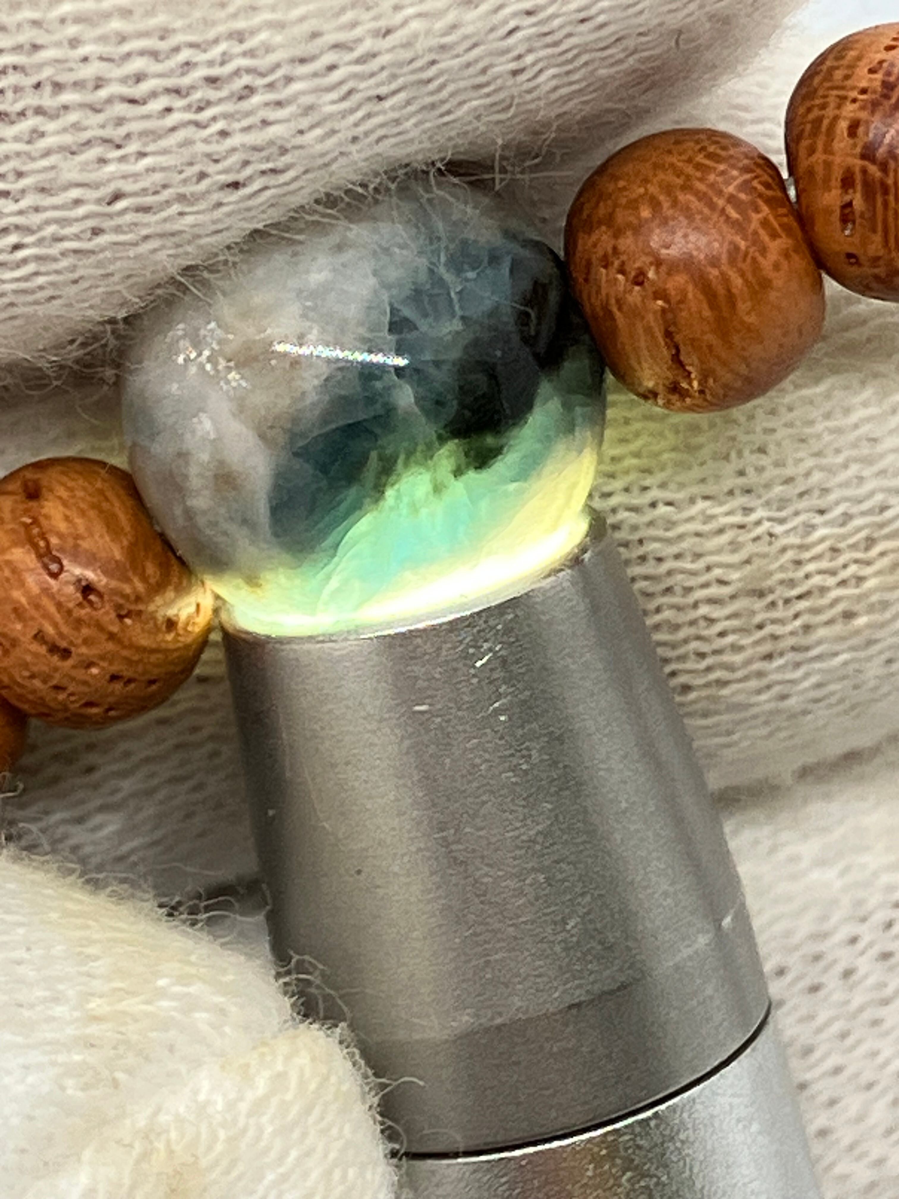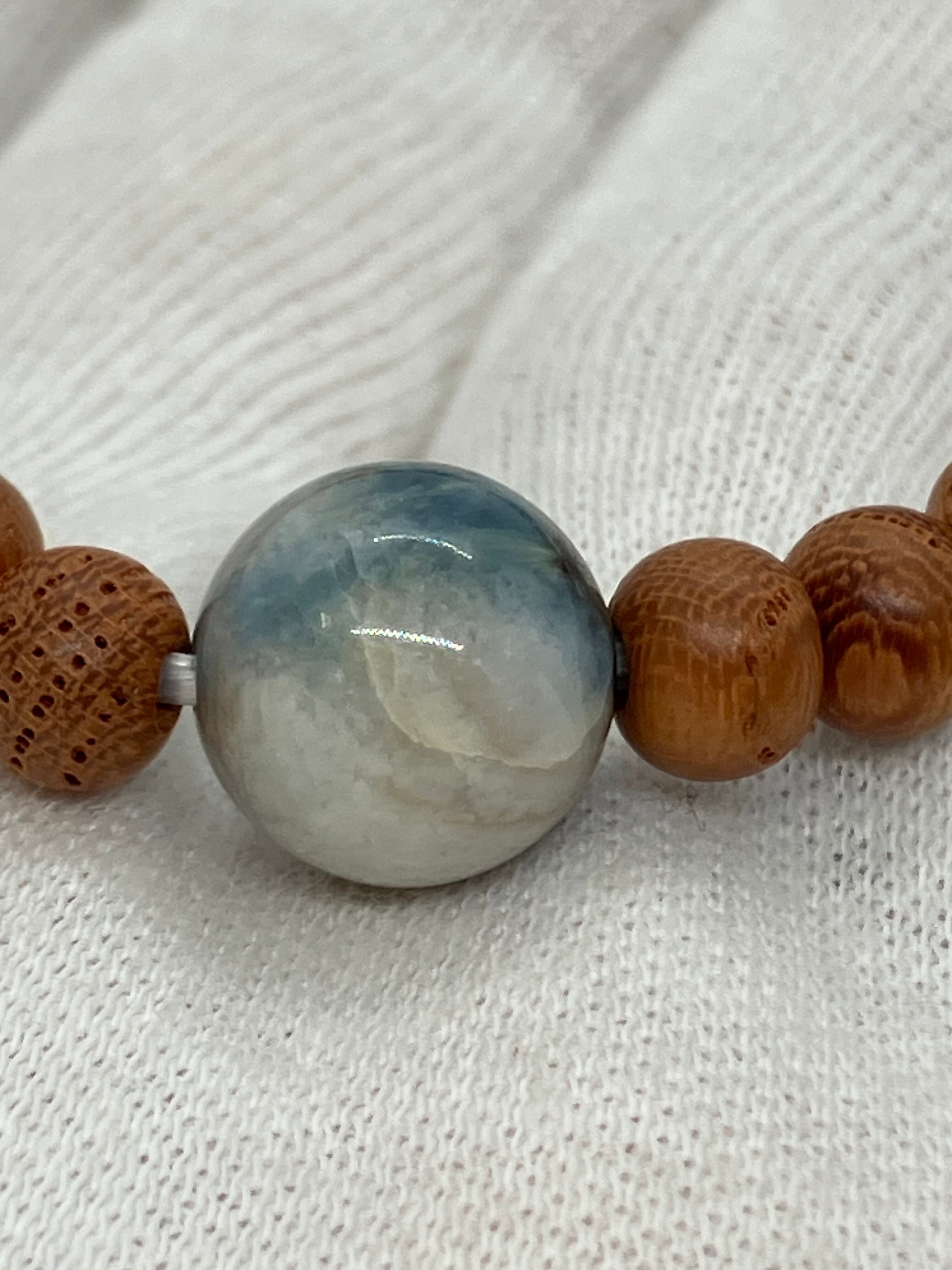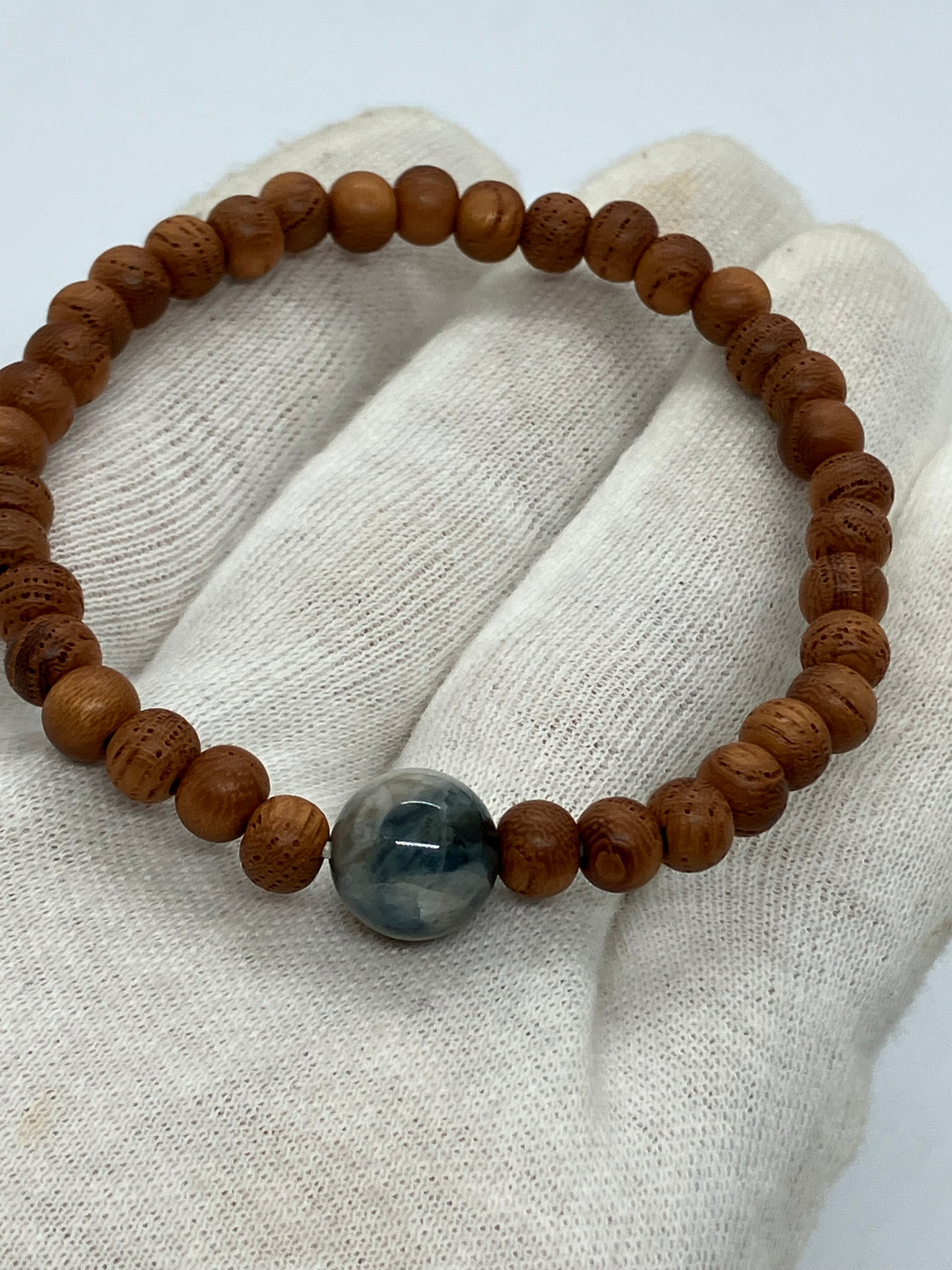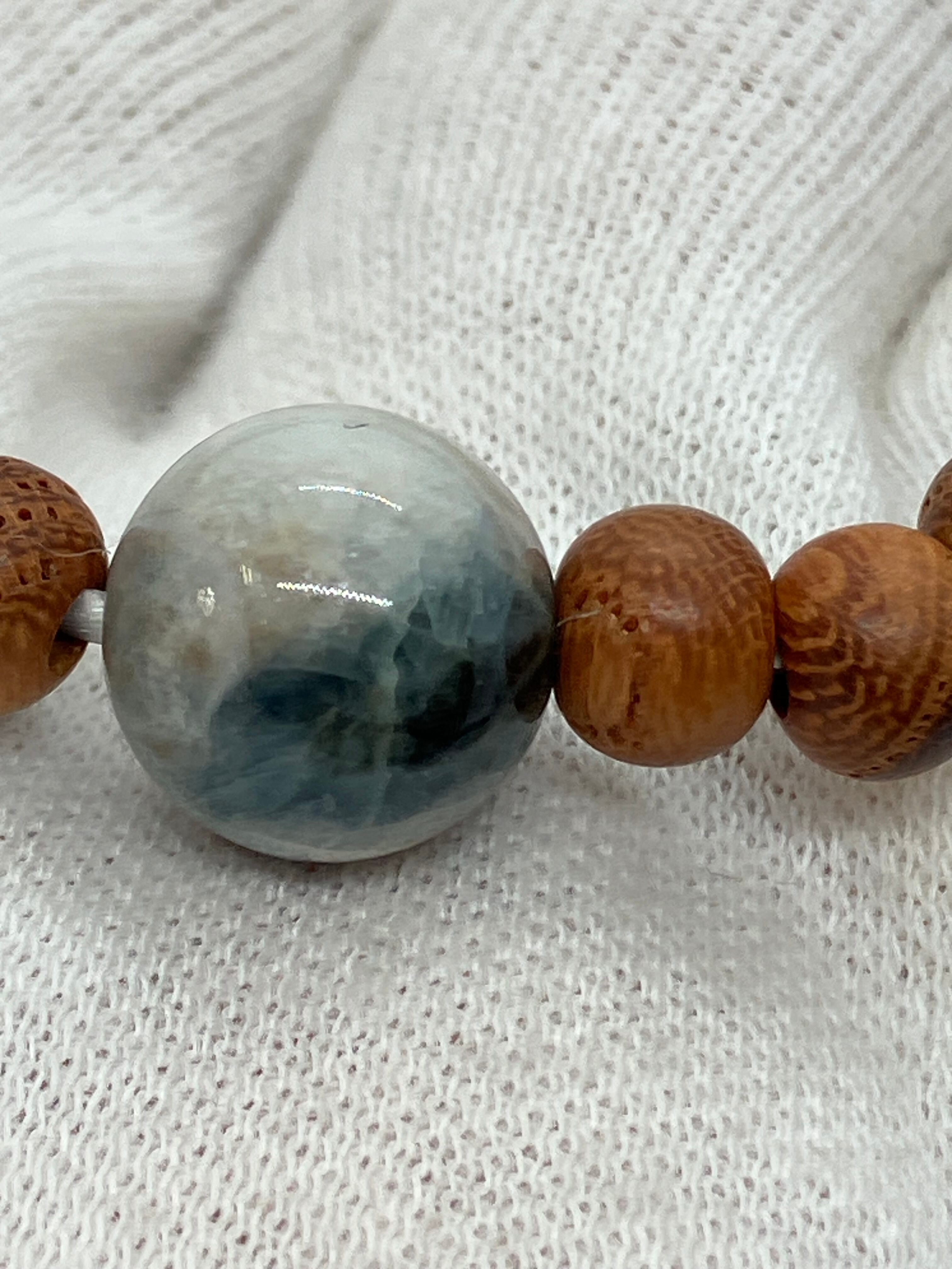 入りコン沢の青翡翠の10㍉ビーズを1つ手作りしました。国産のケヤキ6㍉玉で内周17センチのブレスレットにいたしました。(内周サイズは調整可能です)