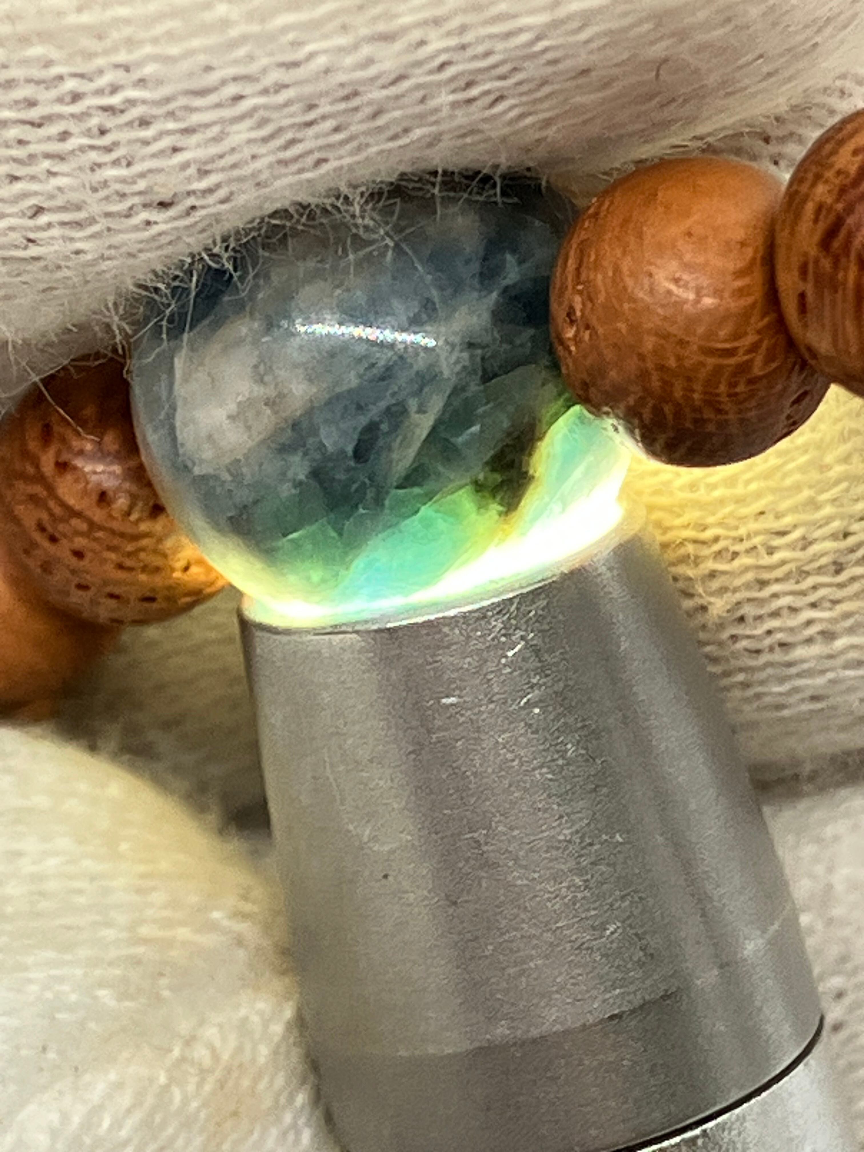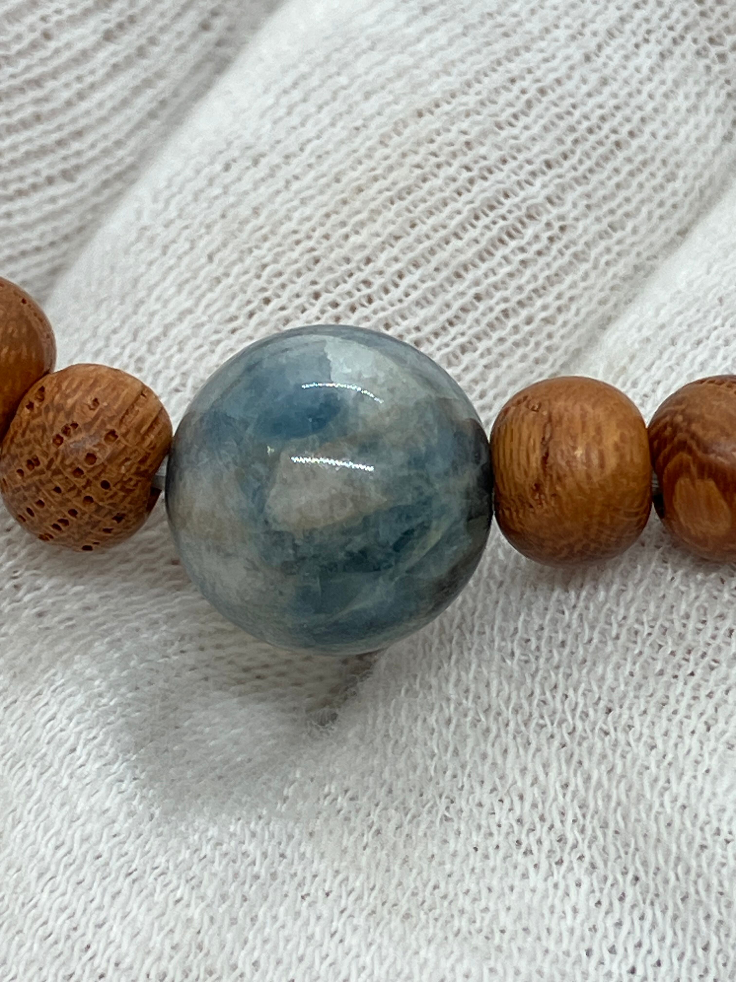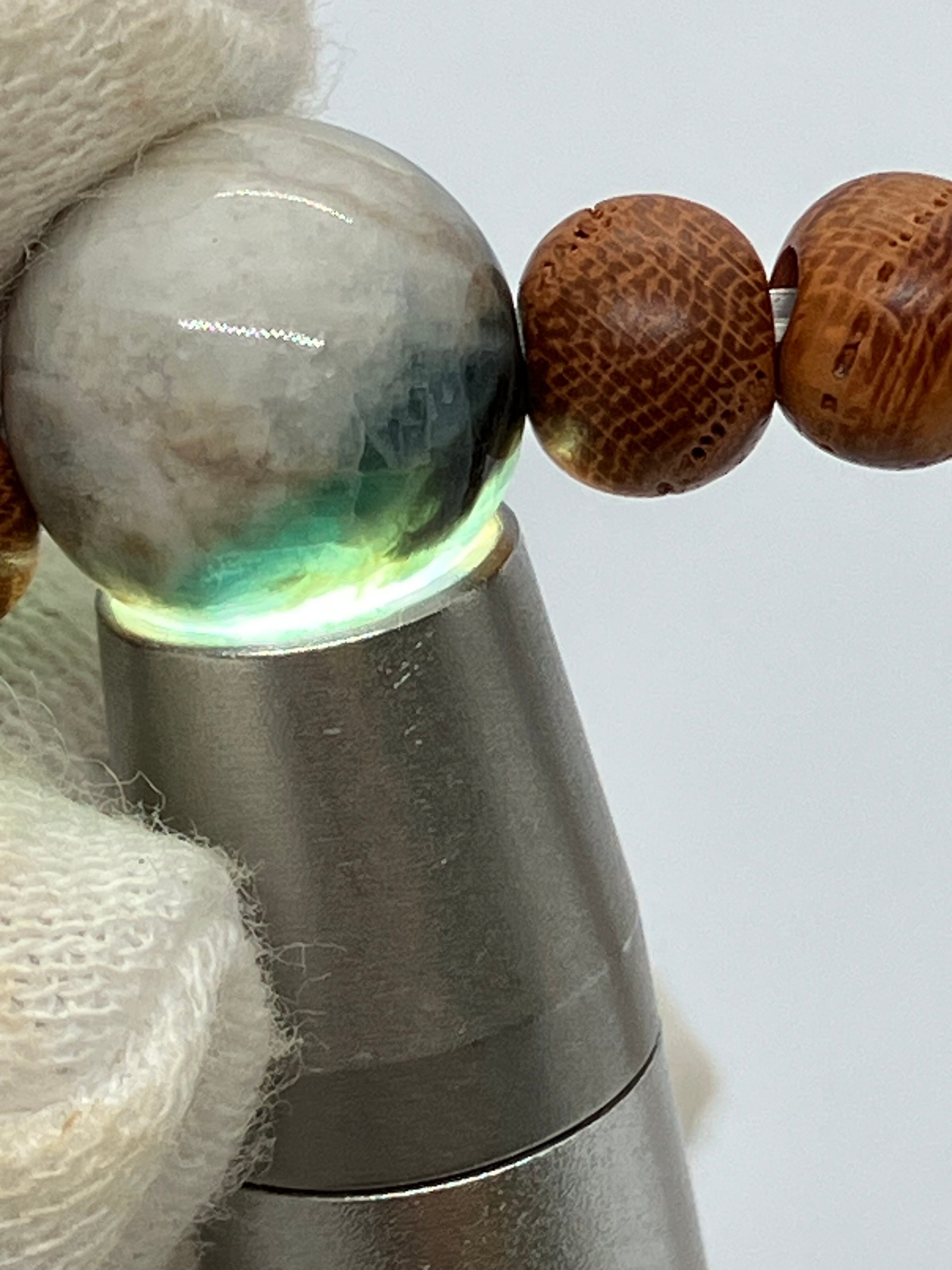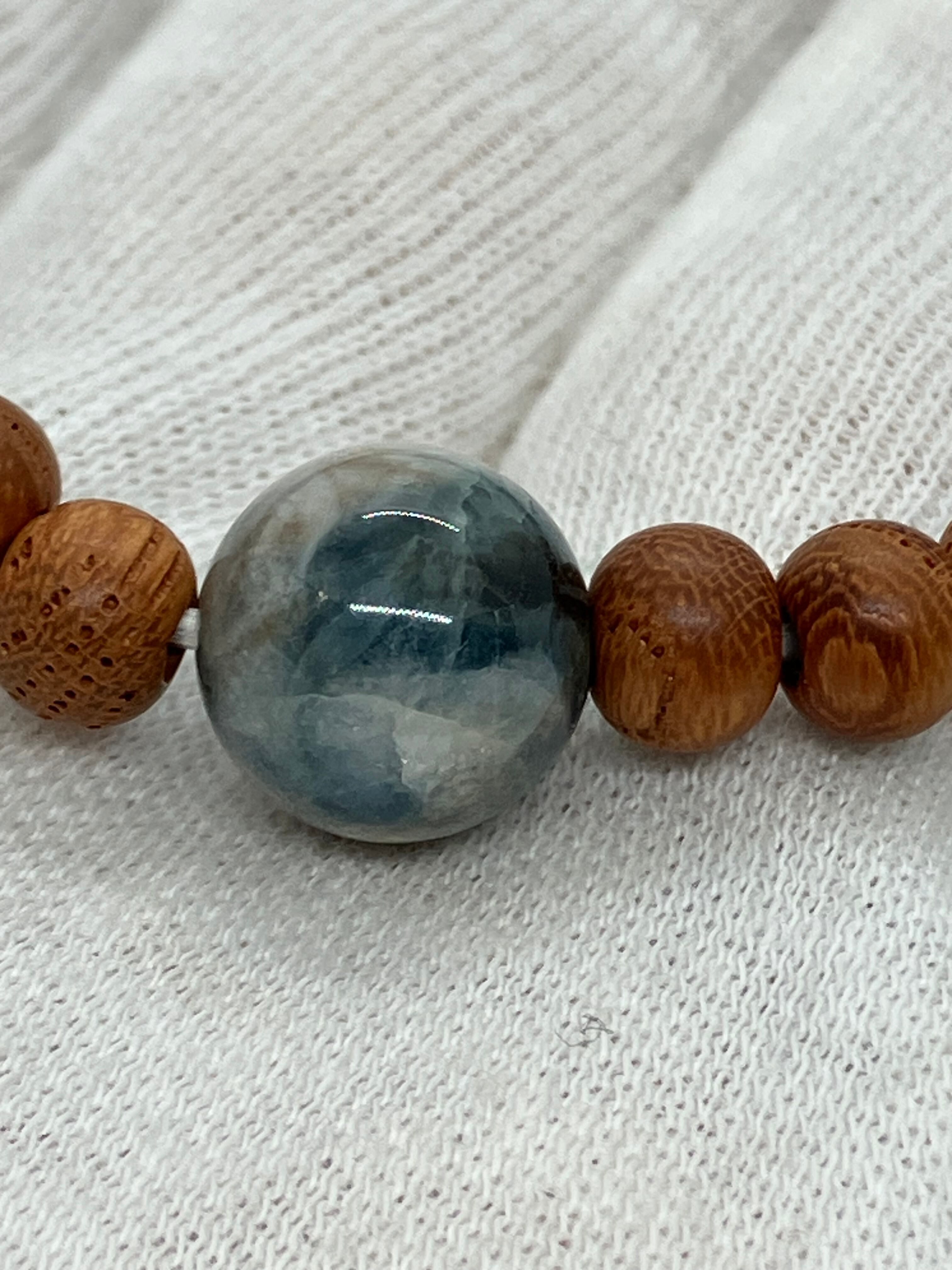 入りコン沢の青翡翠の10㍉ビーズを1つ手作りしました。国産のケヤキ6㍉玉で内周17センチのブレスレットにいたしました。(内周サイズは調整可能です)