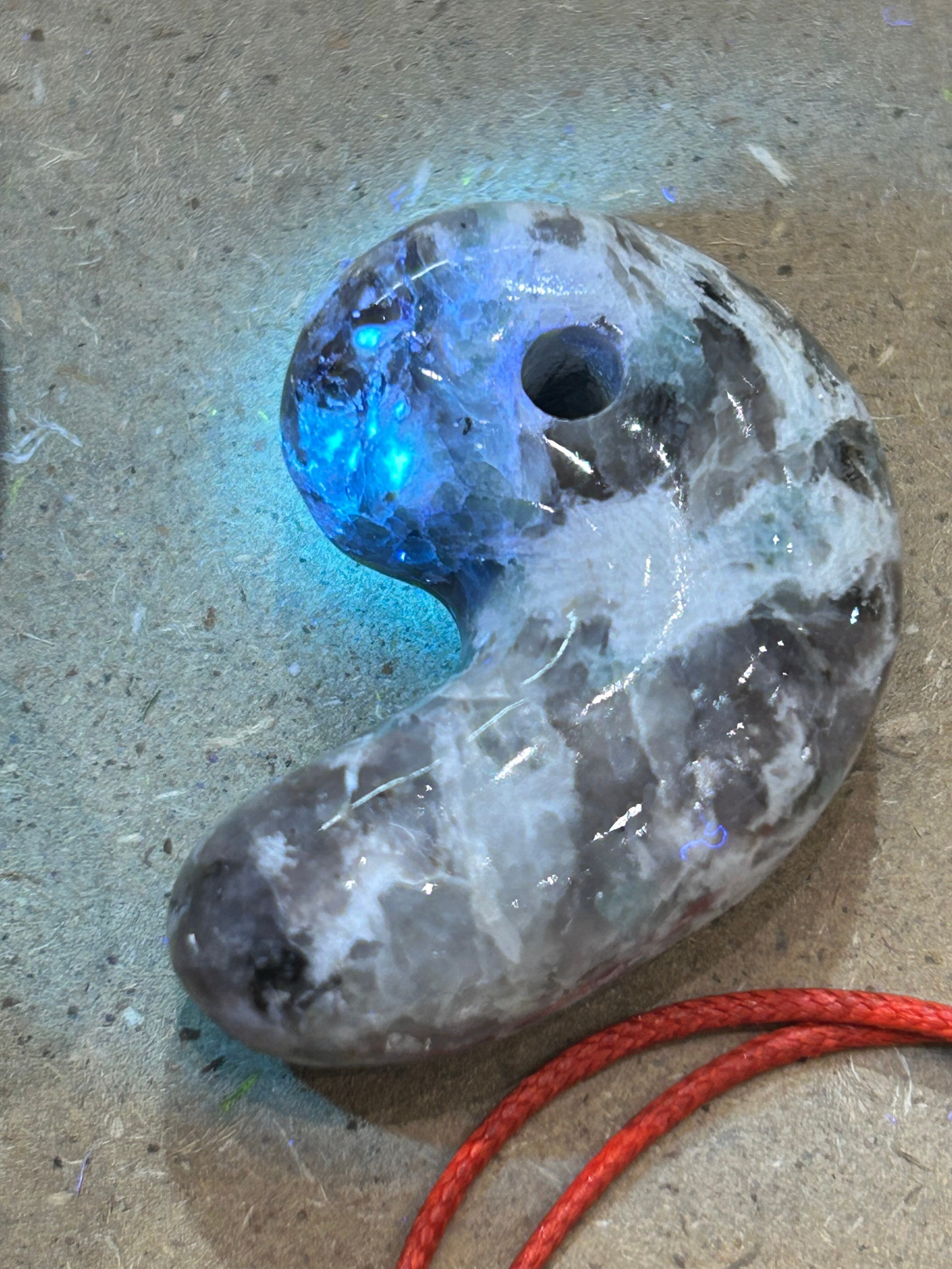 写真13枚目:勾玉の先端部分にUVライトを当てると蛍光する箇所が見られます。